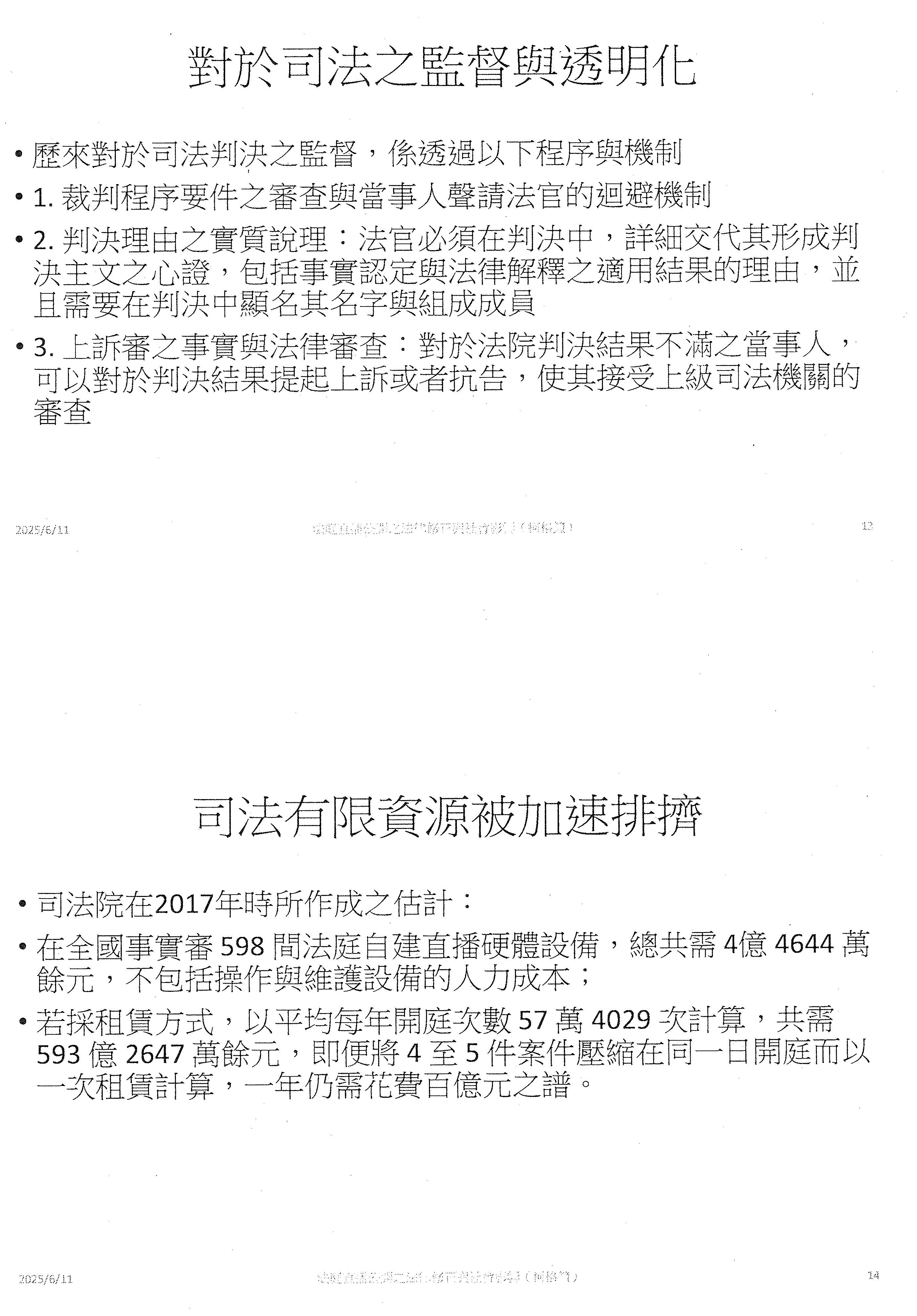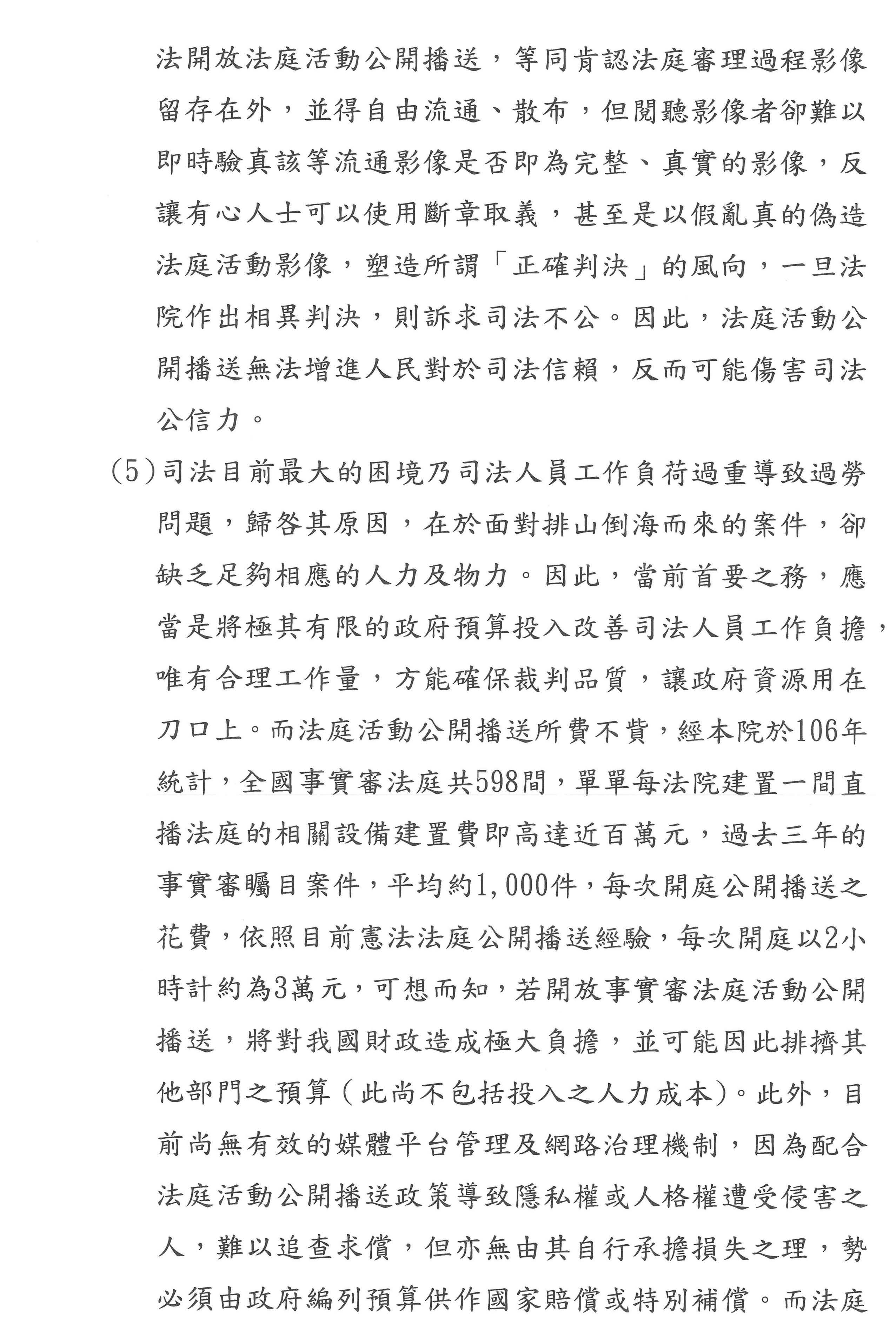 拜託!再給我一點時間,因為司法院很少有機會可以講話。今天立法院召開公聽會,我們聆聽了各方專家學者的意見,我發現大家對於法庭直播有以下的高度疑慮:第一點,它會影響證人、鑑定人到庭作證的意願,這個有害真實的發現;第二點是訴訟輿論會危及到公平審判;第三點,它會過度侵犯法庭參與者的隱私權、人格權,但是欠缺了一個合憲性的基礎;第四點,很重要的,公開播送的資訊不可回逆,出去了就是永久出去了,但是目前它缺乏有效與妥善的管制及救濟的機制。換言之,從106年司改國是會議召開以來,各界對於法庭公播的爭議與疑慮到現在仍然存在,沒有一個合理的解決。