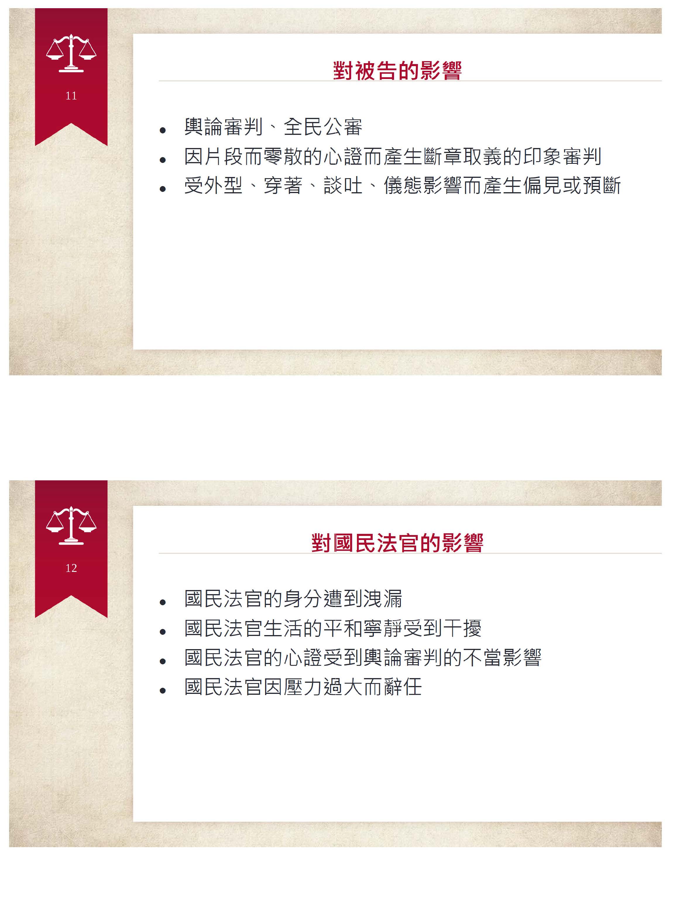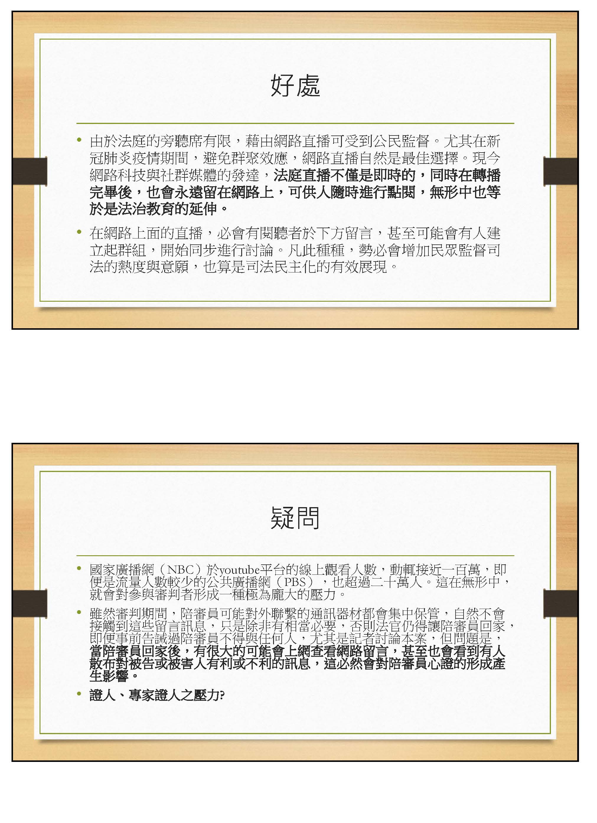 剛剛徐次也提到了一些負面的影響,其實我覺得最大的負面影響是讓國民法官產生壓力,原本大家並不知道誰是國民法官,但是透過直播畫面可能會讓人認出誰是國民法官,當然去的人就不怕啦!但畢竟你是用公開播送的方式,無論是表情也好或是片段的發言、前面講了一段或許在後面做了更正,但是就切前面那一段,這些也都是麻煩。