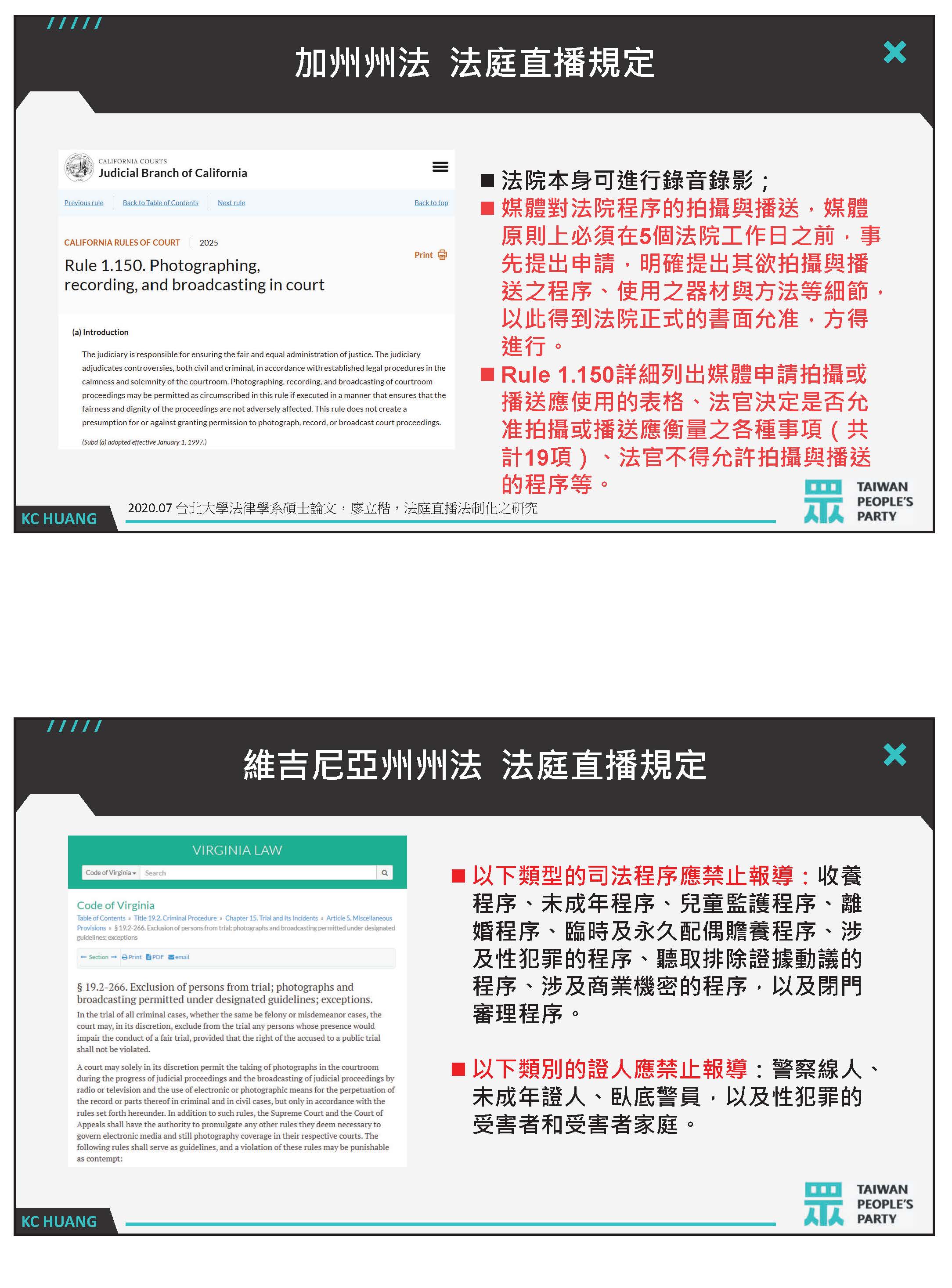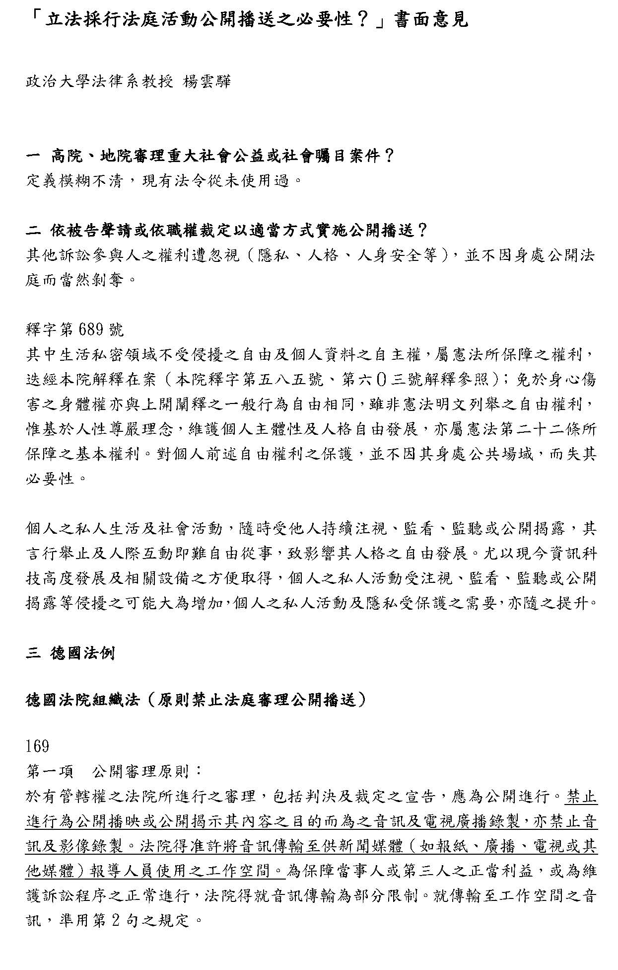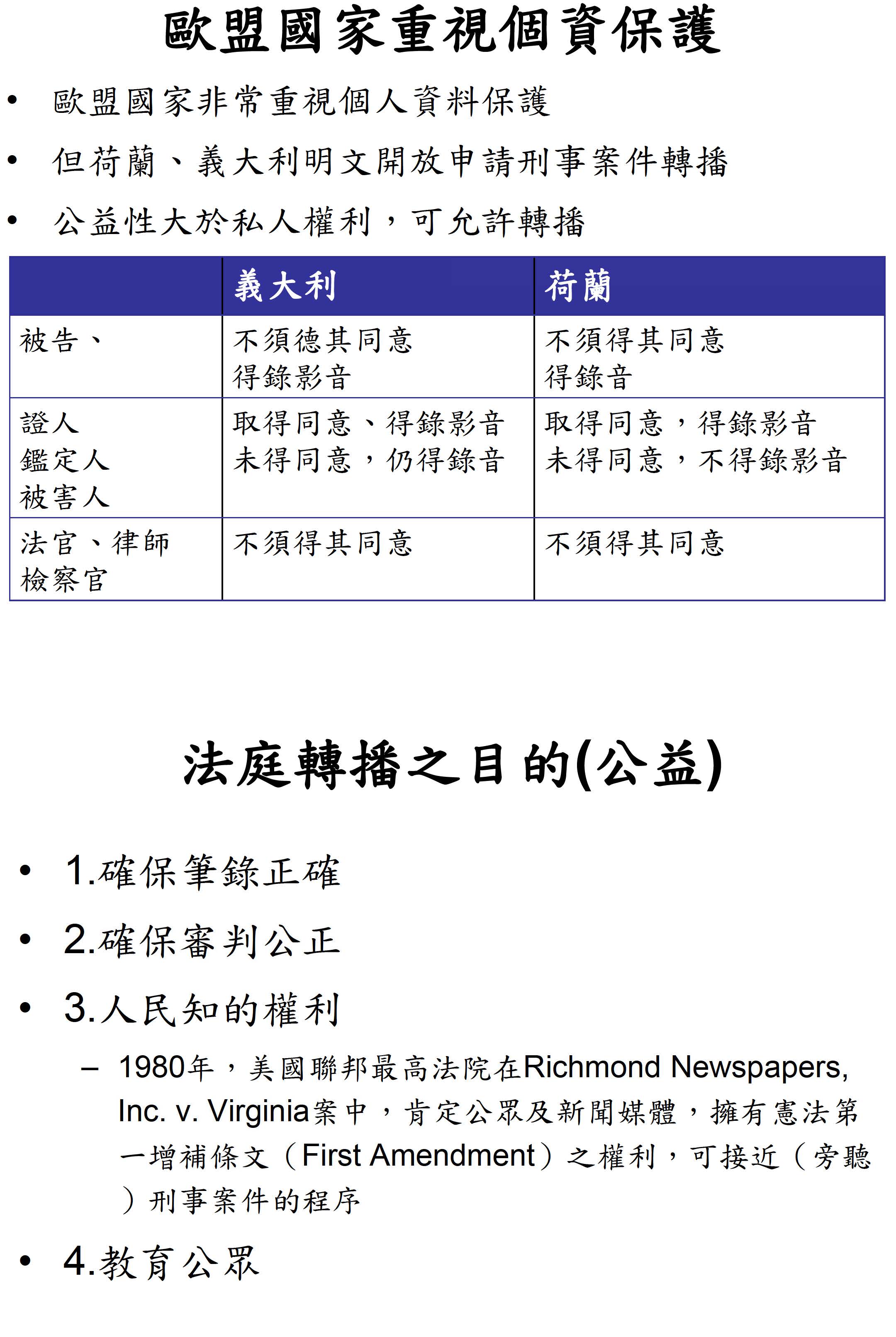 再回到整個國際法的部分,說實在的,提出中國要推法庭直播,你們相信中國的法庭嗎?中國的法庭直播等於是要將整個審理過程給之後的人看,怎麼會講到一個充滿人治的中國,甚至說是我們的榜樣,我聽到這句話真的是快要吐血、真的會吐血耶!再來是美國,它是部分州有法庭直播,但它是比較限縮於民事的部分,在刑事的部分還是盡量的避免,因為刑事會涉及到被害人。在美國的憲法法庭是可以開放音訊,事實上也不是直播,而是事後再將音訊提供出來,如果適當的話,這個音訊是可以提供給社會大眾,這是在美國的作法。在英國基本上也是禁止直播,但是允許法官做一些重要宣示時可以將音訊檔案提供給外界,也就是法官對這個案件進行裁示的部分,但他們也表示在播放法官的宣示時必須避免播放到當事人及證人的畫面,尤其是他們的臉孔,這是在英國的作法。像德國及日本,基本上大家也都很清楚。韓國以前也推動過直播,後來是因為審理的過程出現了鄉民化以及處理資訊時出現了破碎化,所以韓國也把這個東西都收起來了。我認為並不是臺灣輸給其他國家,連大家普遍認為與我們臺灣民族性比較相仿的日、韓也都是這樣做,所以我還是一句話,不要再說中國有直播,臺灣就要跟著也推直播,這句話真的是讓人聽不下!