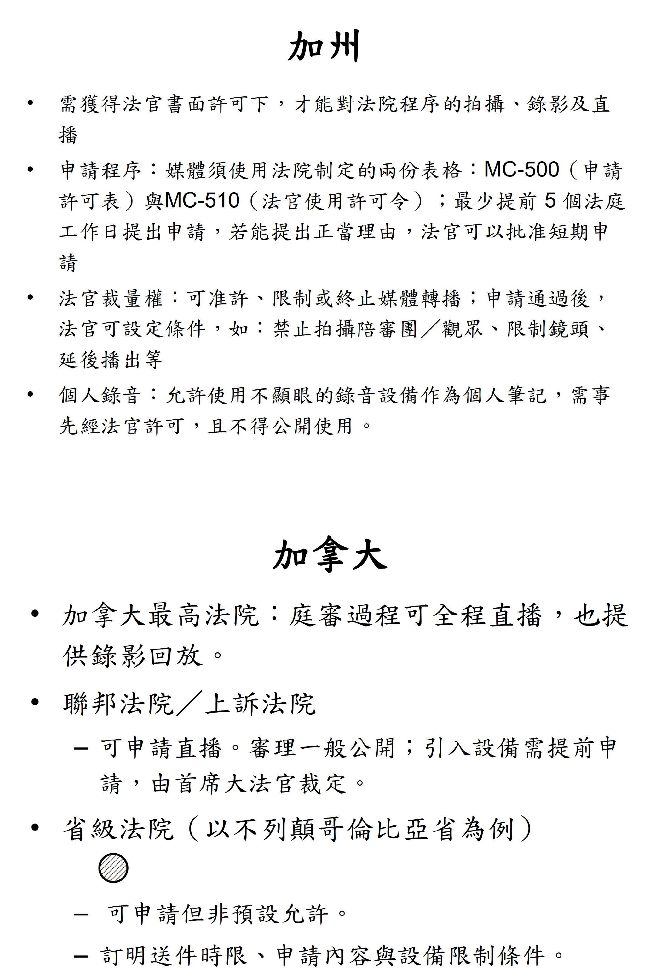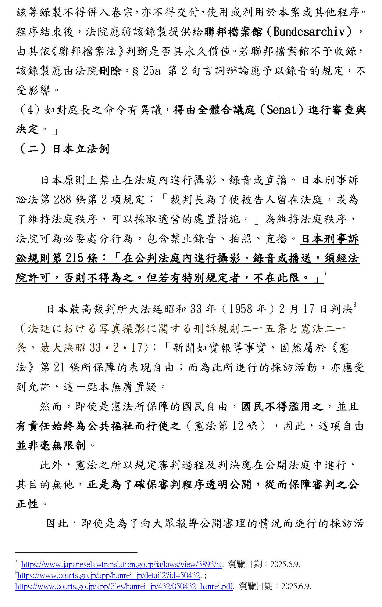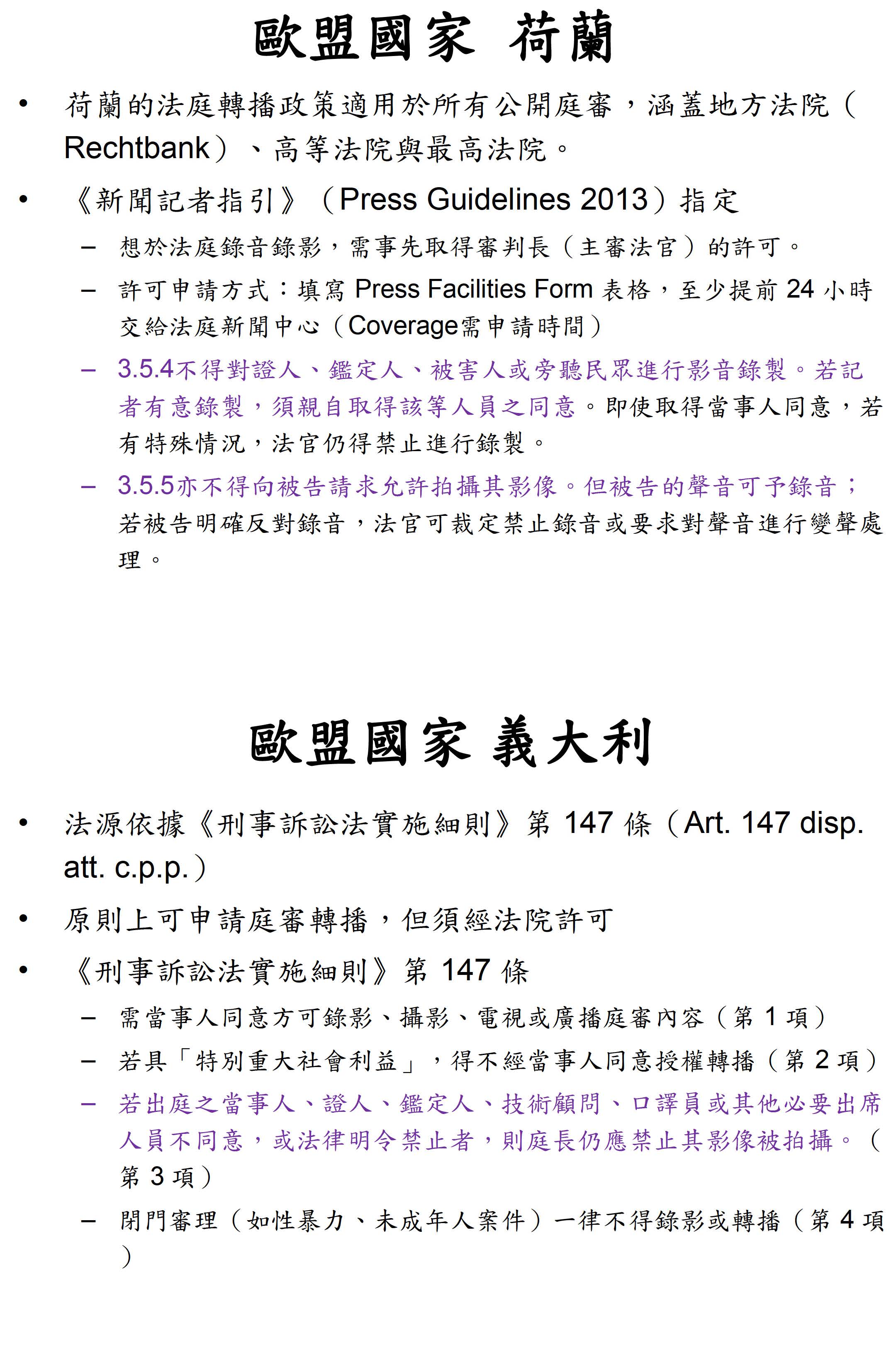 再回到整個國際法的部分,說實在的,提出中國要推法庭直播,你們相信中國的法庭嗎?中國的法庭直播等於是要將整個審理過程給之後的人看,怎麼會講到一個充滿人治的中國,甚至說是我們的榜樣,我聽到這句話真的是快要吐血、真的會吐血耶!再來是美國,它是部分州有法庭直播,但它是比較限縮於民事的部分,在刑事的部分還是盡量的避免,因為刑事會涉及到被害人。在美國的憲法法庭是可以開放音訊,事實上也不是直播,而是事後再將音訊提供出來,如果適當的話,這個音訊是可以提供給社會大眾,這是在美國的作法。在英國基本上也是禁止直播,但是允許法官做一些重要宣示時可以將音訊檔案提供給外界,也就是法官對這個案件進行裁示的部分,但他們也表示在播放法官的宣示時必須避免播放到當事人及證人的畫面,尤其是他們的臉孔,這是在英國的作法。像德國及日本,基本上大家也都很清楚。韓國以前也推動過直播,後來是因為審理的過程出現了鄉民化以及處理資訊時出現了破碎化,所以韓國也把這個東西都收起來了。我認為並不是臺灣輸給其他國家,連大家普遍認為與我們臺灣民族性比較相仿的日、韓也都是這樣做,所以我還是一句話,不要再說中國有直播,臺灣就要跟著也推直播,這句話真的是讓人聽不下!