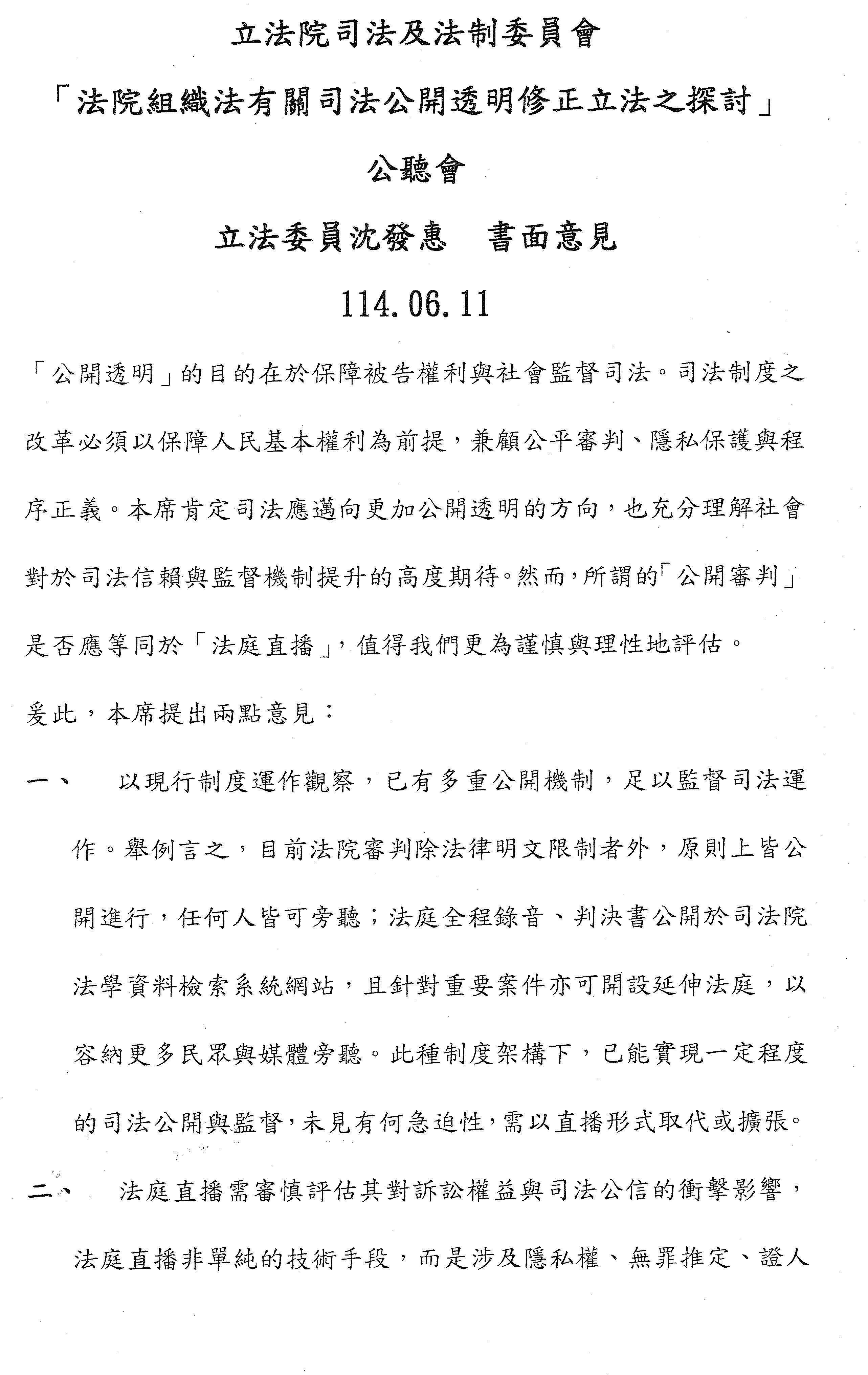 我今天的發言會針對兩個部分,一個是修法本身,還有民眾黨一貫採取逕付二讀的手法來做討論。第一個,關於事實審在法庭直播的部分,我對這個提案表達高度的疑慮,他們一直說這個可以促成所謂司法的公開透明,可是事實上,目前為止,除了特定的案件之外,其實大部分的法庭審理,剛剛律師也都說了,我們一般人都可以走進去旁聽,除了高度社會關注的案件,像剴剴案,可能因為人太多才需要抽籤,所以大家如果連這件事情都不知道,認為直播才可以促進公開透明,那真的是大錯特錯。此外,現在所有的判決書也都可以公開上網,裡面會有判決理由、訴訟代理人、檢察官,還有法官的名字也都看得到,因此公開透明的目的就已經達到了,同時還可以監督司法,所以我真的不知道為什麼會有這個提案。