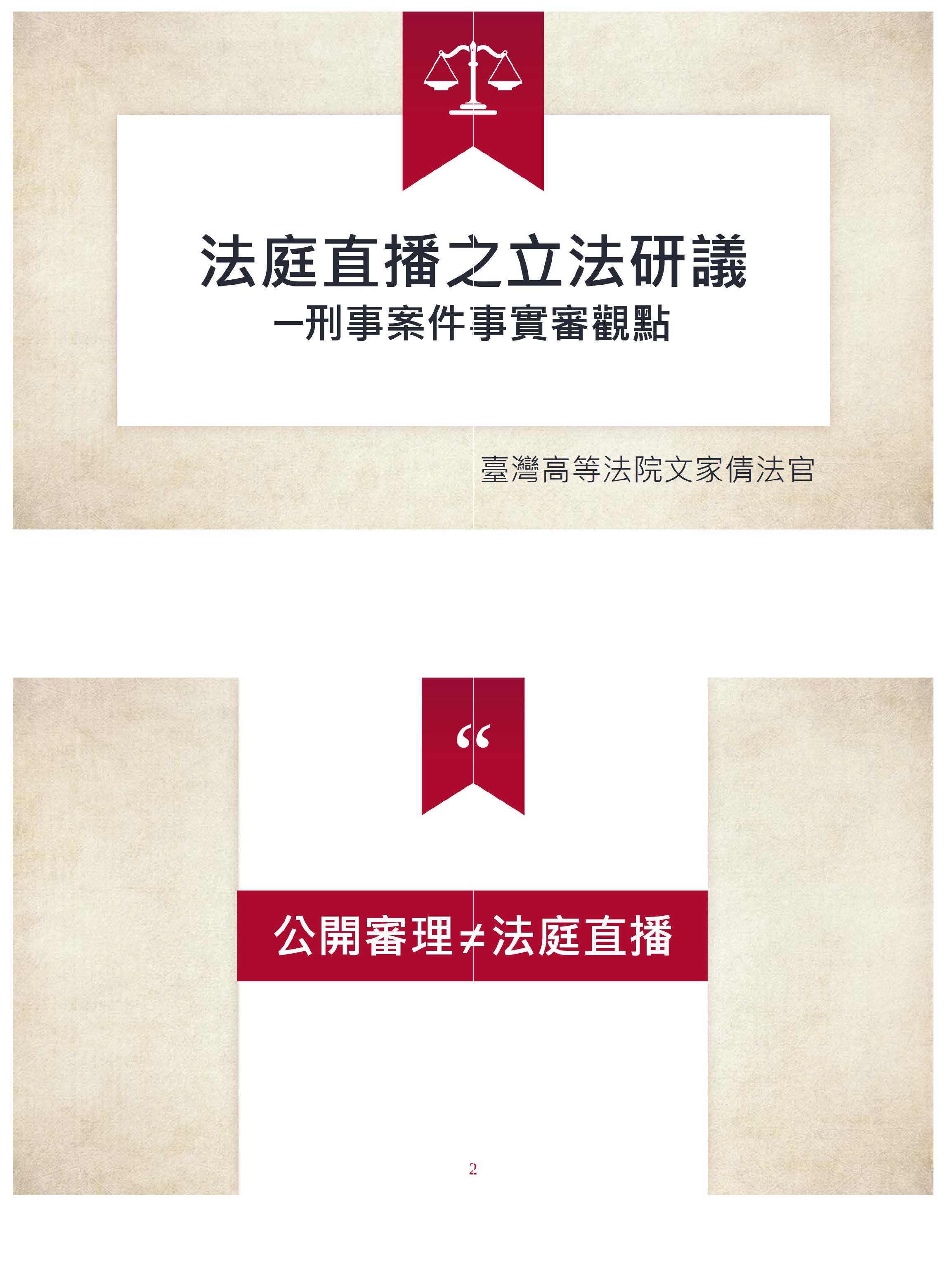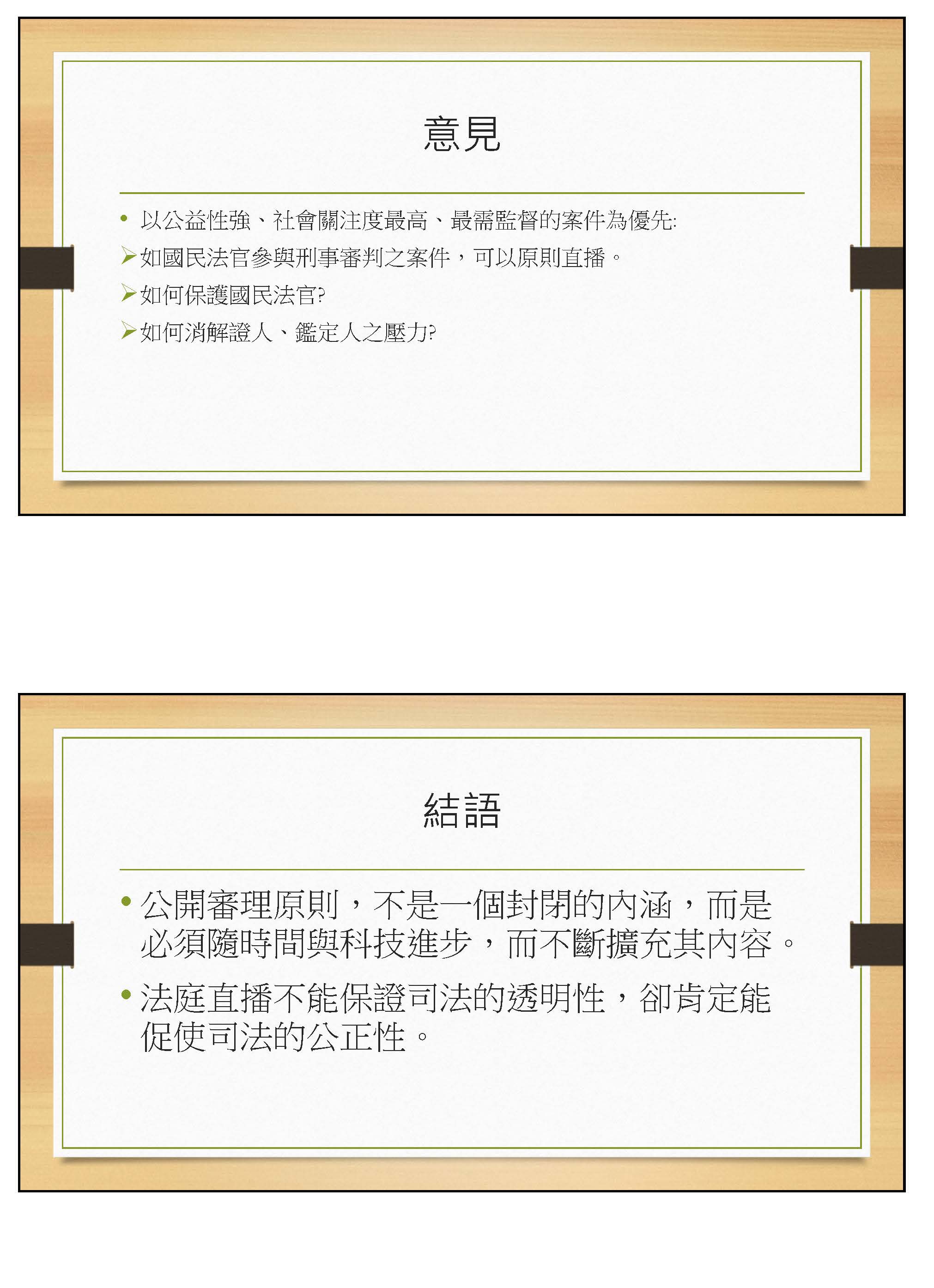對於這個議題,也就是事實審的法律直播,因為我有比較特殊的經驗,站在這三個不同的職場領域上,我的立場都是一致的,就是對於事實審的法庭活動直播,我個人目前是採取保留、反對的態度。