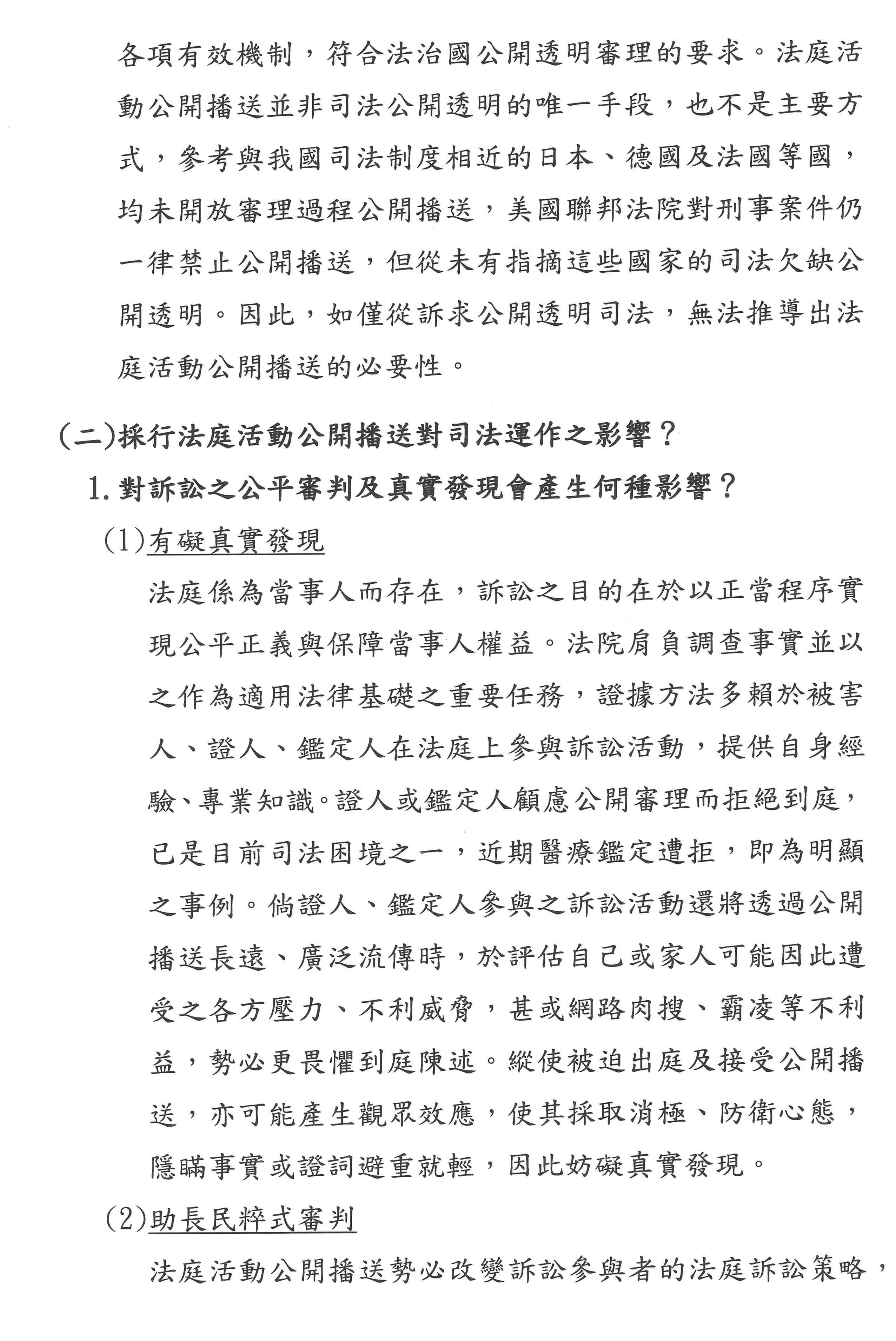 3.法庭活動公開播送之目的與訴訟參與者權益保障之法益權衡是否衡平?