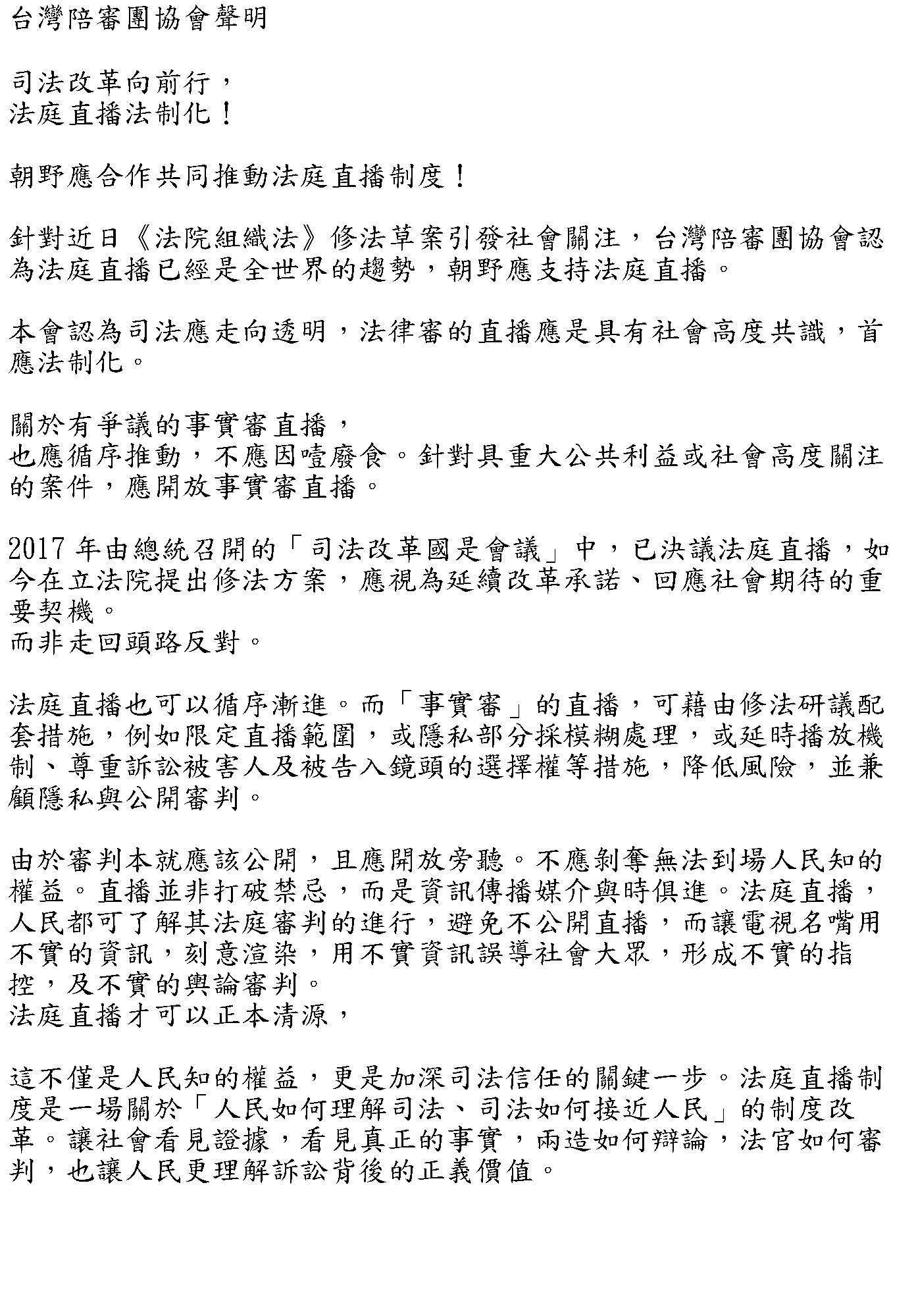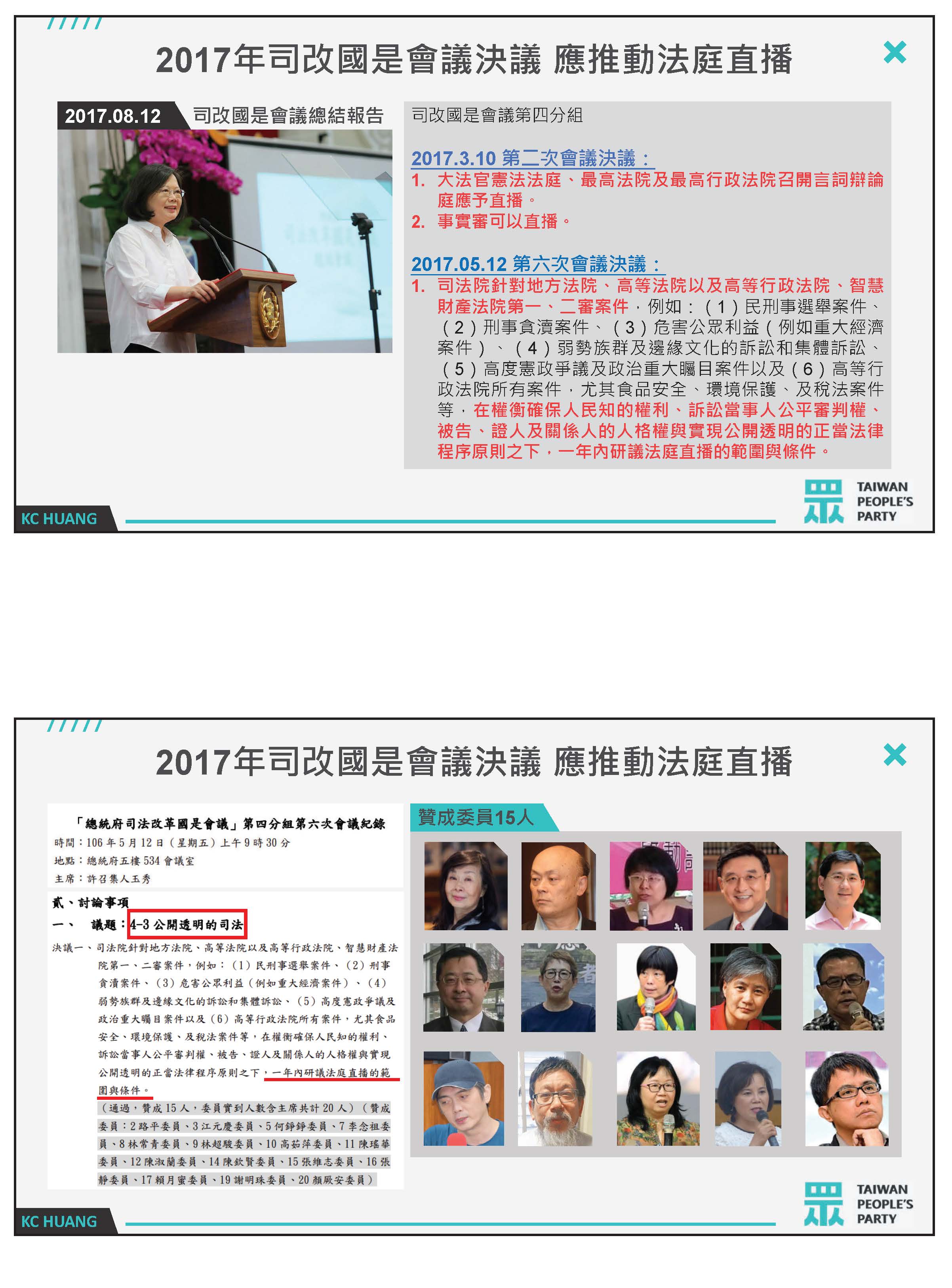 同樣地,今天講到法庭直播,其實剛剛大家有提到,2017就是司改國是會議的決議嘛,但是今天為什麼會變成有將近20個法律團體出來反對?我們陪審團協會是贊成的,我們也發了一個聲明。問題在哪裡?我就講,第一個,法庭直播不是問題,問題是黃國昌提出來就變成問題嘛!問題是在這裡,法庭直播本來就不是問題,是因為黃國昌提的嘛!我是覺得這個就變成是政黨惡鬥的問題,我不贊成這樣子。我是本土派,我是綠營的,我很清楚,但是我始終認為法庭直播是世界趨勢,我們不應該因為黨派而改變立場。