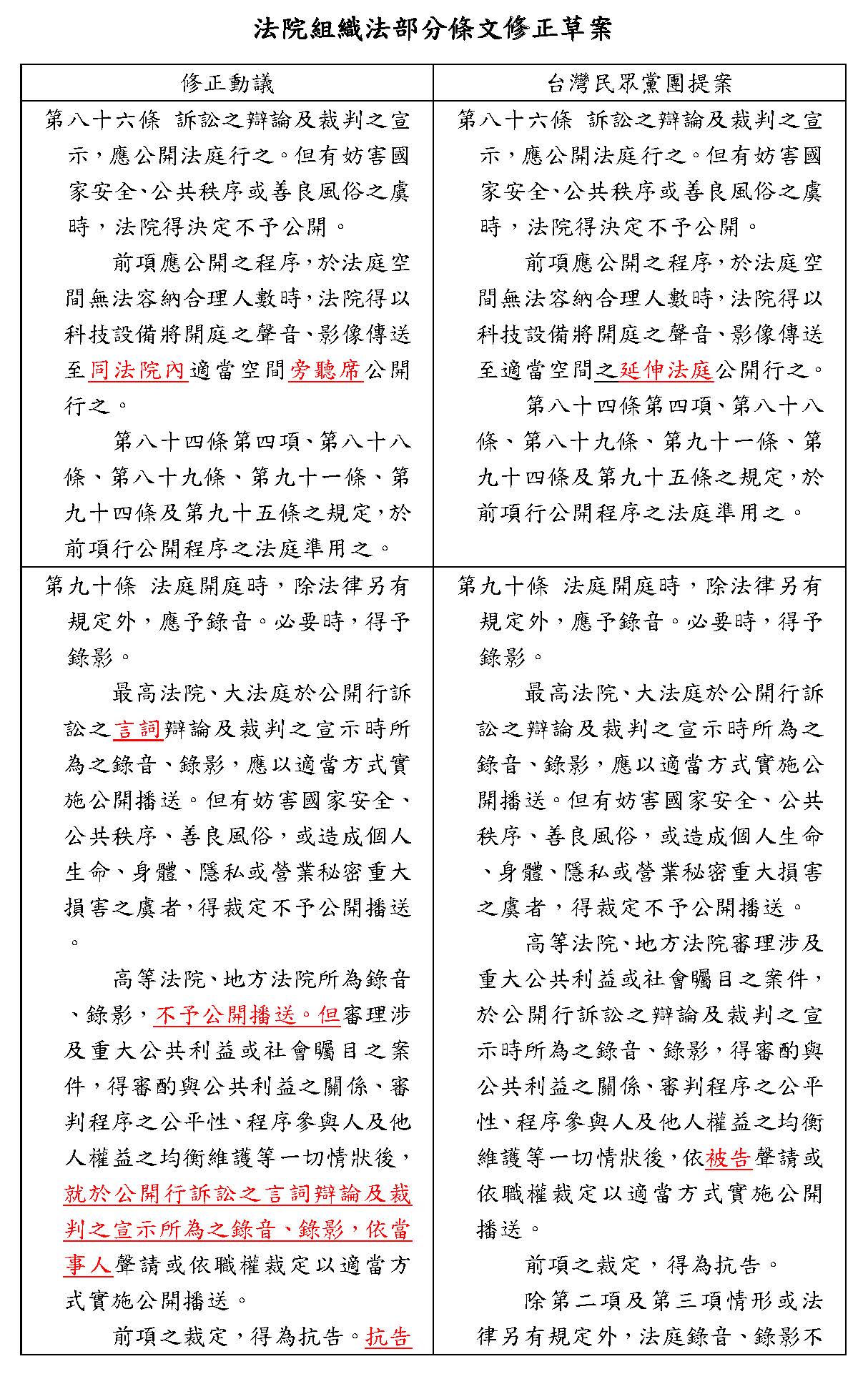 案由:本院台灣民眾黨黨團,有鑑於總統府司改國是會議於一百零六年做成決議,要求法律審之言詞辯論應全面直播,並研議事實審特定案件進行直播;為推動公開透明之司法,落實總統府司改國是會議之決議,爰擬具「法院組織法部分條文修正草案」,明定法律審應採「原則公開、例外不公開」、事實審則採「原則不公開、例外公開」等方式公開播送,並定明於法庭空間無法容納合理人數進行旁聽時,法院得以科技設備將開庭之聲音、影像傳送至適當空間之延伸法庭公開行之。是否有當?敬請公決。