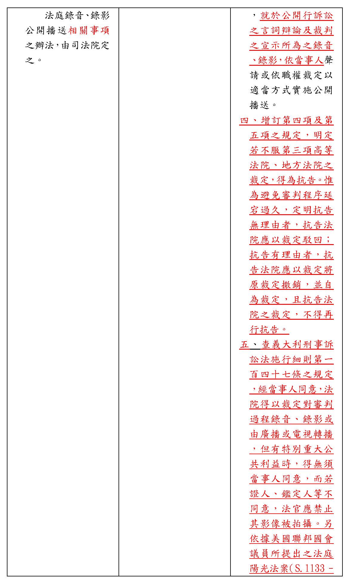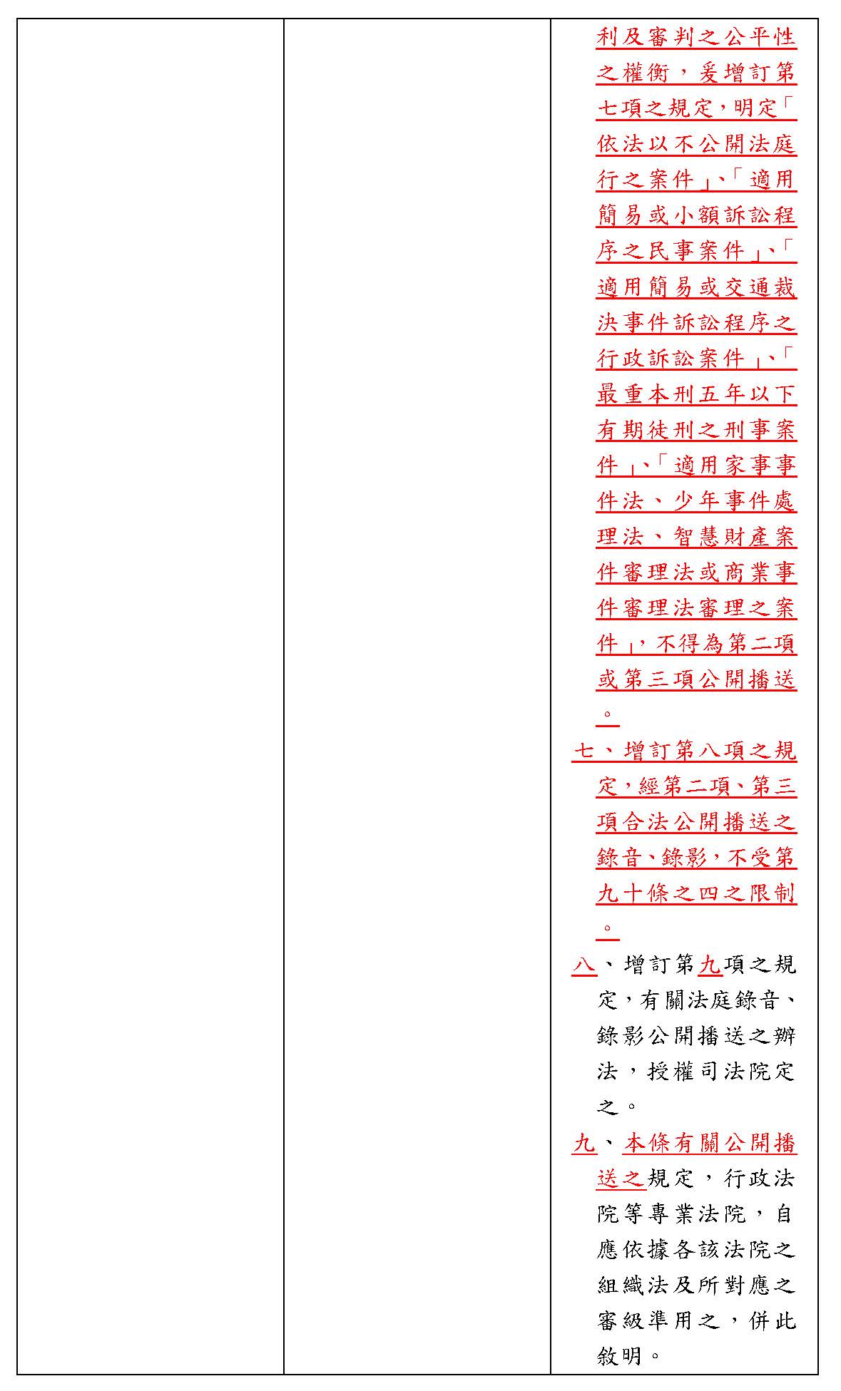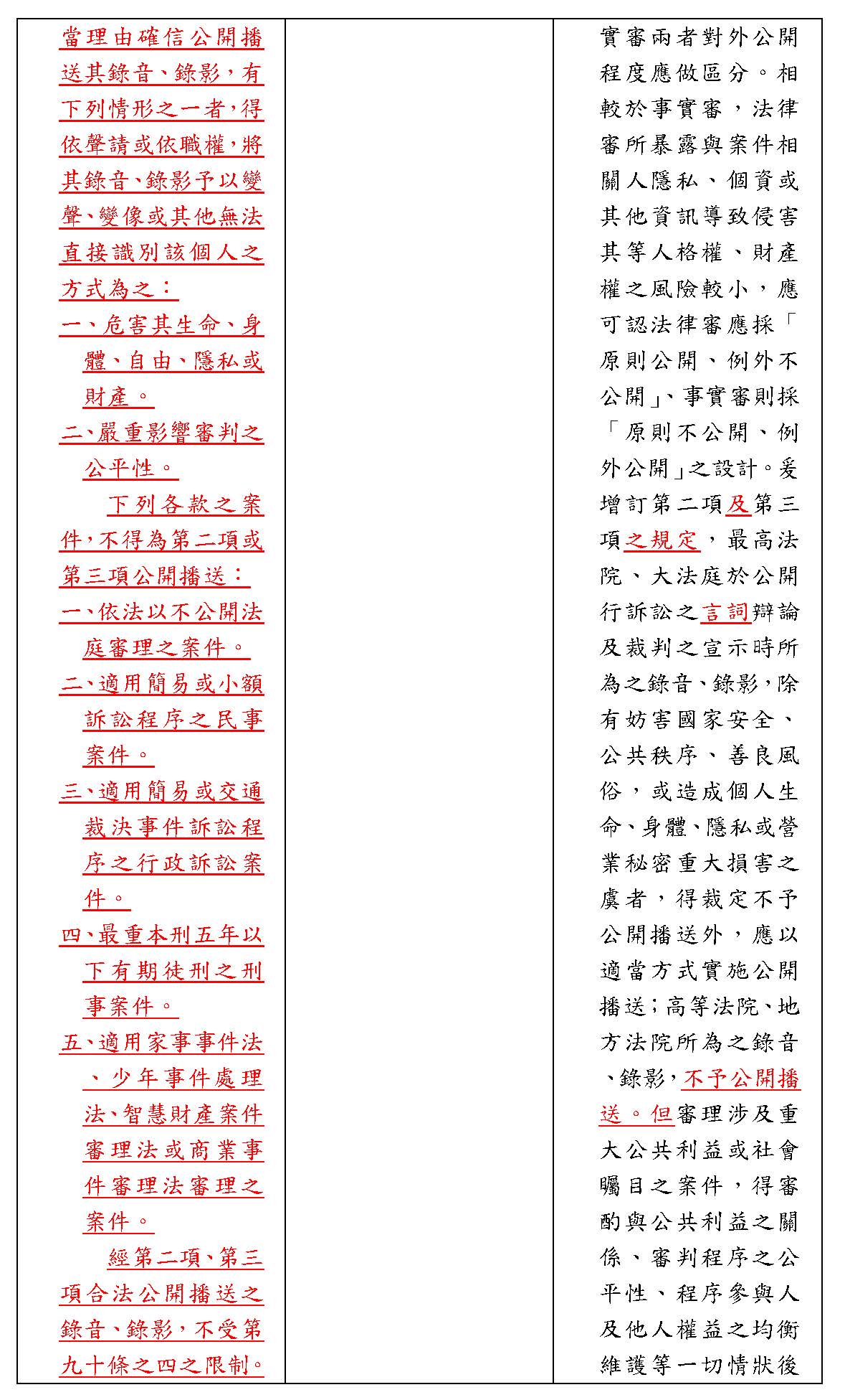 一、現行條文第二項移列第一項。 二、為推動公開透明之司法,總統府司改國是會議於一百零六年做成以下決議:「大法官憲法法庭、最高法院及最高行政法院召開言詞辯論庭應予直播」,且要求司法院針對地方法院、高等法院以及高等行政法院、智慧財產法院第一、二審案件,例如:民刑事選舉案件、刑事貪瀆案件、危害公眾利益(例如重大經濟案件)、弱勢族群及邊緣文化的訴訟和集體訴訟、高度憲政爭議及政治重大矚目案件以及高等行政法院所有案件,尤其食品安全、環境保護、及稅法案件等,在權衡確保人民知的權利、訴訟當事人公平審判權、被告、證人及關係人的人格權與實現公開透明的正當法律程序原則之下,一年內研議法庭直播的範圍與條件。然而,至今僅憲法法庭言詞辯論,依據憲法訴訟法第二十七條,應以適當方式實施公開播送外,其他法庭直播仍未有明確法源。 三、依上開總統府司改國是會議決議之意旨,法律審與事實審兩者對外公開程度應做區分。相較於事實審,法律審所暴露與案件相關人隱私、個資或其他資訊導致侵害其等人格權、財產權之風險較小,應可認法律審應採「原則公開、例外不公開」、事實審則採「原則不公開、例外公開」之設計。爰增訂第二項、第三項及第四項,最高法院、大法庭於公開行訴訟之辯論及裁判之宣示時所為之錄音、錄影,除有妨害國家安全、公共秩序、善良風俗,或造成個人生命、身體、隱私或營業秘密重大損害之虞者,得裁定不予公開播送外,應以適當方式實施公開播送;高等法院、地方法院審理涉及重大公共利益或社會矚目之案件,於公開行訴訟之辯論及裁判之宣示時所為之錄音、錄影,得審酌與公共利益之關係、審判程序之公平性、程序參與人及他人權益之均衡維護等一切情狀後,依被告聲請或依職權裁定以適當方式實施公開播送,而若不服此裁定,得為抗告。至於所謂適當方式,端視該案件實際需求而定,不限於將錄音、錄影之內容即時公開播送,亦可選擇延遲公開播送。 四、第二項、第三項及第四項之規定,行政法院、智慧財產及商業法院、少年及家事法院及懲戒法院等專業法院,自應依據各該法院之組織法及所對應之審級準用之,併此敘明。 五、增訂第五項之規定,明定除第二項及第三項情形或法律另有規定外,法庭錄音、錄影不得以任何形式為公開播送。 六、增訂第六項之規定,有關法庭錄音、錄影公開播送之辦法,授權司法院定之。 |