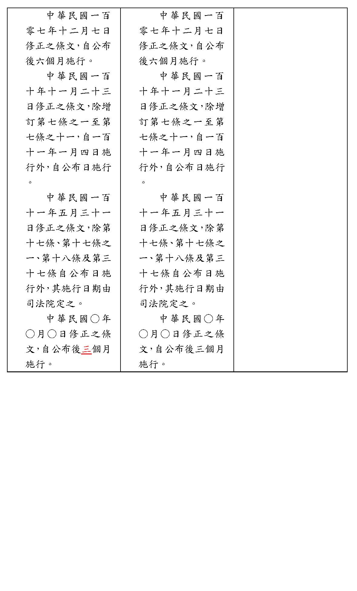 第 中華民國一百零五年五月二十七日修正之條文,自一百零六年一月一日施行。 中華民國一百零七年十二月七日修正之條文,自公布後六個月施行。 中華民國一百十年十一月二十三日修正之條文,除增訂第七條之一至第七條之十一,自一百十一年一月四日施行外,自公布日施行。 中華民國一百十一年五月三十一日修正之條文,除第十七條、第十七條之一、第十八條及第三十七條自公布日施行外,其施行日期由司法院定之。 中華民國○年○月○日修正之條文,自公布後三個月施行。 |