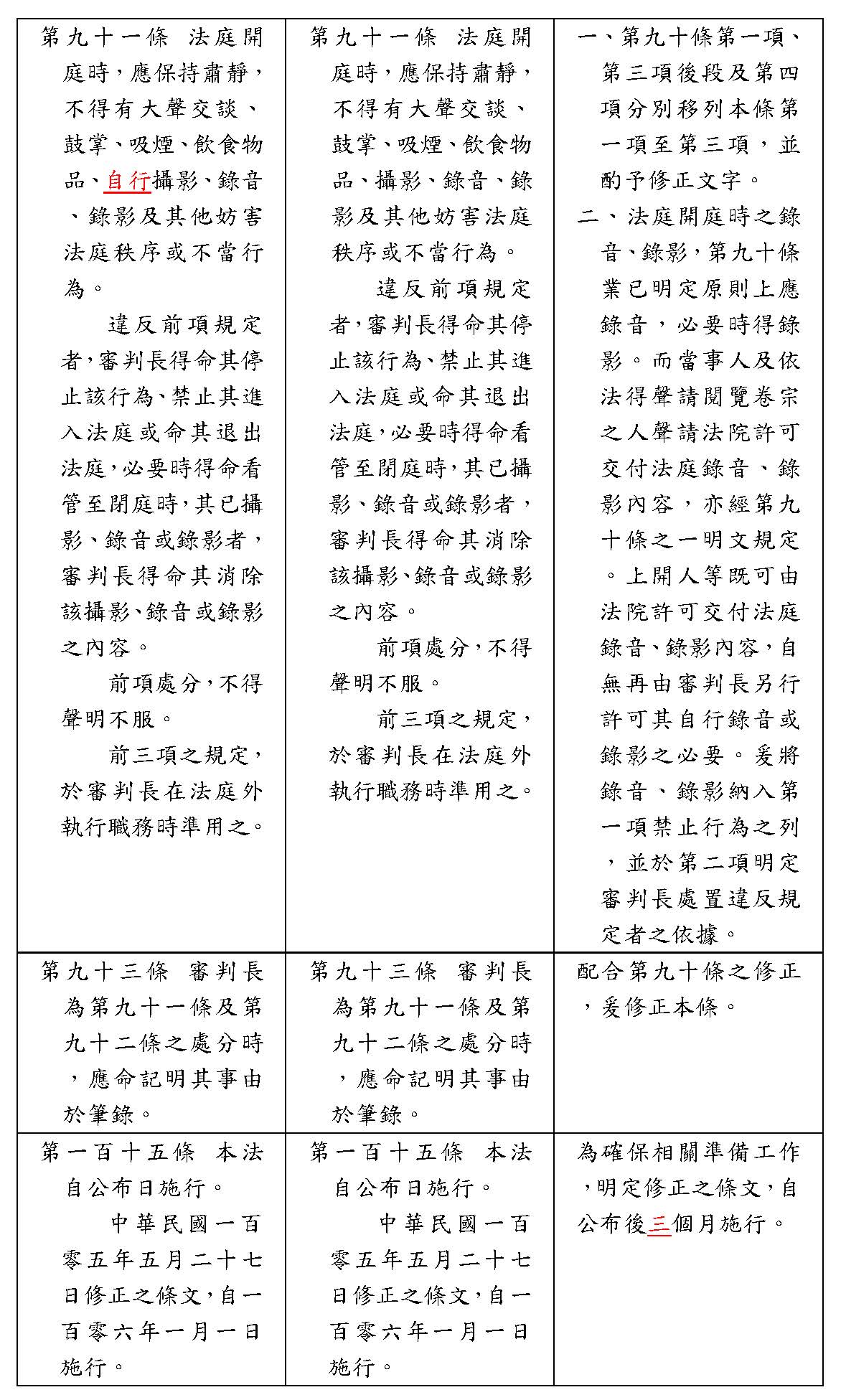 一、第九十條第一項、第三項後段及第四項分別移列本條第一項至第三項,並酌予修正文字。 二、法庭開庭時之錄音、錄影,第九十條業已明定原則上應錄音,必要時得錄影。而當事人及依法得聲請閱覽卷宗之人聲請法院許可交付法庭錄音、錄影內容,亦經第九十條之一明文規定。上開人等既可由法院許可交付法庭錄音、錄影內容,自無再由審判長另行許可其自行錄音或錄影之必要。爰將錄音、錄影納入第一項禁止行為之列,並於第二項明定審判長處置違反規定者之依據。 |