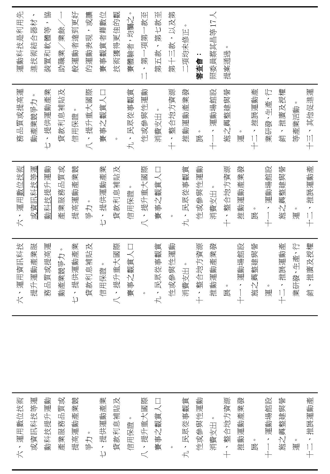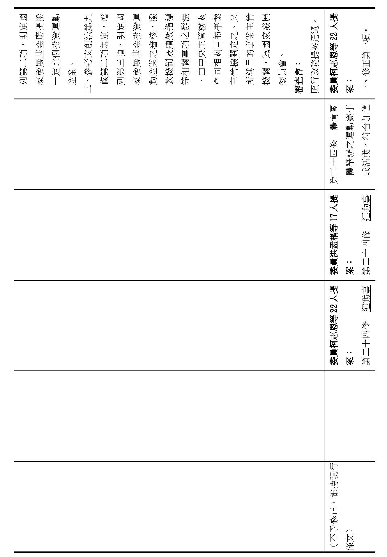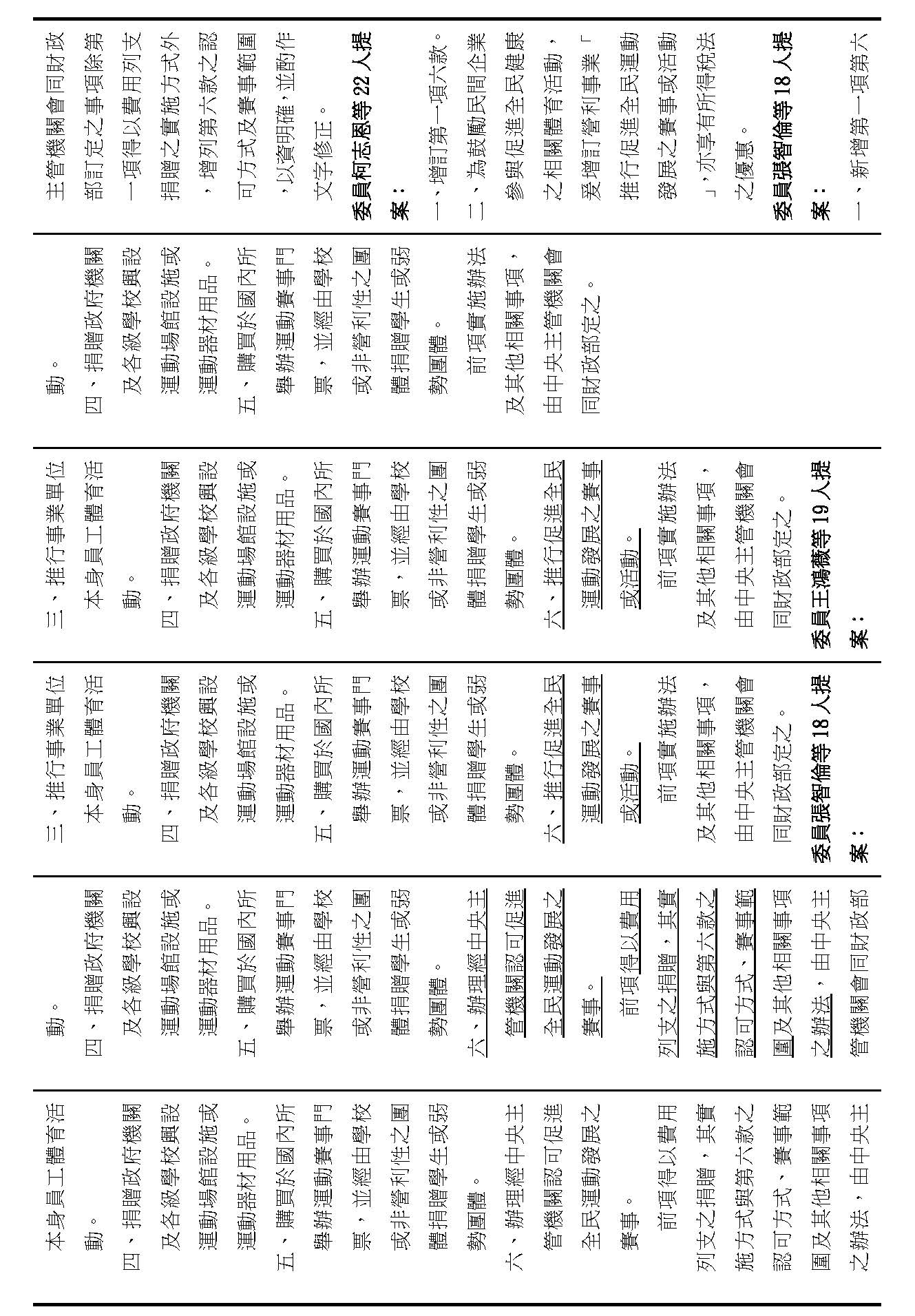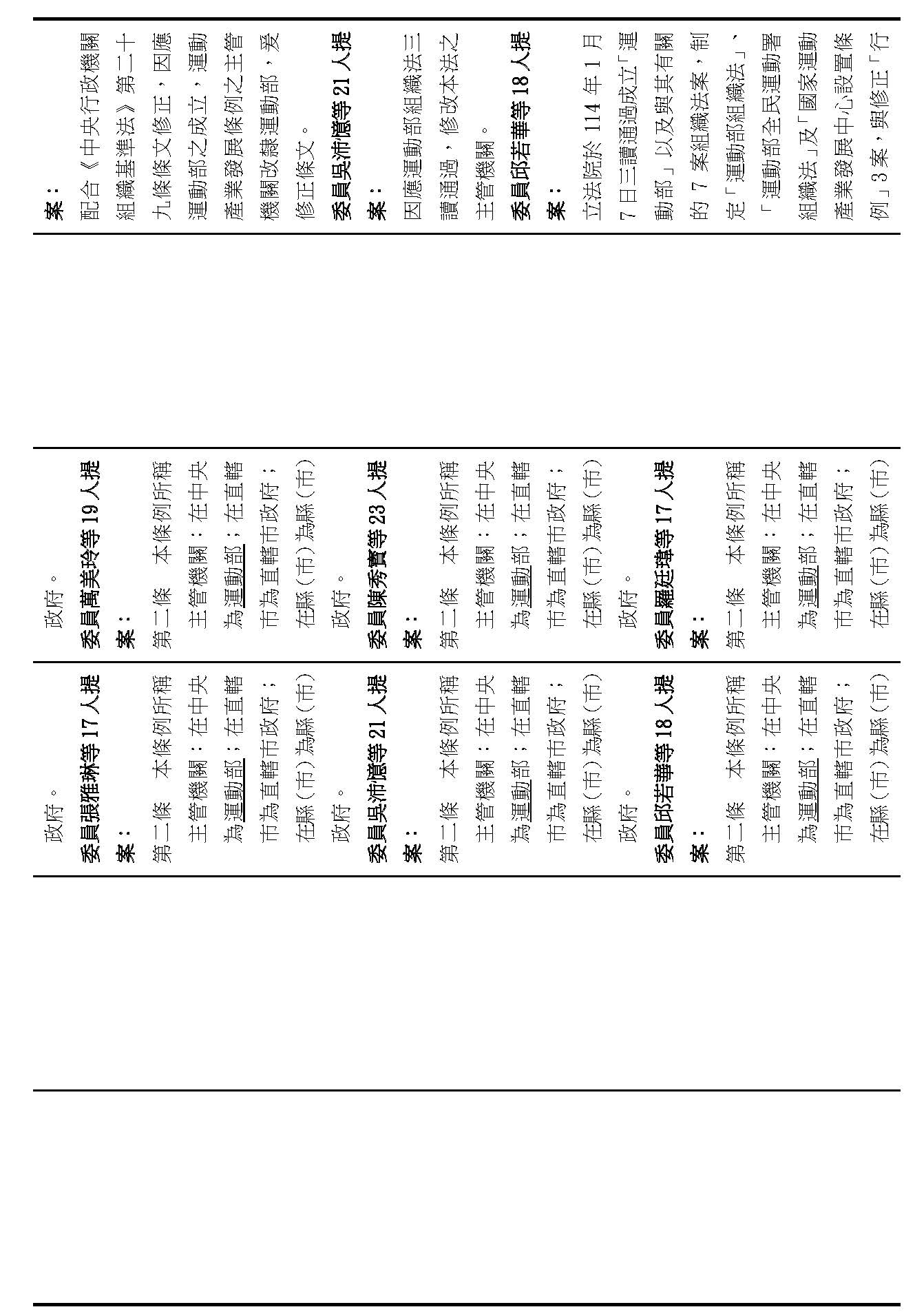 併案審查行政院函請審議「運動產業發展條例第十三條、第二十六條及第二十六條之二條文修正草案」、委員柯志恩等22人擬具「運動產業發展條例第二十四條及第二十六條條文修正草案」、委員張智倫等18人擬具「運動產業發展條例第二十四條及第二十六條條文修正草案」、委員洪孟楷等17人擬具「運動產業發展條例第二十四條及第二十六條條文修正草案」、委員王鴻薇等19人擬具「運動產業發展條例第二十四條及第二十六條條文修正草案」、委員林倩綺等22人擬具「運動產業發展條例第四條條文修正草案」、委員沈發惠等19人擬具「運動產業發展條例第二條條文修正草案」、委員許宇甄等17人擬具「運動產業發展條例第二十四條及第二十六條條文修正草案」、委員萬美玲等19人擬具「運動產業發展條例第二條、第二十四條及第二十六條條文修正草案」、委員楊瓊瓔等27人擬具「運動產業發展條例第二十四條及第二十六條條文修正草案」、委員林倩綺等18人擬具「運動產業發展條例第二十六條之二條文修正草案」、委員邱鎮軍等19人擬具「運動產業發展條例第二條、第二十四條及第二十六條條文修正草案」、委員黃捷等17人擬具「運動產業發展條例第二十六條之二條文修正草案」、委員張雅琳等17人擬具「運動產業發展條例部分條文修正草案」、委員吳沛憶等21人擬具「運動產業發展條例部分條文修正草案」、委員葉元之等18人擬具「運動產業發展條例第二十四條及第二十六條條文修正草案」、委員林宜瑾等28人擬具「運動產業發展條例第二十六條之二條文修正草案」、委員邱若華等18人擬具「運動產業發展條例第二條及第二十六條條文修正草案」、台灣民眾黨黨團擬具「運動產業發展條例第二十四條及第二十六條條文修正草案」、委員陳秀寳等23人擬具「運動產業發展條例部分條文修正草案」、委員羅廷瑋等17人擬具「運動產業發展條例第二條、第二十四條及第二十六條條文修正草案」、委員徐巧芯等16人擬具「運動產業發展條例第二十四條及第二十六條條文修正草案」、委員葛如鈞等17人擬具「運動產業發展條例第二十四條及第二十六條條文修正草案」、委員徐欣瑩等22人擬具「運動產業發展條例部分條文修正草案」、委員伍麗華Saidhai Tahovecahe等18人擬具「運動產業發展條例部分條文修正草案」、委員廖偉翔等16人擬具「運動產業發展條例第二十四條及第二十六條條文修正草案」、委員蔡其昌等17人擬具「運動產業發展條例部分條文修正草案」、委員張智倫等19人擬具「運動產業發展條例第十三條、第二十六條及第二十六條之二條文修正草案」、委員李坤城等19人擬具「運動產業發展條例第十三條、第二十六條及第二十六條之二條文修正草案」、委員葉元之等19人擬具「運動產業發展條例第二十六條之二條文修正草案」、委員王美惠等18人擬具「運動產業發展條例第十三條、第二十六條及第二十六條之二條文修正草案」、委員吳琪銘等19人擬具「運動產業發展條例第十三條、第二十六條及第二十六條之二條文修正草案」、委員邱鎮軍等18人擬具「運動產業發展條例第十三條及第二十六條之二條文修正草案」等33案審查報告
