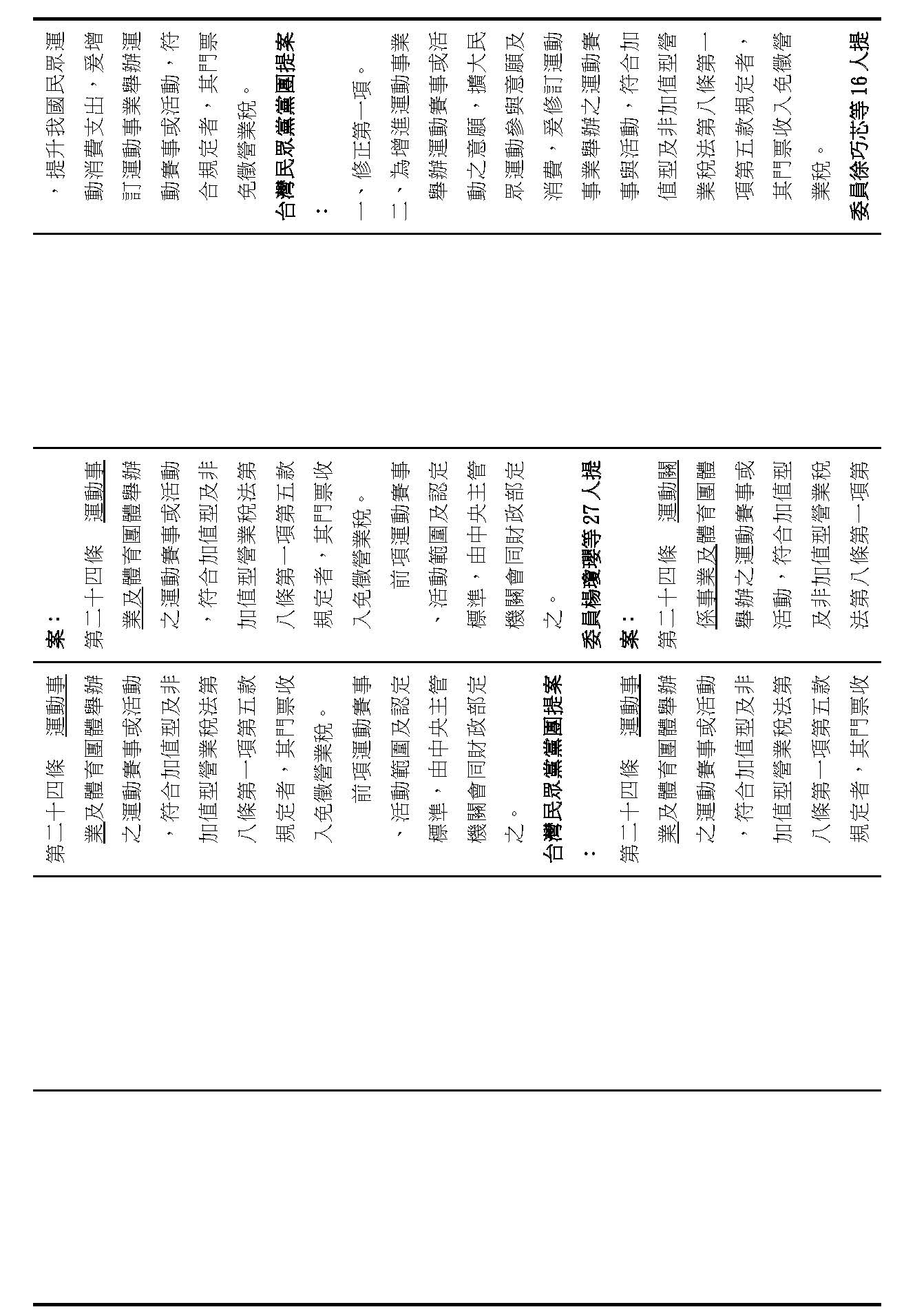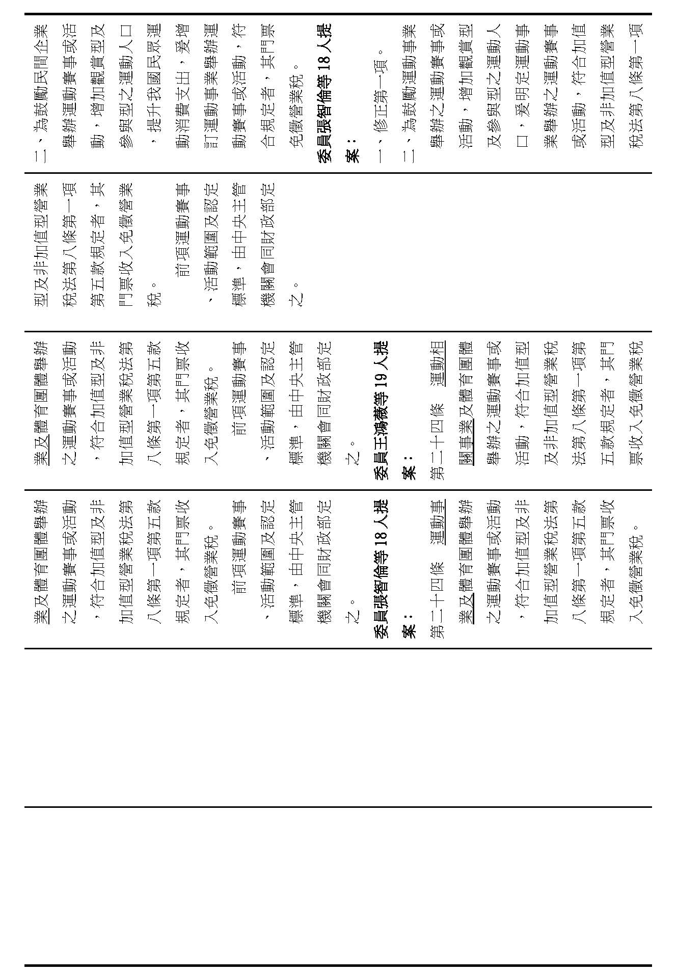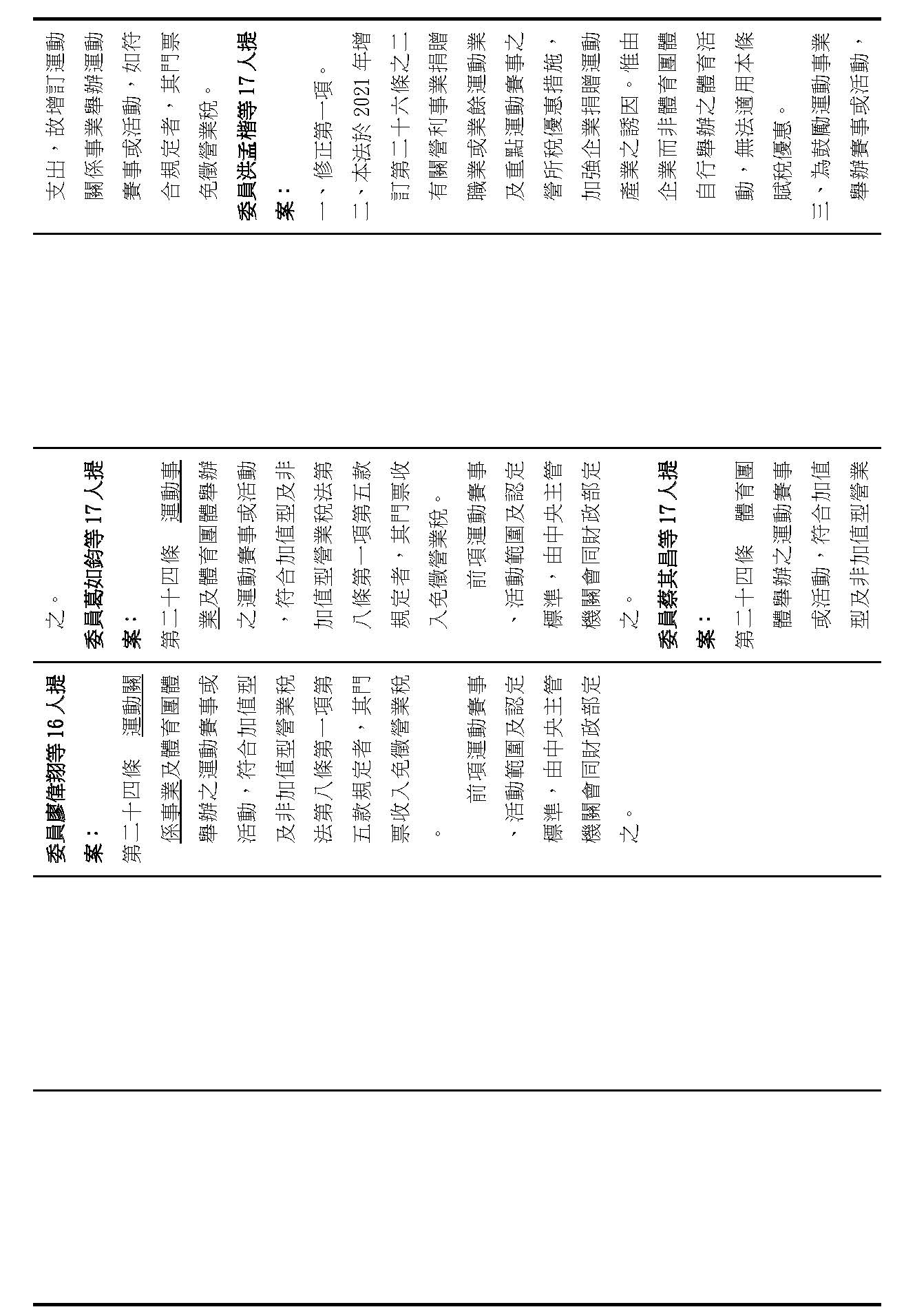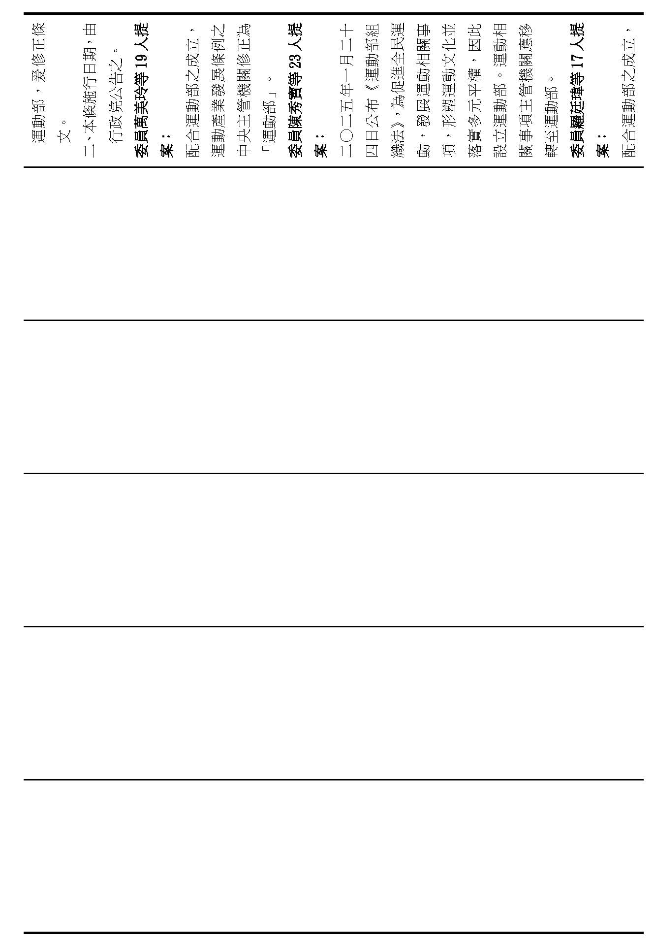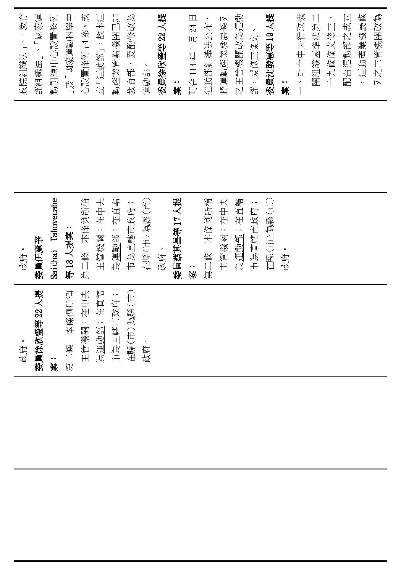 併案審查行政院函請審議「運動產業發展條例第十三條、第二十六條及第二十六條之二條文修正草案」、委員柯志恩等22人擬具「運動產業發展條例第二十四條及第二十六條條文修正草案」、委員張智倫等18人擬具「運動產業發展條例第二十四條及第二十六條條文修正草案」、委員洪孟楷等17人擬具「運動產業發展條例第二十四條及第二十六條條文修正草案」、委員王鴻薇等19人擬具「運動產業發展條例第二十四條及第二十六條條文修正草案」、委員林倩綺等22人擬具「運動產業發展條例第四條條文修正草案」、委員沈發惠等19人擬具「運動產業發展條例第二條條文修正草案」、委員許宇甄等17人擬具「運動產業發展條例第二十四條及第二十六條條文修正草案」、委員萬美玲等19人擬具「運動產業發展條例第二條、第二十四條及第二十六條條文修正草案」、委員楊瓊瓔等27人擬具「運動產業發展條例第二十四條及第二十六條條文修正草案」、委員林倩綺等18人擬具「運動產業發展條例第二十六條之二條文修正草案」、委員邱鎮軍等19人擬具「運動產業發展條例第二條、第二十四條及第二十六條條文修正草案」、委員黃捷等17人擬具「運動產業發展條例第二十六條之二條文修正草案」、委員張雅琳等17人擬具「運動產業發展條例部分條文修正草案」、委員吳沛憶等21人擬具「運動產業發展條例部分條文修正草案」、委員葉元之等18人擬具「運動產業發展條例第二十四條及第二十六條條文修正草案」、委員林宜瑾等28人擬具「運動產業發展條例第二十六條之二條文修正草案」、委員邱若華等18人擬具「運動產業發展條例第二條及第二十六條條文修正草案」、台灣民眾黨黨團擬具「運動產業發展條例第二十四條及第二十六條條文修正草案」、委員陳秀寳等23人擬具「運動產業發展條例部分條文修正草案」、委員羅廷瑋等17人擬具「運動產業發展條例第二條、第二十四條及第二十六條條文修正草案」、委員徐巧芯等16人擬具「運動產業發展條例第二十四條及第二十六條條文修正草案」、委員葛如鈞等17人擬具「運動產業發展條例第二十四條及第二十六條條文修正草案」、委員徐欣瑩等22人擬具「運動產業發展條例部分條文修正草案」、委員伍麗華Saidhai Tahovecahe等18人擬具「運動產業發展條例部分條文修正草案」、委員廖偉翔等16人擬具「運動產業發展條例第二十四條及第二十六條條文修正草案」、委員蔡其昌等17人擬具「運動產業發展條例部分條文修正草案」、委員張智倫等19人擬具「運動產業發展條例第十三條、第二十六條及第二十六條之二條文修正草案」、委員李坤城等19人擬具「運動產業發展條例第十三條、第二十六條及第二十六條之二條文修正草案」、委員葉元之等19人擬具「運動產業發展條例第二十六條之二條文修正草案」、委員王美惠等18人擬具「運動產業發展條例第十三條、第二十六條及第二十六條之二條文修正草案」、委員吳琪銘等19人擬具「運動產業發展條例第十三條、第二十六條及第二十六條之二條文修正草案」、委員邱鎮軍等18人擬具「運動產業發展條例第十三條及第二十六條之二條文修正草案」等33案審查報告