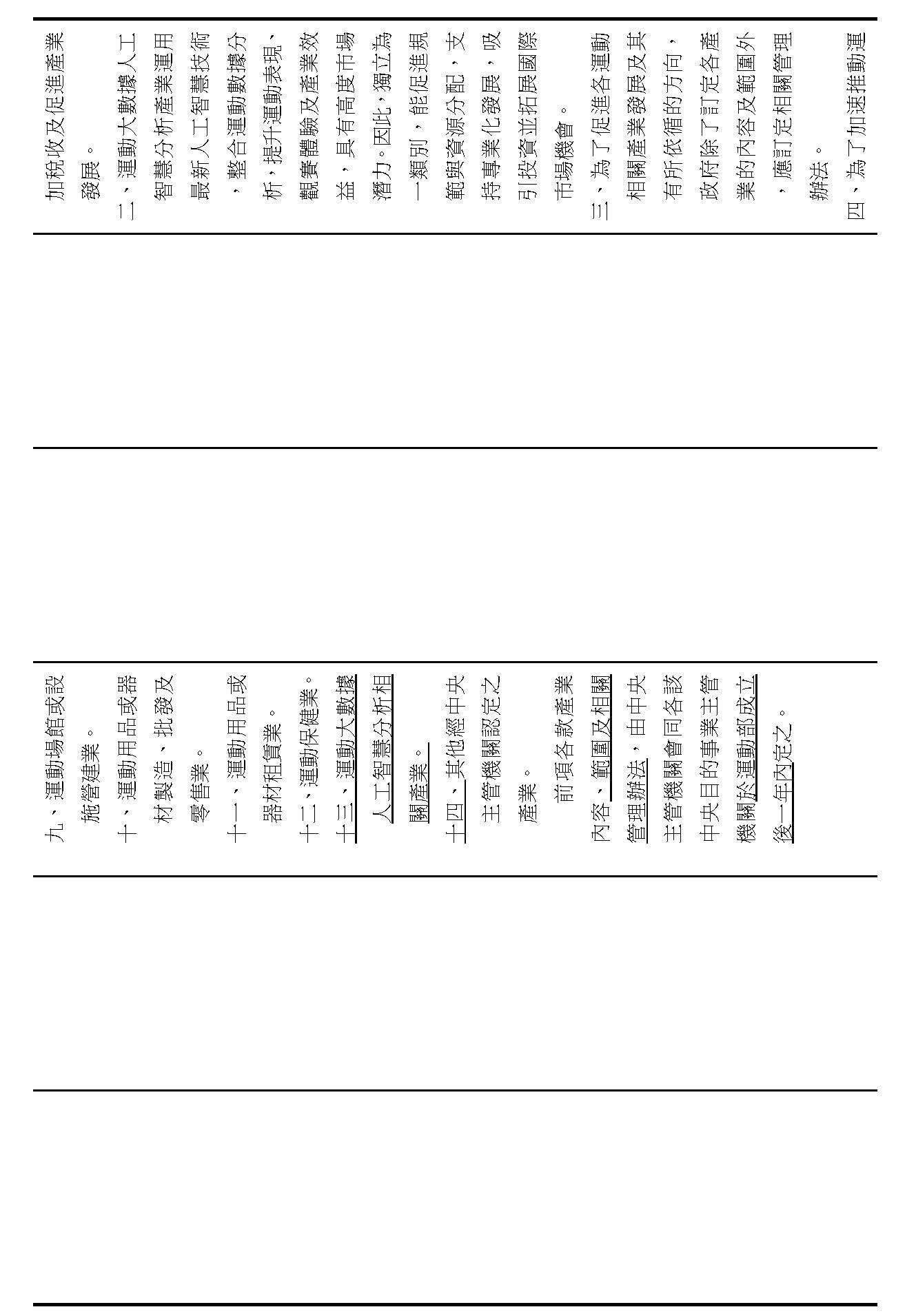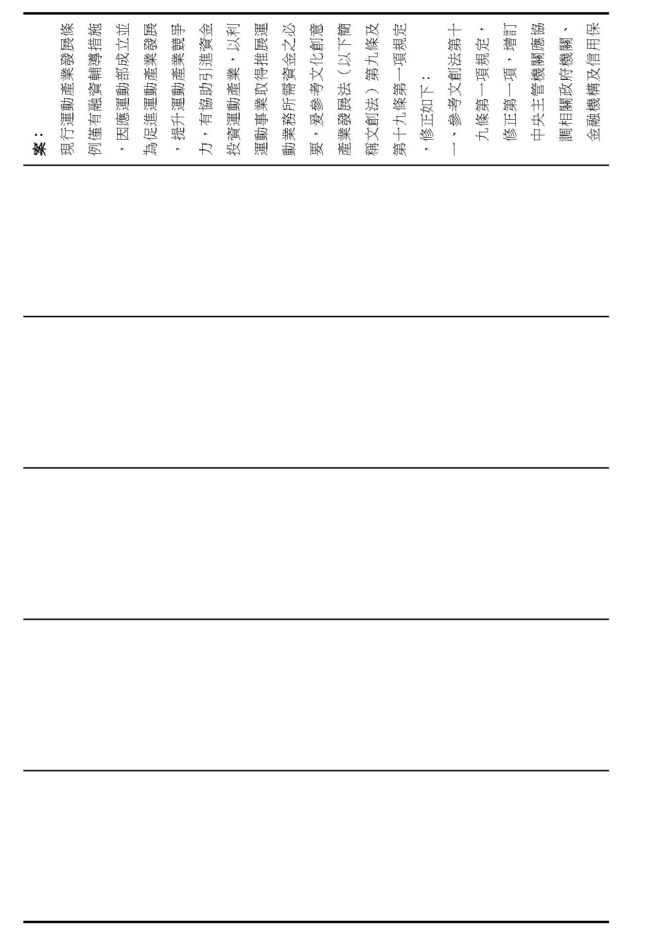 鑒於教育部所屬「體育署」將於今(114)年9月改制為「運動部」,為打造全民參與、多元發展、創新驅動的運動產業國家,引進政府相關基金或民間企業資金投資運動產業,以利運動事業取得推展業務所需資金,並針對投資運動產業之企業提供減稅、延長減稅抵減期限等優惠措施;爰擬具「運動產業發展條例第十三條、第二十六條及第二十六條之二條文修正草案」,期能帶動全民運動風氣,建立良好運動習慣,以運動壯大臺灣。