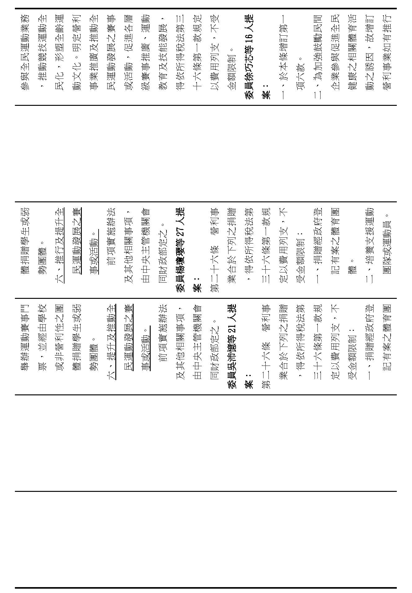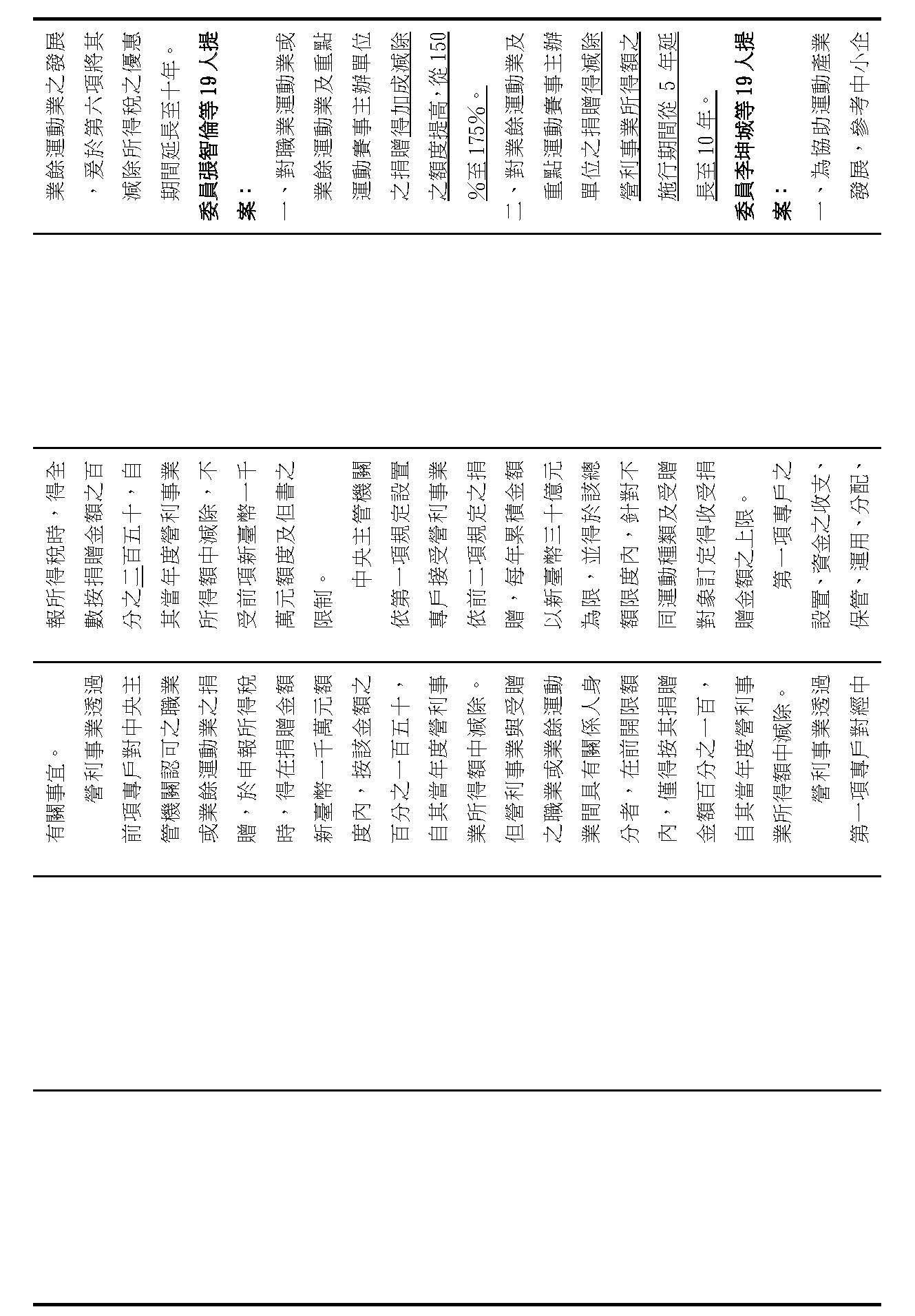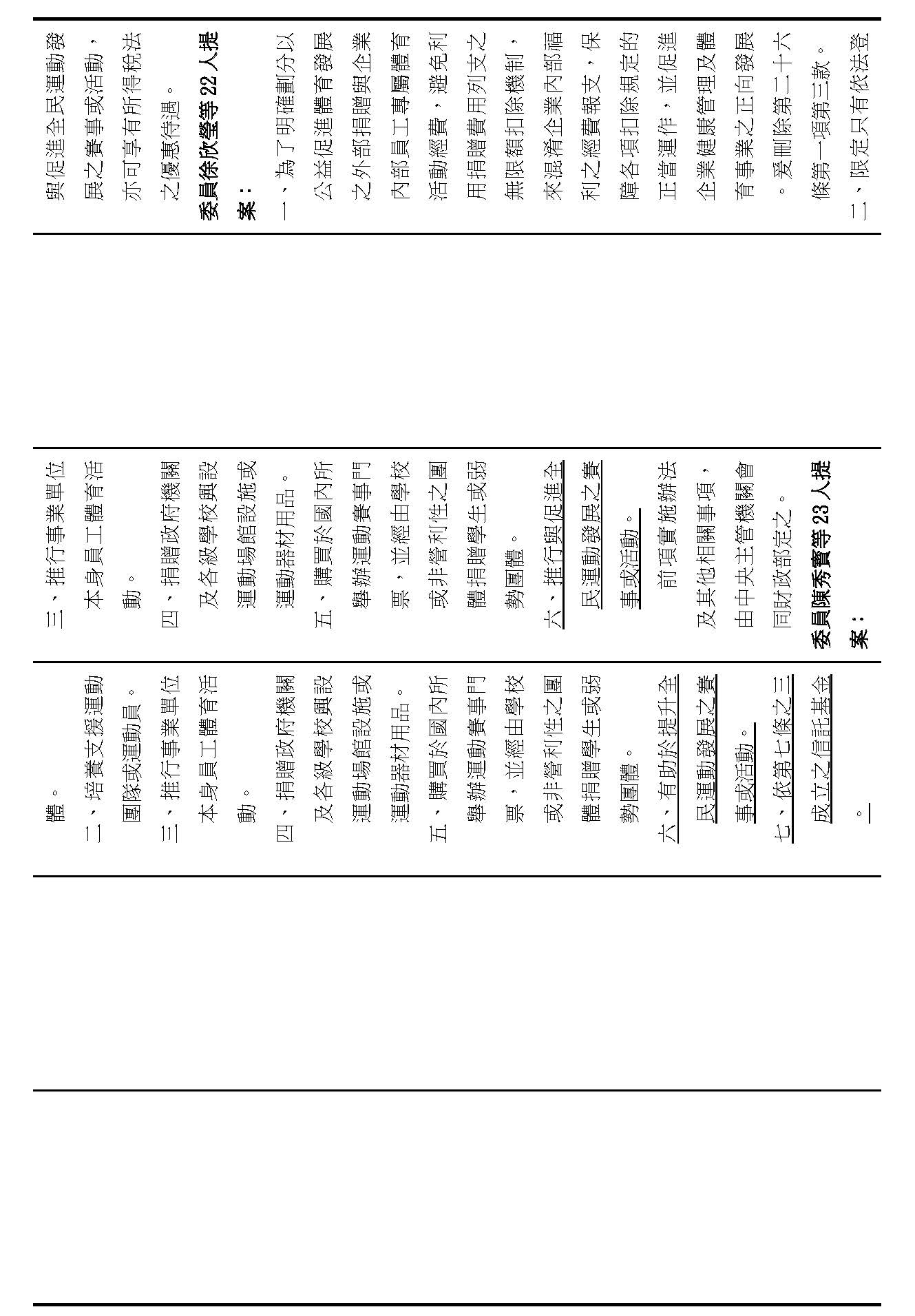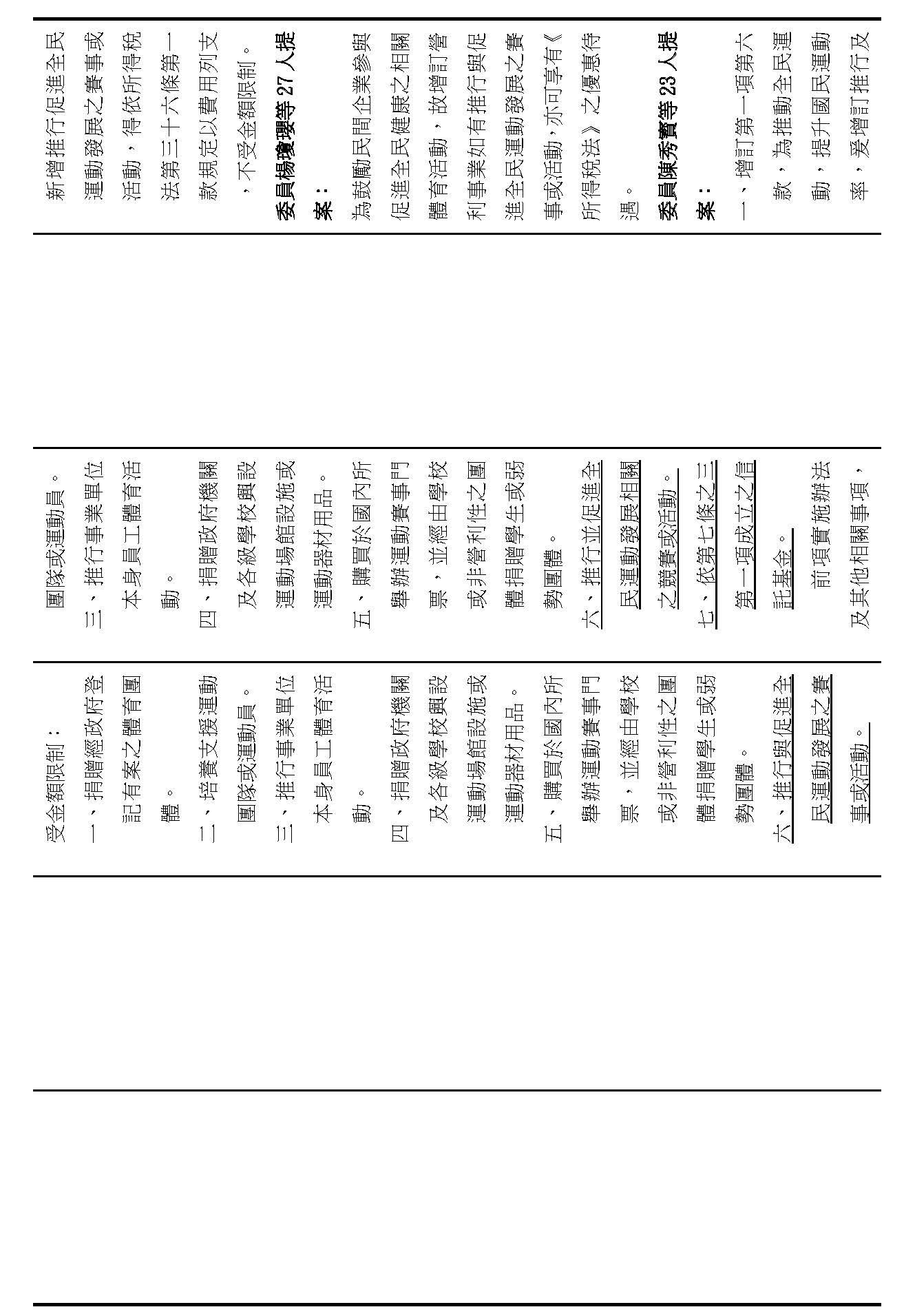 張委員智倫:(9時16分)院長、各位同仁、媒體朋友,大家好。我國運動選手為國爭光,這些選手們的好表現不只提升全民運動的風氣,同時也帶動體育賽事的發展,讓更多人開始並投入運動。然而過去的法規偏重於競技運動,比如捐錢給國家代表隊、體育學會或學校蓋場館才有稅務上的優惠,但現在的運動不只是專業選手的事,很多企業、社區甚至是里辦公室都已經自己開始辦路跑、籃球賽或交流賽,但因為法規的限制,都不能列入費用扣除,因此今天修法通過的第二十六條條文,只要經過主管機關認可,對全民運動有幫助的賽事,不論是企業出資贊助或實際主辦,都可以列入所得稅費用來扣除。修法的目的是讓支持全民運動這件事情更有誘因,不僅可以讓運動發展注入更多的資金,也讓企業更有意願將資源投入各項賽事運動,讓更多民間資源能順利進場推廣全民運動。