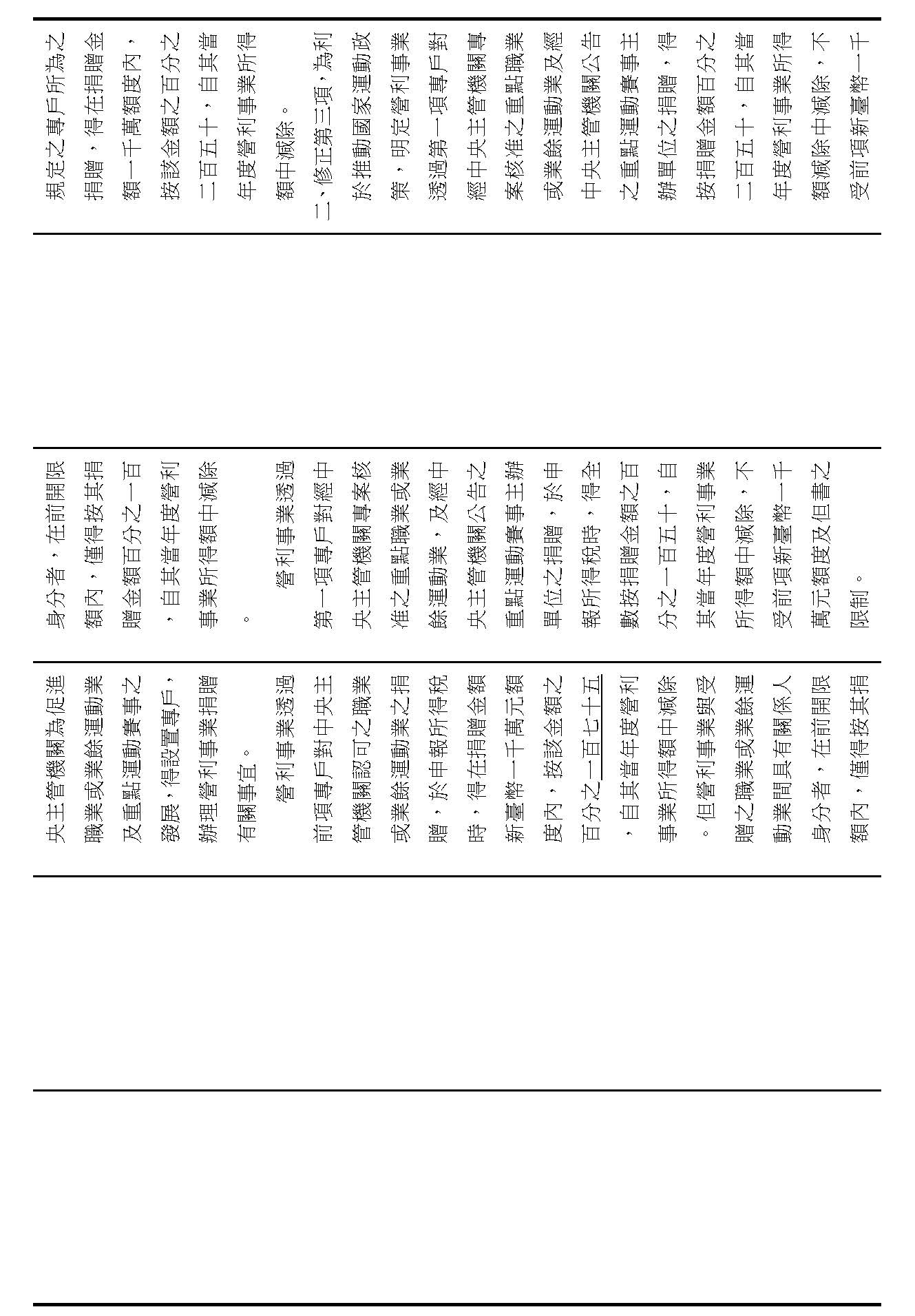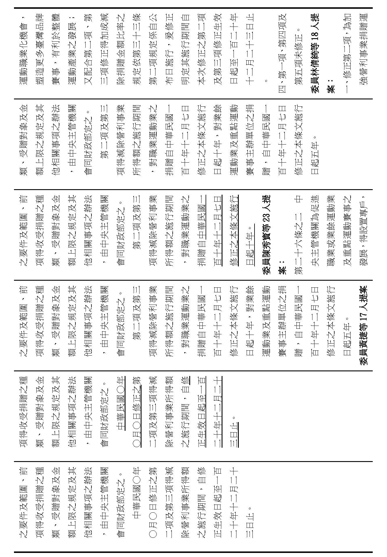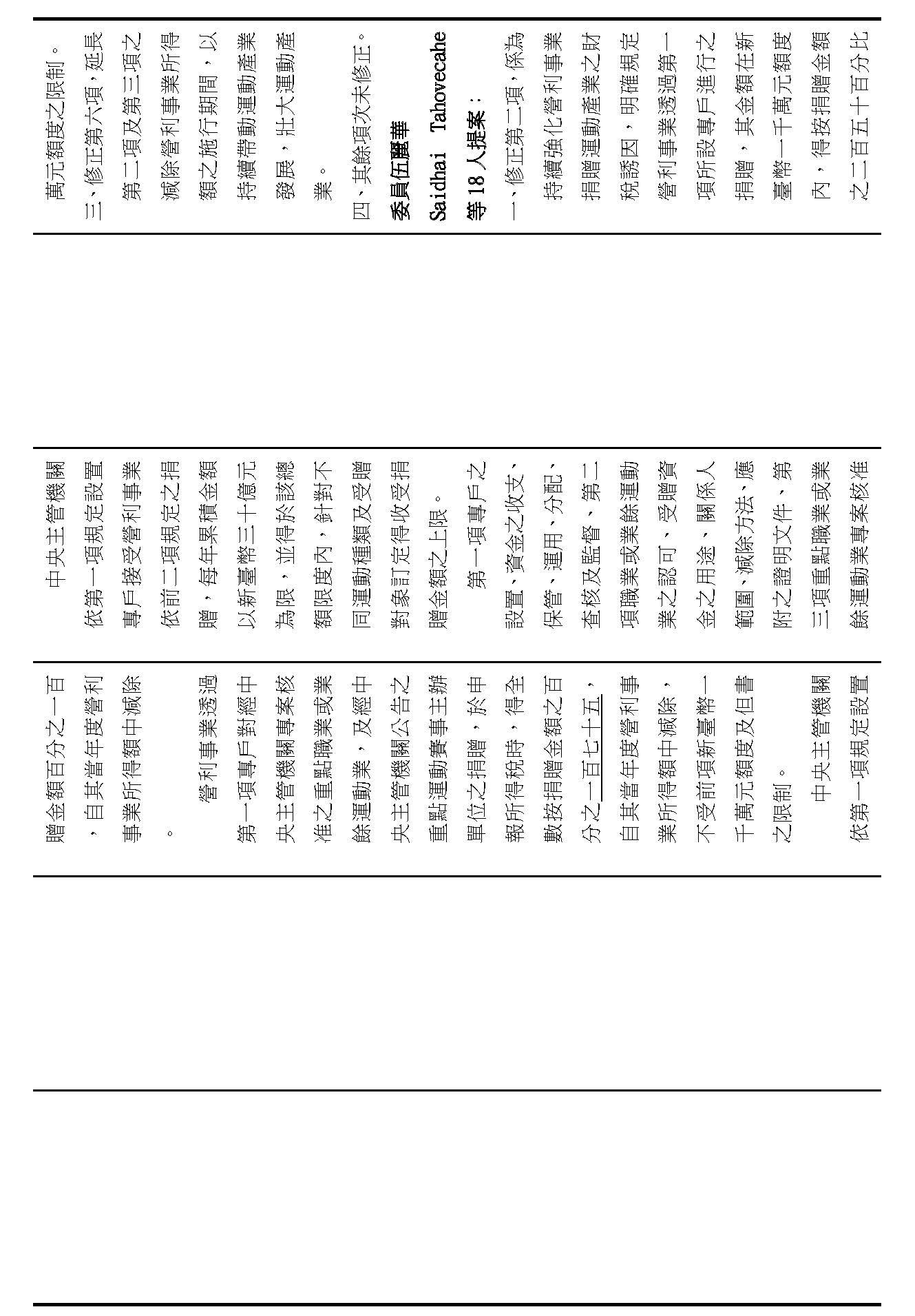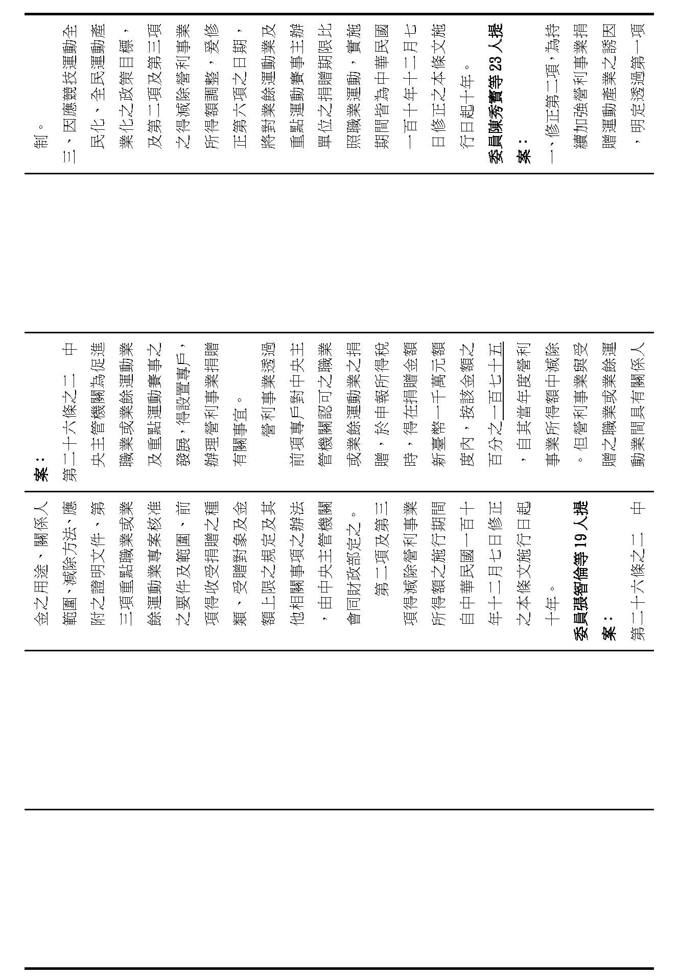 張委員智倫:(9時16分)院長、各位同仁、媒體朋友,大家好。我國運動選手為國爭光,這些選手們的好表現不只提升全民運動的風氣,同時也帶動體育賽事的發展,讓更多人開始並投入運動。然而過去的法規偏重於競技運動,比如捐錢給國家代表隊、體育學會或學校蓋場館才有稅務上的優惠,但現在的運動不只是專業選手的事,很多企業、社區甚至是里辦公室都已經自己開始辦路跑、籃球賽或交流賽,但因為法規的限制,都不能列入費用扣除,因此今天修法通過的第二十六條條文,只要經過主管機關認可,對全民運動有幫助的賽事,不論是企業出資贊助或實際主辦,都可以列入所得稅費用來扣除。修法的目的是讓支持全民運動這件事情更有誘因,不僅可以讓運動發展注入更多的資金,也讓企業更有意願將資源投入各項賽事運動,讓更多民間資源能順利進場推廣全民運動。