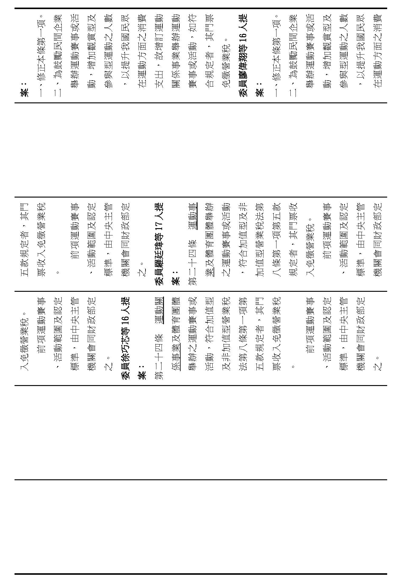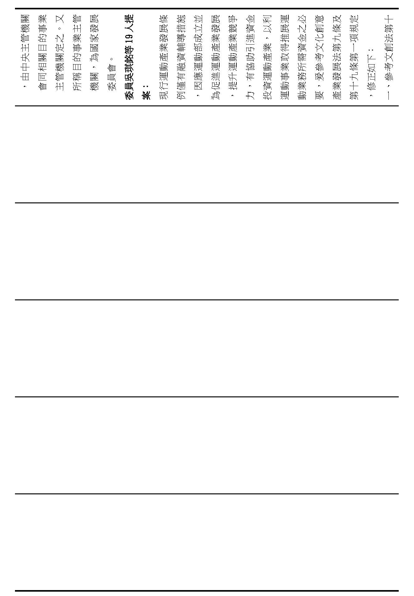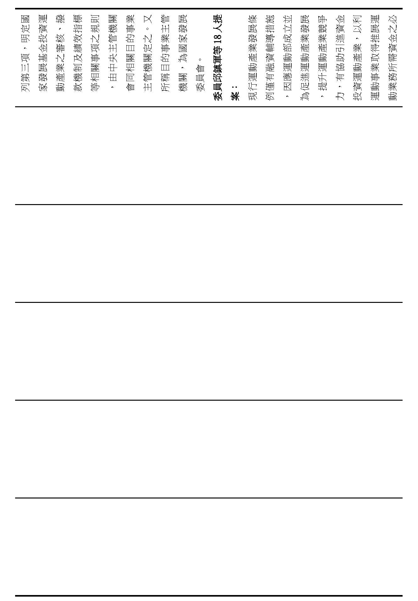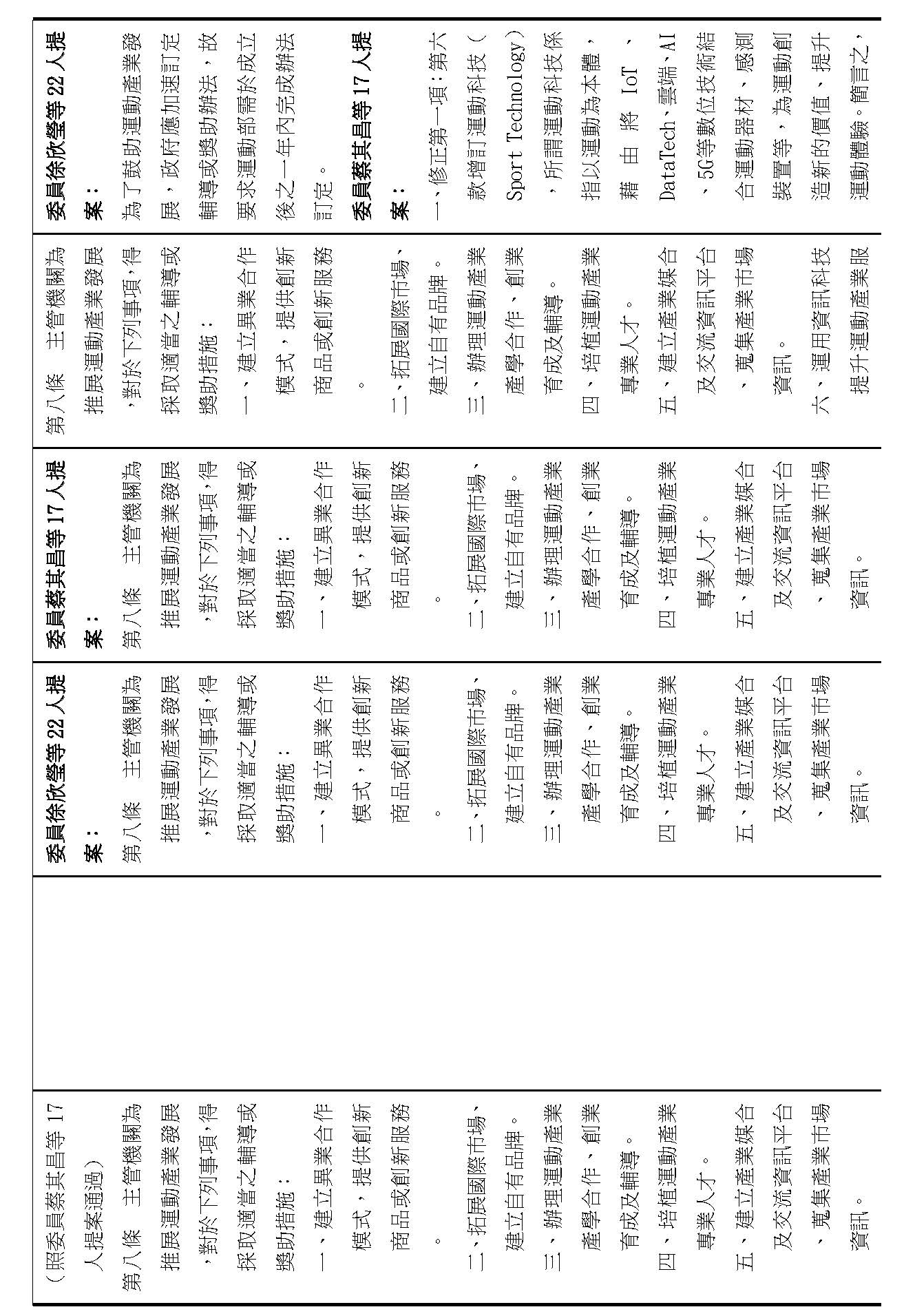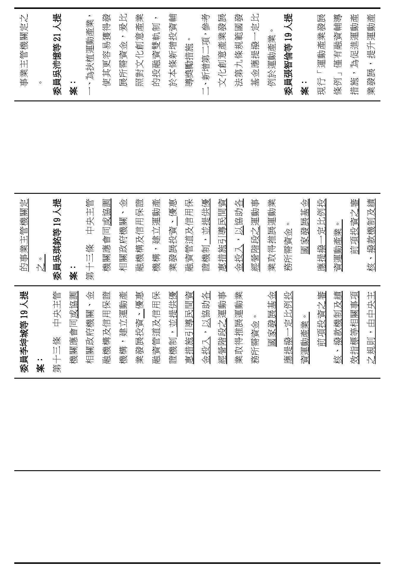 劉委員書彬:(9時18分)主席、各位同仁,大家早安。我國運動產業近年在國際體壇上表現亮眼,帶起全民運動和觀賞賽事的風氣。為繼續支持體育發展,教育及文化委員會於上個月25日審查通過運動產業發展條例部分條文的修訂。