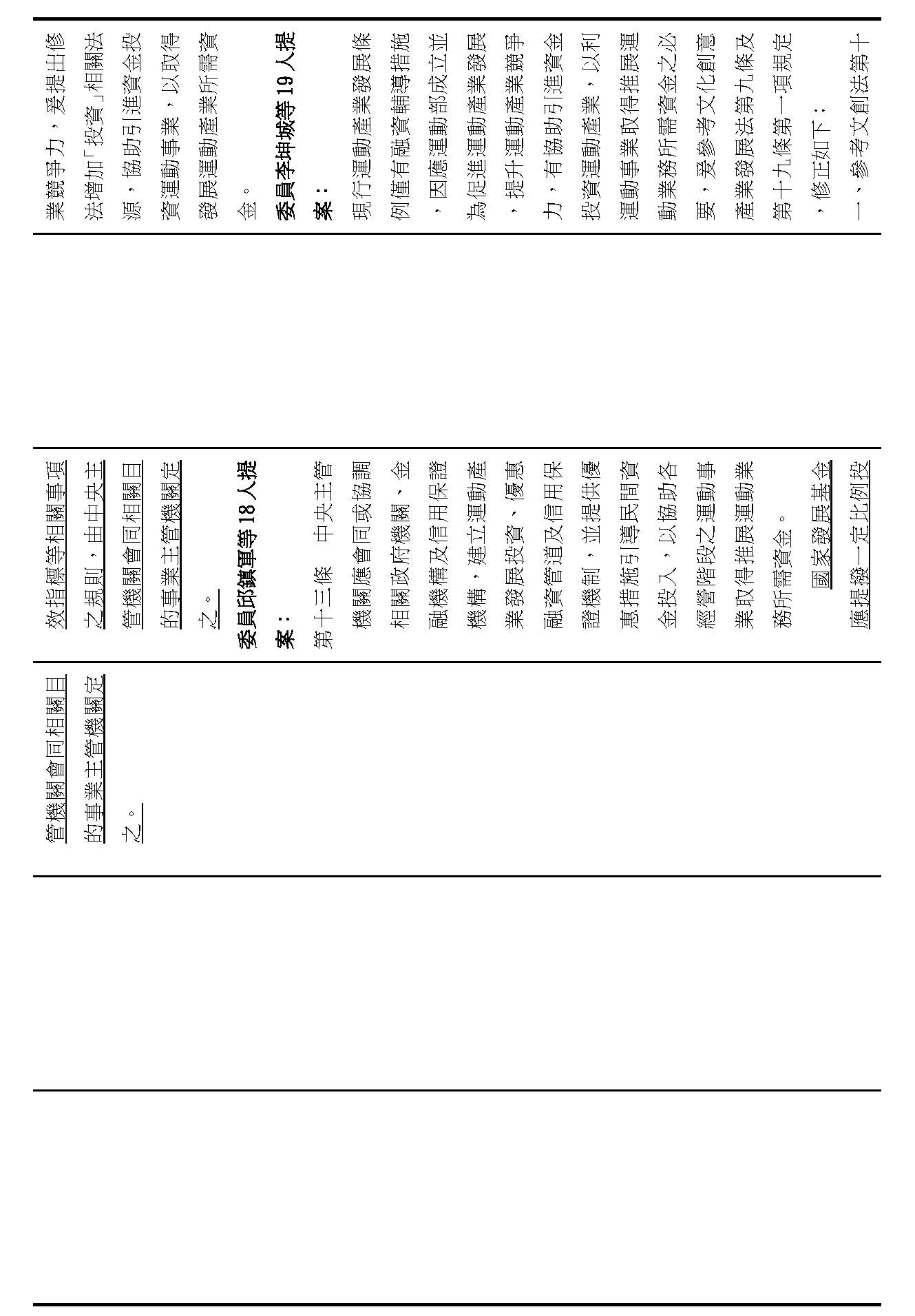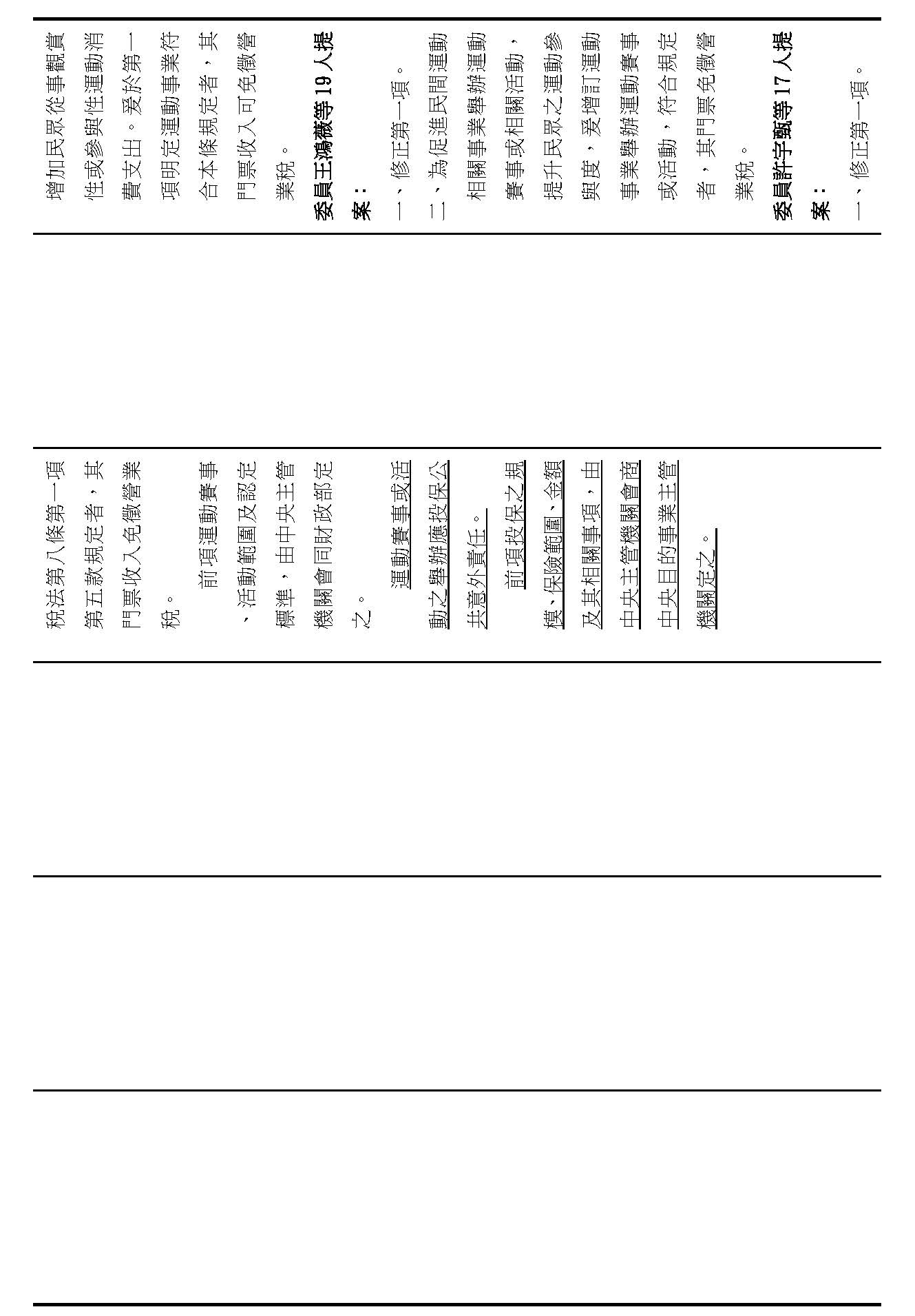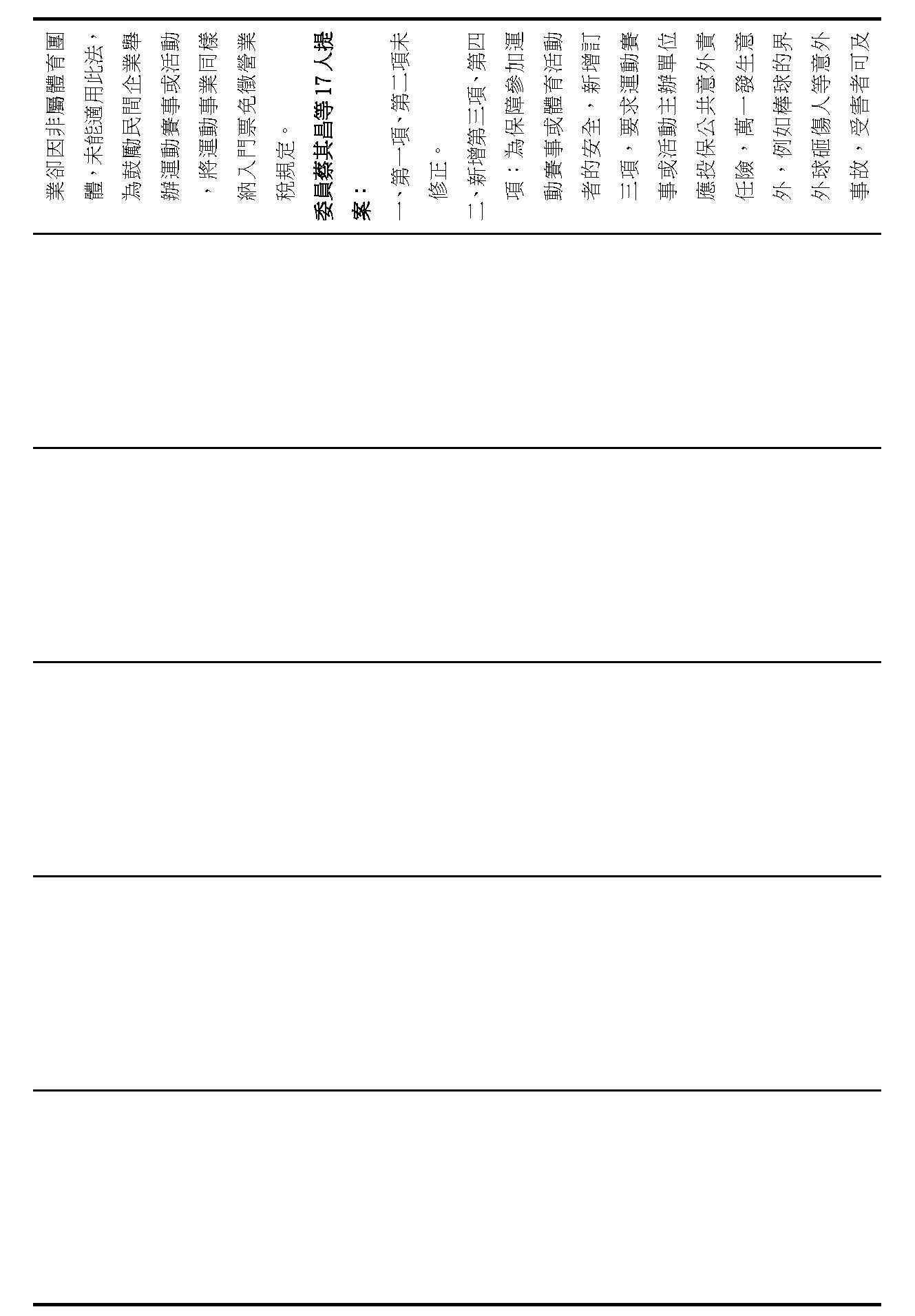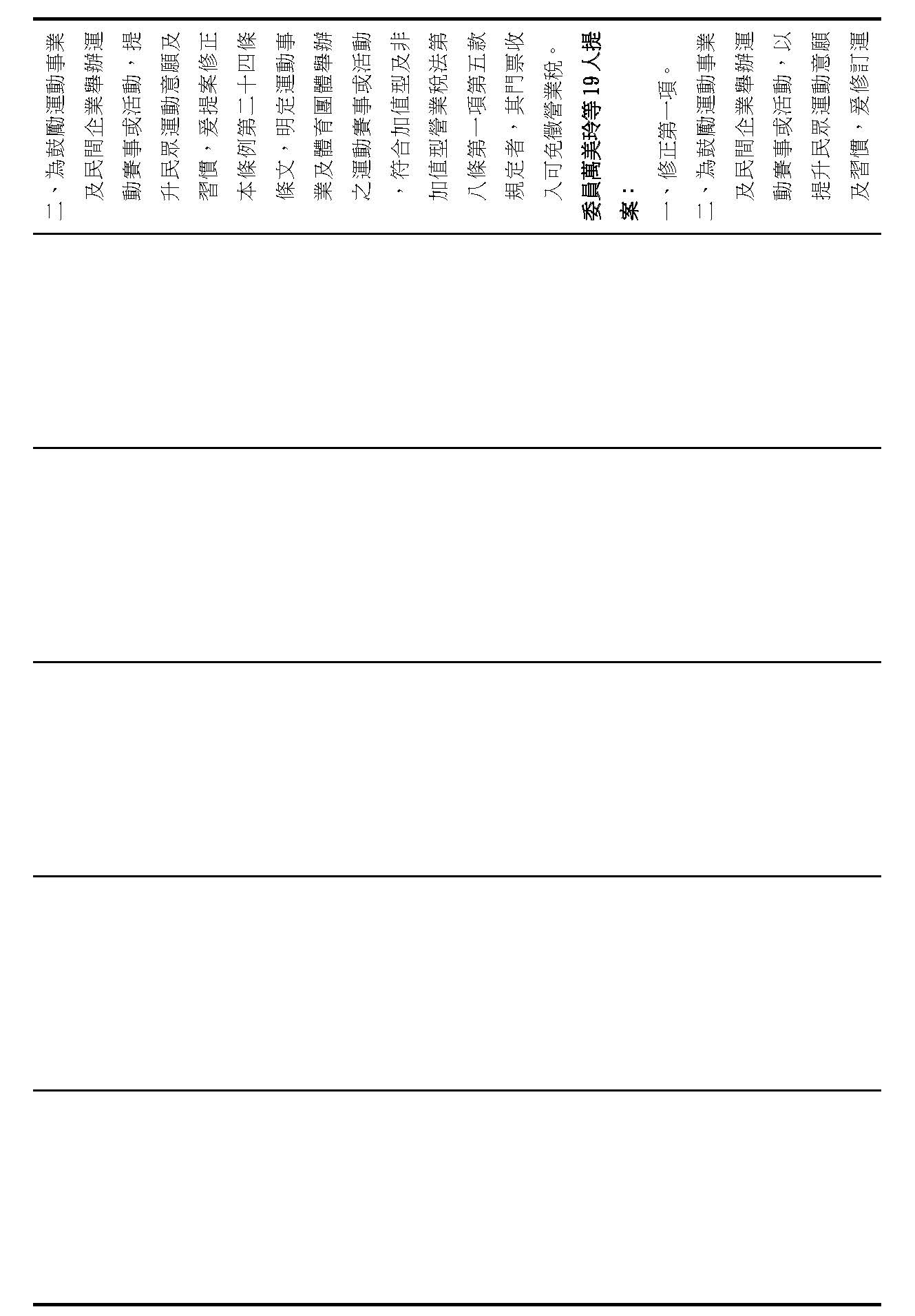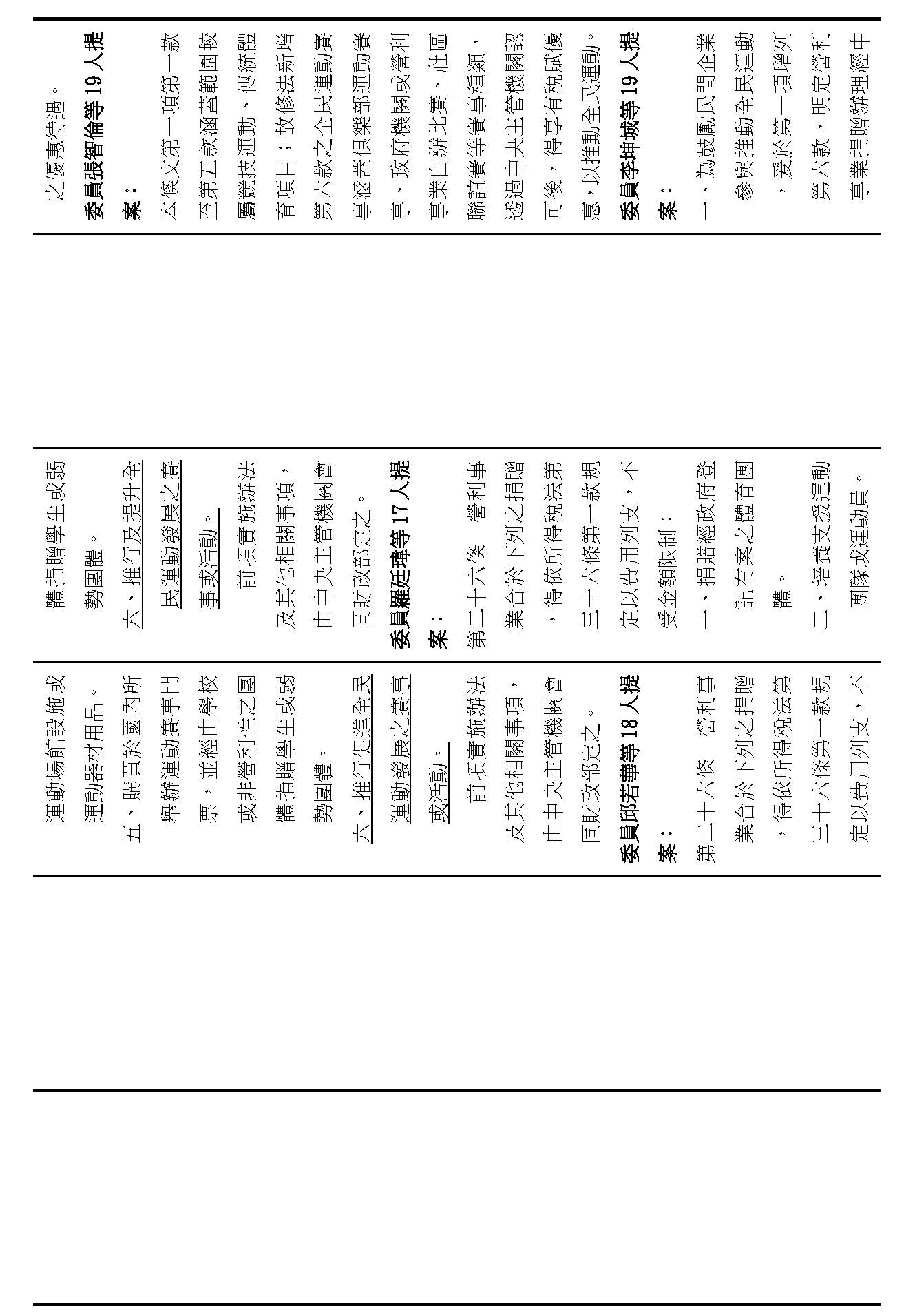 劉委員書彬:(9時18分)主席、各位同仁,大家早安。我國運動產業近年在國際體壇上表現亮眼,帶起全民運動和觀賞賽事的風氣。為繼續支持體育發展,教育及文化委員會於上個月25日審查通過運動產業發展條例部分條文的修訂。