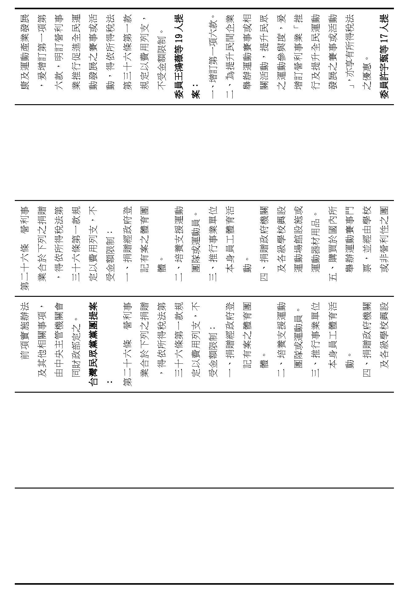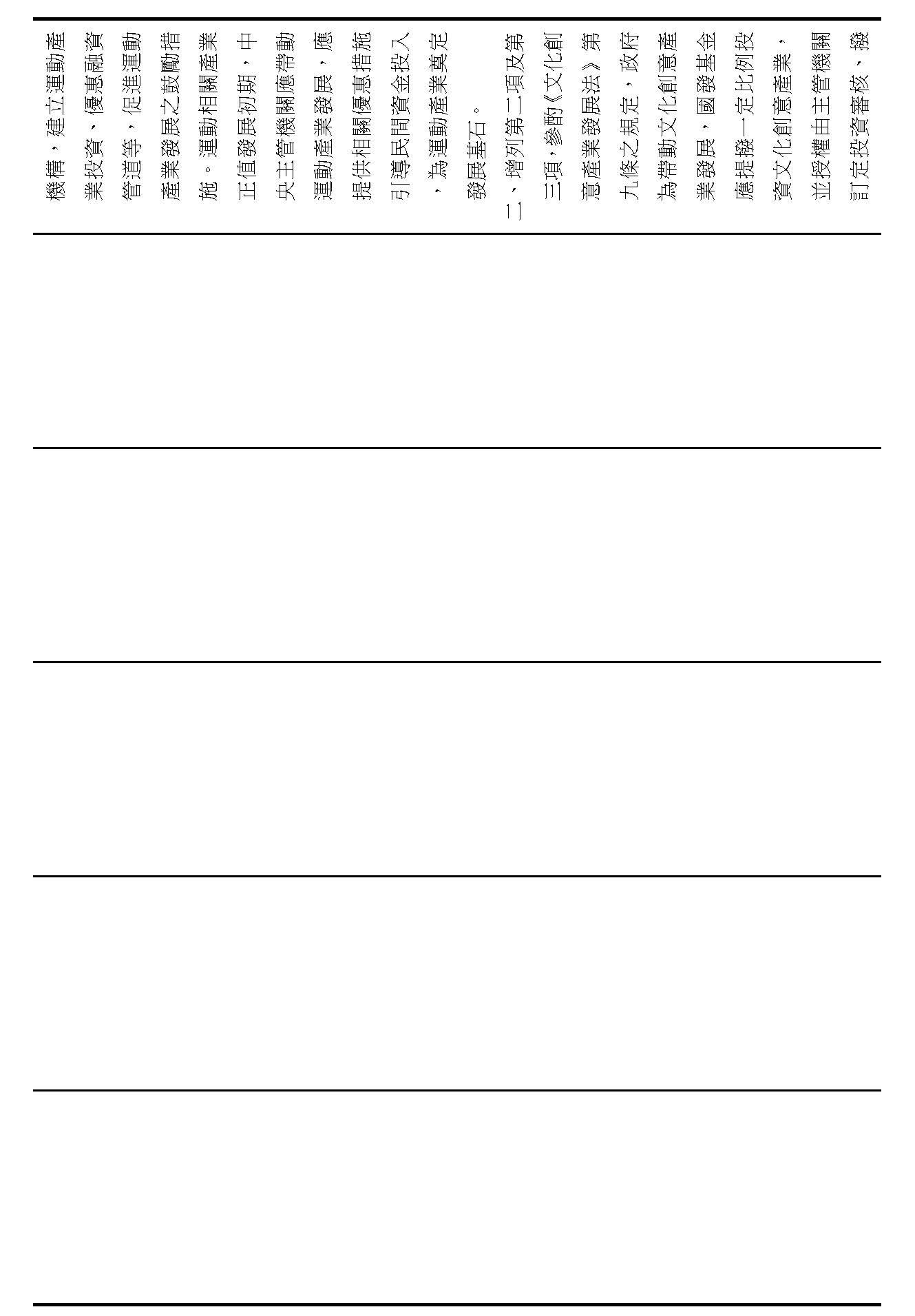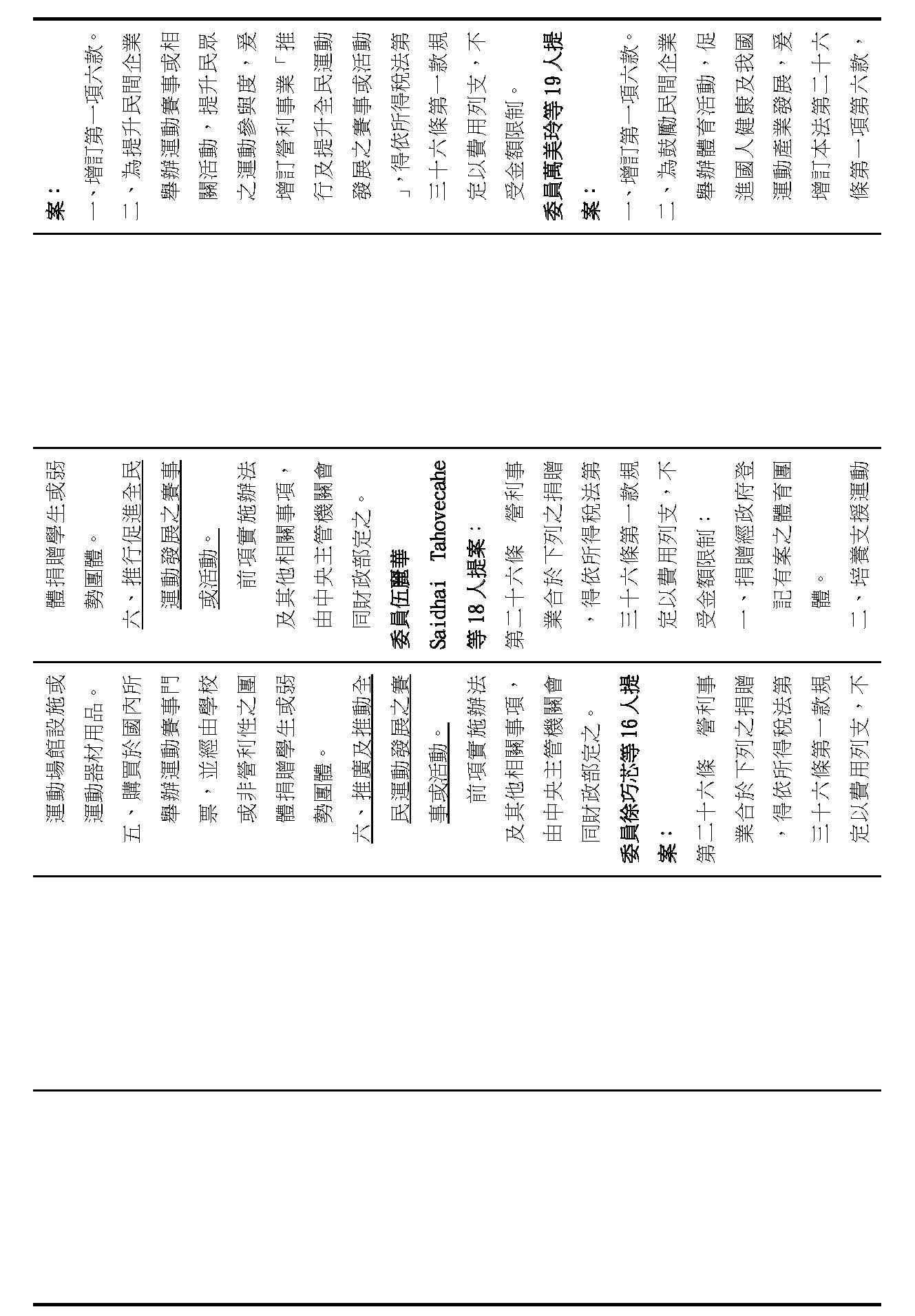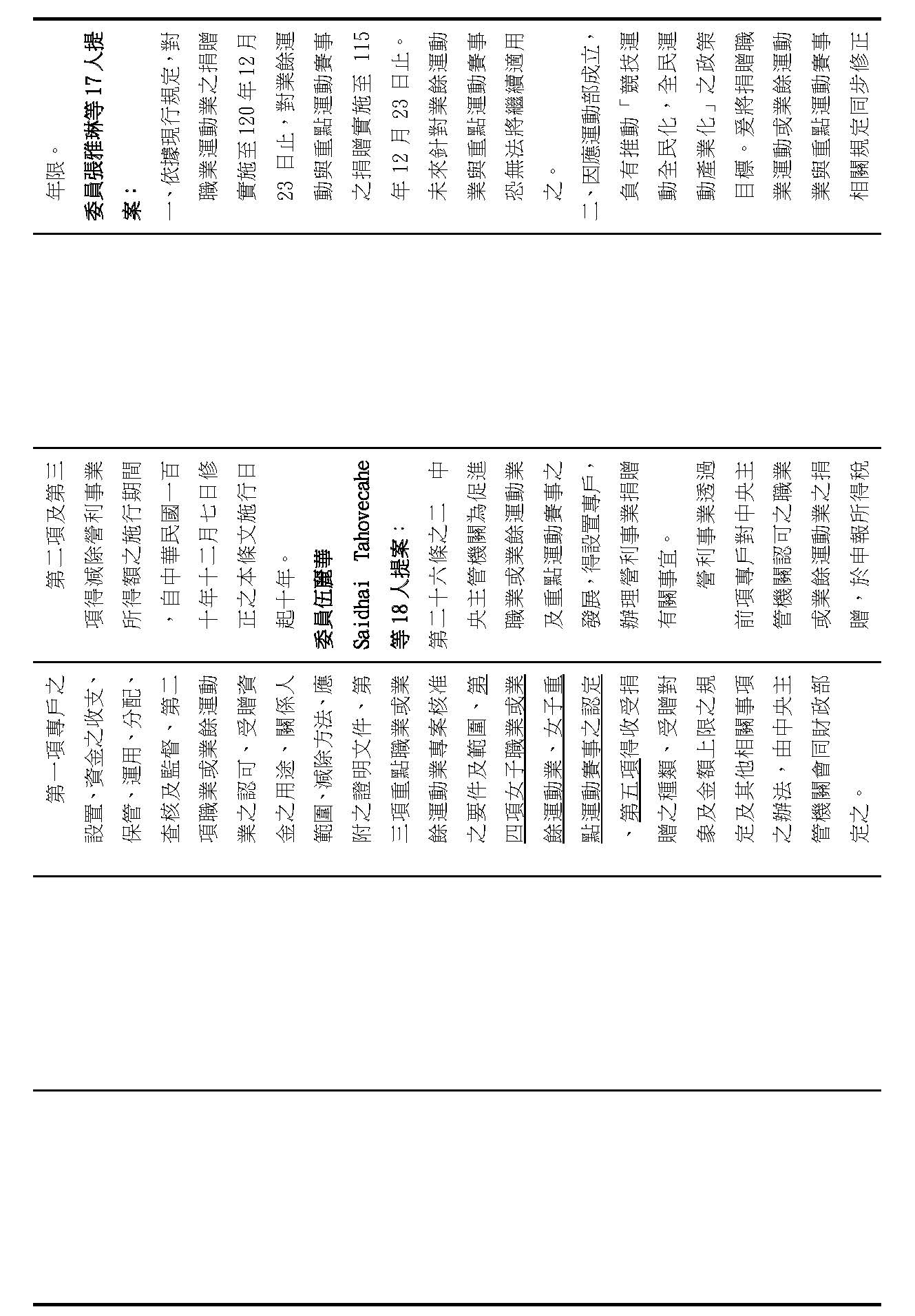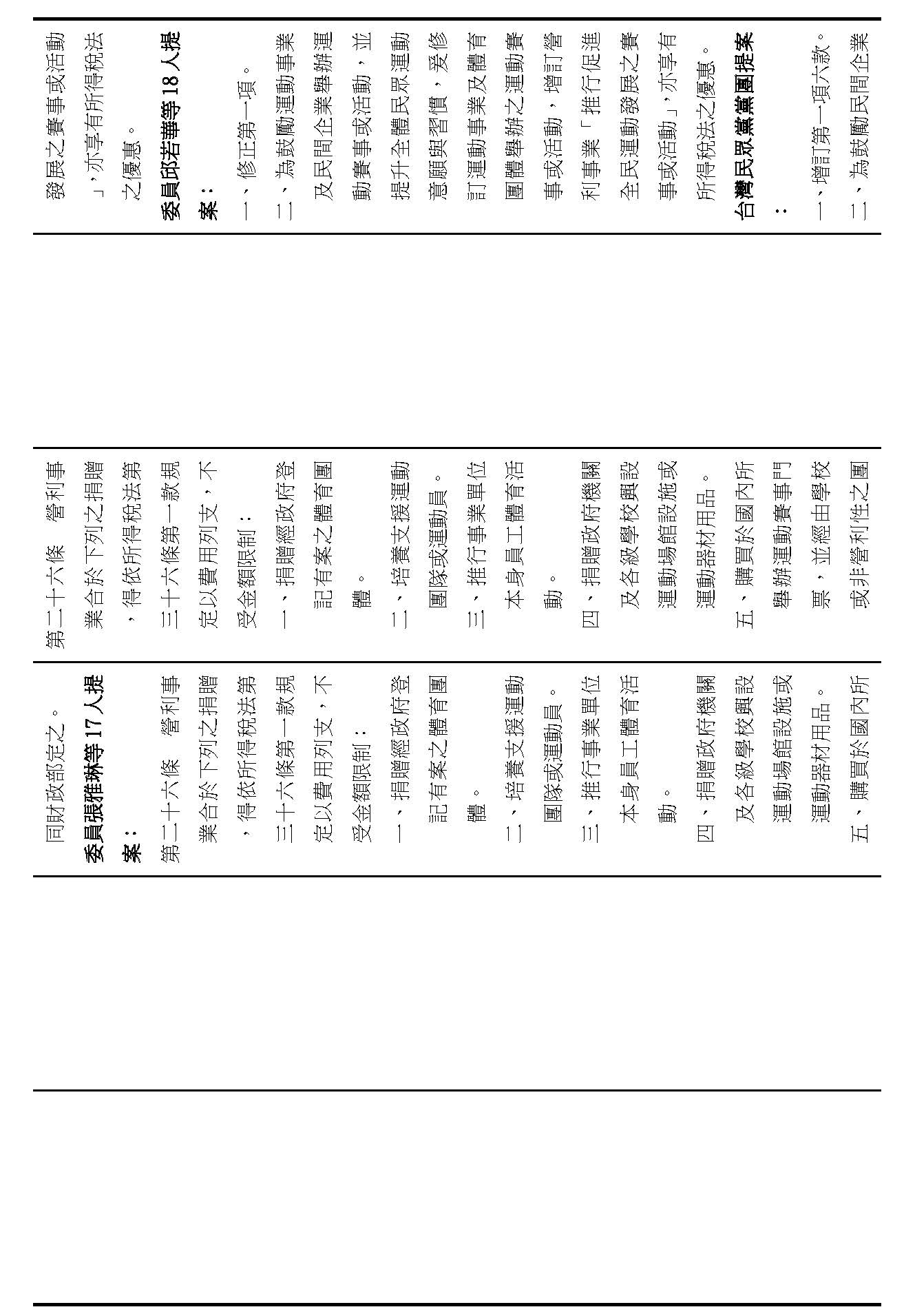 劉委員書彬:(9時18分)主席、各位同仁,大家早安。我國運動產業近年在國際體壇上表現亮眼,帶起全民運動和觀賞賽事的風氣。為繼續支持體育發展,教育及文化委員會於上個月25日審查通過運動產業發展條例部分條文的修訂。