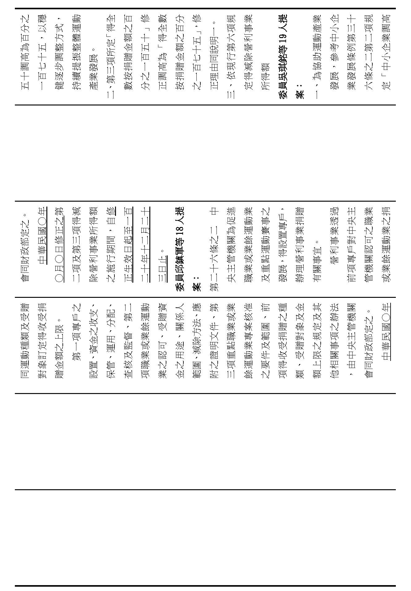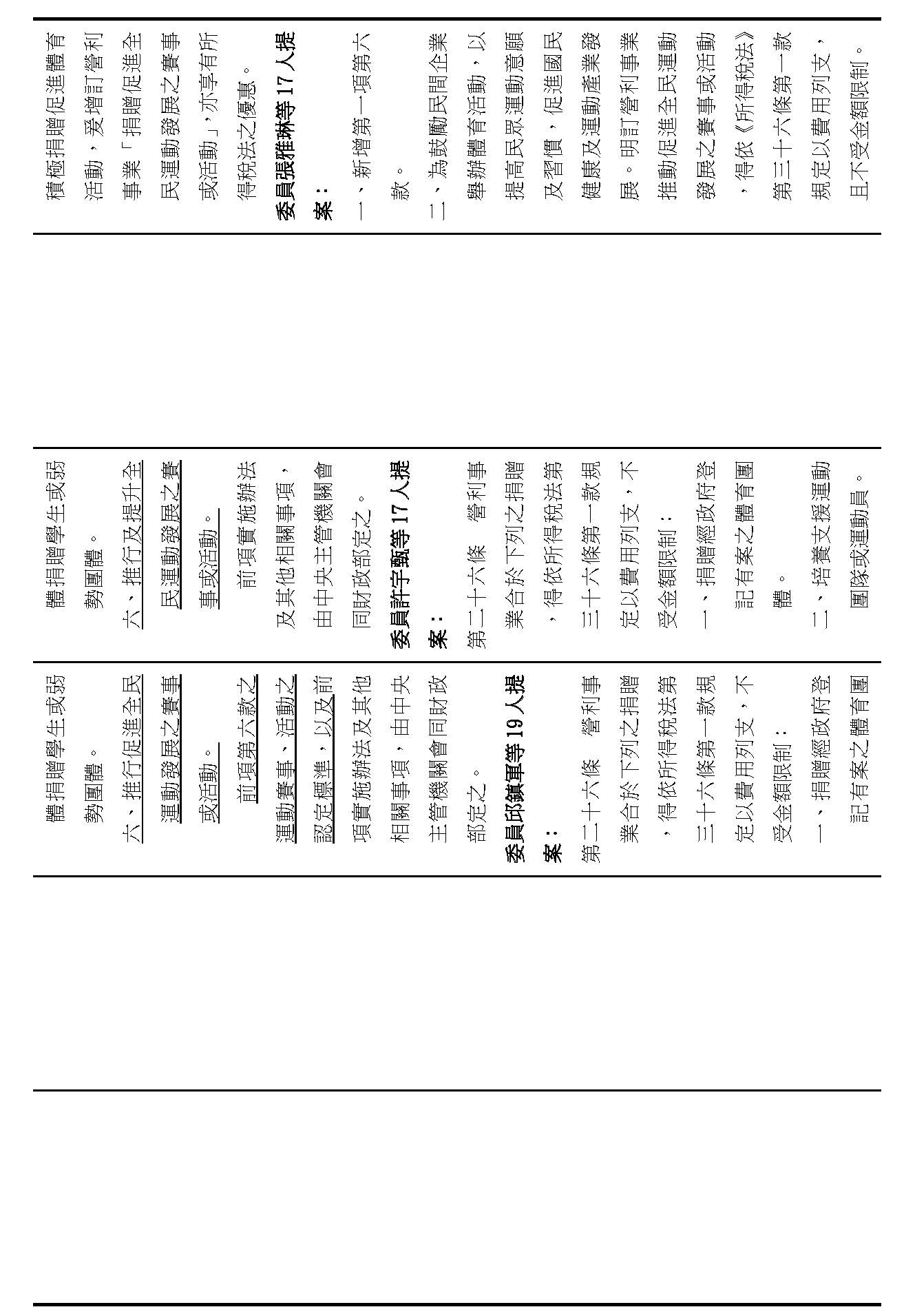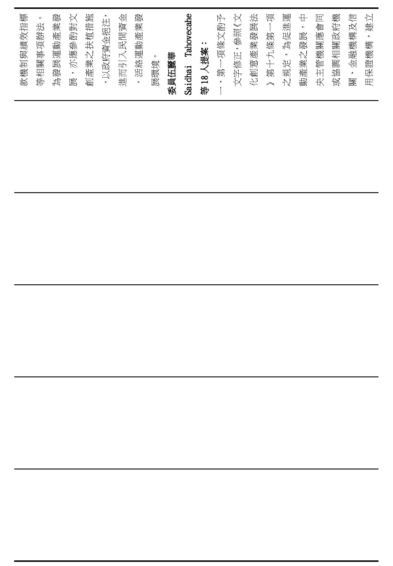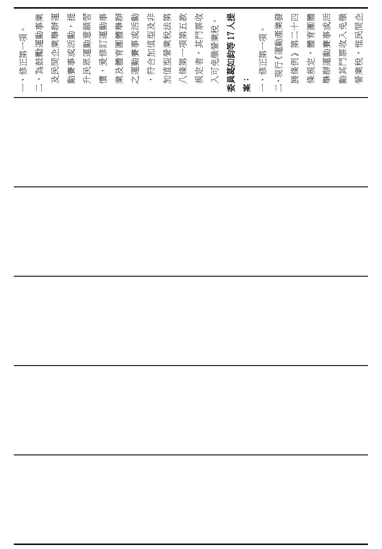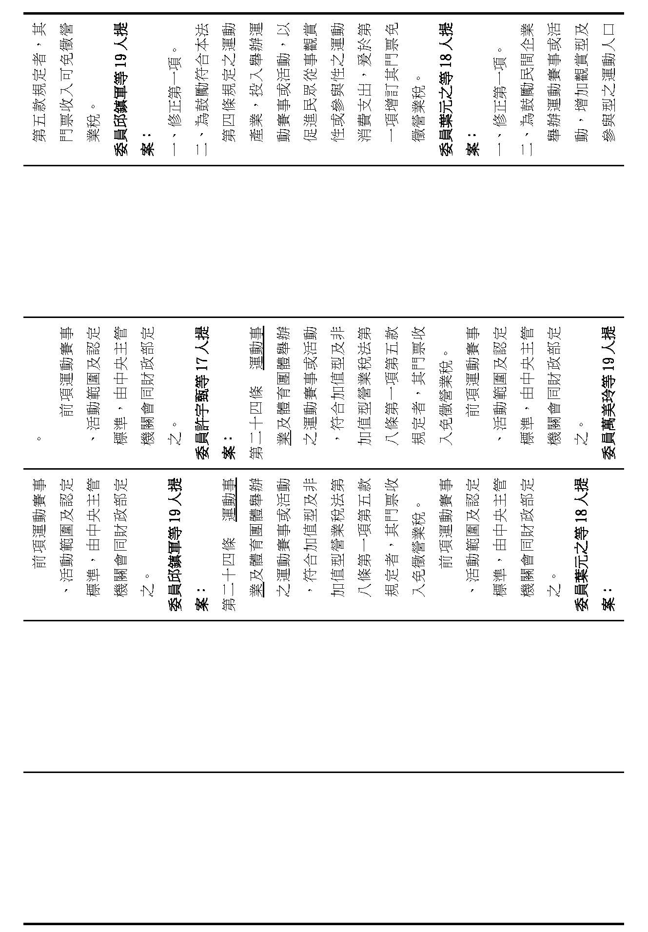 劉委員書彬:(9時18分)主席、各位同仁,大家早安。我國運動產業近年在國際體壇上表現亮眼,帶起全民運動和觀賞賽事的風氣。為繼續支持體育發展,教育及文化委員會於上個月25日審查通過運動產業發展條例部分條文的修訂。