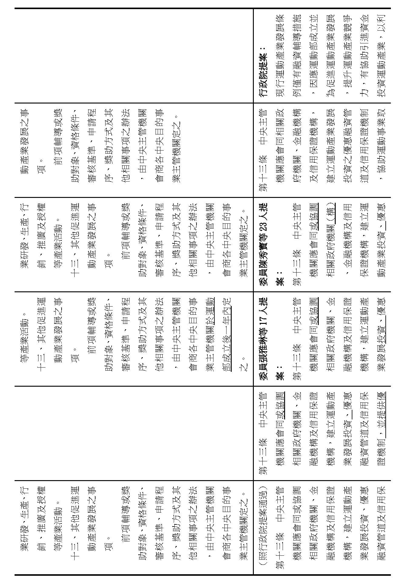 主旨:院會交付審查行政院函請審議「運動產業發展條例第十三條、第二十六條及第二十六條之二條文修正草案」、本院委員柯志恩等22人擬具「運動產業發展條例第二十四條及第二十六條條文修正草案」、委員張智倫等18人擬具「運動產業發展條例第二十四條及第二十六條條文修正草案」、委員洪孟楷等17人擬具「運動產業發展條例第二十四條及第二十六條條文修正草案」、委員王鴻薇等19人擬具「運動產業發展條例第二十四條及第二十六條條文修正草案」、委員林倩綺等22人擬具「運動產業發展條例第四條條文修正草案」、委員沈發惠等19人擬具「運動產業發展條例第二條條文修正草案」、委員許宇甄等17人擬具「運動產業發展條例第二十四條及第二十六條條文修正草案」、委員萬美玲等19人擬具「運動產業發展條例第二條、第二十四條及第二十六條條文修正草案」、委員楊瓊瓔等27人擬具「運動產業發展條例第二十四條及第二十六條條文修正草案」、委員林倩綺等18人擬具「運動產業發展條例第二十六條之二條文修正草案」、委員邱鎮軍等19人擬具「運動產業發展條例第二條、第二十四條及第二十六條條文修正草案」、委員葉元之等18人擬具「運動產業發展條例第二十四條及第二十六條條文修正草案」、委員林宜瑾等28人擬具「運動產業發展條例第二十六條之二條文修正草案」、委員黃捷等17人擬具「運動產業發展條例第二十六條之二條文修正草案」、委員吳沛憶等21人擬具「運動產業發展條例部分條文修正草案」、委員張雅琳等17人擬具「運動產業發展條例部分條文修正草案」、委員陳秀寳等23人擬具「運動產業發展條例部分條文修正草案」、委員羅廷瑋等17人擬具「運動產業發展條例第二條、第二十四條及第二十六條條文修正草案」、委員徐巧芯等16人擬具「運動產業發展條例第二十四條及第二十六條條文修正草案」、委員邱若華等18人擬具「運動產業發展條例第二條及第二十六條條文修正草案」、本院台灣民眾黨黨團擬具「運動產業發展條例第二十四條及第二十六條條文修正草案」、委員葛如鈞等17人擬具「運動產業發展條例第二十四條及第二十六條條文修正草案」、委員徐欣瑩等22人擬具「運動產業發展條例部分條文修正草案」、委員伍麗華Saidhai Tahovecahe等18人擬具「運動產業發展條例部分條文修正草案」、委員廖偉翔等16人擬具「運動產業發展條例第二十四條及第二十六條條文修正草案」、委員蔡其昌等17人擬具「運動產業發展條例部分條文修正草案」、委員張智倫等19人擬具「運動產業發展條例第十三條、第二十六條及第二十六條之二條文修正草案」、委員李坤城等19人擬具「運動產業發展條例第十三條、第二十六條及第二十六條之二條文修正草案」、委員葉元之等19人擬具「運動產業發展條例第二十六條之二條文修正草案」、委員王美惠等18人擬具「運動產業發展條例第十三條、第二十六條及第二十六條之二條文修正草案」、委員吳琪銘等19人擬具「運動產業發展條例第十三條、第二十六條及第二十六條之二條文修正草案」、委員邱鎮軍等18人擬具「運動產業發展條例第十三條及第二十六條之二條文修正草案」,業經審查完竣,不須交由黨團協商,復請查照,提報院會公決。