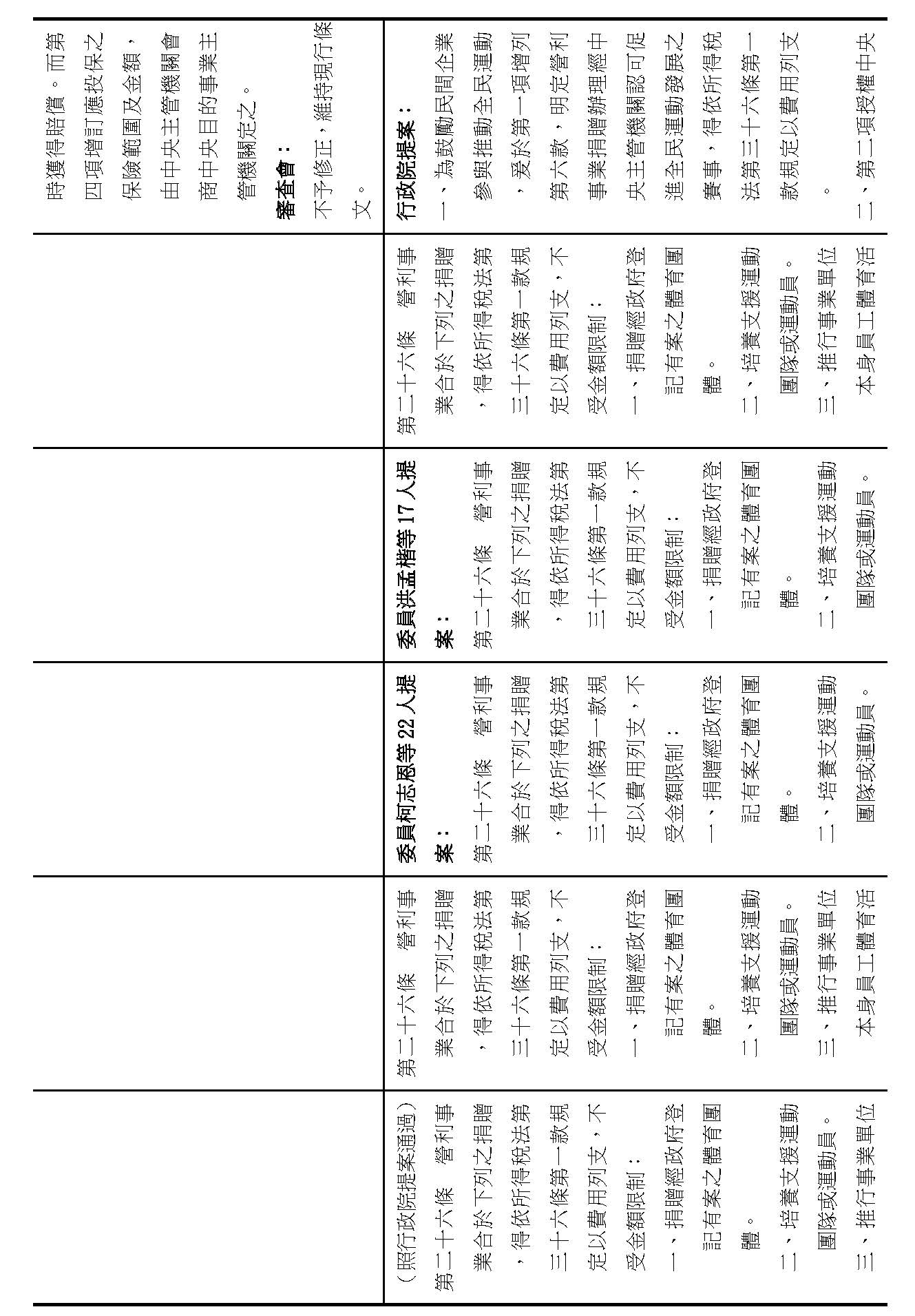 至運動產業發展條例修正草案部分,主要係為鼓勵民間企業舉辦各類運動賽事或活動,增訂營利事業推行促進全民運動發展之賽事或活動,得依所得稅法規定以費用列支,不受金額限制。將尊重法制主管機關教育部及財政部意見與大院審議結果。