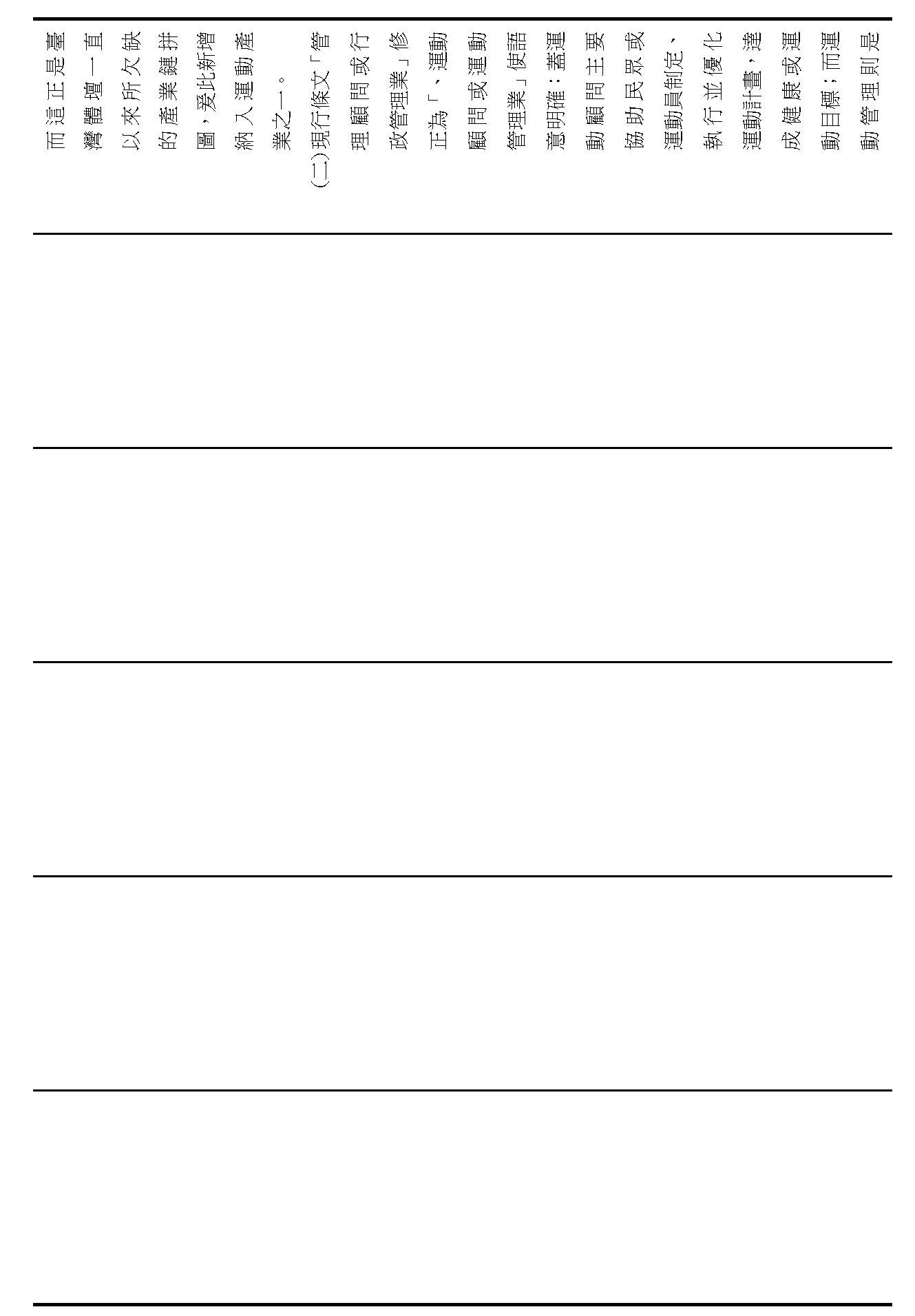 整體看來,這次的修法不僅是給運動產業打了一劑強心針,更是將運動的價值延伸到每個社區、每個家庭,未來讓我們一起打造運動健康的臺灣,一個真正落實全民運動、社會參與的全民運動文化。謝謝。