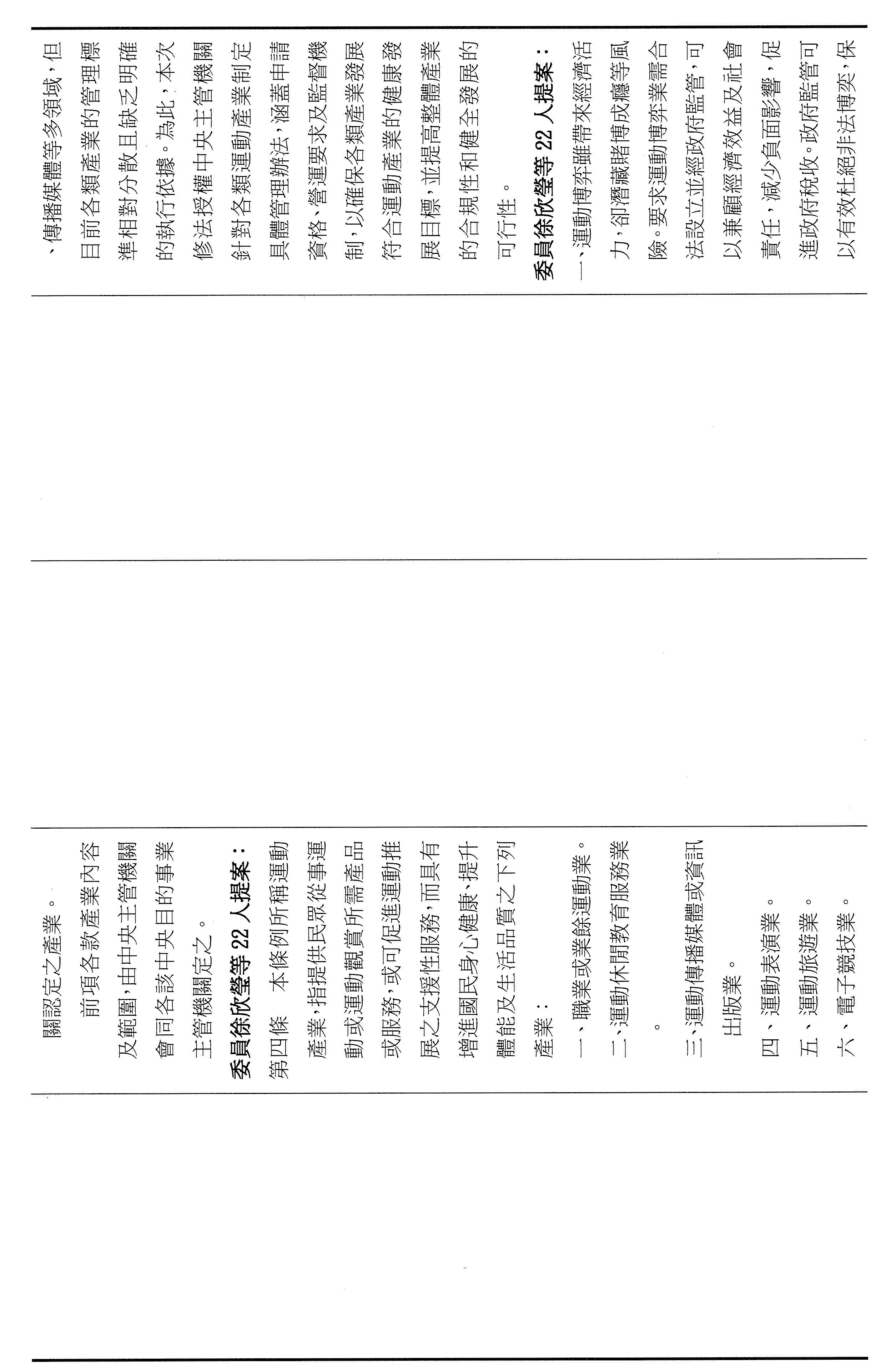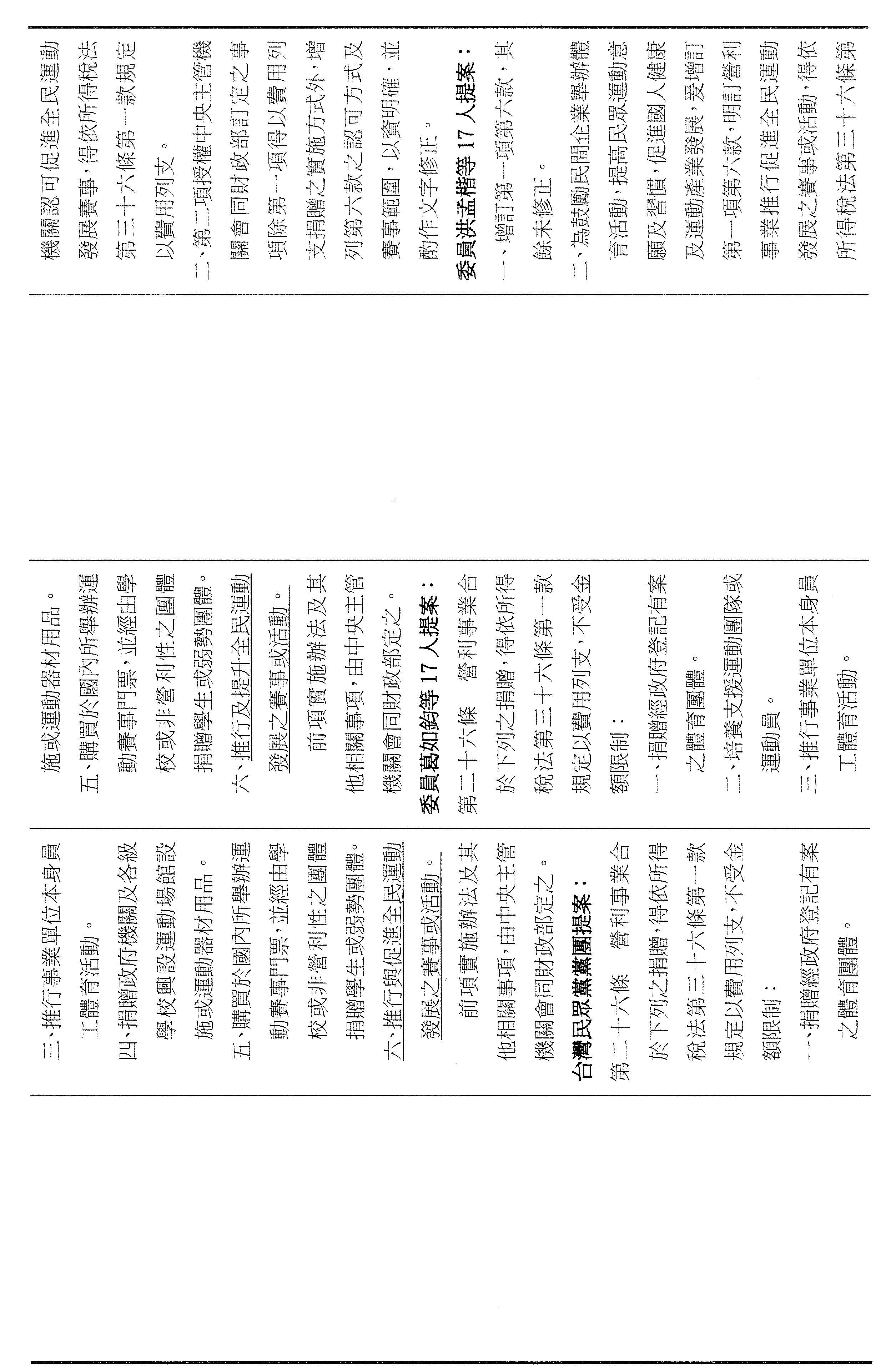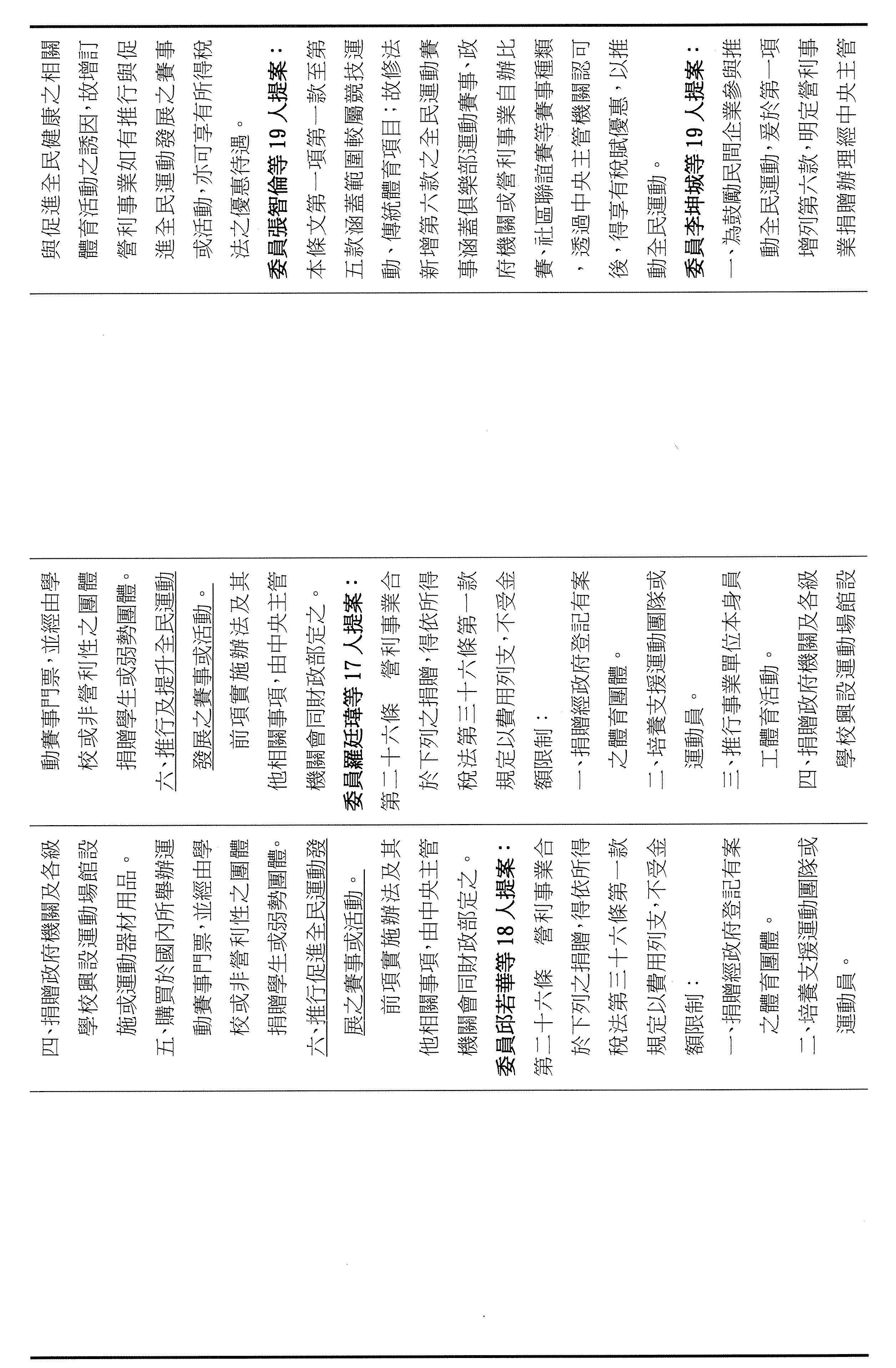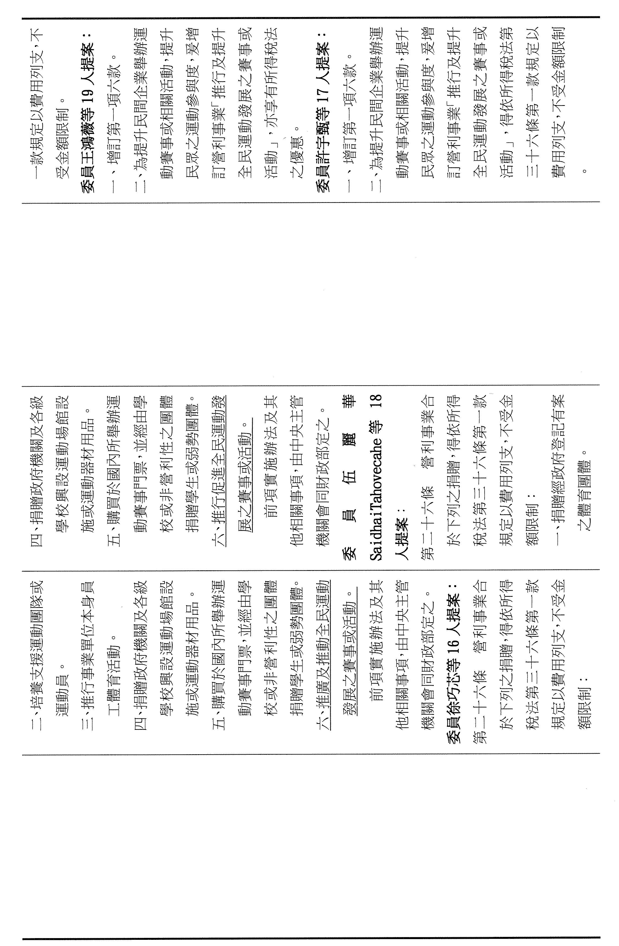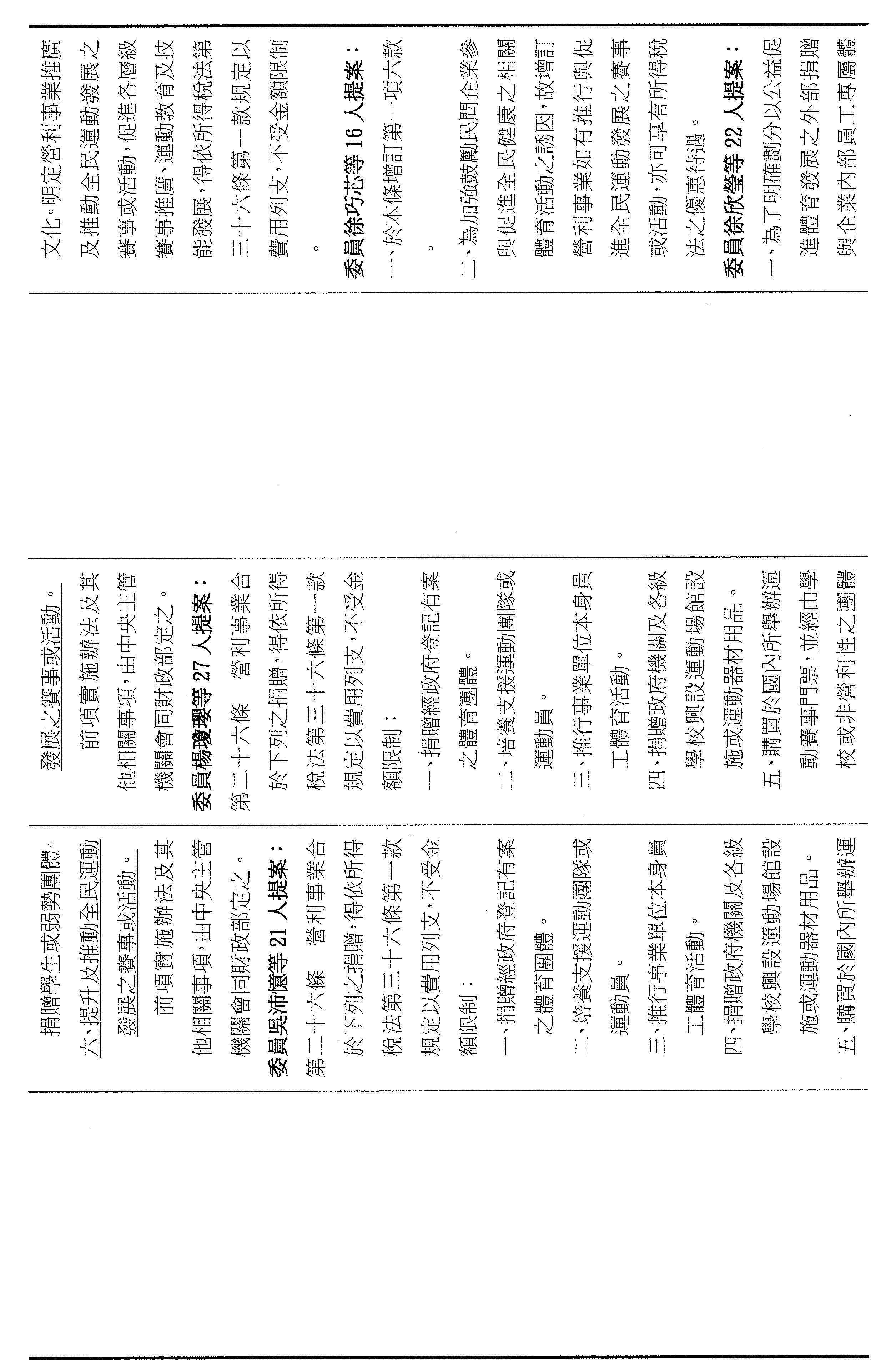 針對第四條、第八條,為了加速運動產業的發展,各運動產業的內容、範圍、相關管理辦法或是輔導及獎助辦法,本席也提案修法,明定運動部成立後一年內,必須把相關配套措施訂定出來。針對第二十六條,為了明確劃分外部捐贈與企業內部員工專屬的體育活動經費不同,避免企業利用捐贈給自身員工的體育活動來達到減少稅務的目的,本席提案刪除推行事業單位本身員工體育活動之捐贈,得依所得稅法規定以費用列支,不受金額限制。本席另提案新增推廣促進全民運動發展之賽事或活動,得以列入所得稅的費用列支,並限定只有依法登記及合法資格、明確具公益性宗旨、資金專款專用及透明運用、定期接受審查與監督的團體及個人,才能被認定為合格的捐贈對象,從而防止捐贈濫用營利事業的稅務扣除優惠。以上敬請各位委員支持本席的提案,謝謝。
