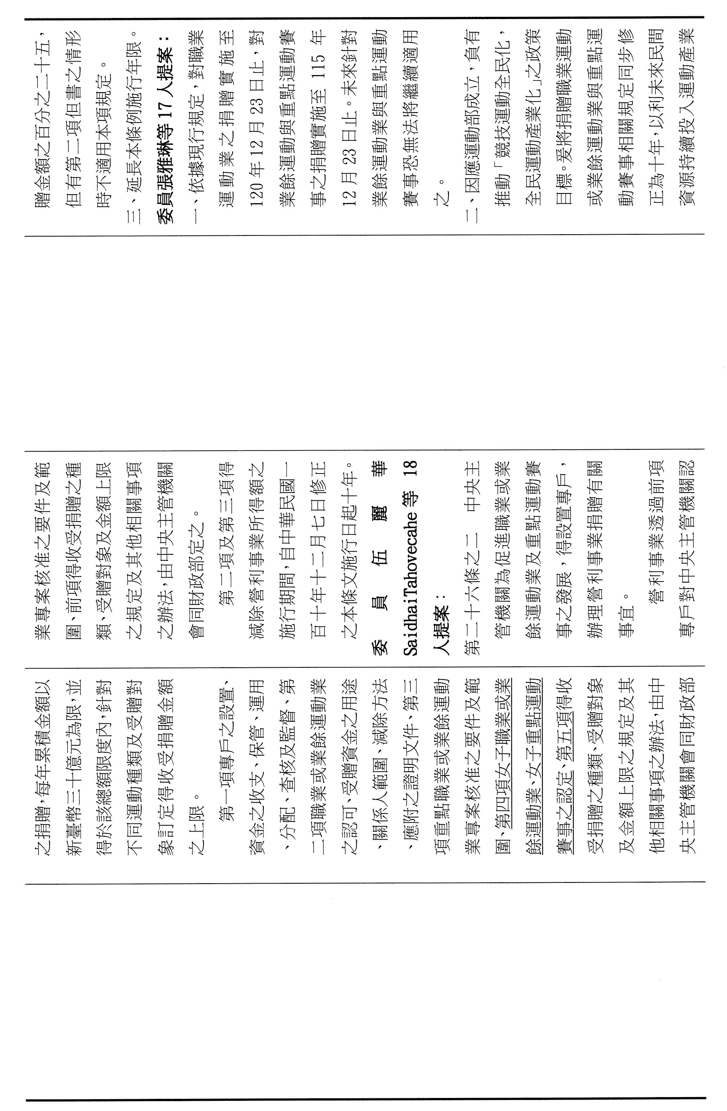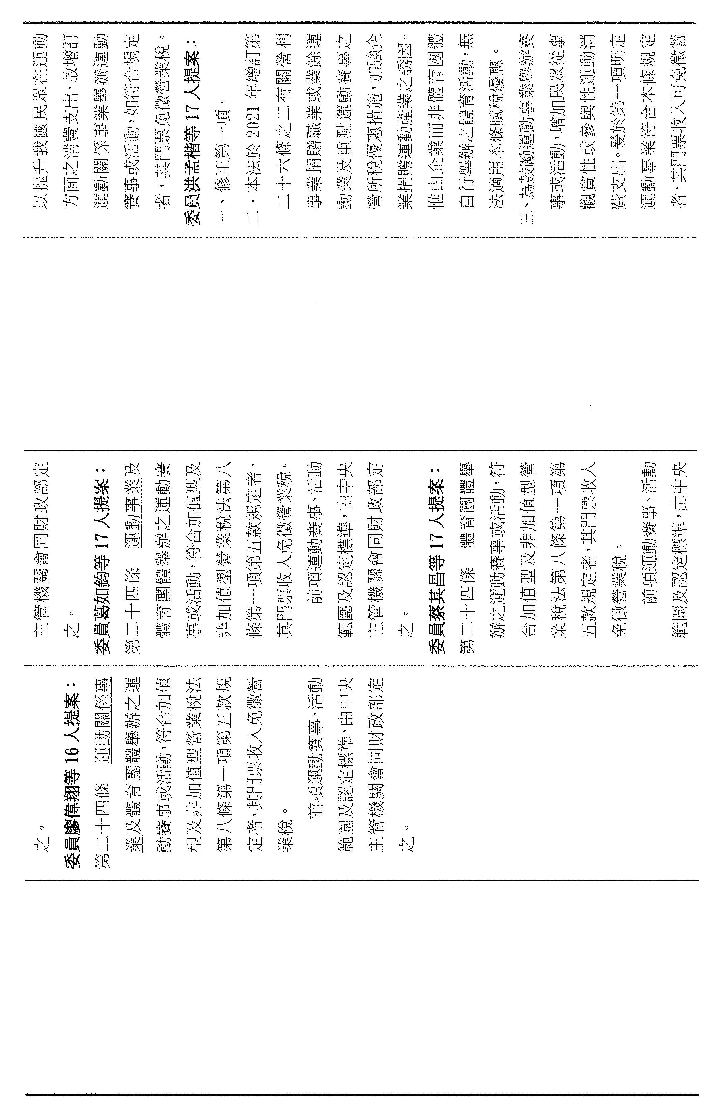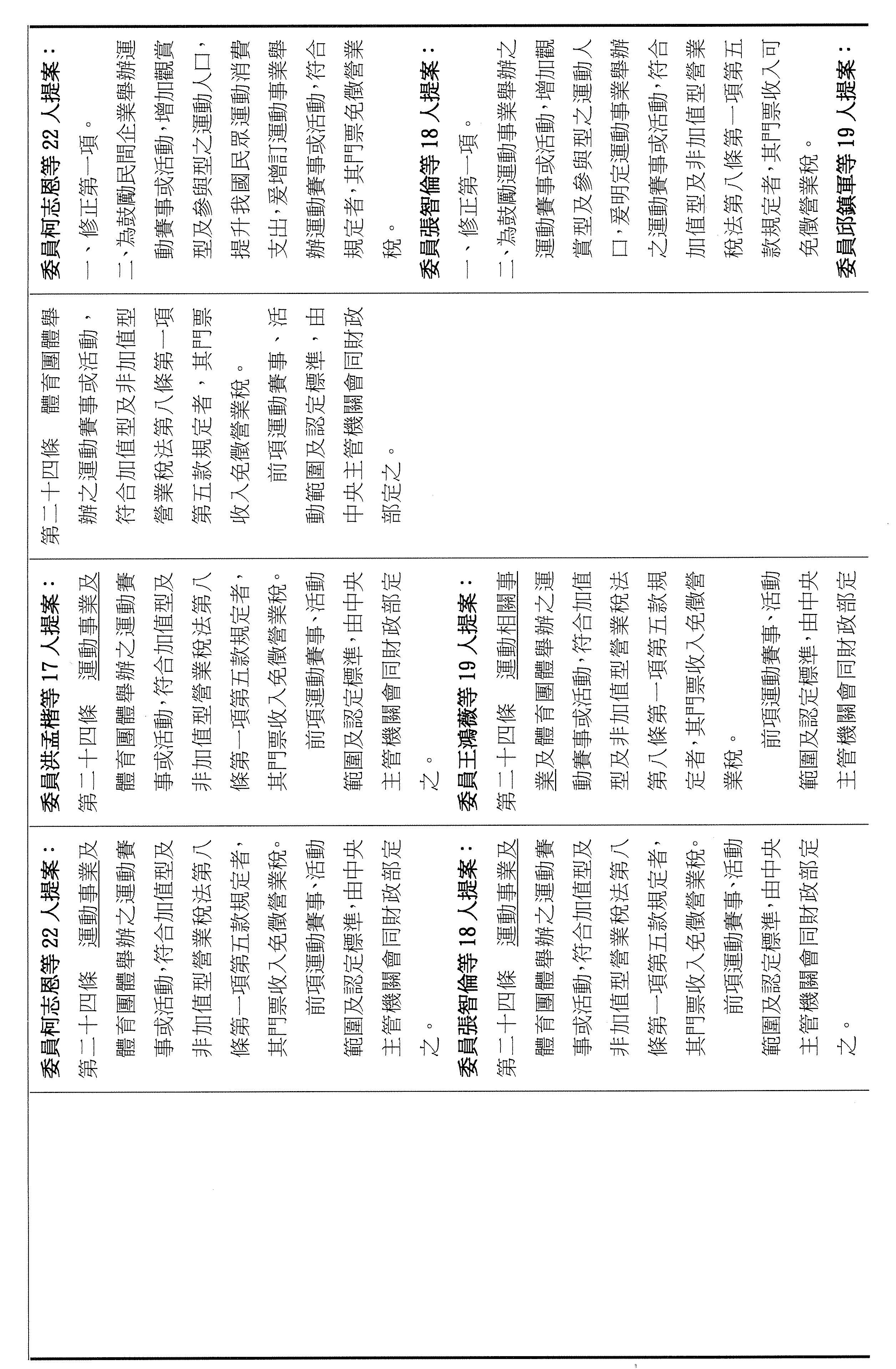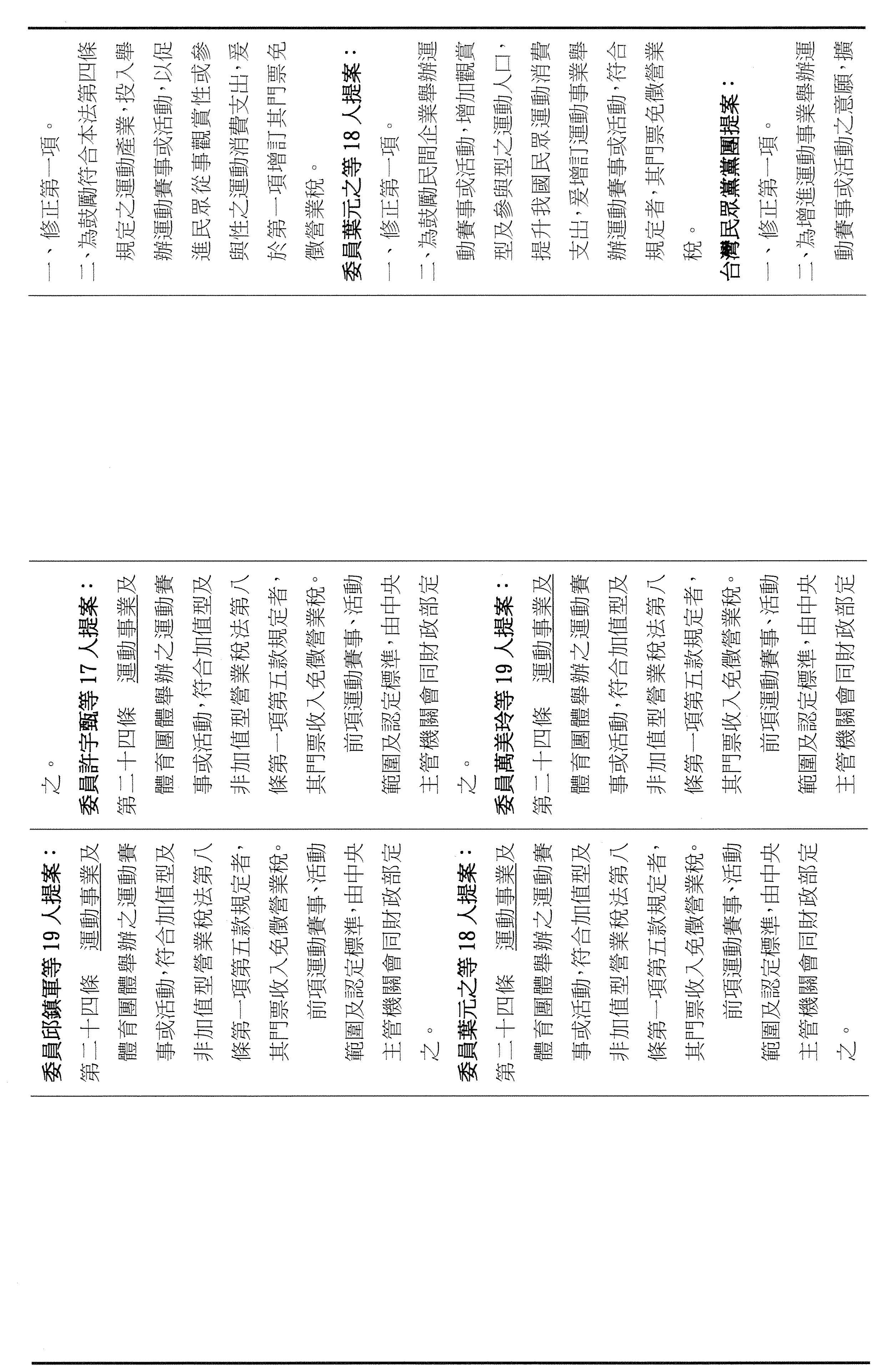 針對第四條、第八條,為了加速運動產業的發展,各運動產業的內容、範圍、相關管理辦法或是輔導及獎助辦法,本席也提案修法,明定運動部成立後一年內,必須把相關配套措施訂定出來。針對第二十六條,為了明確劃分外部捐贈與企業內部員工專屬的體育活動經費不同,避免企業利用捐贈給自身員工的體育活動來達到減少稅務的目的,本席提案刪除推行事業單位本身員工體育活動之捐贈,得依所得稅法規定以費用列支,不受金額限制。本席另提案新增推廣促進全民運動發展之賽事或活動,得以列入所得稅的費用列支,並限定只有依法登記及合法資格、明確具公益性宗旨、資金專款專用及透明運用、定期接受審查與監督的團體及個人,才能被認定為合格的捐贈對象,從而防止捐贈濫用營利事業的稅務扣除優惠。以上敬請各位委員支持本席的提案,謝謝。
