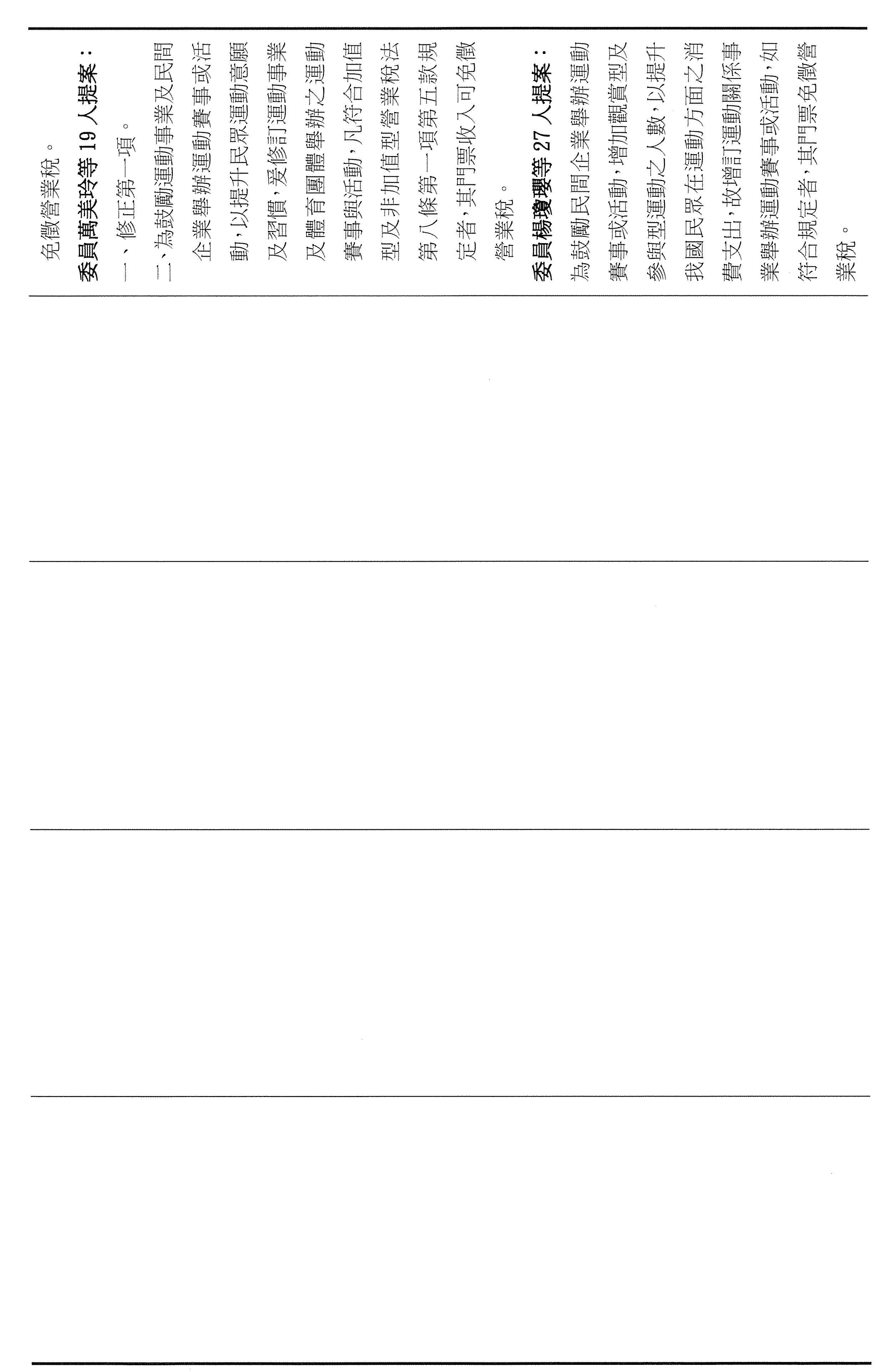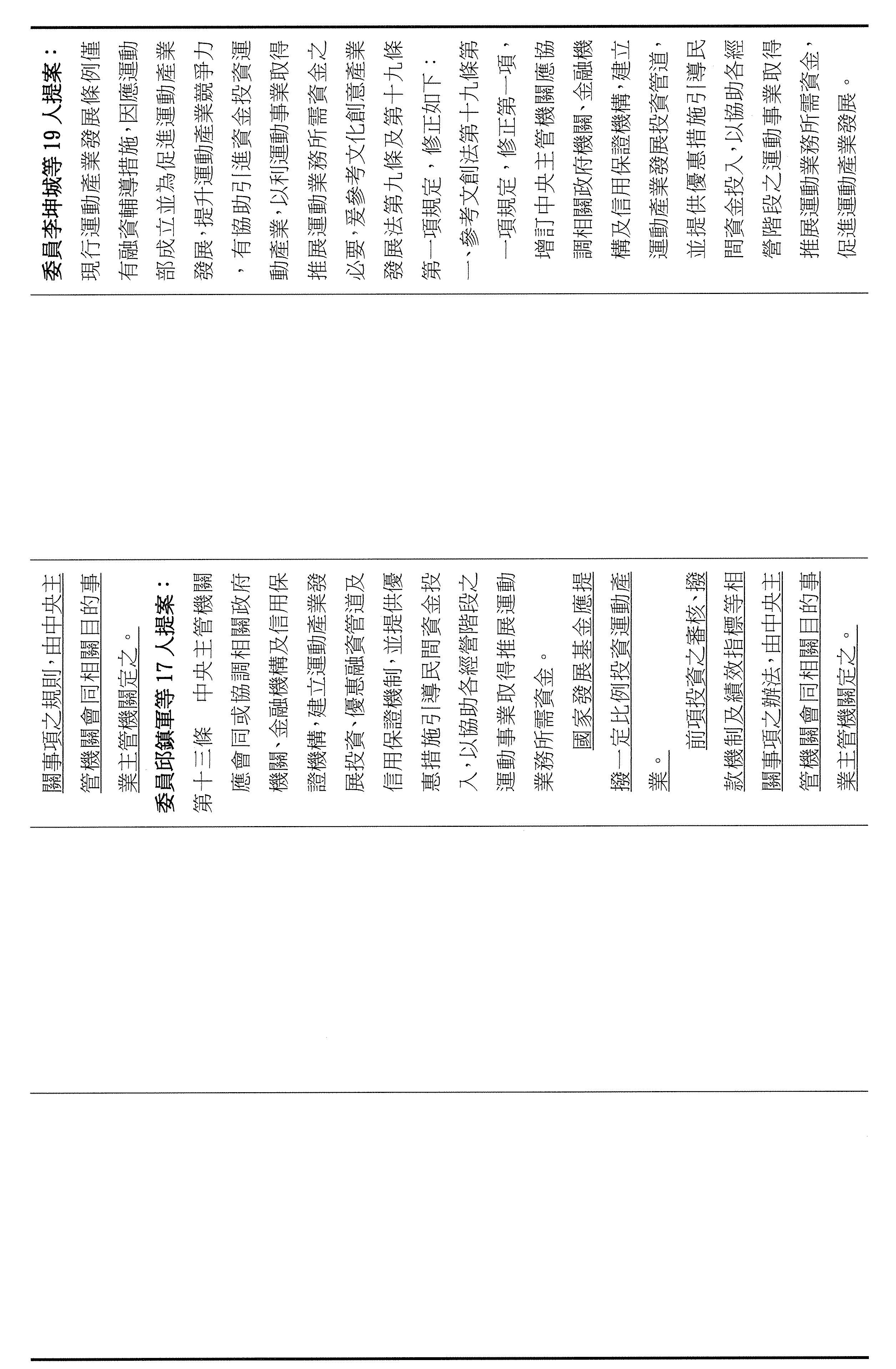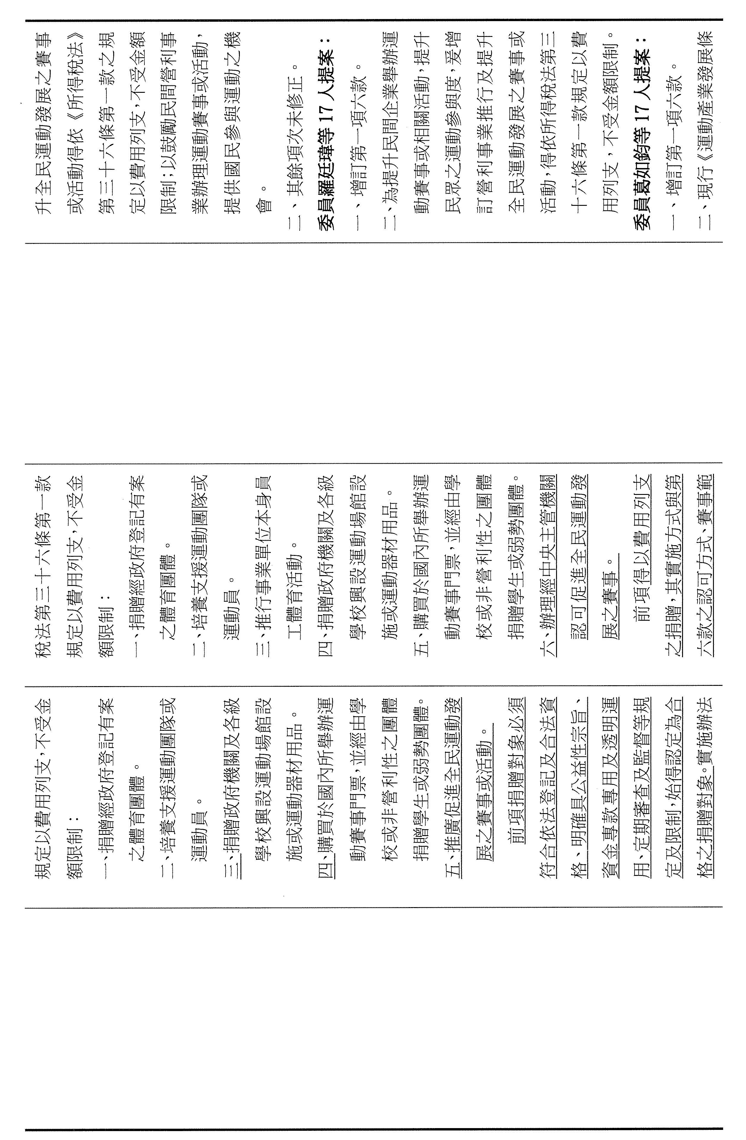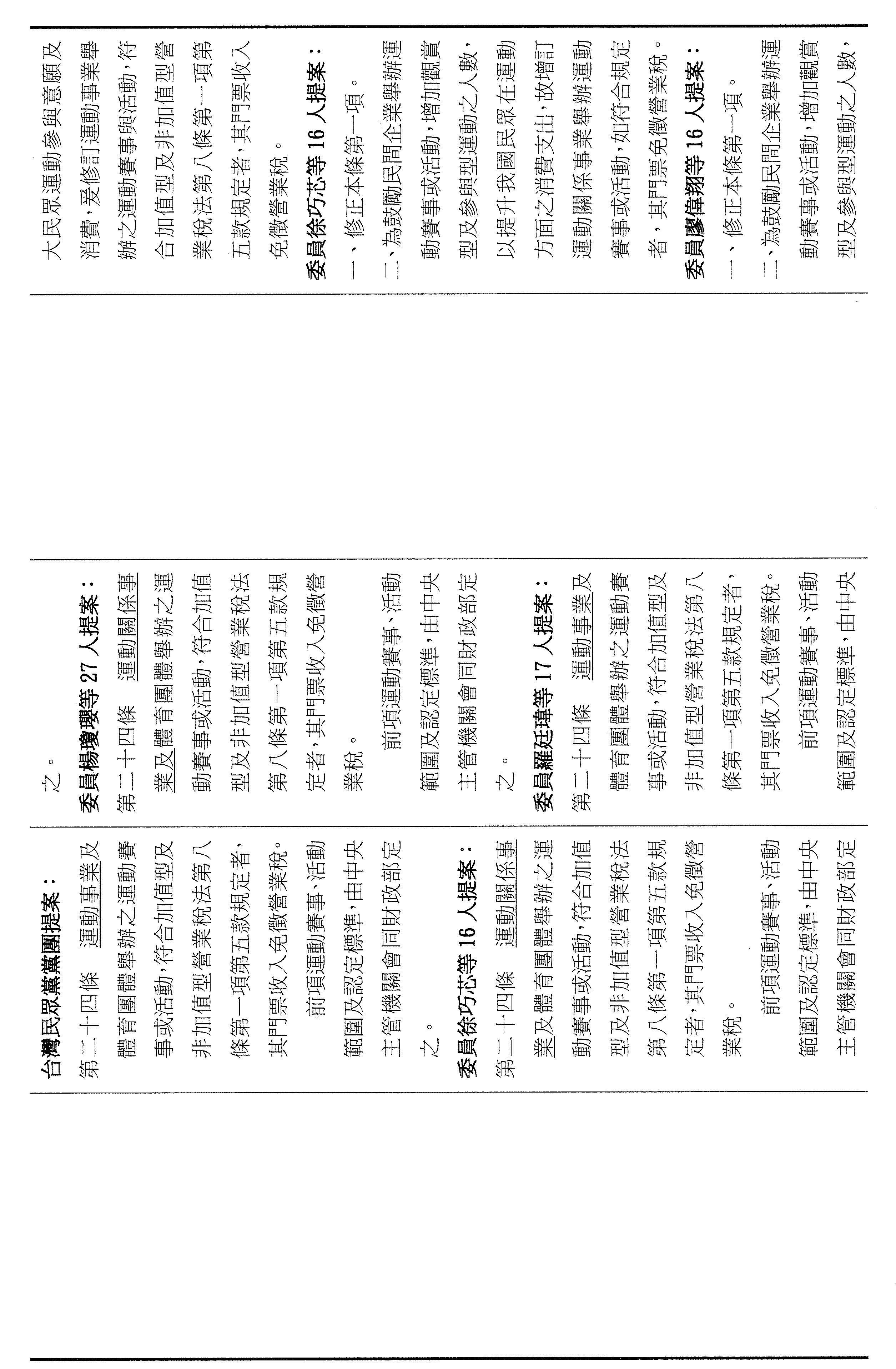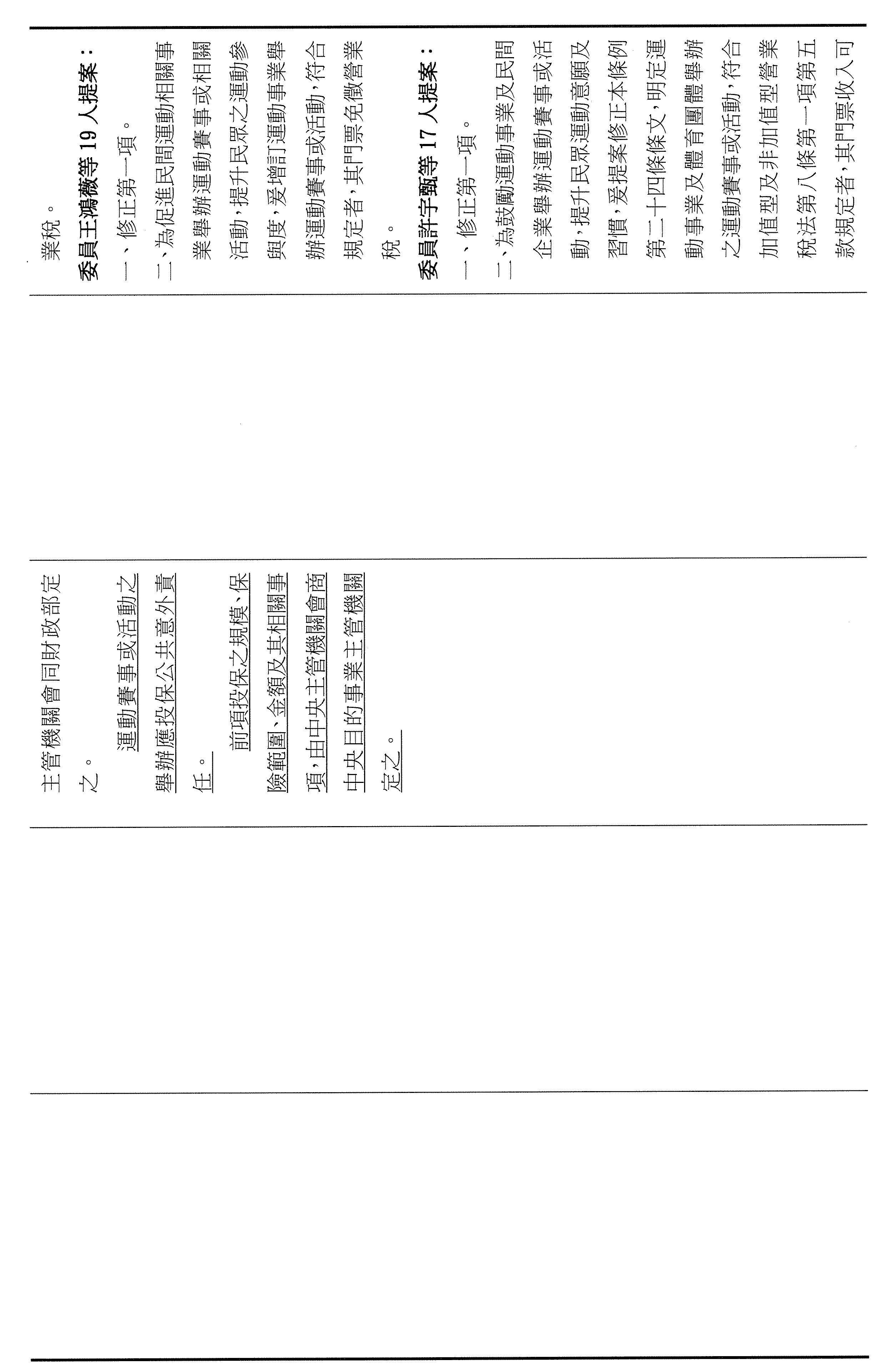 針對第四條、第八條,為了加速運動產業的發展,各運動產業的內容、範圍、相關管理辦法或是輔導及獎助辦法,本席也提案修法,明定運動部成立後一年內,必須把相關配套措施訂定出來。針對第二十六條,為了明確劃分外部捐贈與企業內部員工專屬的體育活動經費不同,避免企業利用捐贈給自身員工的體育活動來達到減少稅務的目的,本席提案刪除推行事業單位本身員工體育活動之捐贈,得依所得稅法規定以費用列支,不受金額限制。本席另提案新增推廣促進全民運動發展之賽事或活動,得以列入所得稅的費用列支,並限定只有依法登記及合法資格、明確具公益性宗旨、資金專款專用及透明運用、定期接受審查與監督的團體及個人,才能被認定為合格的捐贈對象,從而防止捐贈濫用營利事業的稅務扣除優惠。以上敬請各位委員支持本席的提案,謝謝。