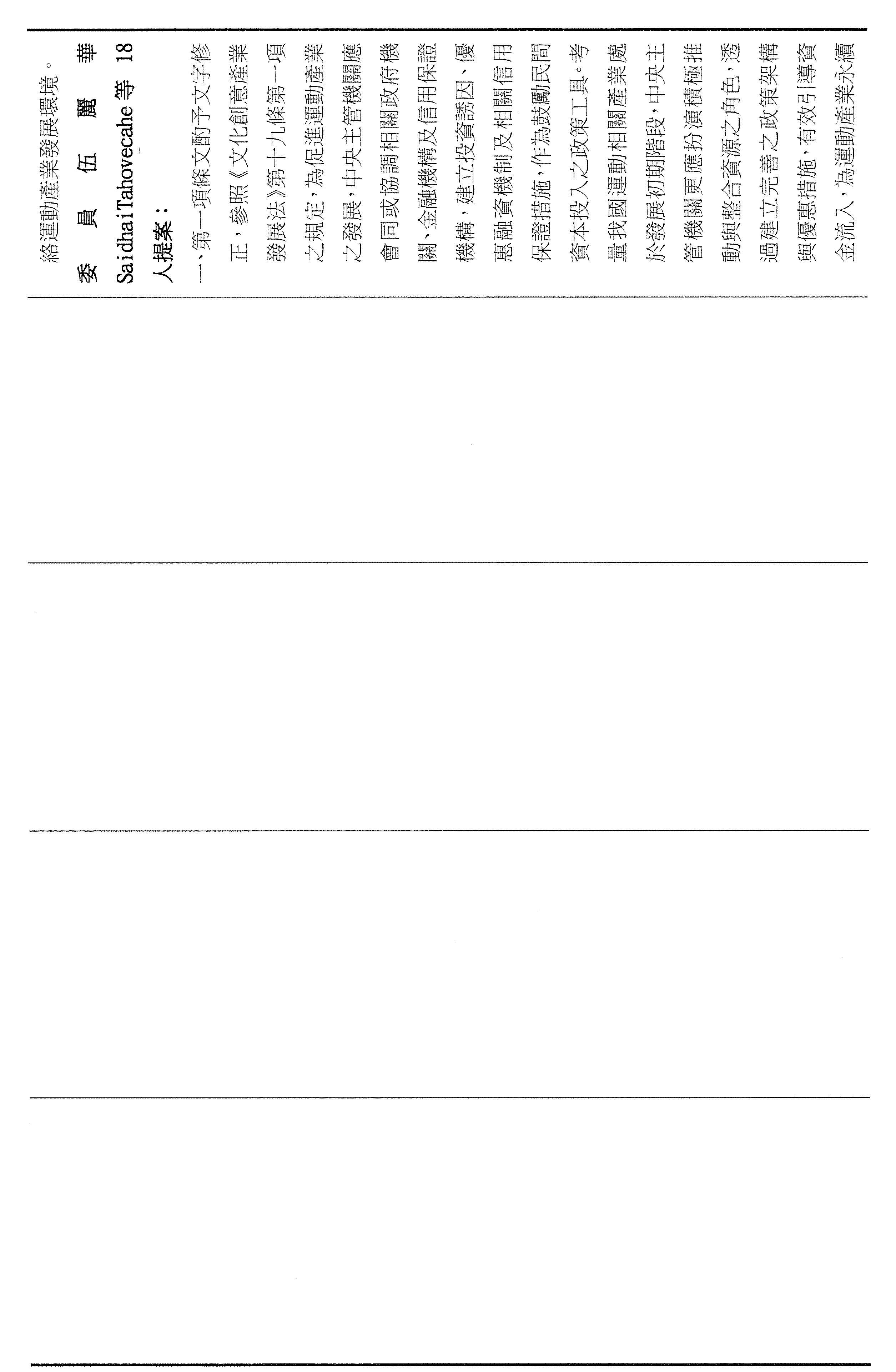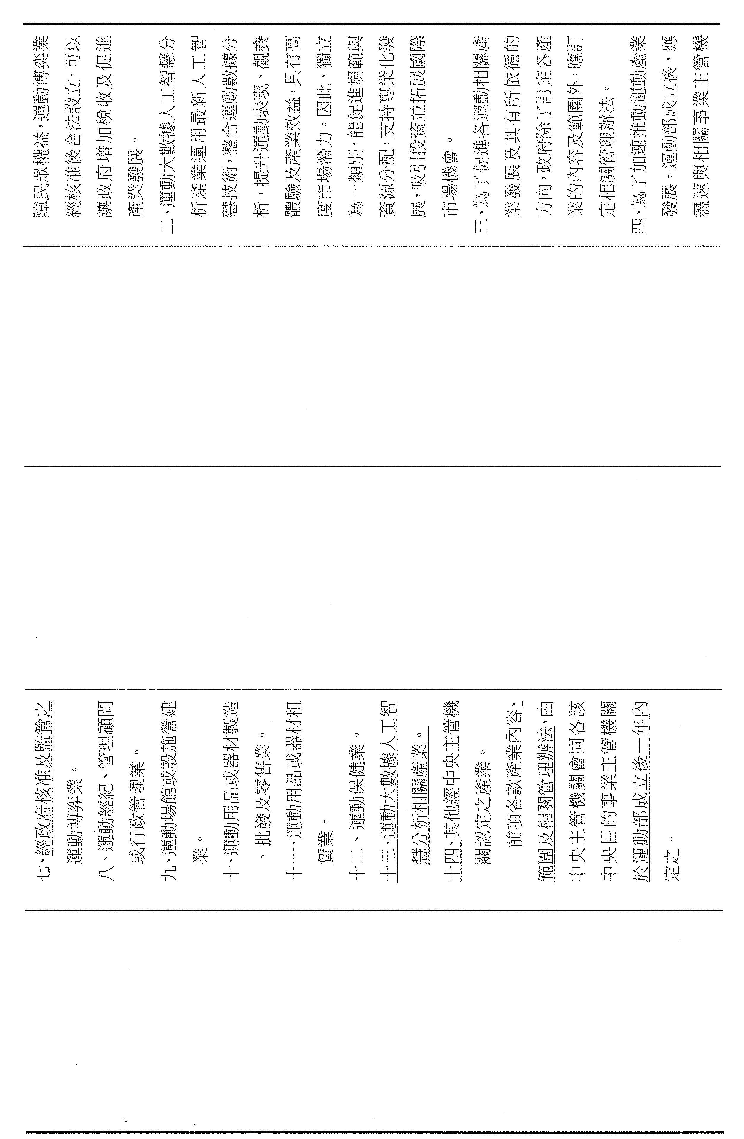 徐欣瑩委員等22人將「運動大數據人工智慧分析產業」獨立為一個產業類別,蔡其昌委員增訂「運動數據與影像分析」相關產業內容部分,考量到這些技術在我們目前所有運動產業類別均可以使用,它比較像是個工具,所以我們是希望能夠維持現行條文,不需要再另做增列。以上。