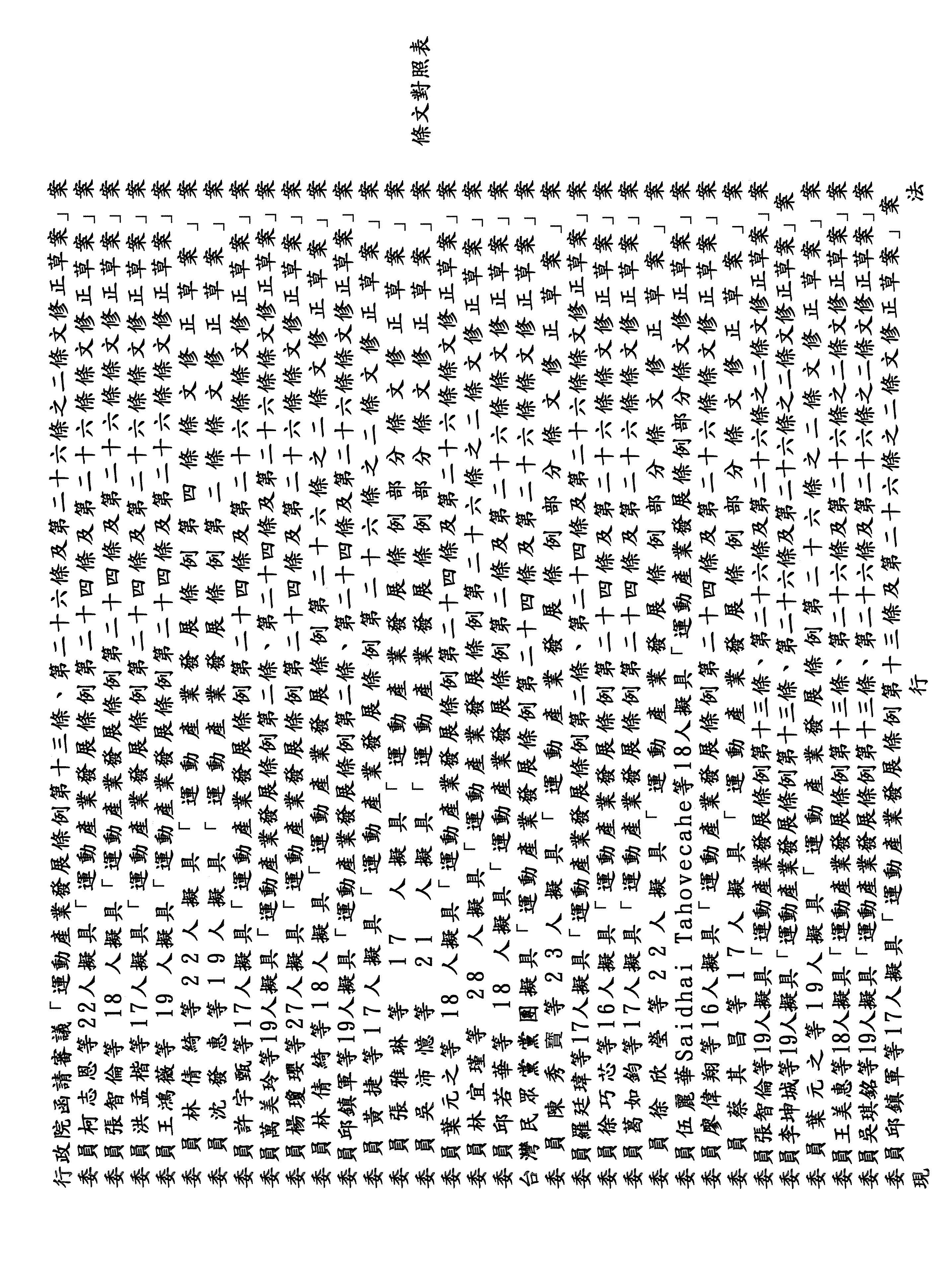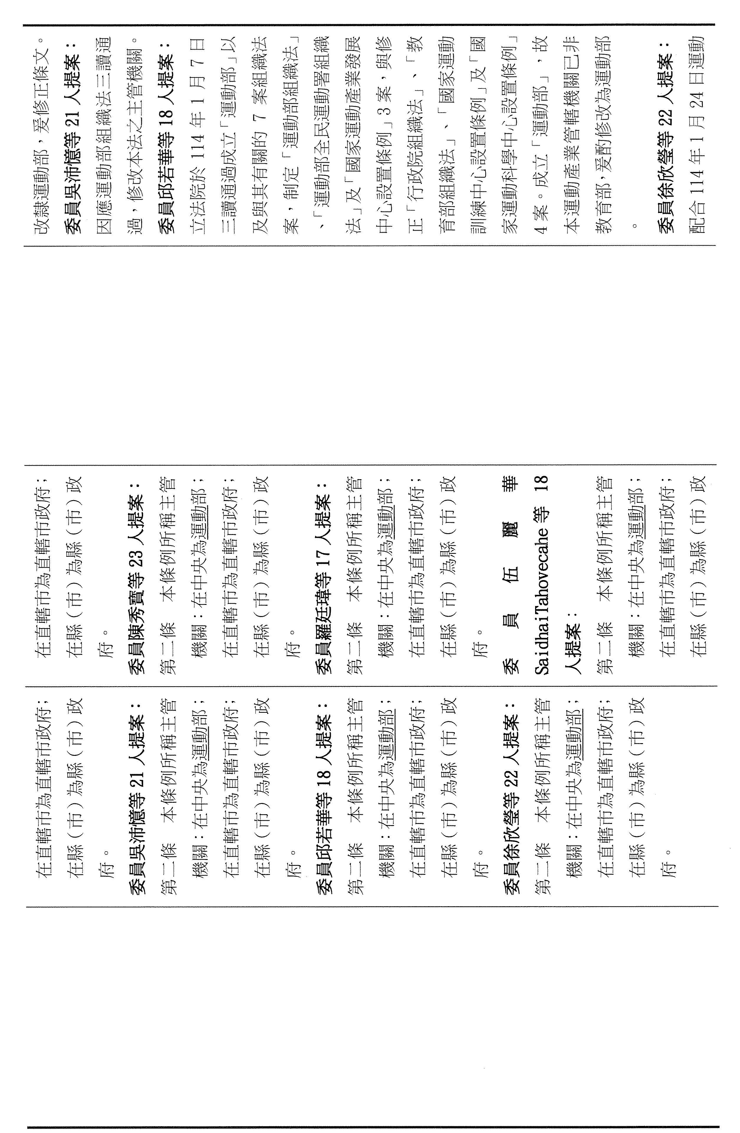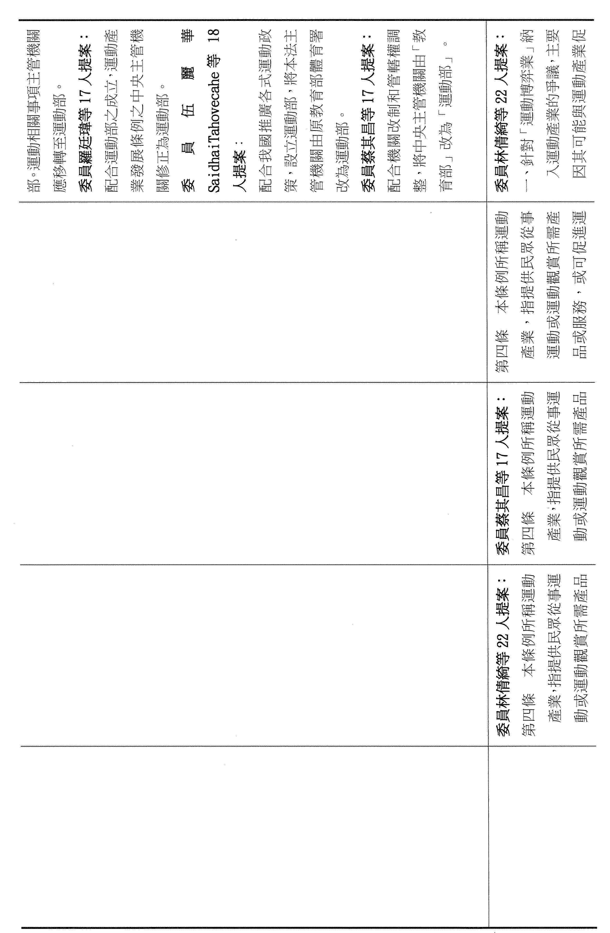 二、審查(一)行政院函請審議「運動產業發展條例第十三條、第二十六條及第二十六條之二條文修正草案」案。(二)委員林倩綺等18人擬具「運動產業發展條例第二十六條之二條文修正草案」案。(三)委員邱鎮軍等19人擬具「運動產業發展條例第二條、第二十四條及第二十六條條文修正草案」案。(四)委員黃捷等17人擬具「運動產業發展條例第二十六條之二條文修正草案」案。(五)委員張雅琳等17人擬具「運動產業發展條例部分條文修正草案」案。(六)委員吳沛憶等21人擬具「運動產業發展條例部分條文修正草案」案。(七)委員葉元之等18人擬具「運動產業發展條例第二十四條及第二十六條條文修正草案」案。(八)委員林宜瑾等28人擬具「運動產業發展條例第二十六條之二條文修正草案」案。(九)委員邱若華等18人擬具「運動產業發展條例第二條及第二十六條條文修正草案」案。(十)台灣民眾黨黨團擬具「運動產業發展條例第二十四條及第二十六條條文修正草案」案。(十一)委員陳秀寳等23人擬具「運動產業發展條例部分條文修正草案」案。(十二)委員羅廷瑋等17人擬具「運動產業發展條例第二條、第二十四條及第二十六條條文修正草案」案。(十三)委員徐巧芯等16人擬具「運動產業發展條例第二十四條及第二十六條條文修正草案」案。(十四)委員葛如鈞等17人擬具「運動產業發展條例第二十四條及第二十六條條文修正草案」案。(十五)委員徐欣瑩等22人擬具「運動產業發展條例部分條文修正草案」案。(十六)委員伍麗華Saidhai Tahovecahe等18人擬具「運動產業發展條例部分條文修正草案」案。(十七)委員廖偉翔等16人擬具「運動產業發展條例第二十四條及第二十六條條文修正草案」案。(十八)委員蔡其昌等17人擬具「運動產業發展條例部分條文修正草案」案。(十九)委員張智倫等19人擬具「運動產業發展條例第十三條、第二十六條及第二十六條之二條文修正草案」案。(二十)委員李坤城等19人擬具「運動產業發展條例第十三條、第二十六條及第二十六條之二條文修正草案」案。(二十一)委員葉元之等19人擬具「運動產業發展條例第二十六條之二條文修正草案」案。(二十二)委員王美惠等18人擬具「運動產業發展條例第十三條、第二十六條及第二十六條之二條文修正草案」案。(二十三)委員吳琪銘等19人擬具「運動產業發展條例第十三條、第二十六條及第二十六條之二條文修正草案」案。(二十四)委員邱鎮軍等17人擬具「運動產業發展條例第十三條及第二十六條之二條文修正草案」案。