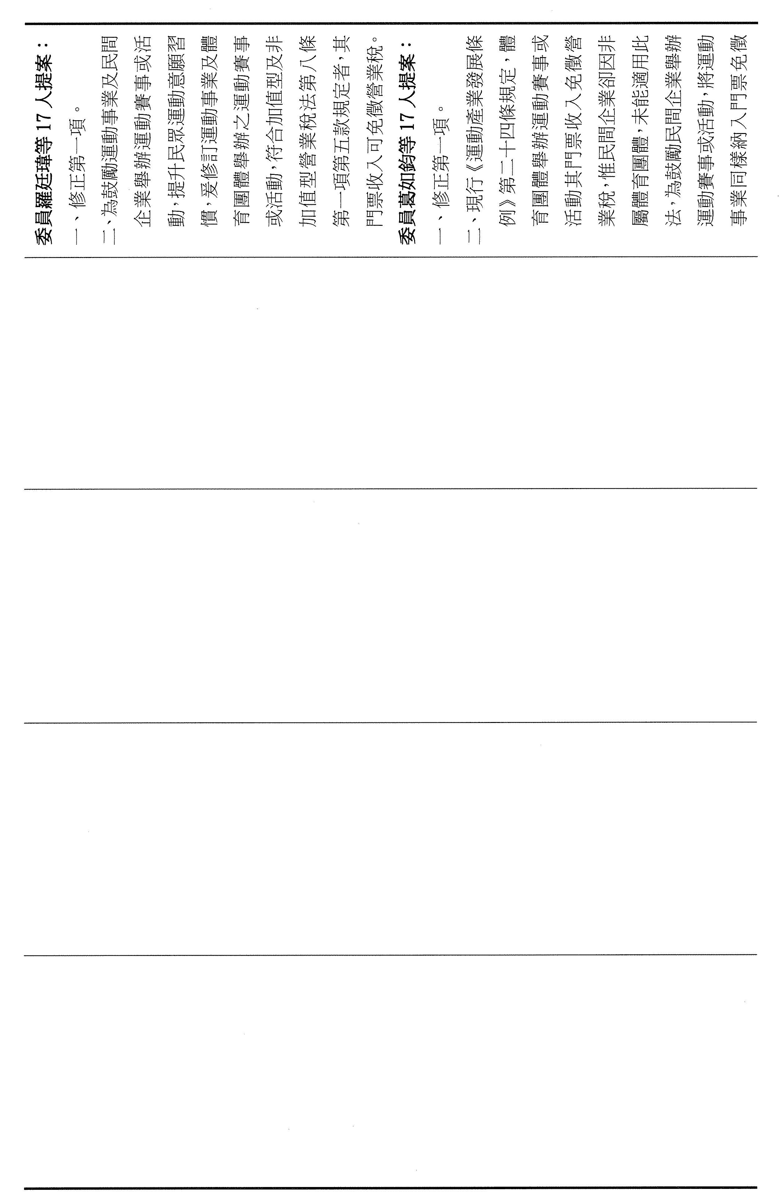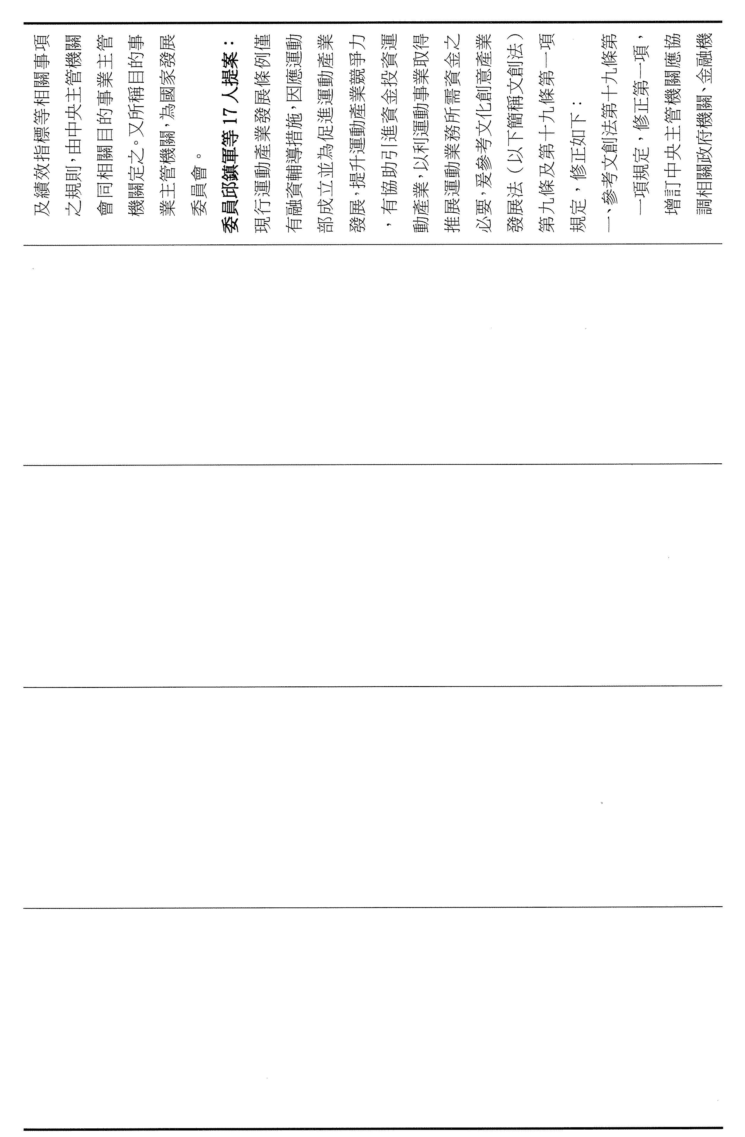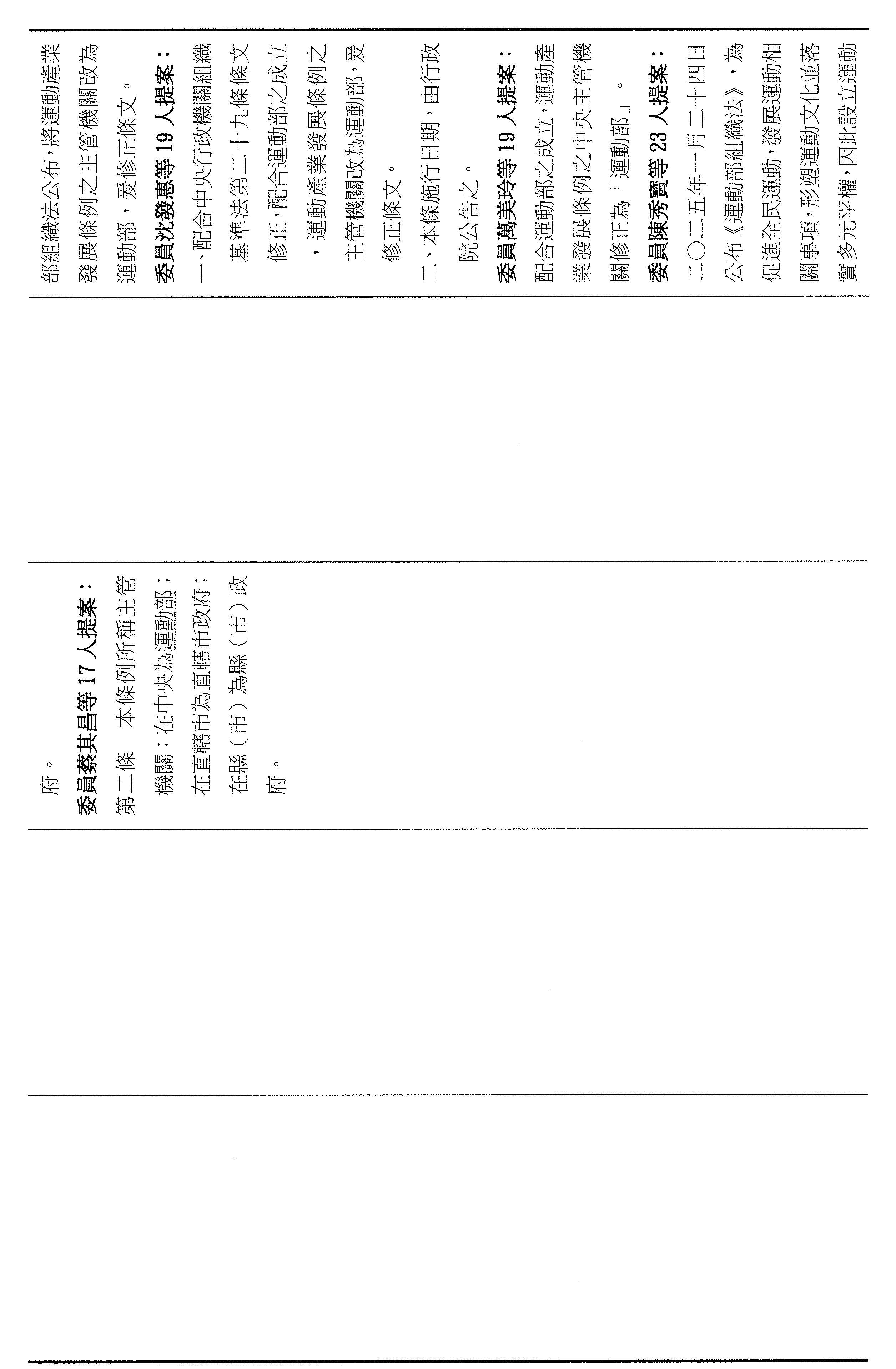 二、審查(一)行政院函請審議「運動產業發展條例第十三條、第二十六條及第二十六條之二條文修正草案」案。(二)委員林倩綺等18人擬具「運動產業發展條例第二十六條之二條文修正草案」案。(三)委員邱鎮軍等19人擬具「運動產業發展條例第二條、第二十四條及第二十六條條文修正草案」案。(四)委員黃捷等17人擬具「運動產業發展條例第二十六條之二條文修正草案」案。(五)委員張雅琳等17人擬具「運動產業發展條例部分條文修正草案」案。(六)委員吳沛憶等21人擬具「運動產業發展條例部分條文修正草案」案。(七)委員葉元之等18人擬具「運動產業發展條例第二十四條及第二十六條條文修正草案」案。(八)委員林宜瑾等28人擬具「運動產業發展條例第二十六條之二條文修正草案」案。(九)委員邱若華等18人擬具「運動產業發展條例第二條及第二十六條條文修正草案」案。(十)台灣民眾黨黨團擬具「運動產業發展條例第二十四條及第二十六條條文修正草案」案。(十一)委員陳秀寳等23人擬具「運動產業發展條例部分條文修正草案」案。(十二)委員羅廷瑋等17人擬具「運動產業發展條例第二條、第二十四條及第二十六條條文修正草案」案。(十三)委員徐巧芯等16人擬具「運動產業發展條例第二十四條及第二十六條條文修正草案」案。(十四)委員葛如鈞等17人擬具「運動產業發展條例第二十四條及第二十六條條文修正草案」案。(十五)委員徐欣瑩等22人擬具「運動產業發展條例部分條文修正草案」案。(十六)委員伍麗華Saidhai Tahovecahe等18人擬具「運動產業發展條例部分條文修正草案」案。(十七)委員廖偉翔等16人擬具「運動產業發展條例第二十四條及第二十六條條文修正草案」案。(十八)委員蔡其昌等17人擬具「運動產業發展條例部分條文修正草案」案。(十九)委員張智倫等19人擬具「運動產業發展條例第十三條、第二十六條及第二十六條之二條文修正草案」案。(二十)委員李坤城等19人擬具「運動產業發展條例第十三條、第二十六條及第二十六條之二條文修正草案」案。(二十一)委員葉元之等19人擬具「運動產業發展條例第二十六條之二條文修正草案」案。(二十二)委員王美惠等18人擬具「運動產業發展條例第十三條、第二十六條及第二十六條之二條文修正草案」案。(二十三)委員吳琪銘等19人擬具「運動產業發展條例第十三條、第二十六條及第二十六條之二條文修正草案」案。(二十四)委員邱鎮軍等17人擬具「運動產業發展條例第十三條及第二十六條之二條文修正草案」案。