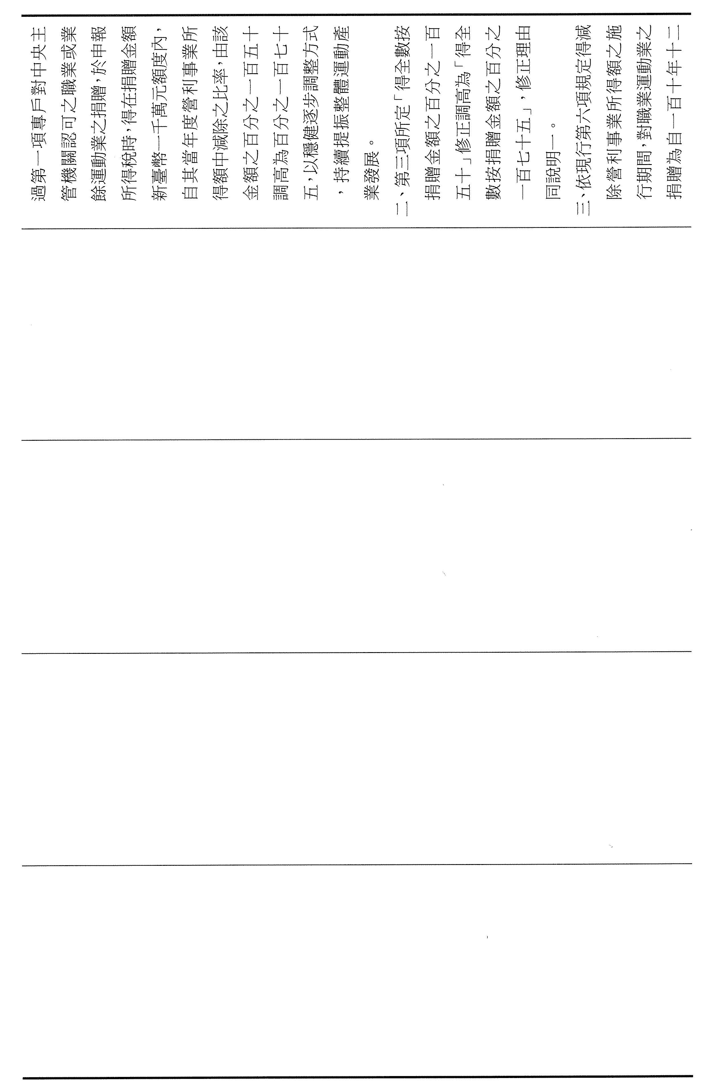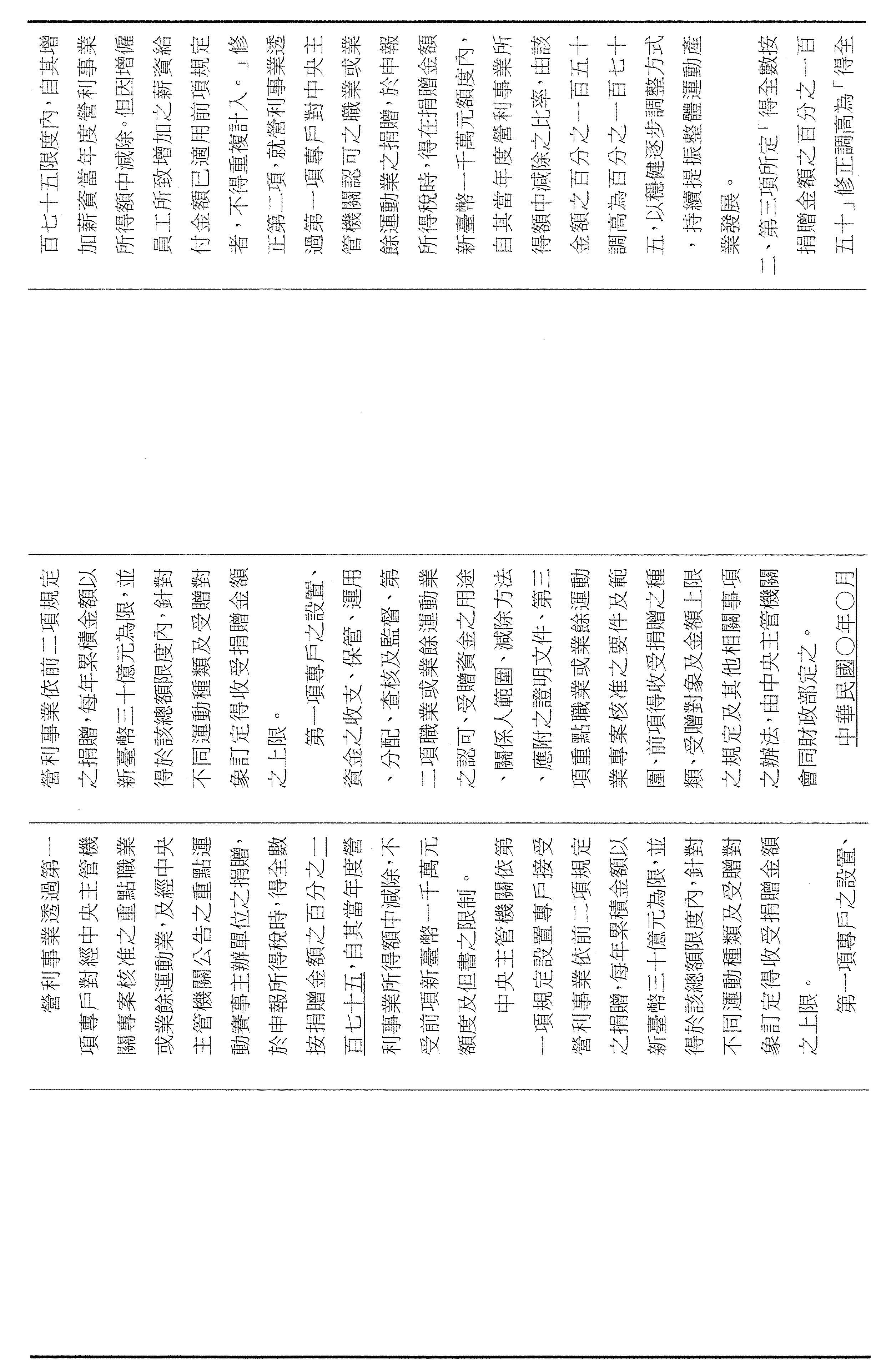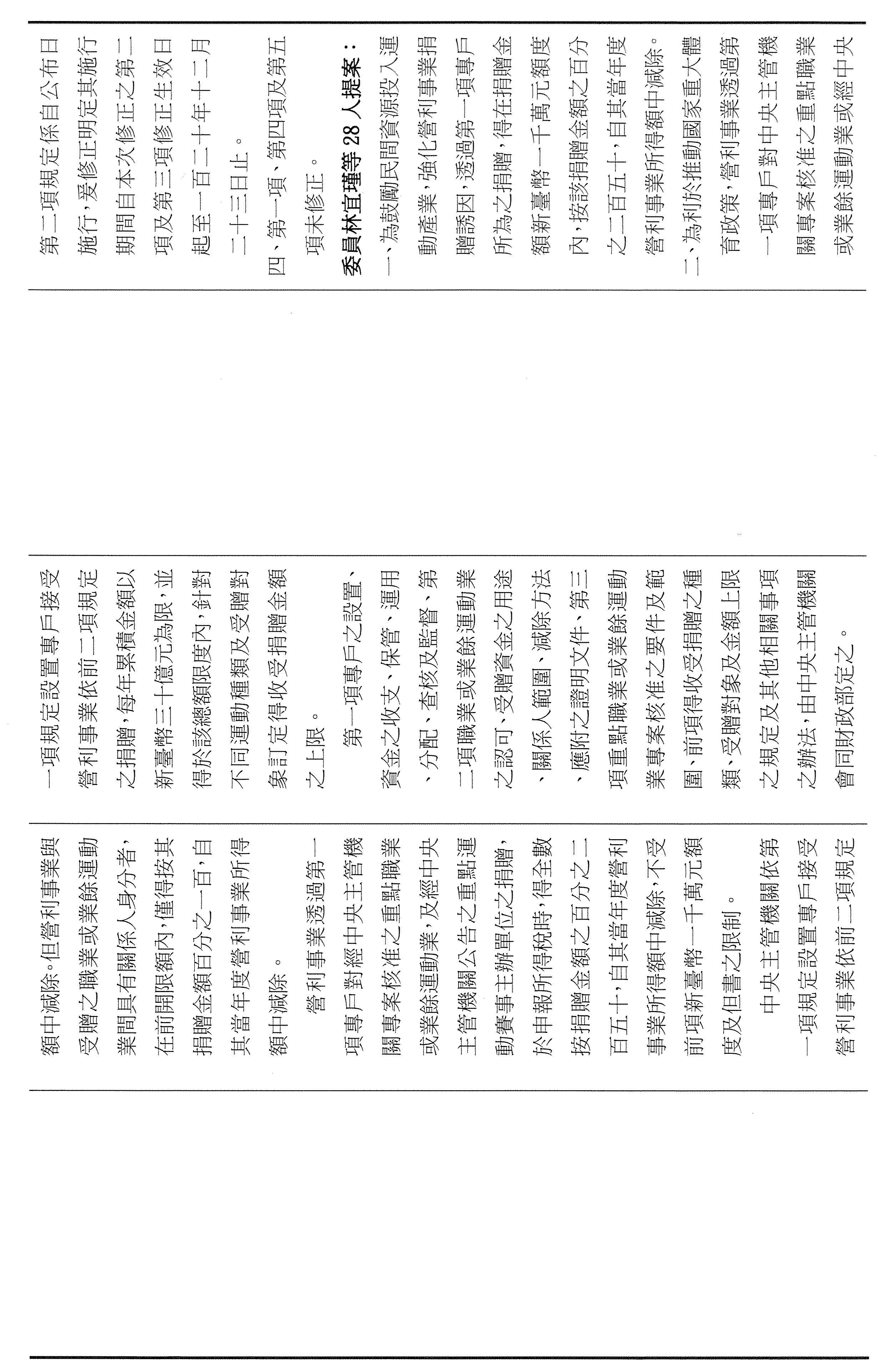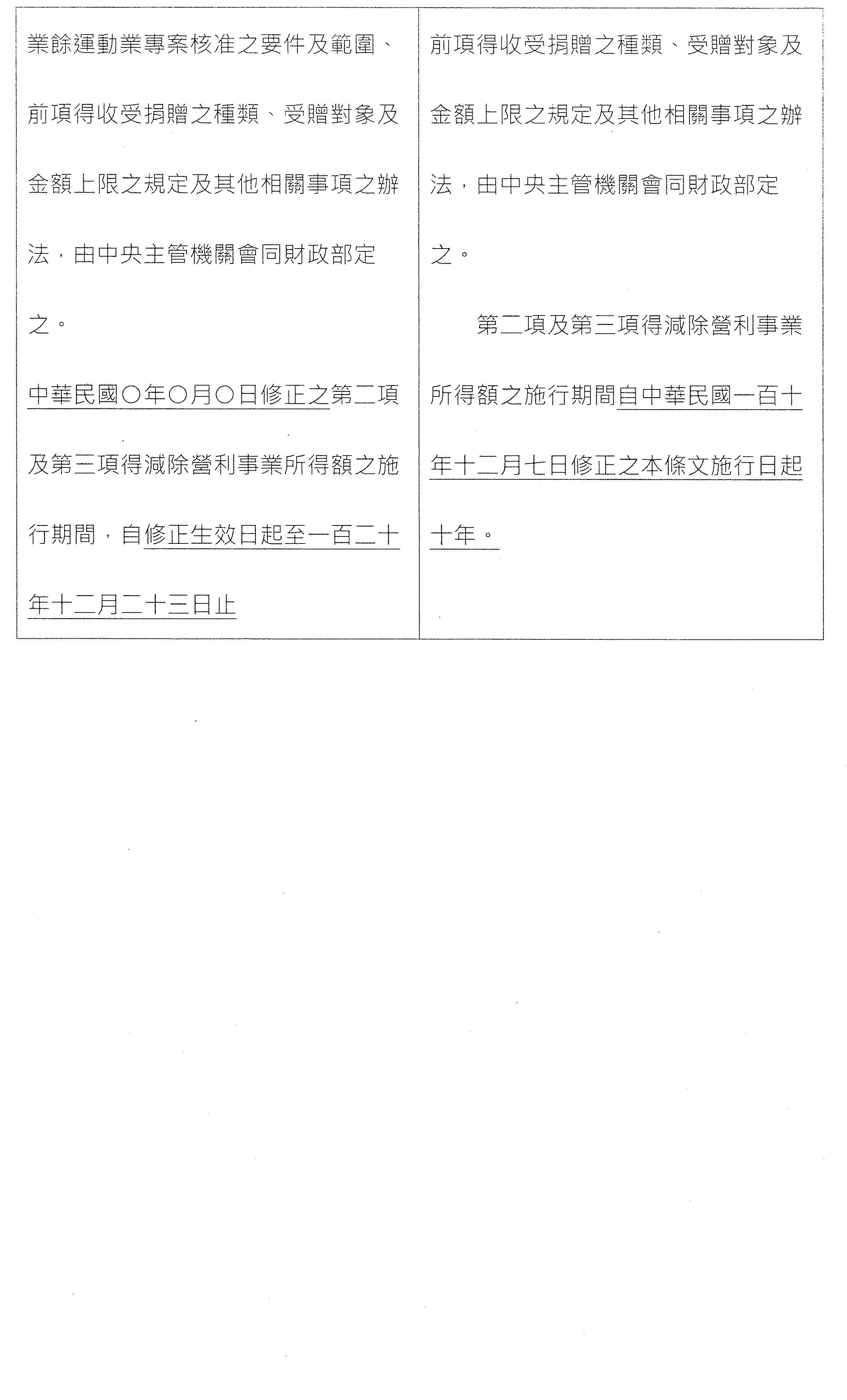 第二項「按該金額之百分之一百七十五」;第三項一樣是「得全數按捐贈金額之百分之一百七十五」;第六項是對相關時間的修正「中華民國○年○月○日修正」,之後如果順利通過的話就會以這個日期為主,還有「自修正生效日起至一百二十年十二月二十三日止」。確定大家都沒有問題嗎?其實我看了財政部的協助,在金額上面其實都在可以理解的範圍之內,單年的稅損大概都是在千萬等級。好,所以沒有委員要堅持250%嗎?好,OK。如果委員沒有意見的話,我們是不是就以行政院版本為主?第二十六條之二就照行政院版本通過。