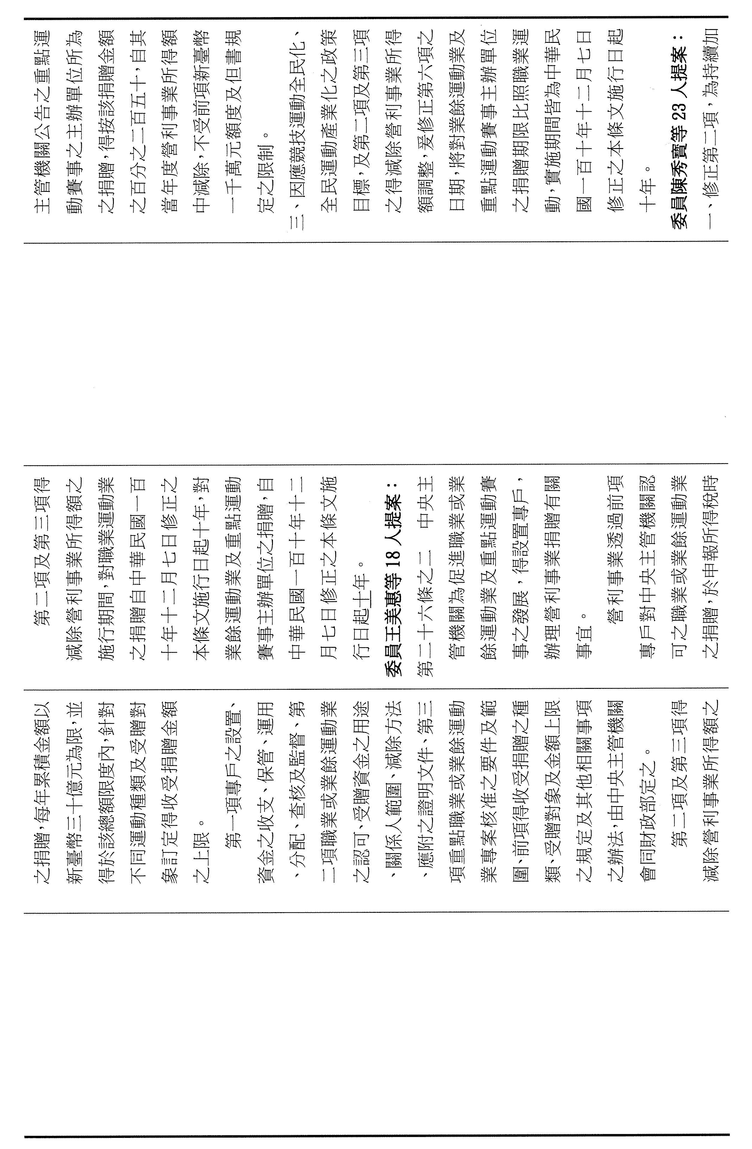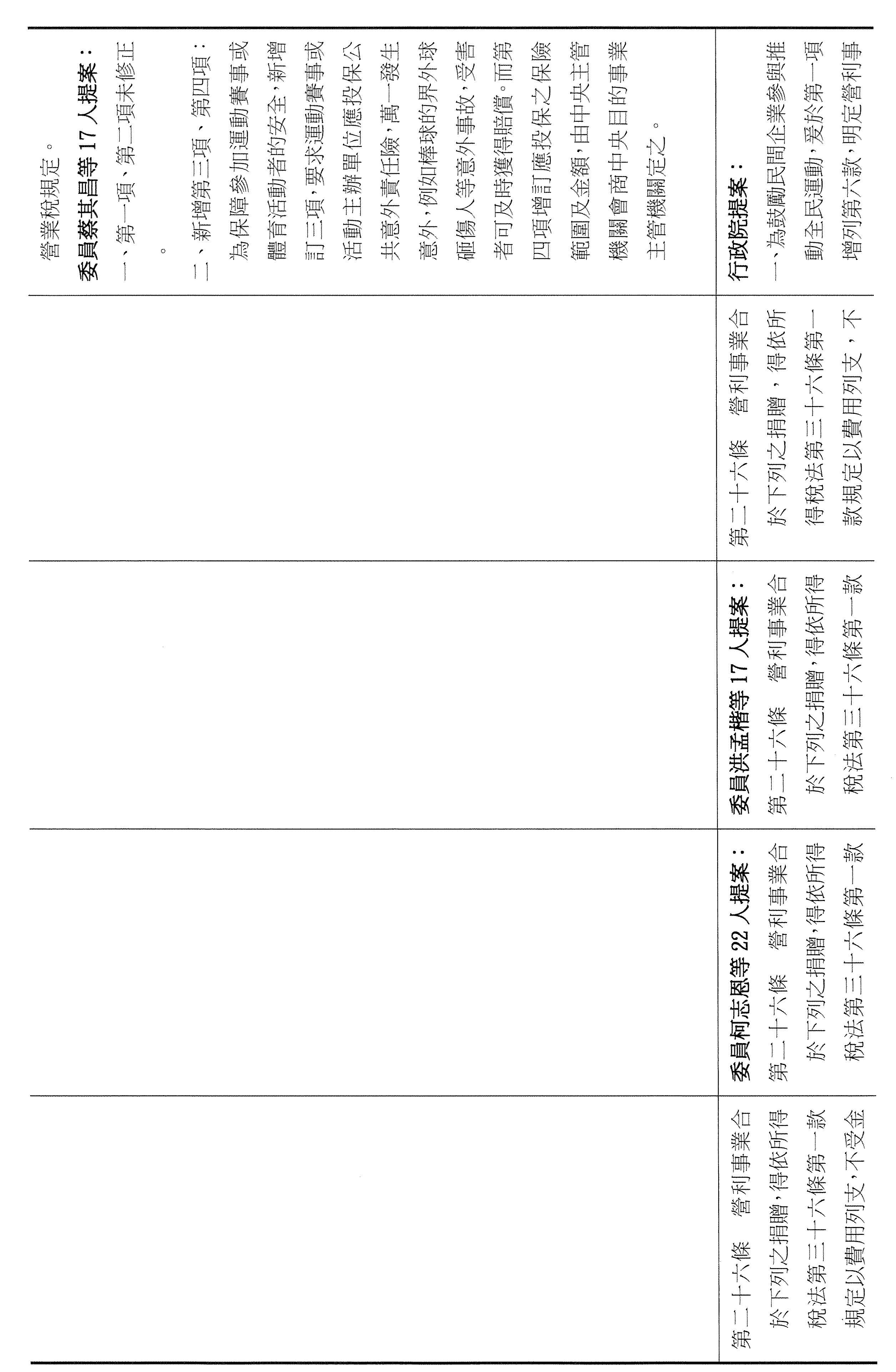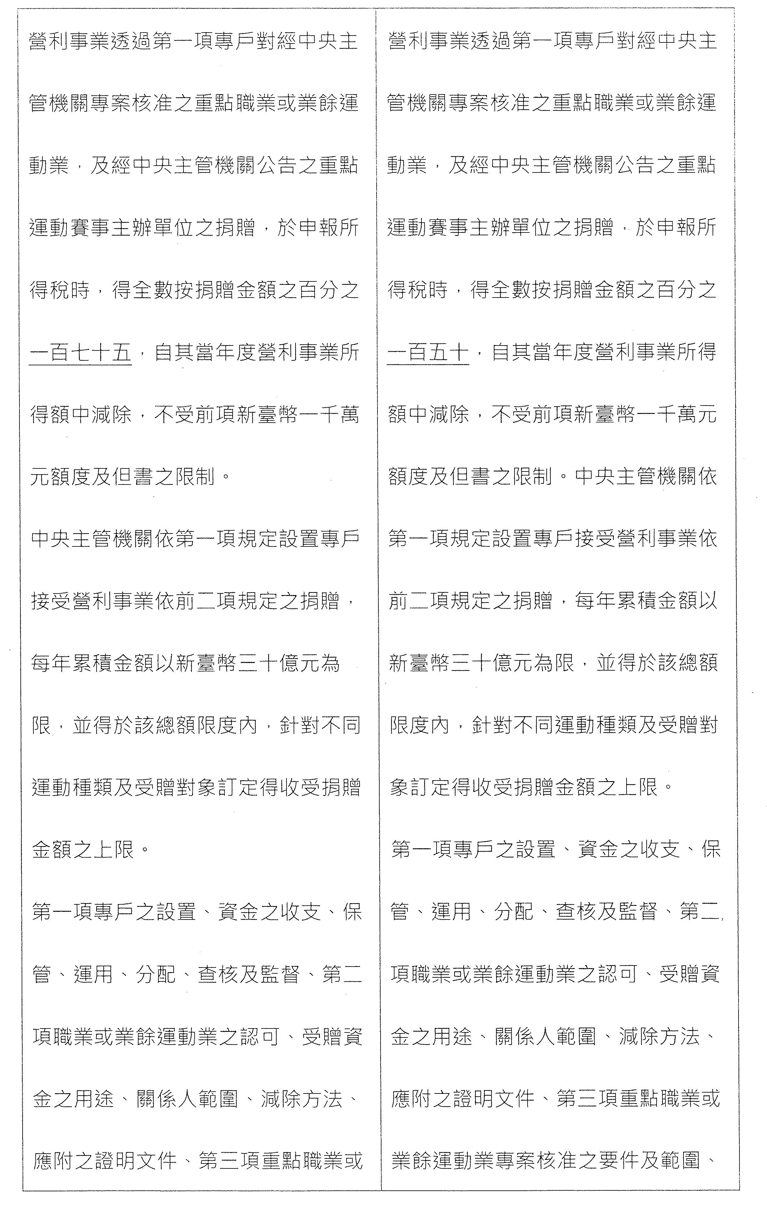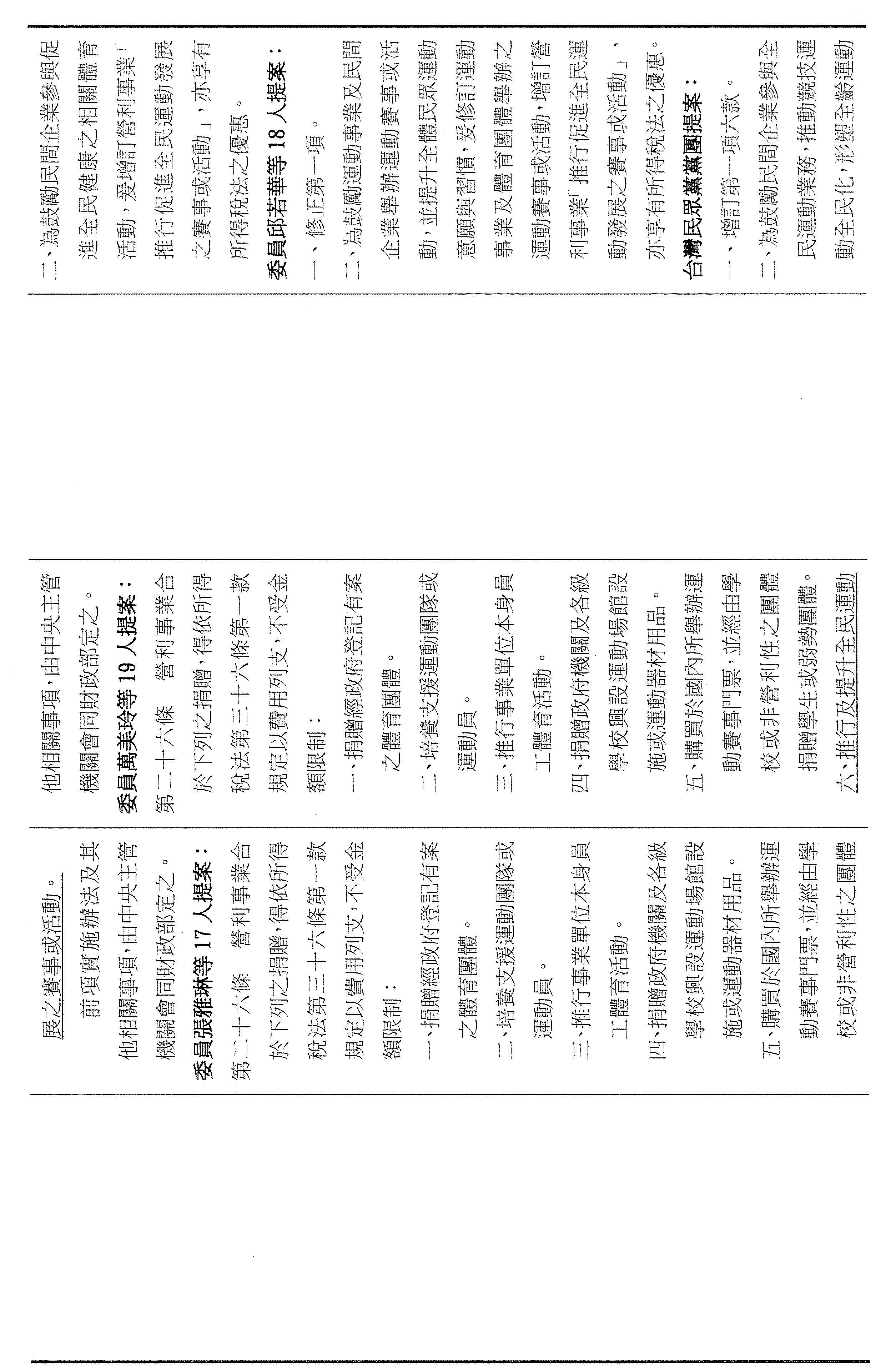 第二項是針對業餘運動業及重點運動賽事捐贈的期限,希望能夠比照職業運動的期限,把它延長到10年,所以這部分委員們提案的修正方向與院版幾乎都是一致的,所以建議維持院版。