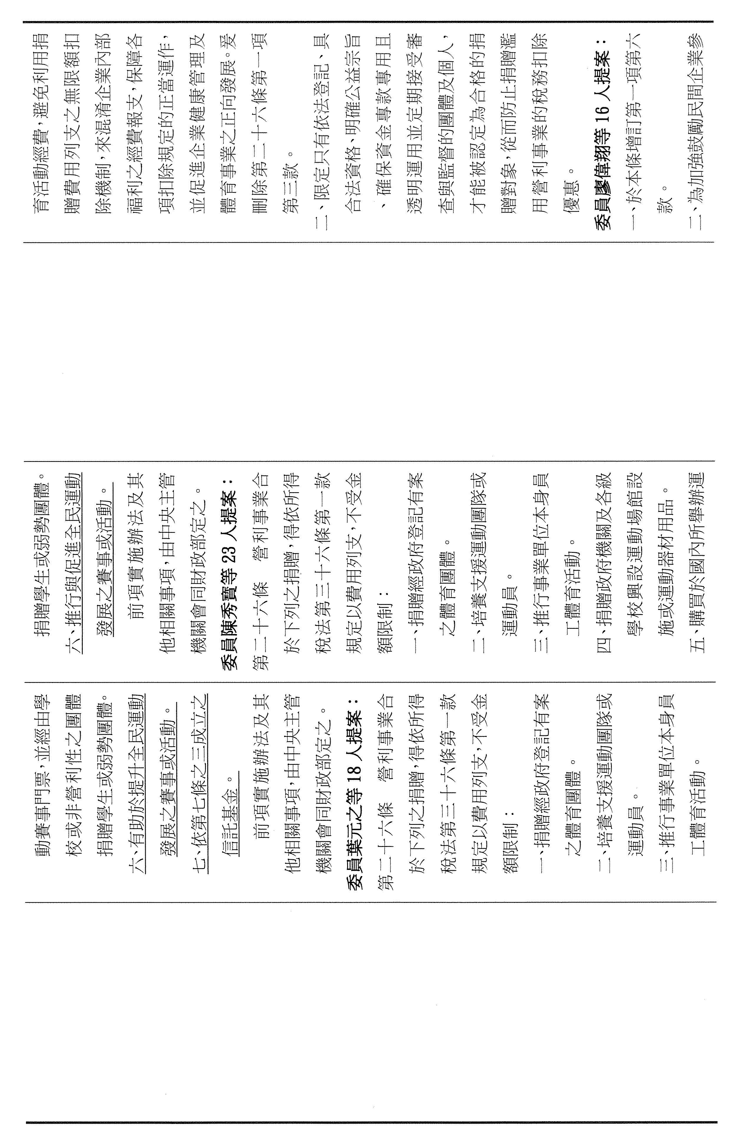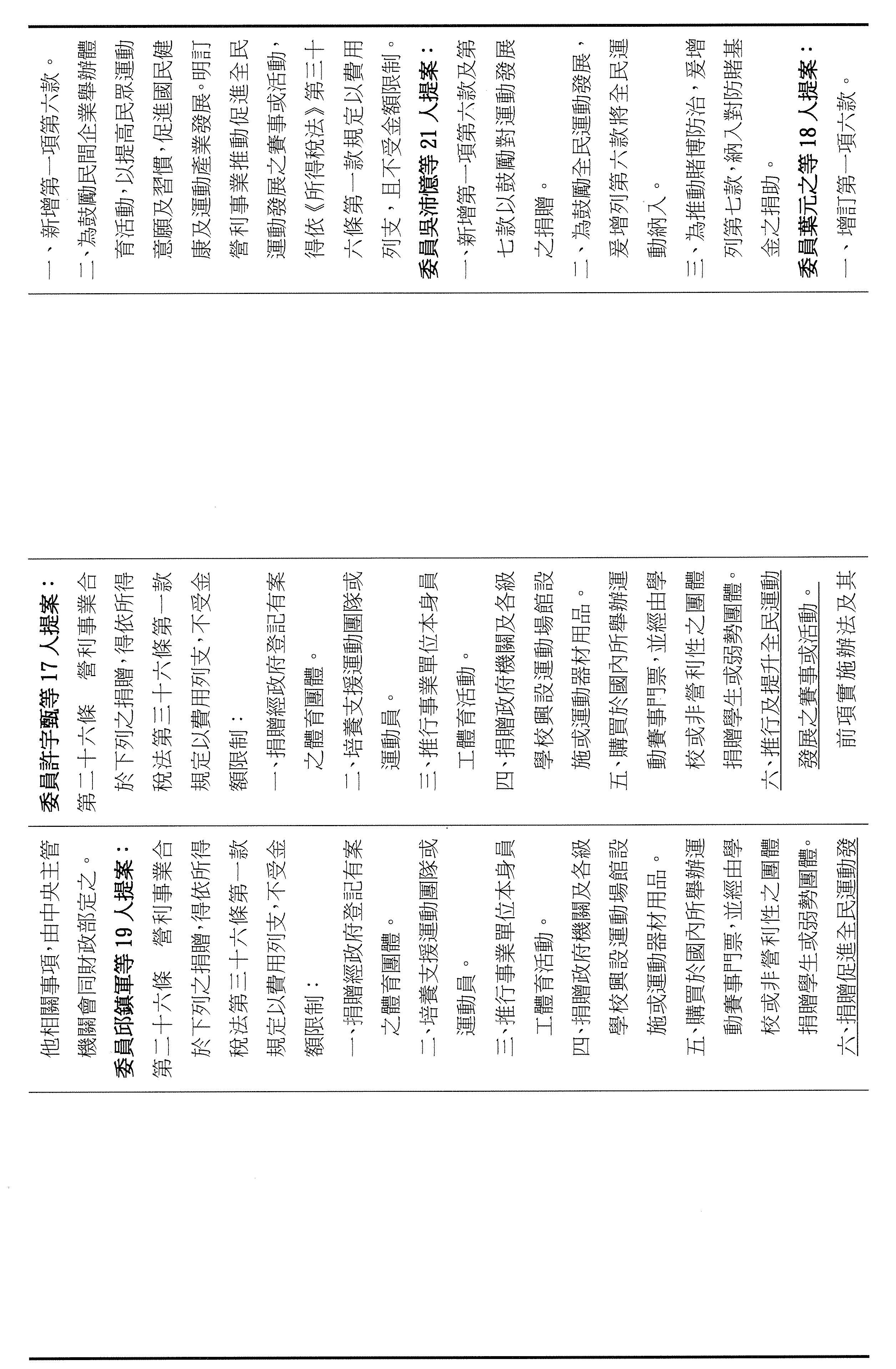 至於第三個部分是徐欣瑩委員等22人提案刪除第一項第三款「推行事業單位本身員工體育活動」;另外提案修正第二項,以防止捐贈濫用營利事業之稅務扣除優惠。本部為了鼓勵全民運動,建議維持現行條文第一項第三款,以持續鼓勵企業負起社會責任推行運動,這部分也是建議免予修正,以上報告。