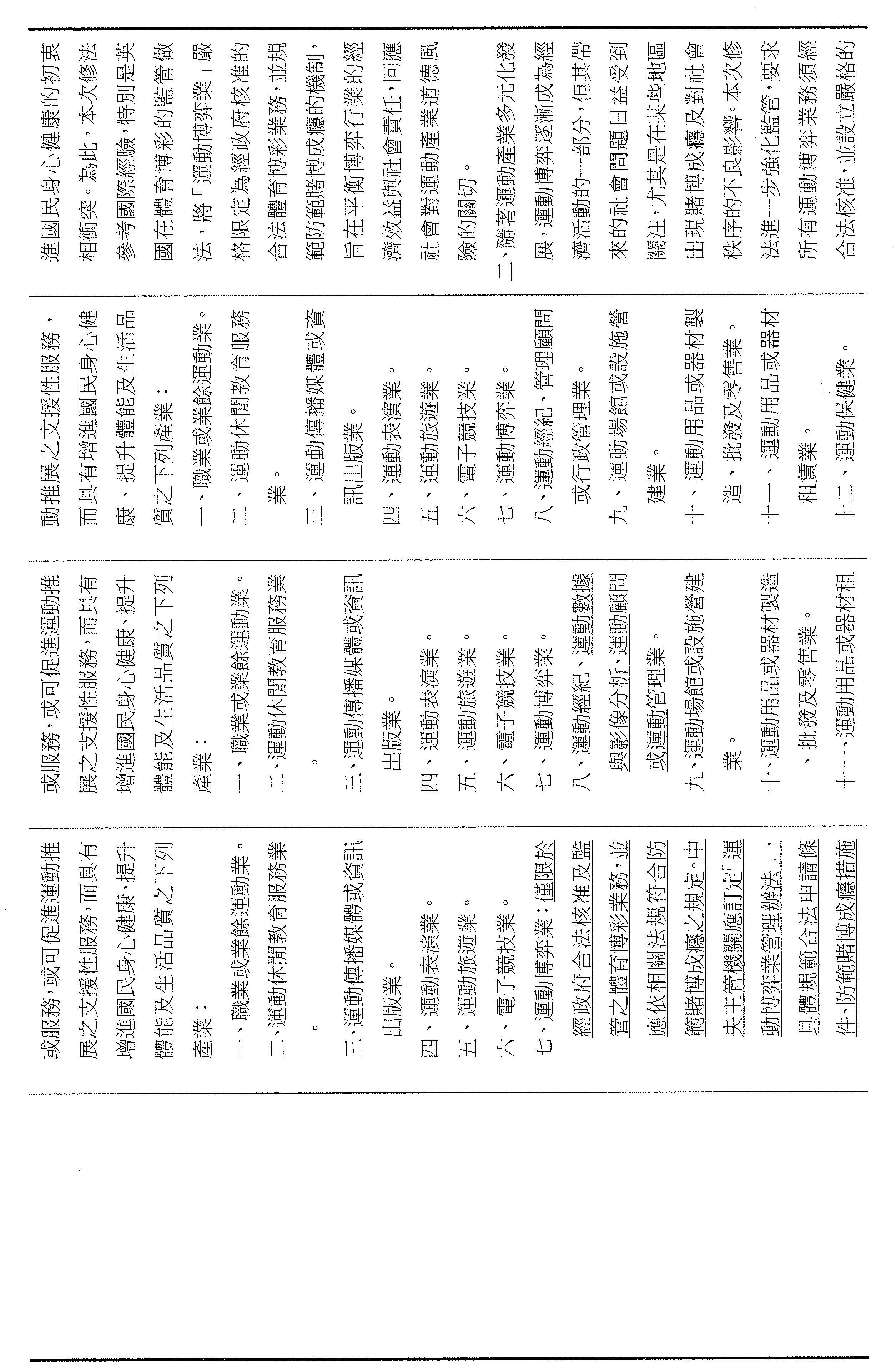 鄭署長世忠:針對林倩綺委員等22人提案增列「運動博弈業」的部分,因為博弈業在我國基本上就是一個違法的樣態,我們目前唯一特許的就是運動彩券發行條例,依據該條例的授權,也訂定了運動彩券管理辦法來管理運動彩券發行的相關事項,所以建議這個部分是不是可以維持現行條文?