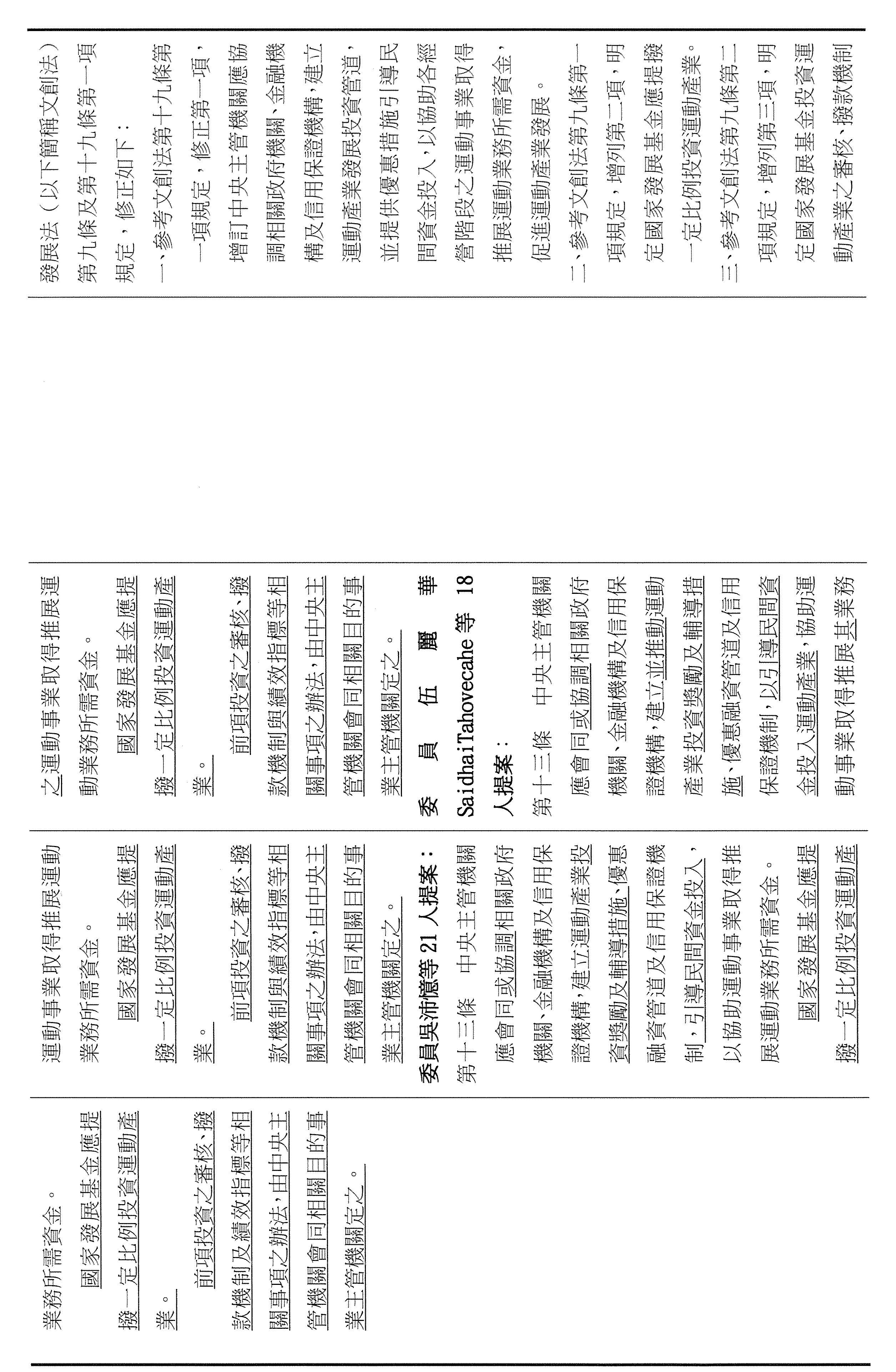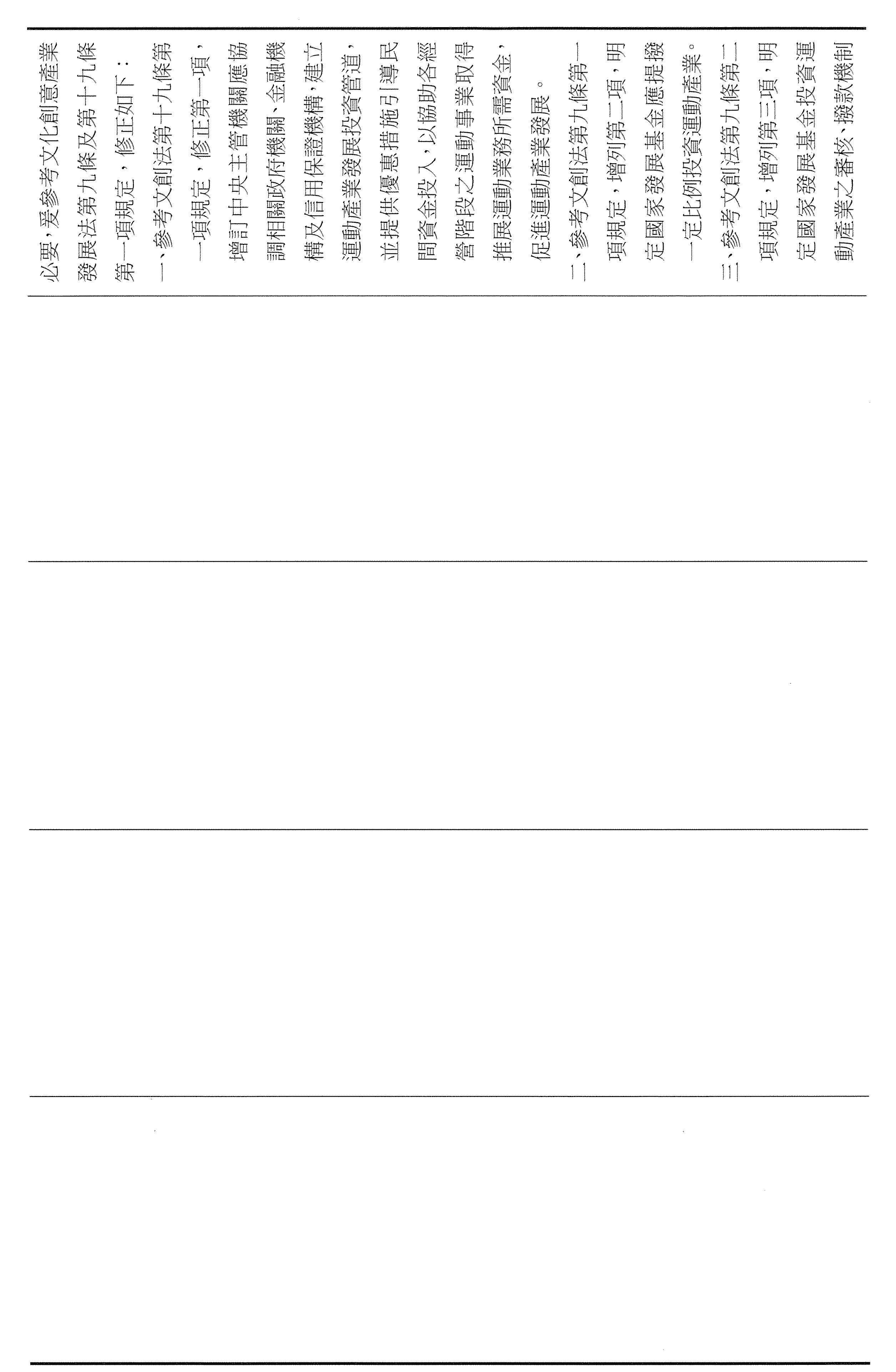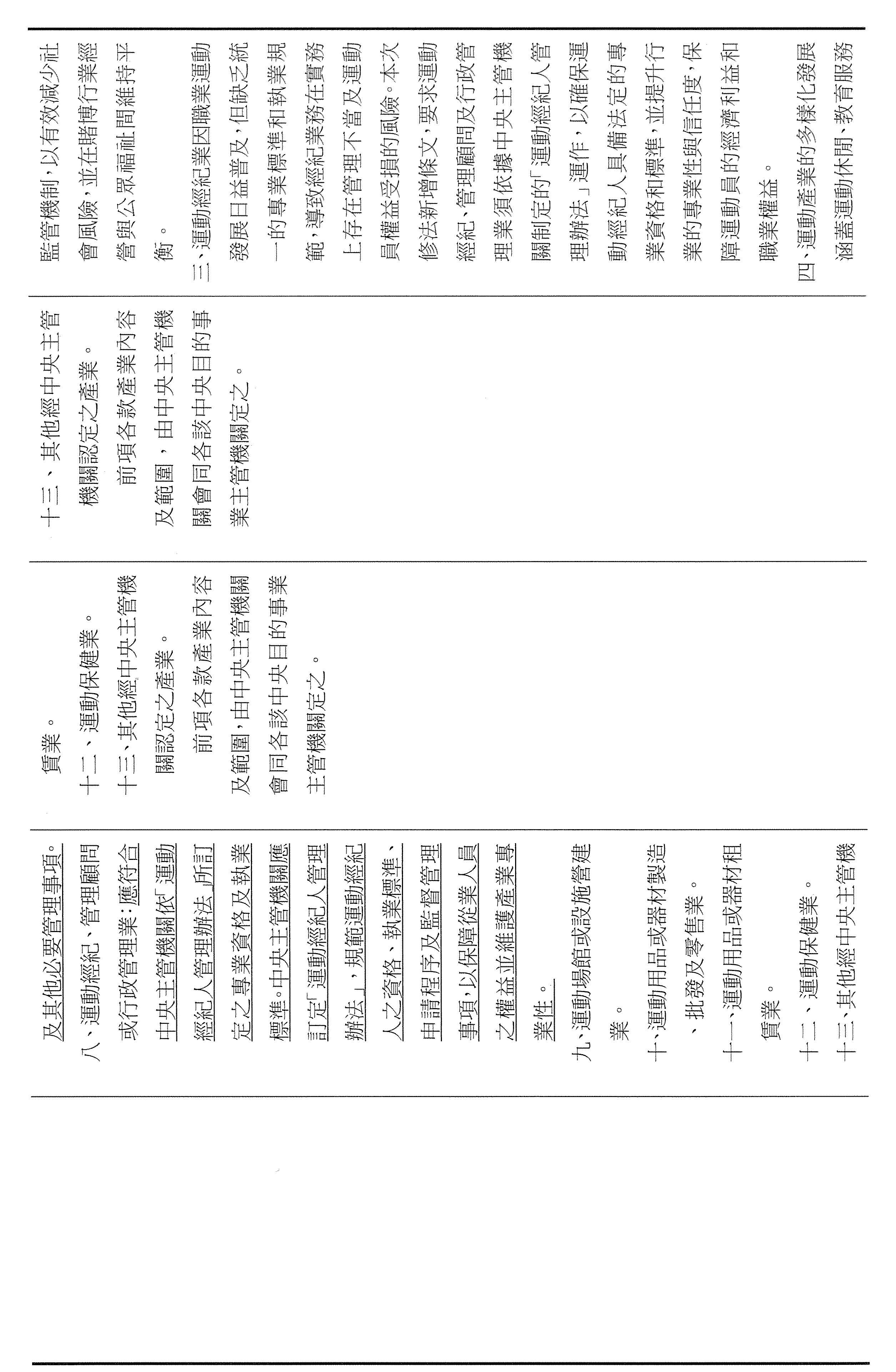 鄭署長世忠:有關第二十六條之二這一條的修正草案,感謝各位委員的提案,都是為了給予我們運動產業的發展一個支持,特別感謝。我們這個案子的修正草案分為五大部分,我這邊會逐一做個說明。