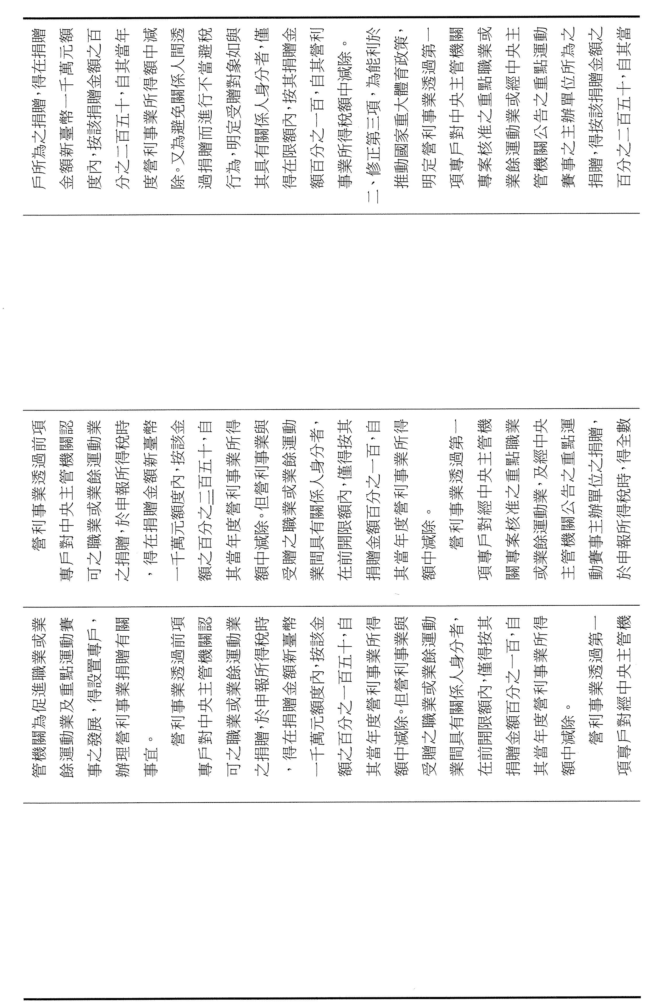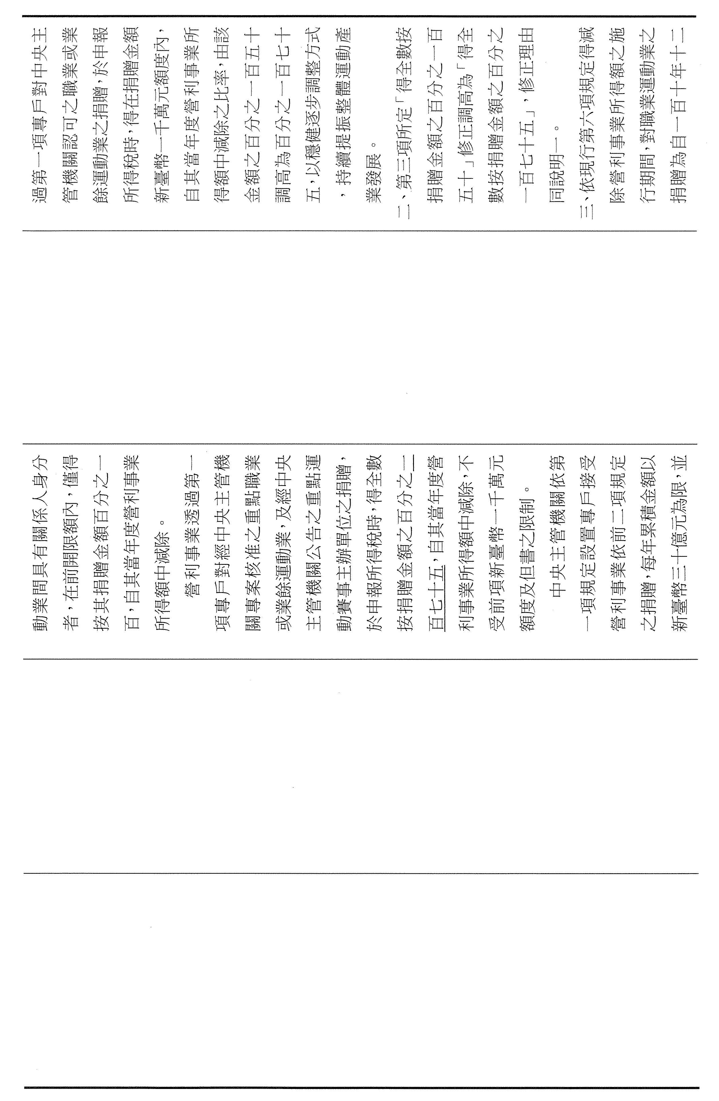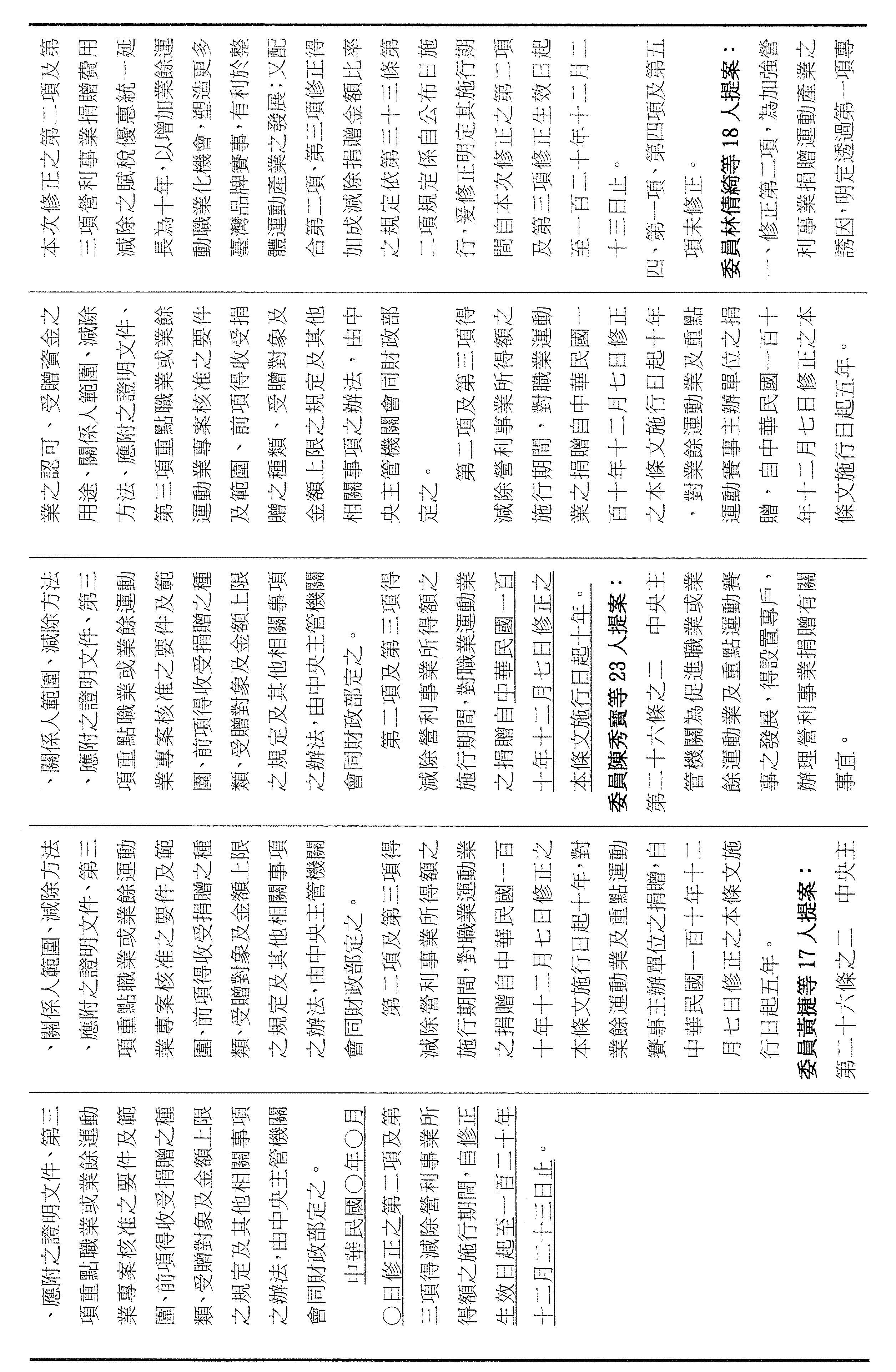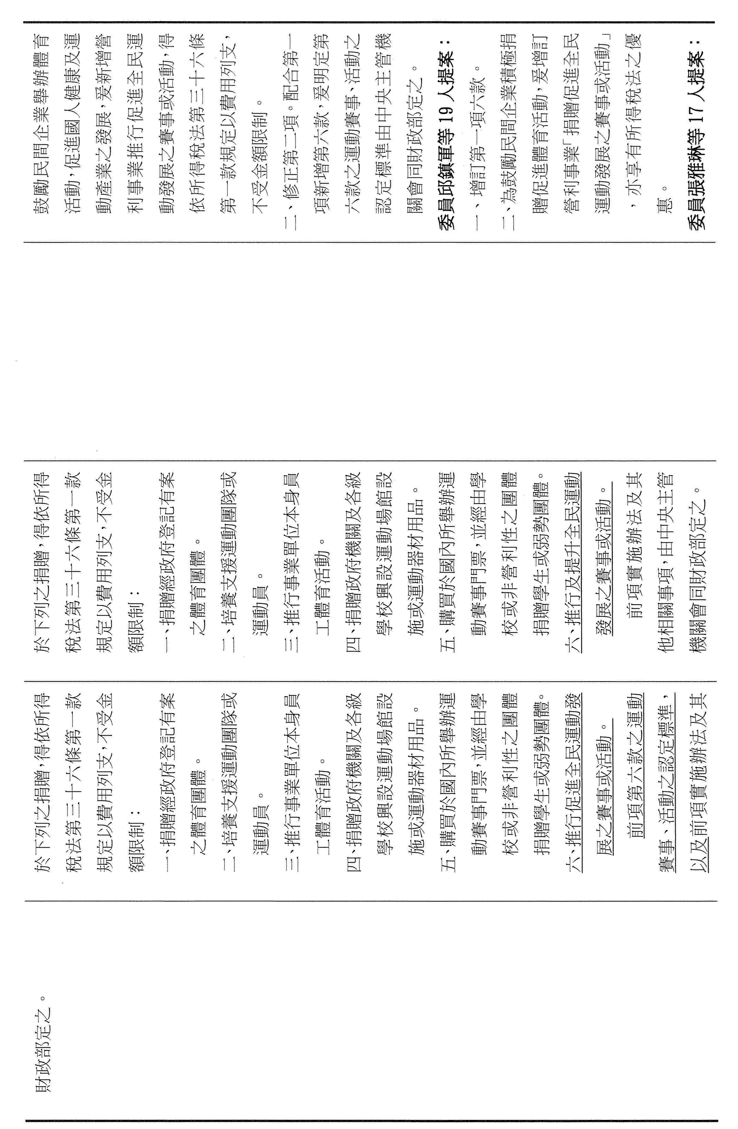 林委員宜瑾:關於這一條,我的版本是在院版之前提出的,就是把企業捐贈減免營所稅的額度調到250%。我還是要論述一下,上一屆的時候我有提出250%的額度,在與部會來回溝通之後,最後是以150%的版本通過,雖然還是有進步的空間,但總比沒有好,先求有再求好。也因為這個租稅優惠,致使職棒第六隊台鋼雄鷹加入。今年職棒球隊變多,職籃也成立新聯盟,排球也正式職業化,就整個運動產業經濟、地方經濟的效益來看,還有運動部就要掛牌,所以應該是來調整額度的時候了。