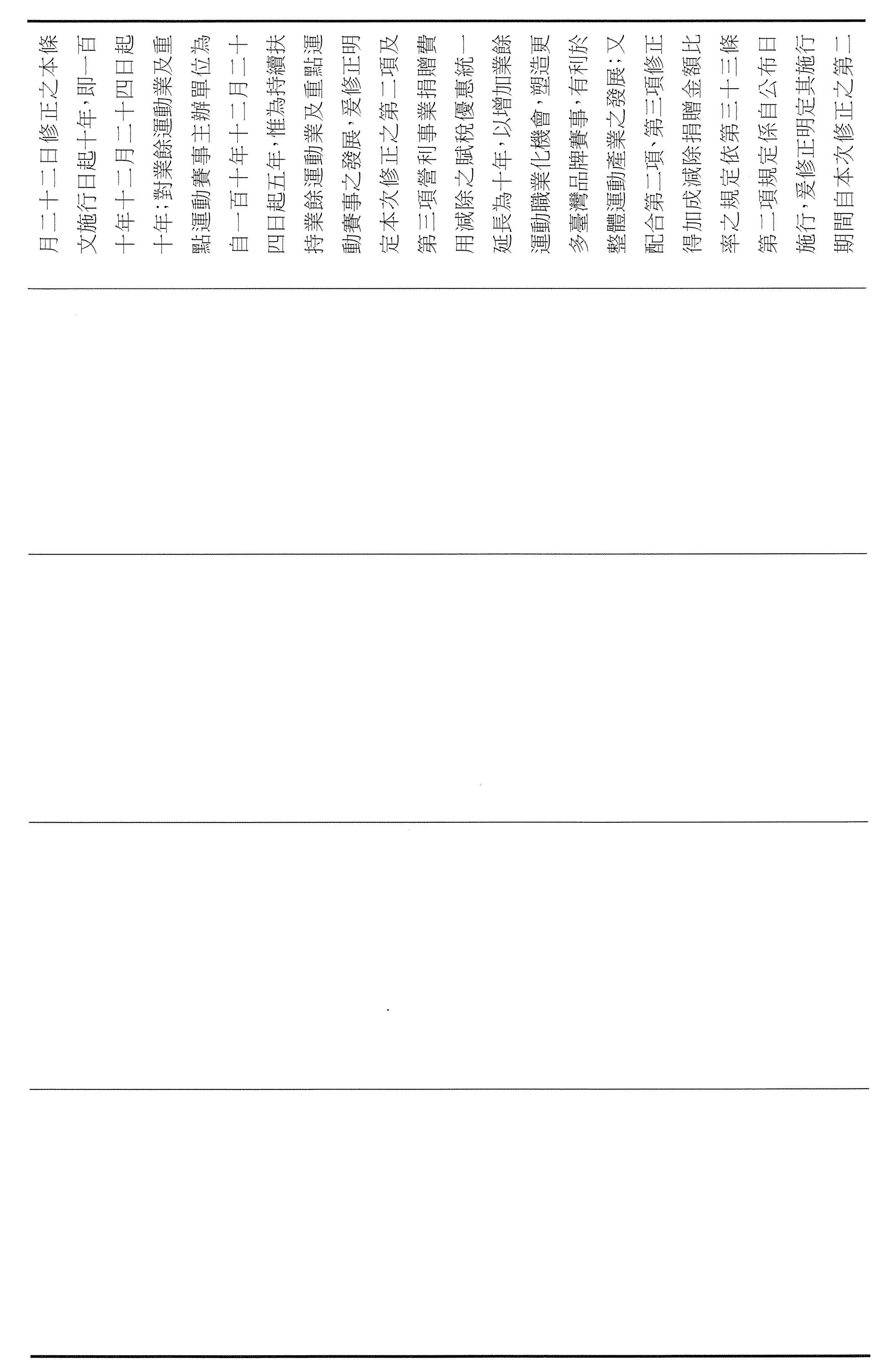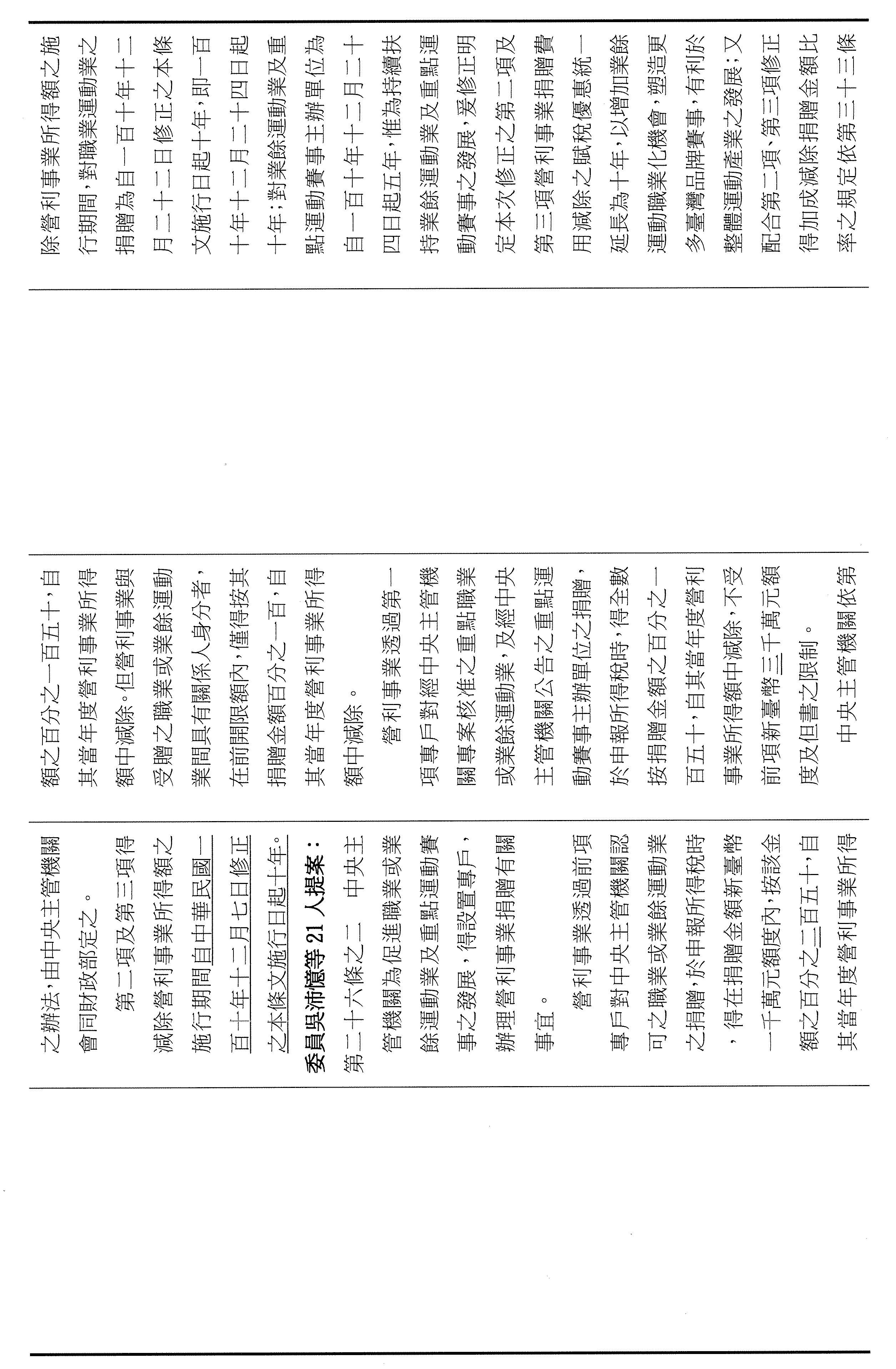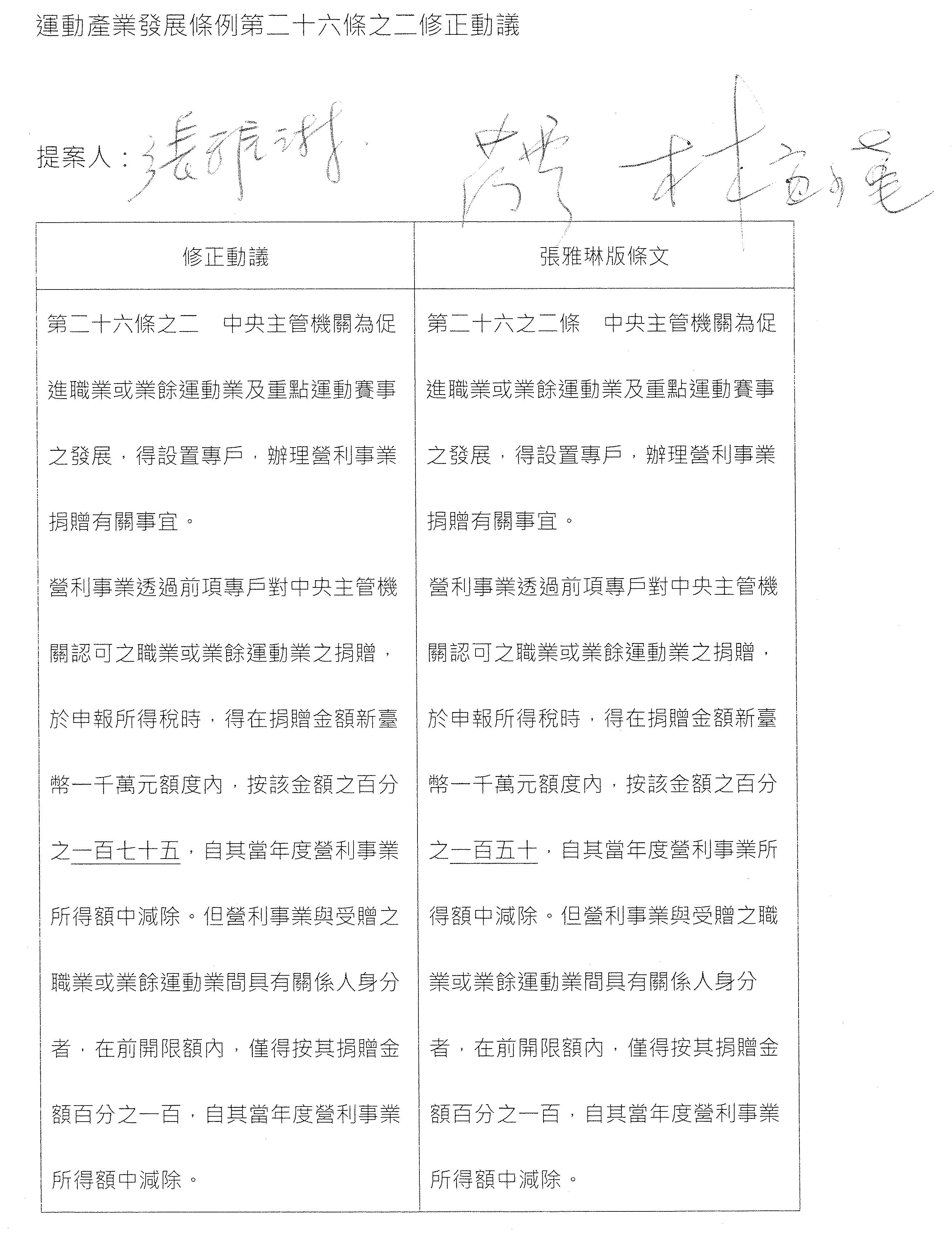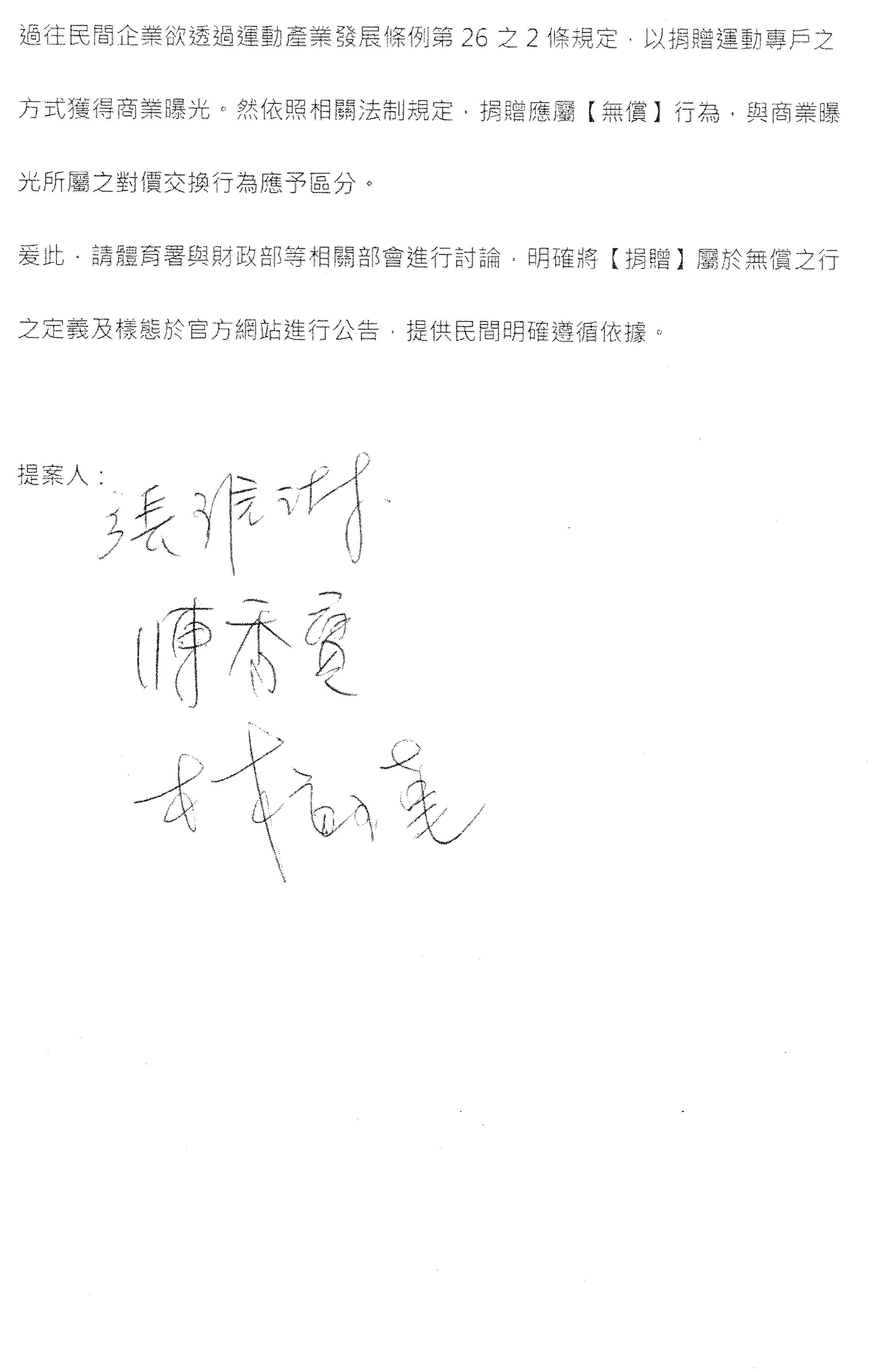 張委員雅琳:我之所以提出修正動議,最主要是因為我的版本也是在院版之前,但是我們後來也是有跟財政部再聯繫。誠如剛剛召委說的,我們希望折抵營利事業所得稅的額度,可以比照中小企業發展條例提升到175%,這樣才可以促進民間企業積極透過第二十六條之二的捐贈,協助運動產業發展。不過,我也提出了一個附帶決議,最主要是現在的條文文字並沒有清楚地說明捐贈應屬於無償的行為,與商業曝光所屬之對價交換行為應予區分。這件事情是不明確的,以至於過去造成一些民間企業的糾紛。所以我希望體育署跟財政部可以進行相關的討論,明確地將捐贈屬於無償之行為的定義及樣態於官方網站上進行公告,確保民間不管是贊助商或活動公司、公關公司跟贊助商拉贊助的時候,有一個更明確的依循,不會造成後續相關的糾紛,謝謝。