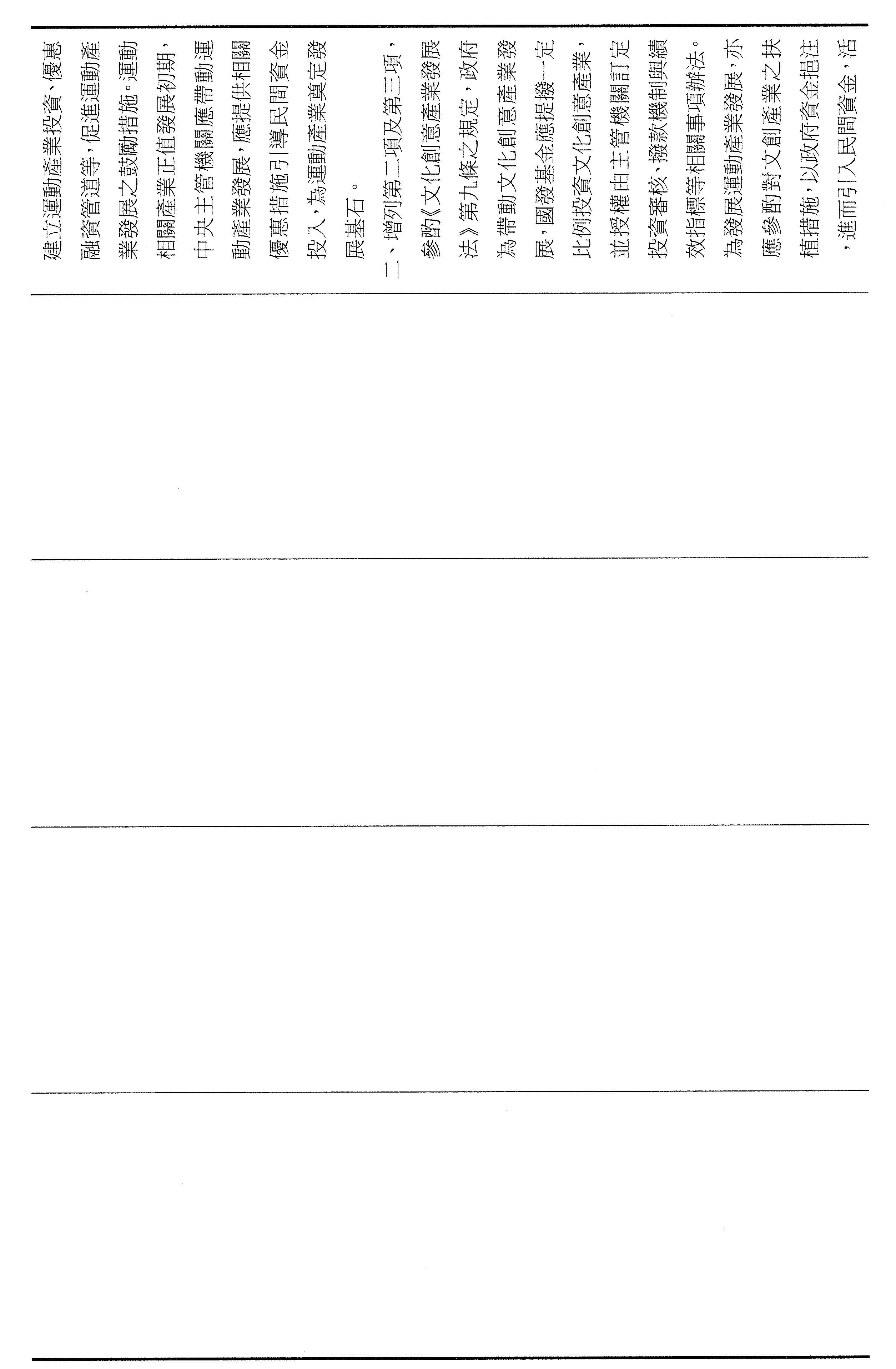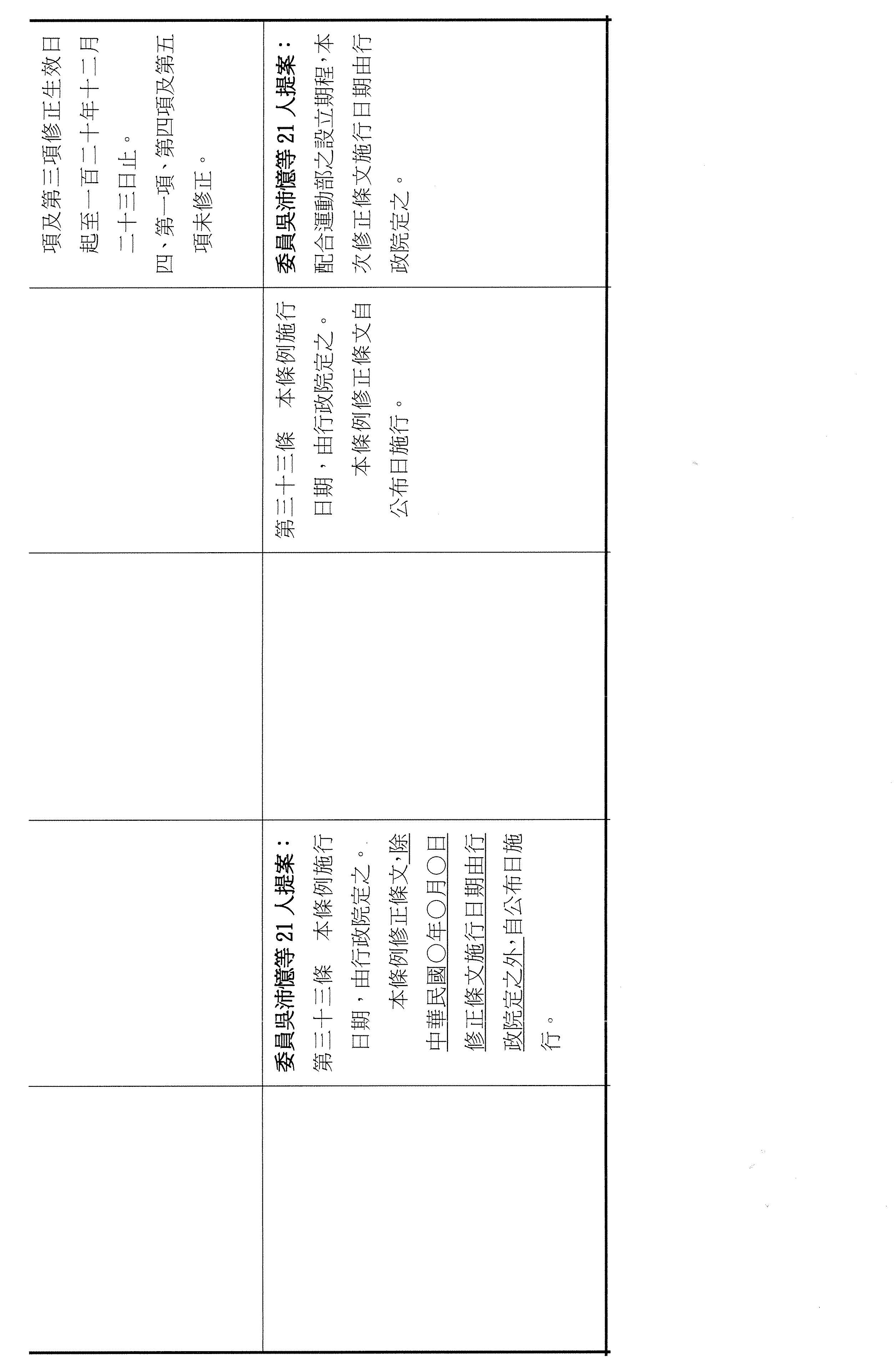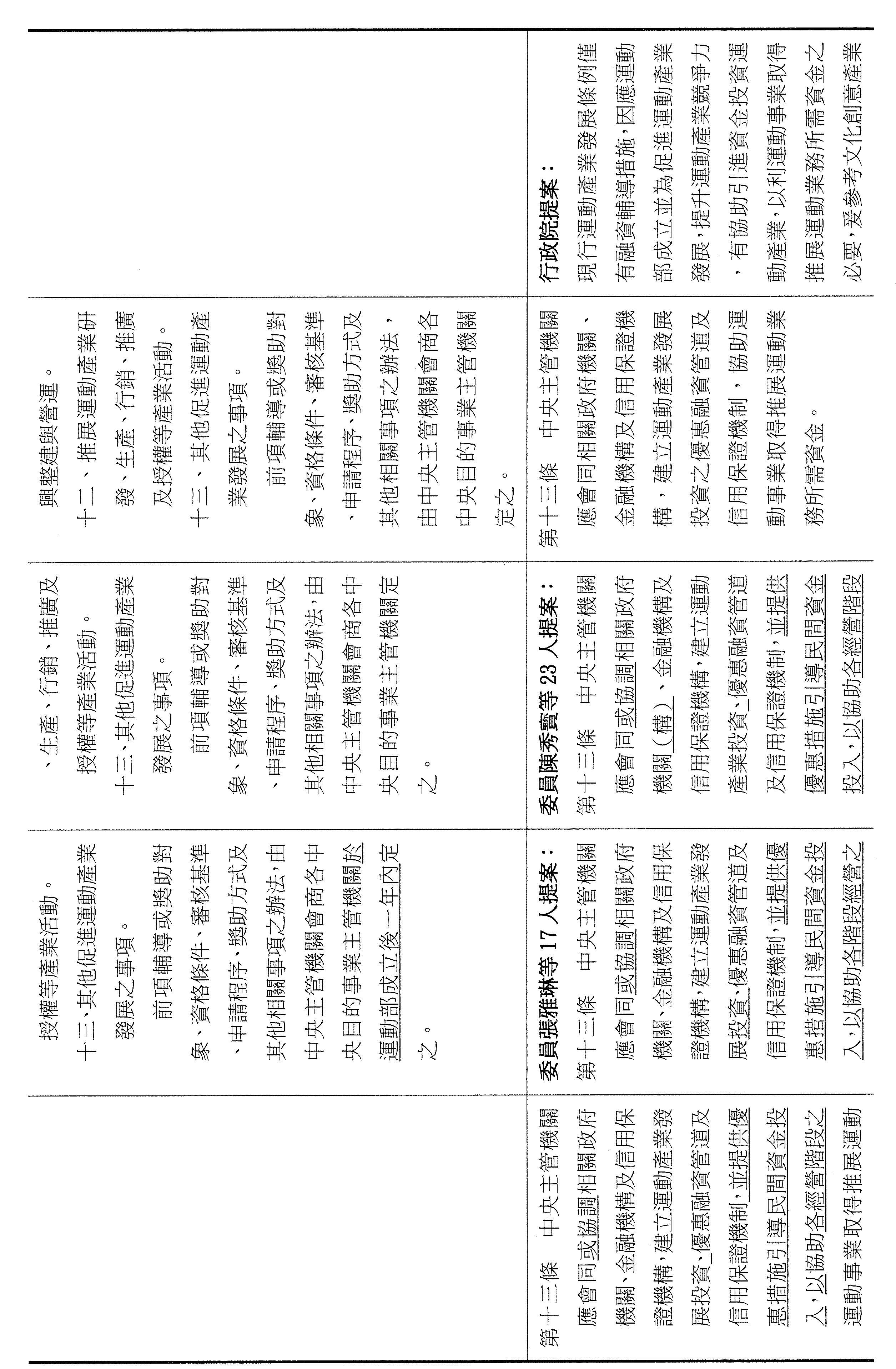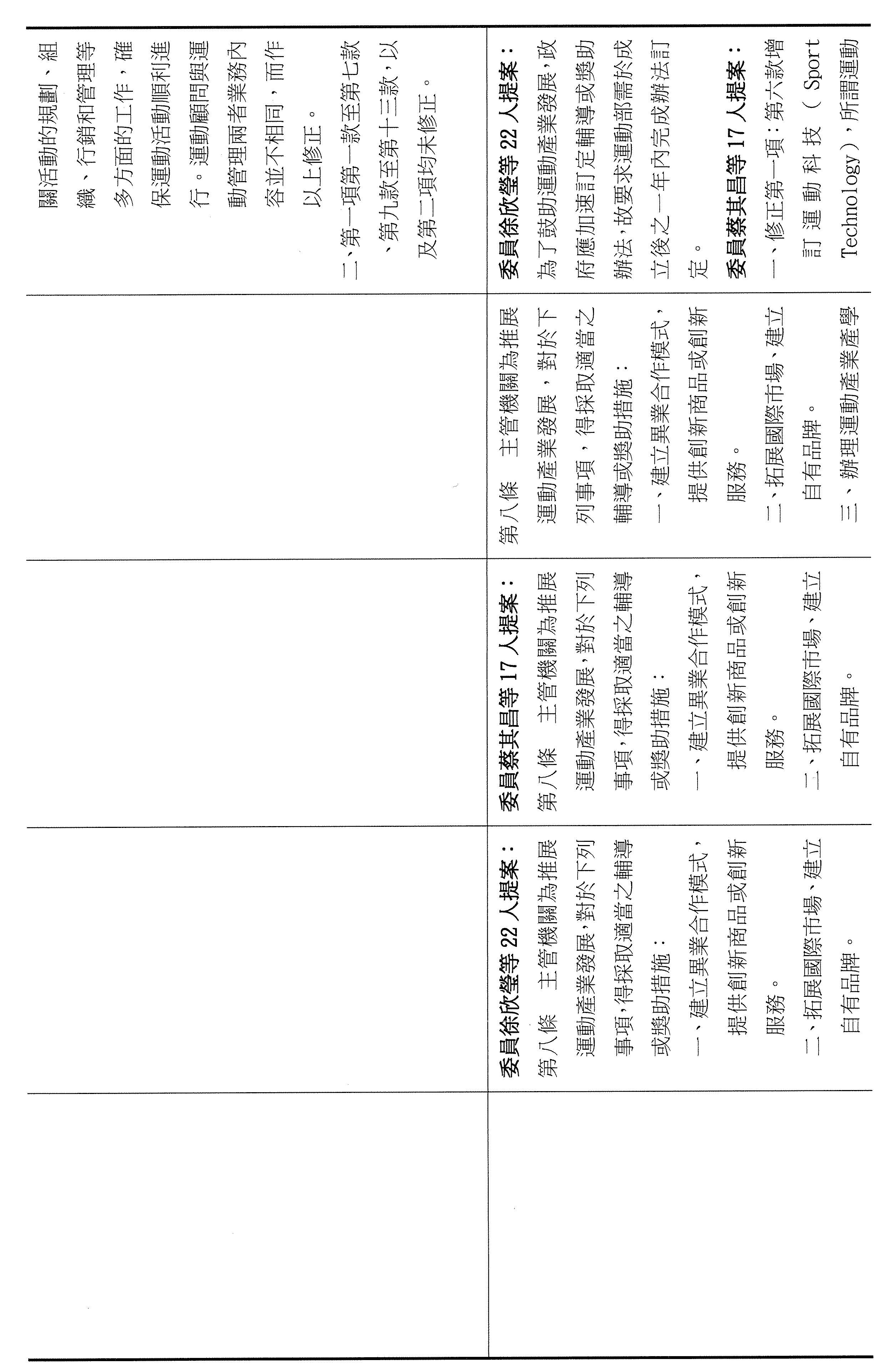 鄭署長世忠:有關第八條的修正草案,徐欣瑩委員等22人的提案修正第二項,明定運動部成立一年內,完成訂定輔導及獎勵辦法。由於本部目前就已經有運動產業輔導獎勵辦法,明定運動產業的輔導及獎勵對象、資格、審查基準、申請程序等等,所以這一項建議免予修正。委員蔡其昌等17人的提案,目前考量提案於實務執行尚無窒礙,所以建議參採。