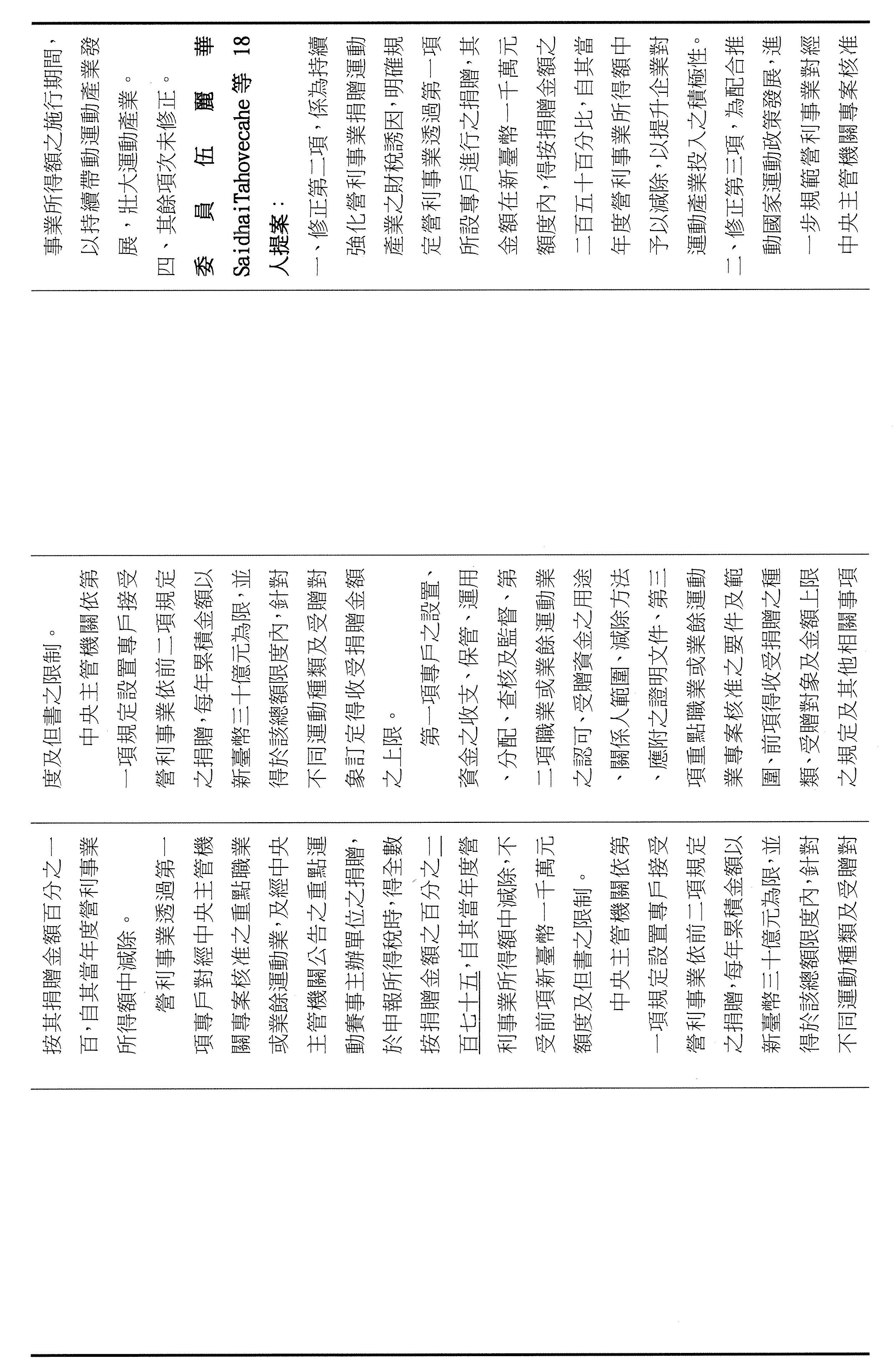 第二個部分,在租稅誘因要設防火牆,要不然會變成資金繞流跟自行貼標的工具,損害課稅公平,所以本席沿襲現在關係人捐贈只能100%的扣除設計,再依據證券交易法,對控制、被控制跟相互控制實質判斷標準,明確要求捐贈企業要揭露幾個部分,第一個是股權結構和控制關係圖表,第二個部分是捐贈前後的資金流向,第三個部分是運動團體資金運用決算,這個部分也能真正落實誘因與責任的對價原則,如果企業規避稅額跟資金沒有依照計畫用途執行,我們除了補稅罰鍰,也可以在3年內限制這個企業再適用本條的優惠,也就是說後面可能再做更縝密的一些設計。