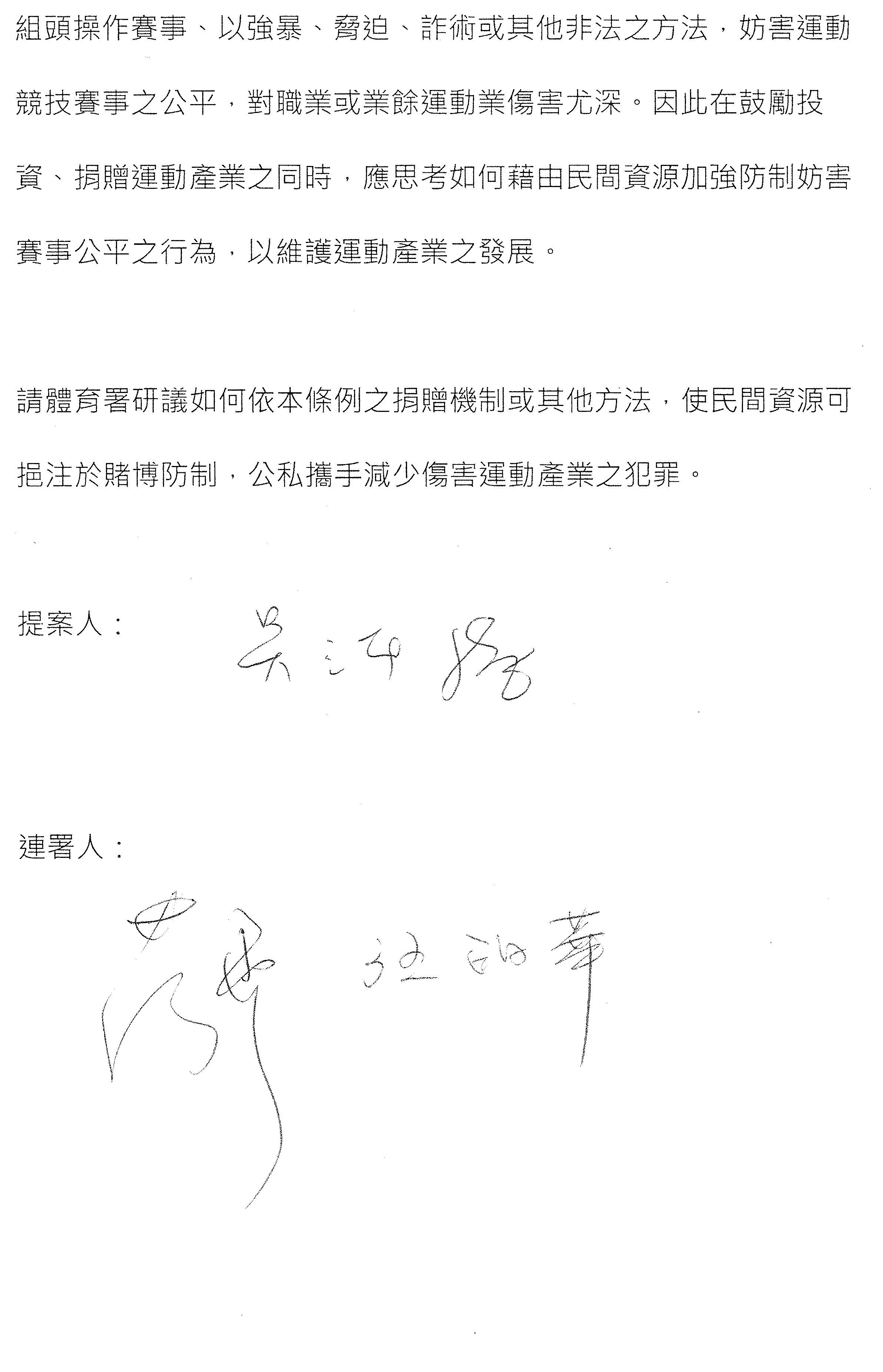 本席這次提案的目的就是要強化企業投入運動產業的誘因,進一步推動公共與民間資源的協同合作。比較具體的是將現行營利事業透過專戶捐贈體育團體,從150%稅前扣除的規定提高到250%,而且對於主管機關核定的重點運動項目,希望能夠給予比較無上限的全額扣除,不是只有技術上條文的調整,而是對整個體育政策架構跟行政層級升格的制度回應。現行150%的扣除比例,是在主管機關為教育部體育署的階段所設計的,未來運動部要成立,我們希望透過提案,反映體育還沒有被獨立產業開發的政策體系,所以資源配置的權限跟政策整合的能量目前有一些侷限。運動產業目前的規模不斷擴大,行政院版也拍定要成立運動部,我們必須與時俱進,透過租稅誘因機制,全面重塑企業參與體育的動力結構。今天體育已經從次級的行政單位升格為中央部會,對應的制度設計也應該同時進行調整,原先因為風險控制下而設置的150%與1,000萬元的稅扣上限,也應該順勢解除,或者是調整為浮動式管理,讓制度比較有彈性,也貼近現實,政策能夠更為精進。企業投入體育不僅是履行CSR,更是對品牌價值、社會形象跟青年文化的連結,是一個重要的投資,如果誘因不足的話,即使觀眾願意投入場館的命名權,賽事贊助或基層培訓計畫的相關企業會因此而卻步。所以本席在此主張,在特定的條件下,我們來放寬稅捐抵減比例到250%,也針對運動部專案認定的重大政策項目,可以採行無上限的抵稅,尤其是奧運、亞運的備戰,還有運動中心升級與跨縣市大型聯賽等重大建設,我們需要資源的集中,也希望它產生一些效益。我們同時也考量公平跟監理的原則,針對企業跟受贈單位具有控制或關係人身分者,仍維持100%的扣除,以防止稅基侵蝕跟濫用的空間,並要求運動部跟財政部共組一個審查機制,落實事前的核准、過程當中的監督跟事後的稽核,建構一個又有誘因但是又會防弊的制度體系。