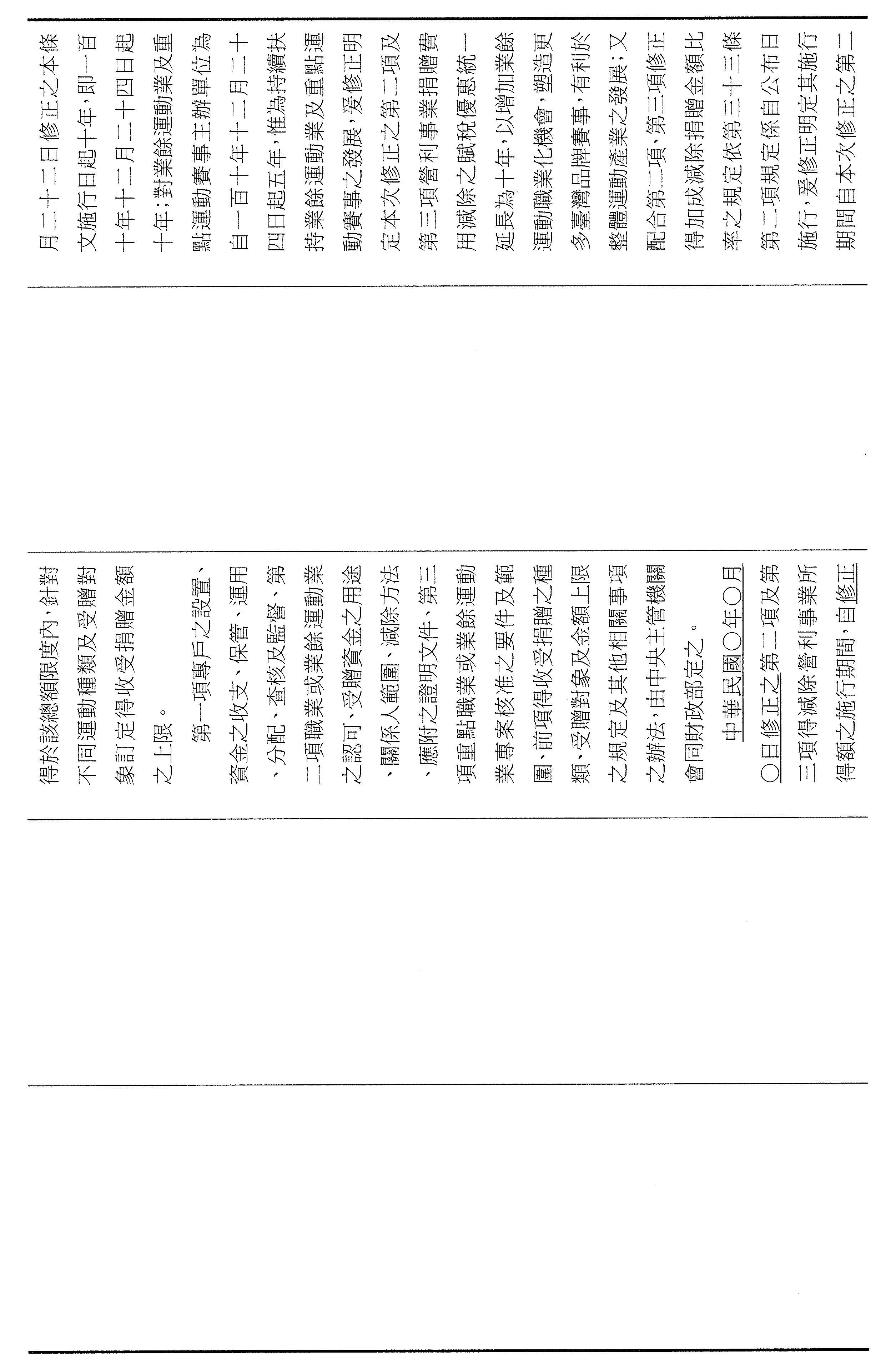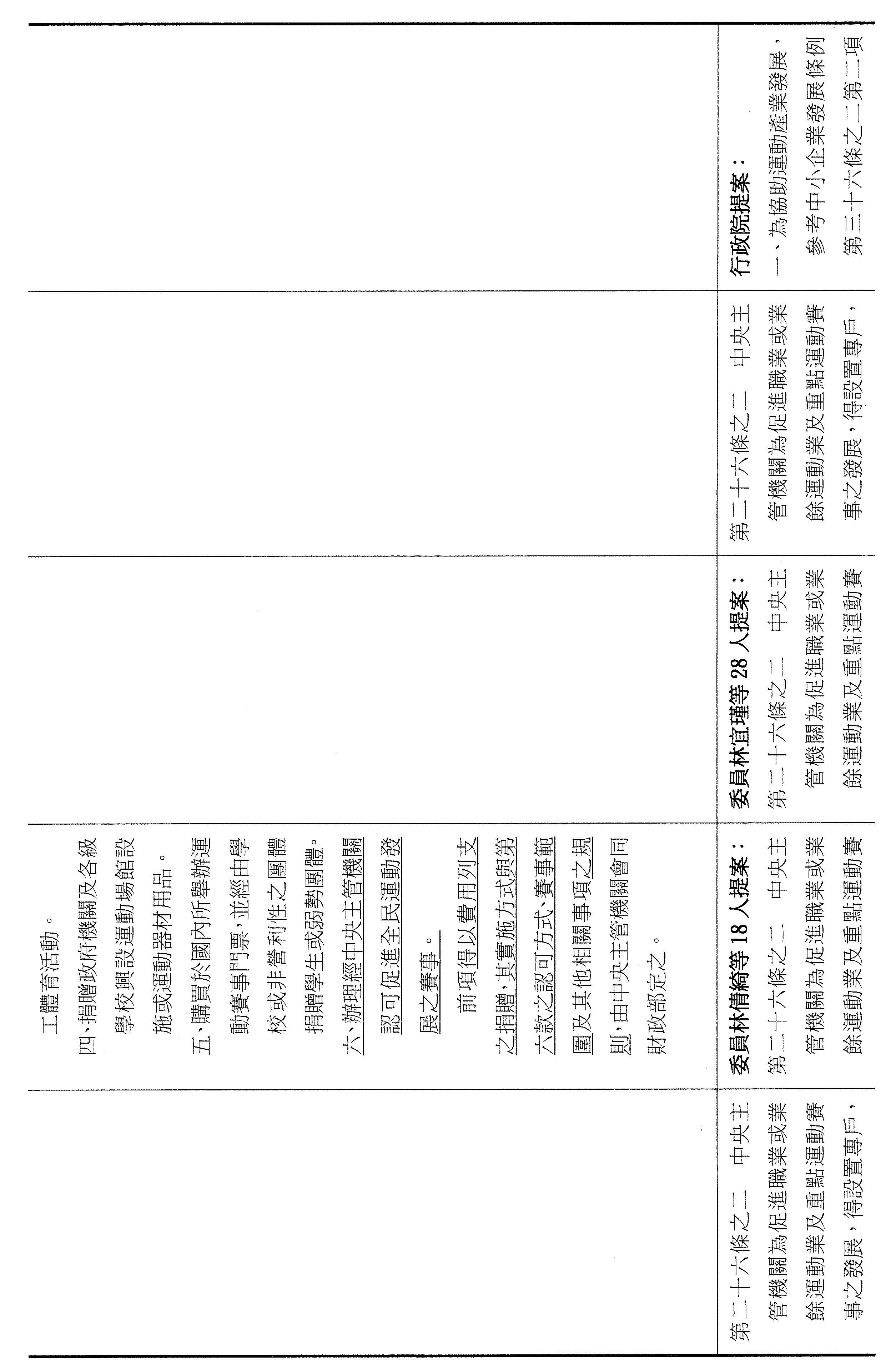 主席:謝謝署長,有沒有委員要進行進一步的詢問?如果沒有,我們看一下院版,因為我想這個大家也都有充分的溝通討論,我們看一下院版的第一項第六款「辦理經中央主管機關認可促進全民運動發展之賽事。」第七款「前項得以費用列支之捐贈,其實施方式與第六款之認可方式、賽事範圍及其他相關事項之辦法,由中央主管機關會同財政部定之。」修改的部分我們都有列出來了,有沒有委員有垂詢、提問或意見?好,如果沒有的話,我想剛剛也都充分討論過了,第二十六條就照行政院提案版本通過。