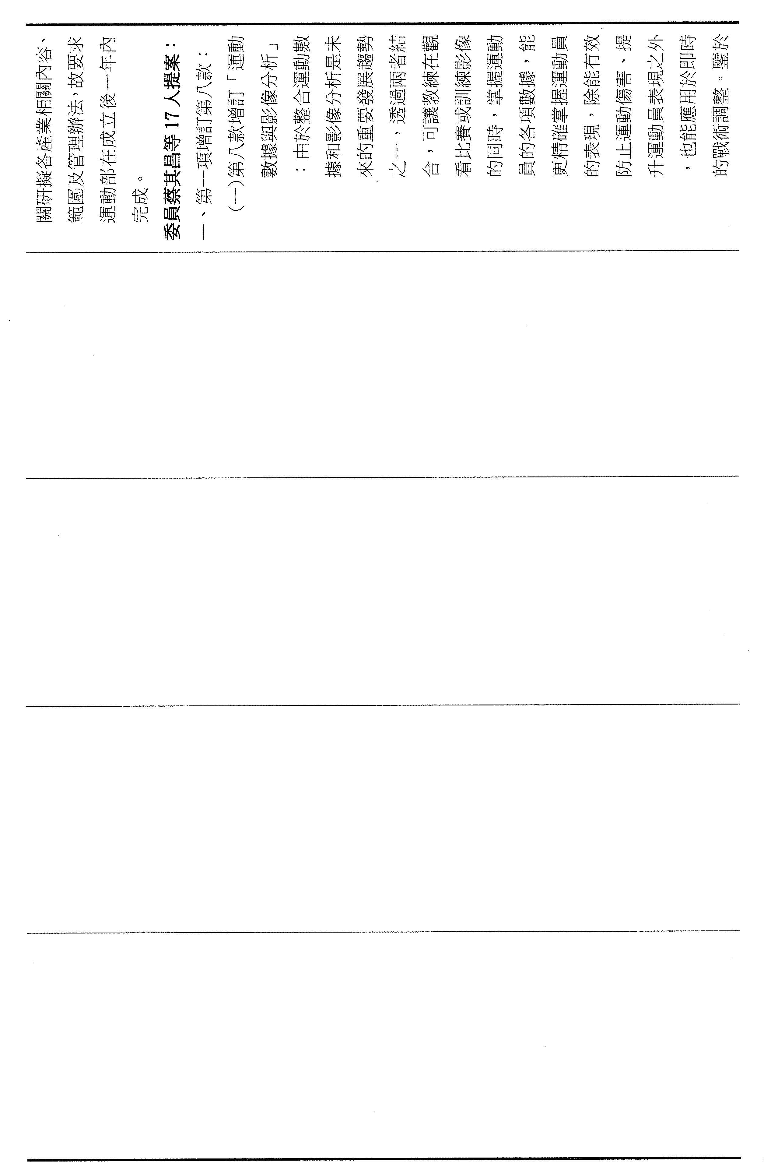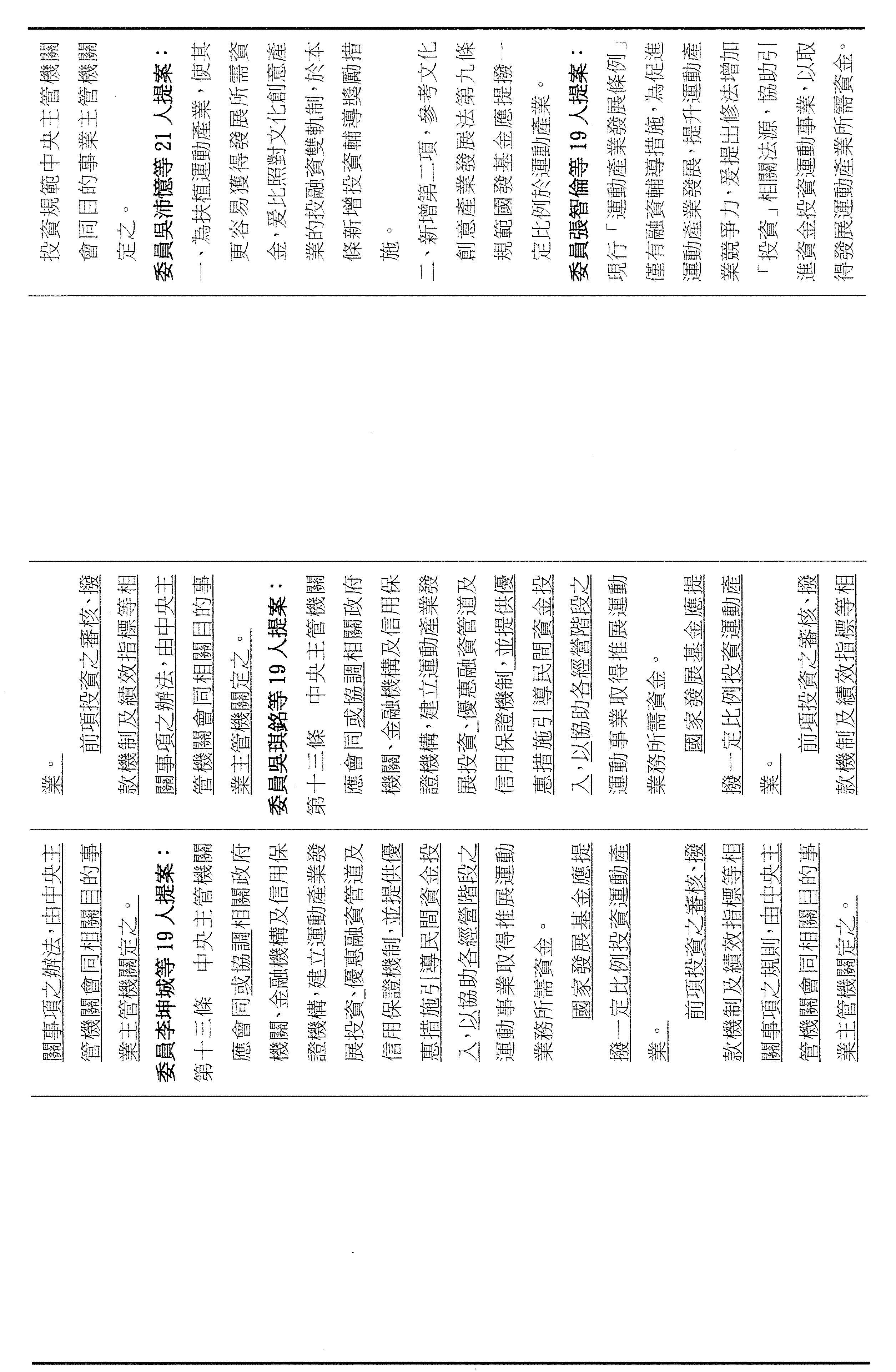 張委員雅琳:這一條其實我也沒有提案,不過我也是想要來支持一下,我覺得這樣的安排,就是蔡其昌委員的這個版本我覺得會更周全。我們現在要推廣運動科學、科技這件事情,其實更能夠幫助我們的基層運動,能夠讓我們的學生或是我們的孩子在基層的俱樂部,如果都可以有運動科技的產業進來的話,孩子在練習的過程之中會更安全,更不會提早就受傷,所以我也支持這個版本。謝謝。