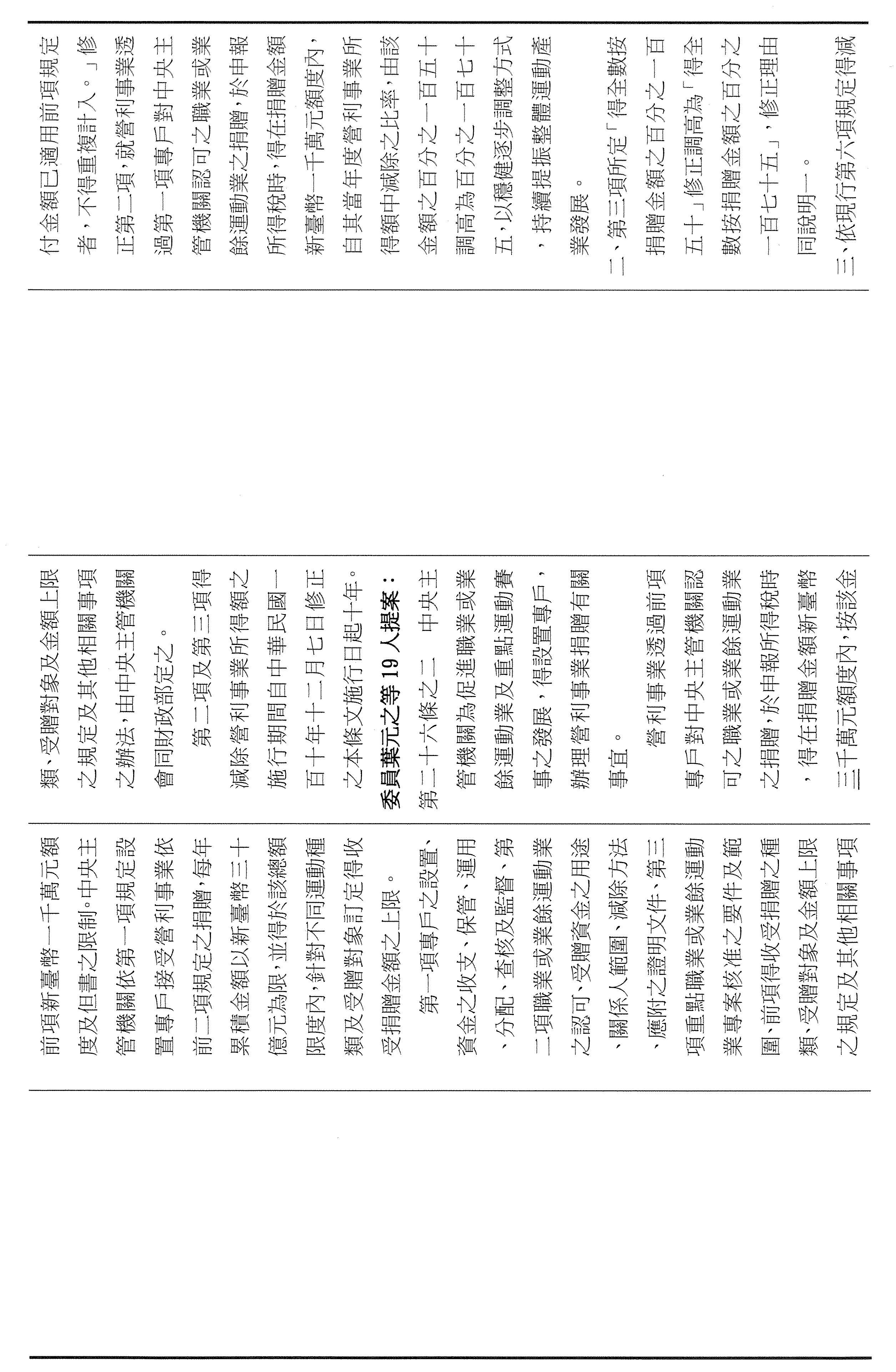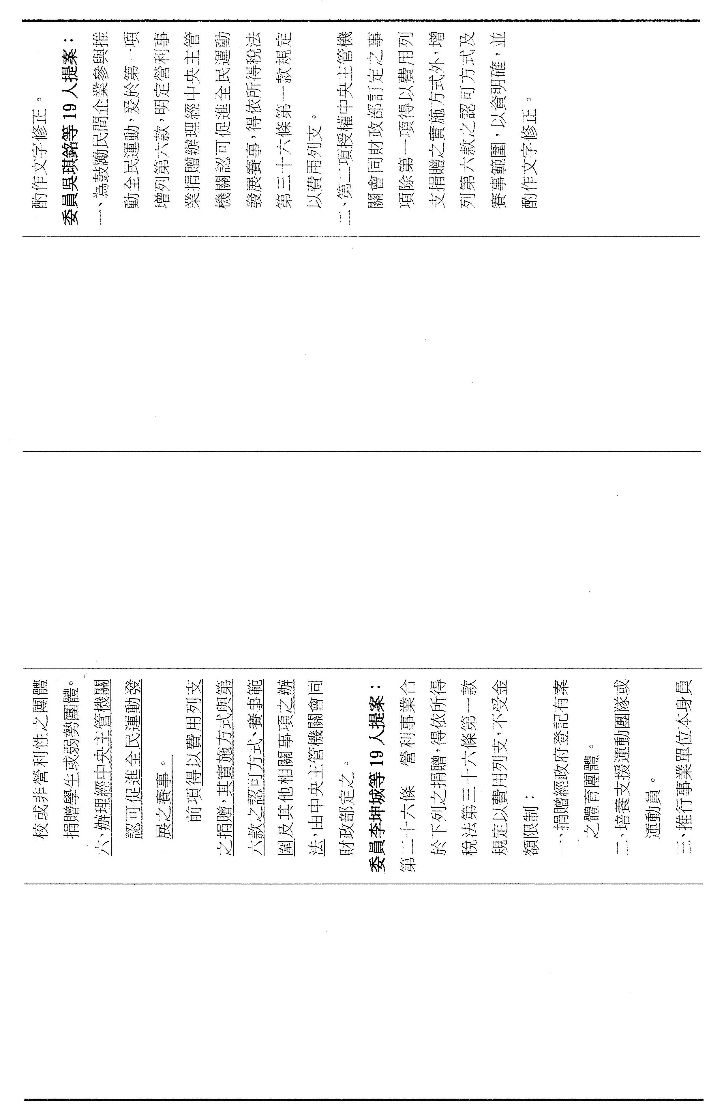 第四部分是葉元之委員的提案,因為他的提案反而會造成受捐贈方能享受的租稅優惠降低,這可能會影響到受贈方的意願,所以本條例的制定跟財政部研商之後,我們建議不修正,維持現行的額度。