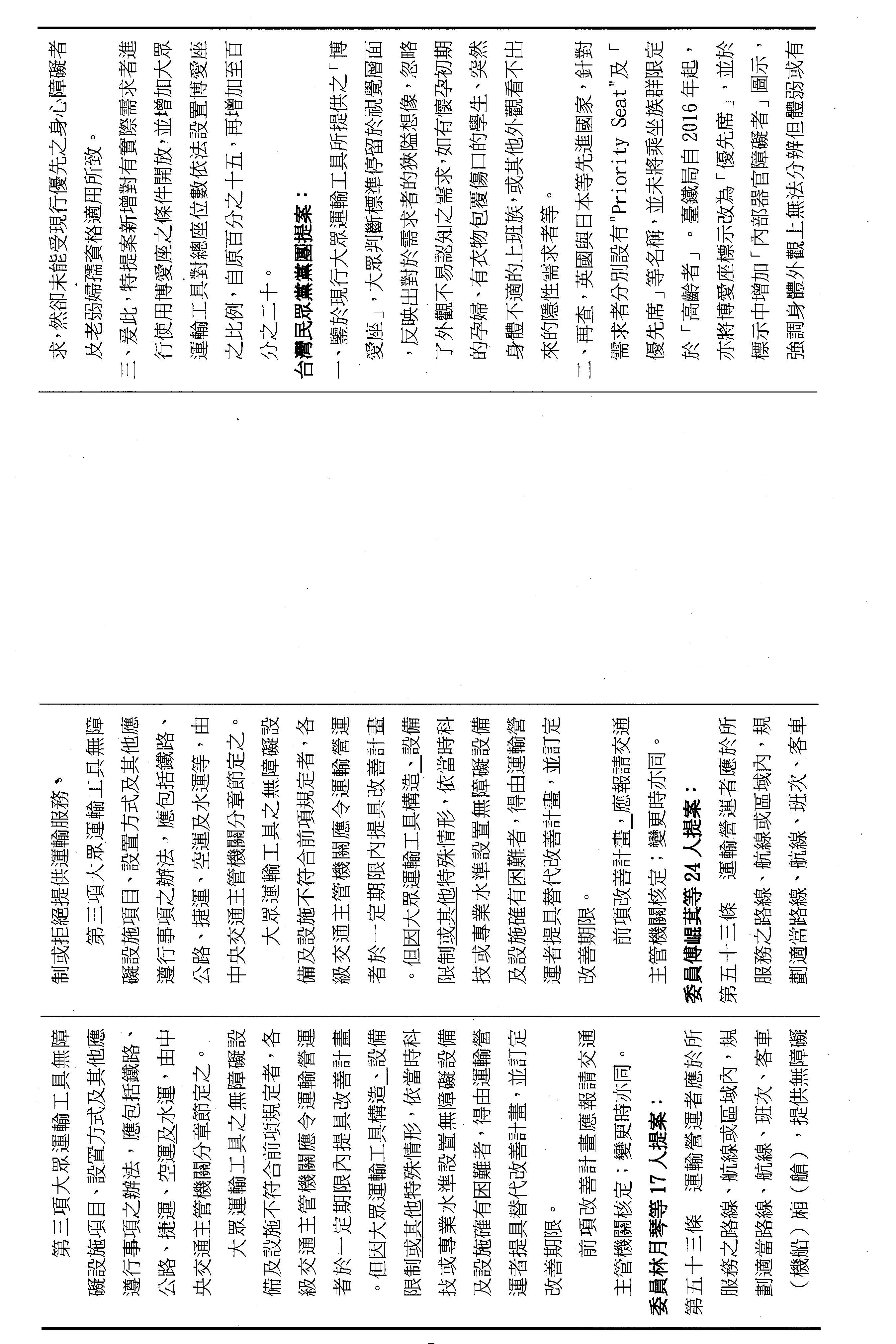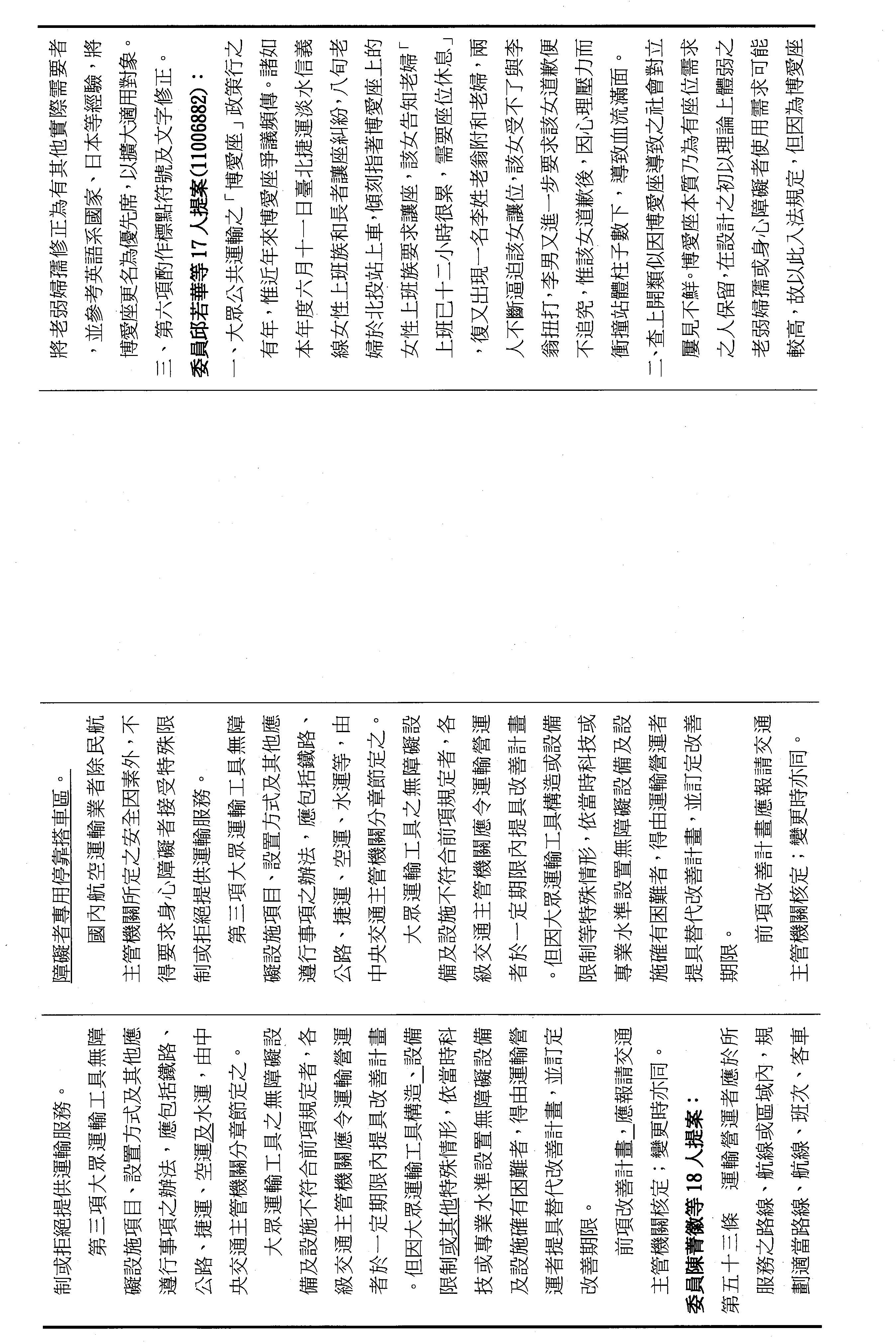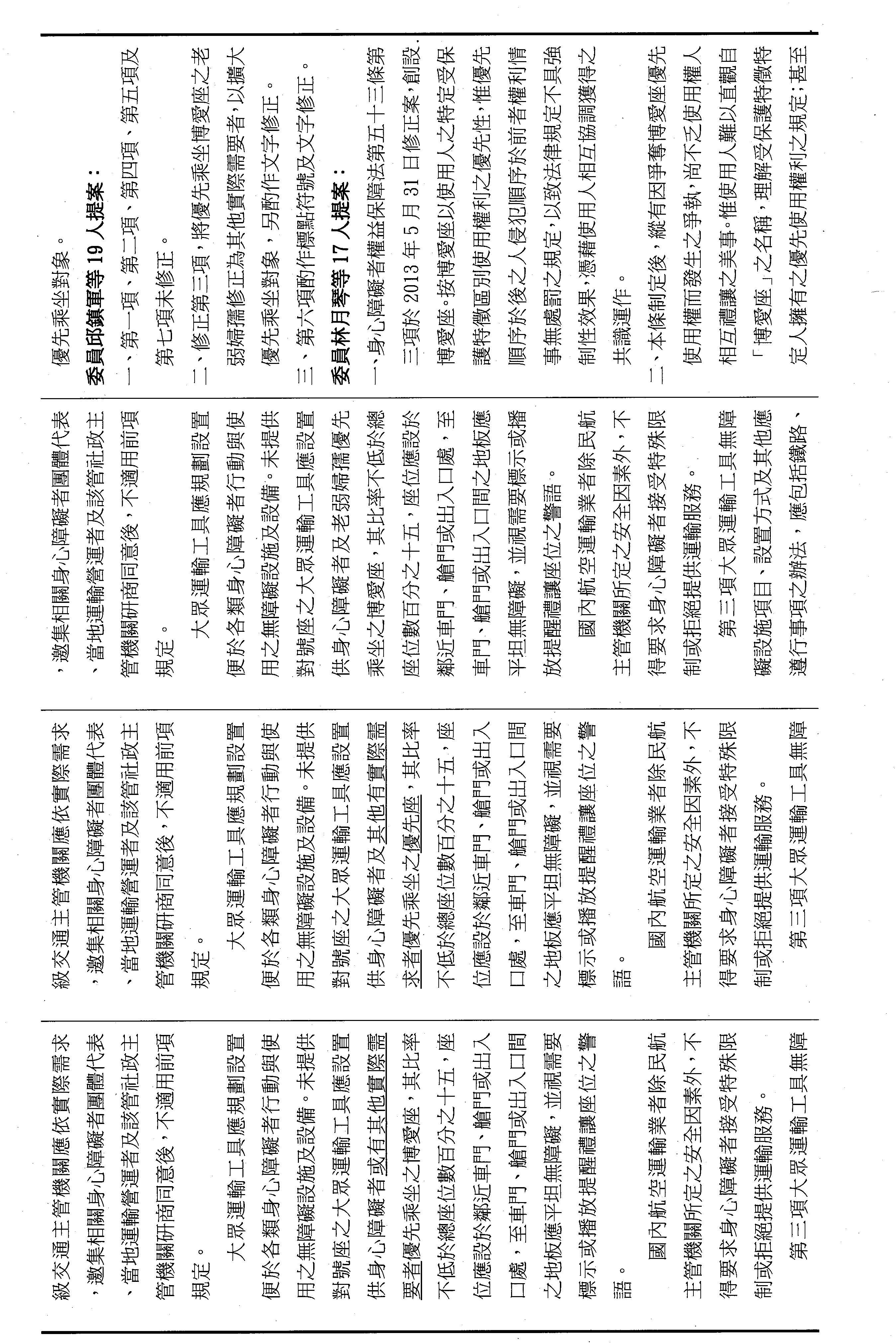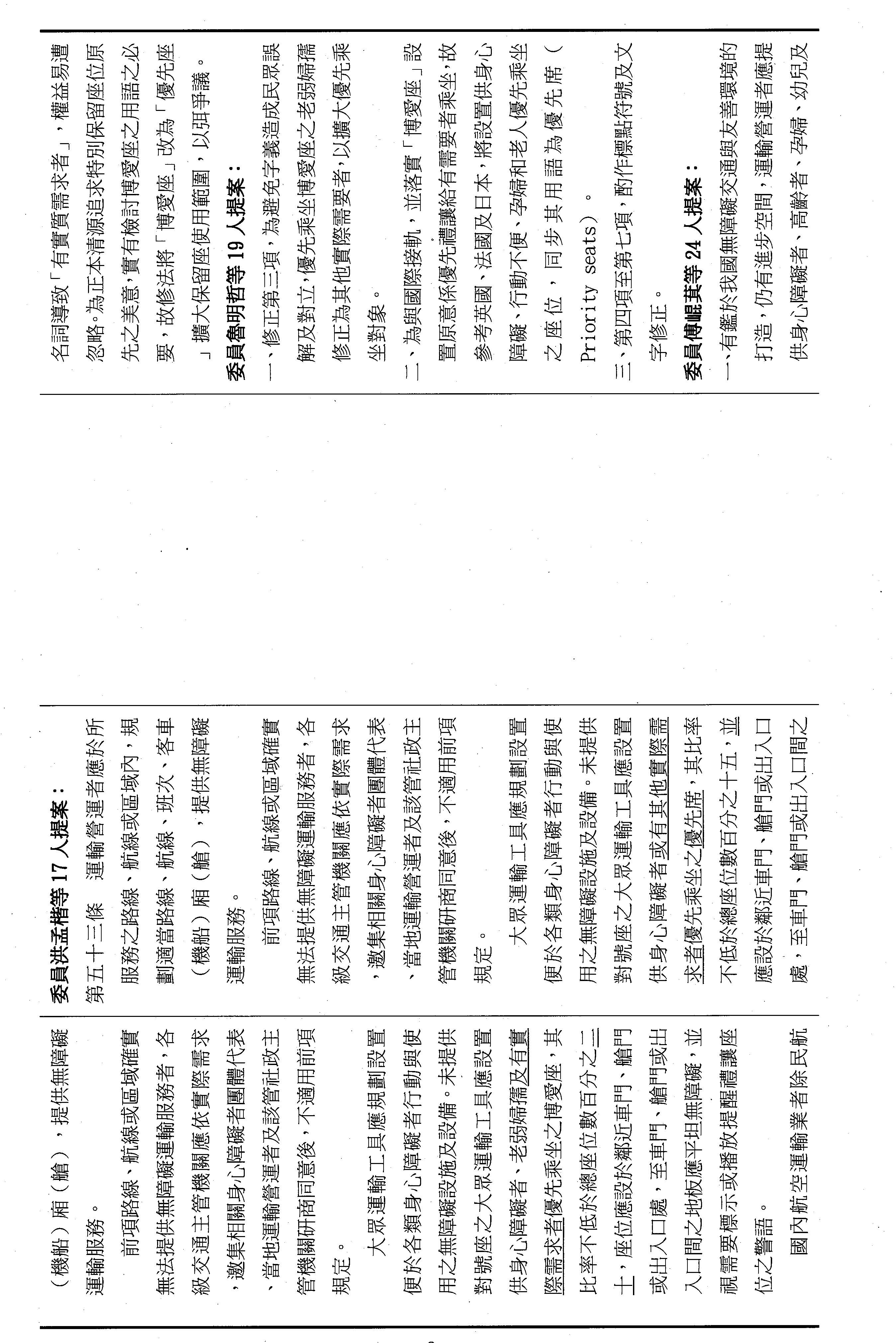 林委員月琴:本席還是主張改名為「優先席」,我想剛剛院版也是這樣,為什麼?引用澳日經驗的話,就是用優先席。不過剛剛楊曜委員提到,如果事實上是眼睛、肉眼可見的話,原來的「老弱婦孺」有些委員有放、有些委員沒放,可是我建議還是不要放,因為我覺得會有爭議。如果名字改成優先席的時候,老弱婦孺那個「老」又放在前面,這幾年發生的、媒體呈現的幾乎都是老人跟青年發生這樣子的狀況,一個是認為我年紀比較大,你要讓座;一個是覺得因為我有需求啊!