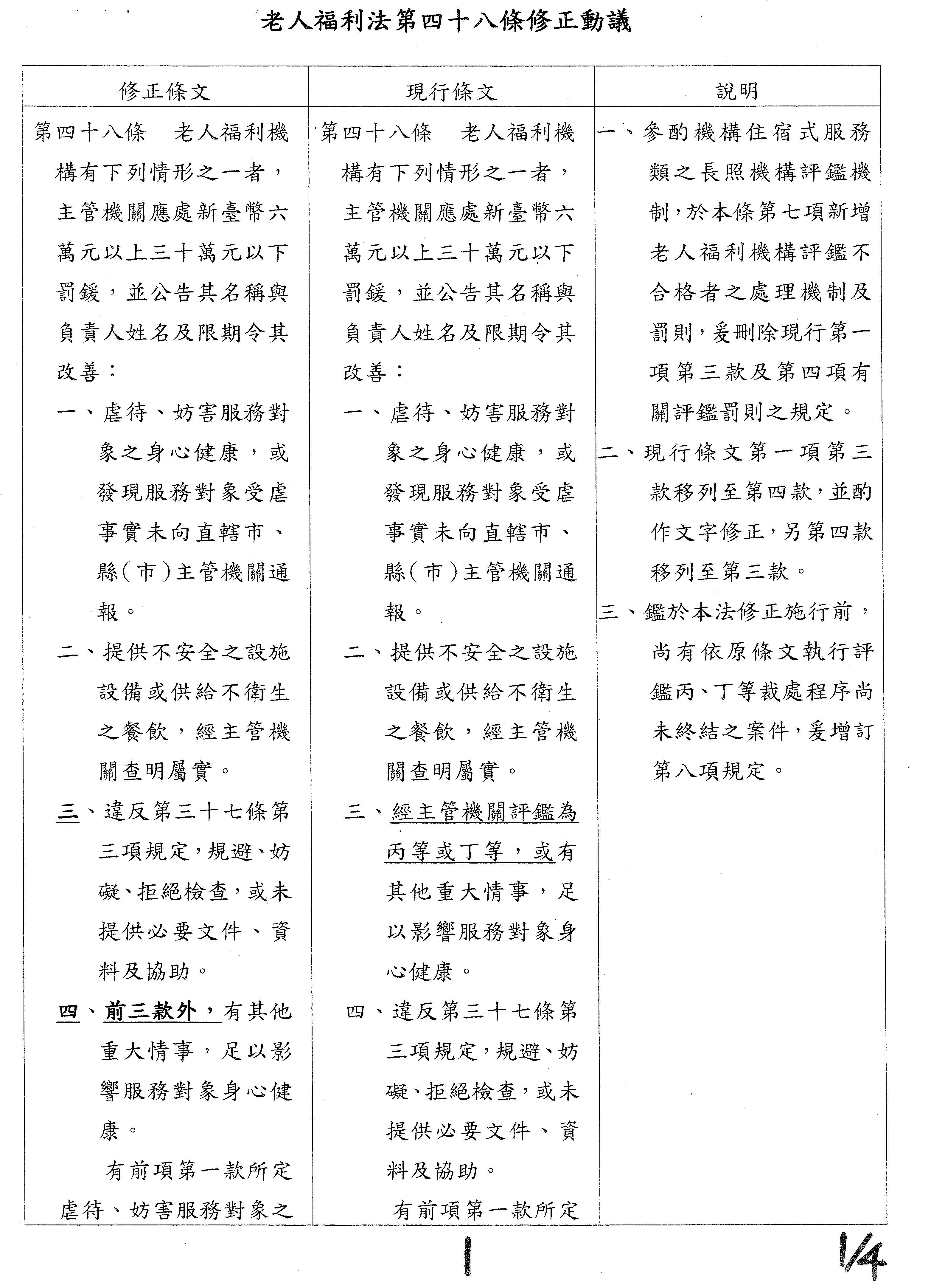 (一)委員劉建國等17人擬具「老人福利法第四十八條條文修正草案」案。