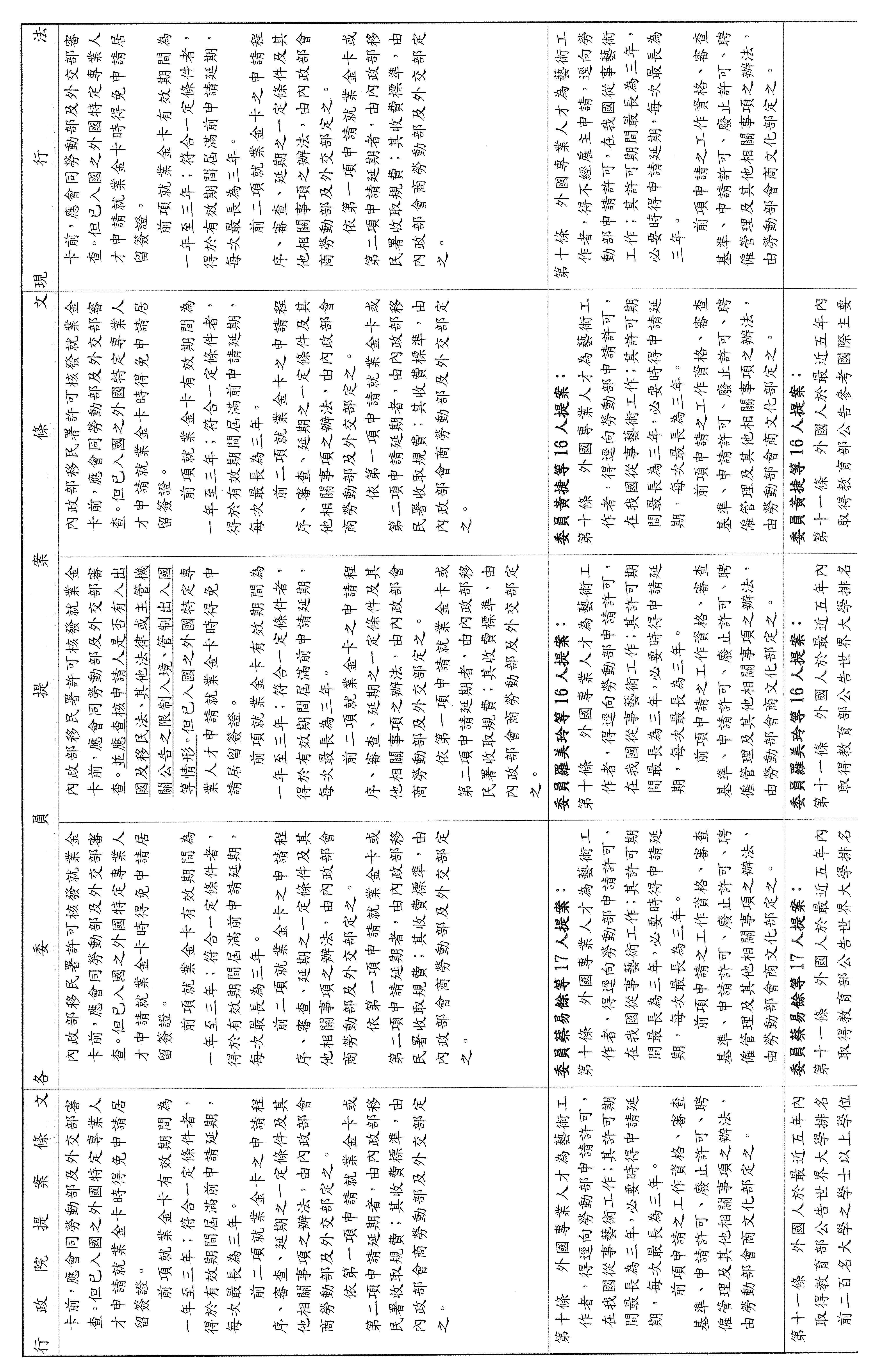 「外國專業人才延攬及僱用法修正草案」協商結論:第一條照行政院提案通過;第二條照行政院提案通過;第三條照行政院提案通過;第四條照委員林岱樺等4人修正動議通過;第五條照行政院提案通過;第六條照委員蔡易餘等3人提案通過;第七條照行政院提案通過;第八條照行政院提案通過;第九條照行政院提案通過;第十條照行政院提案通過;增訂第十一條照行政院提案通過;增訂第十二條照行政院提案通過;第十三條照行政院提案通過;增訂第十四條照行政院提案通過;第十五條照行政院提案通過;第十六條照行政院提案通過;第十七條照行政院提案通過;第十八條照委員蔡易餘等3人提案修正通過;第十九條照行政院提案通過;刪除現行法第十七條,照行政院提案通過;第二十條照行政院提案通過;第二十一條照行政院提案通過;第二十二條照委員蔡易餘等17人提案通過;第二十三條照行政院提案通過;第二十四條照行政院提案通過;增訂第二十五條照行政院提案通過;第二十六條照行政院提案通過;增訂第二十七條照行政院提案通過;增訂第二十八條照行政院提案通過;增訂第二十九條照行政院提案通過;第三十條照行政院提案通過;第三十一條照行政院提案通過;第三十二條照行政院提案通過;第三十三條照行政院提案通過。附帶決議第1案修正通過;第2案修正通過;第3案照案通過;第4案照案通過;第5案照案通過;第6案照案通過。