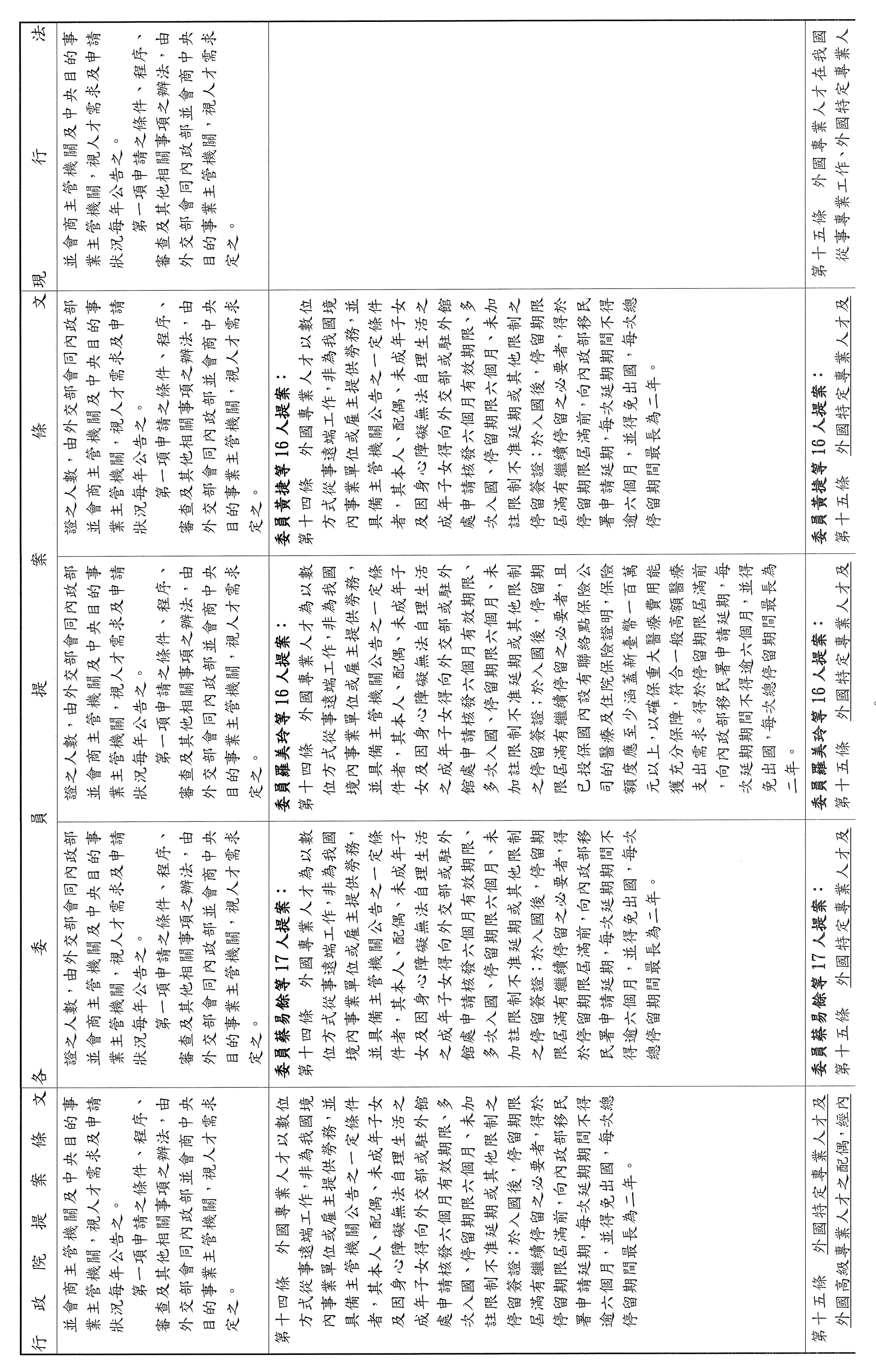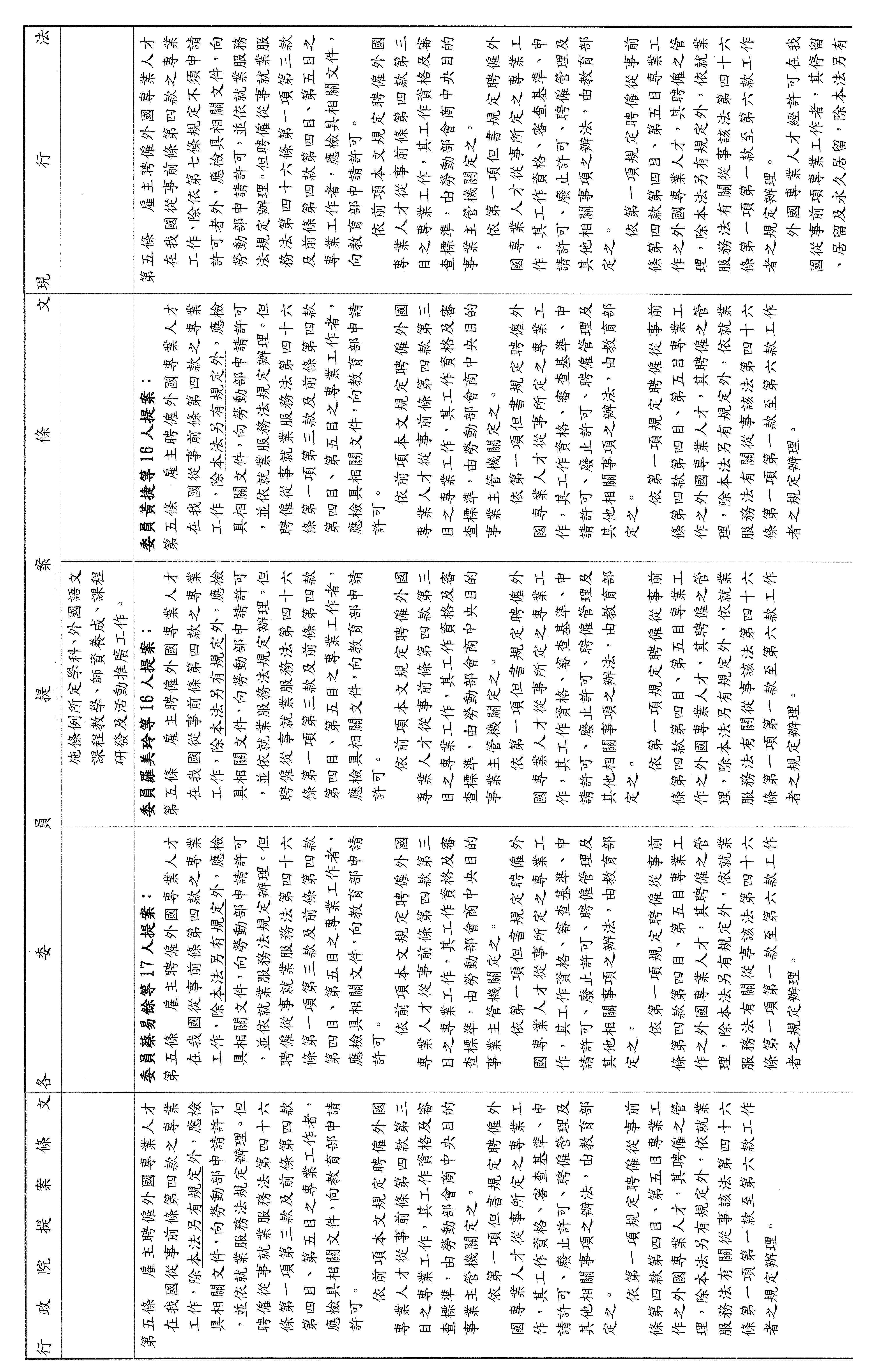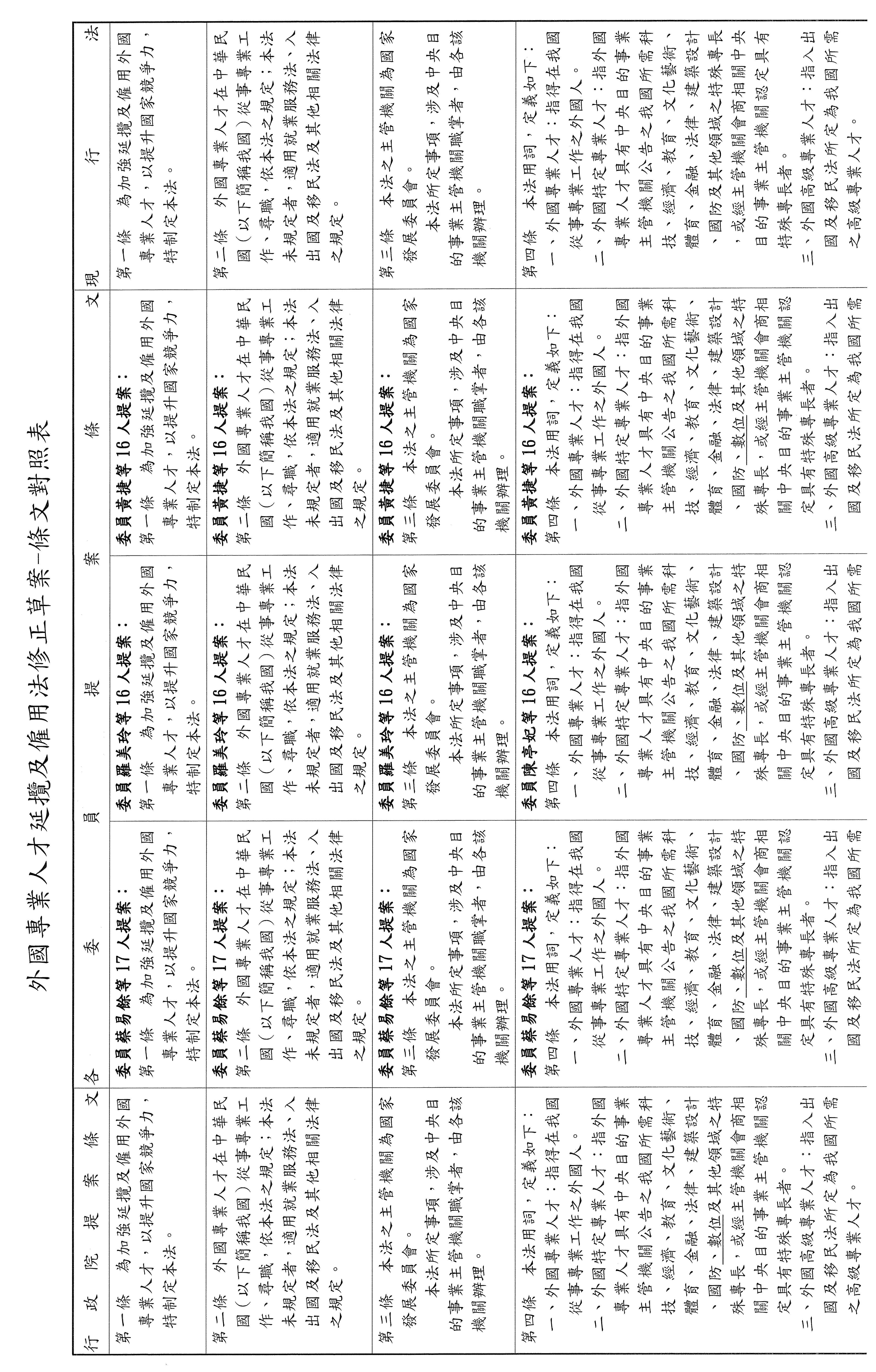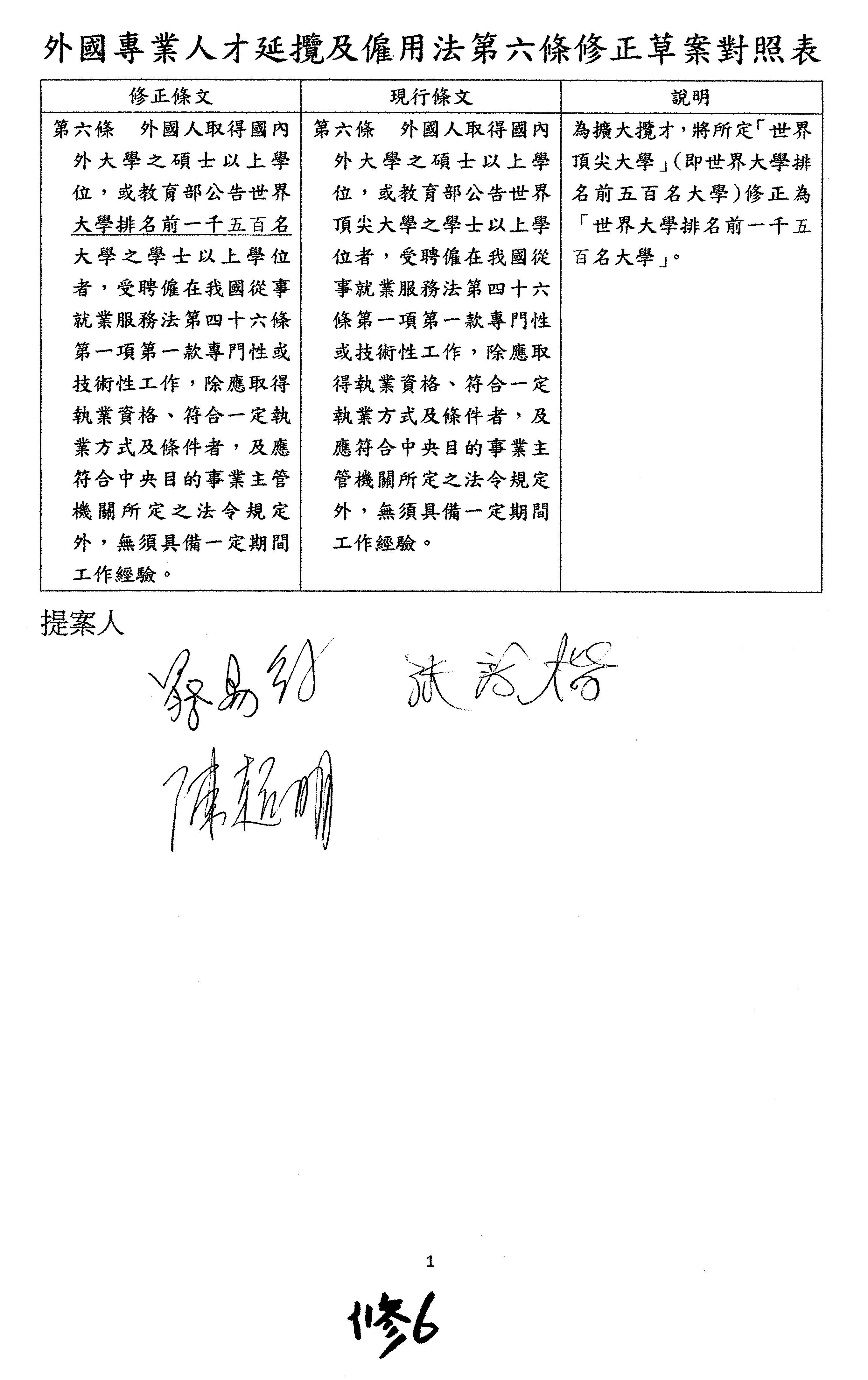 (三)本院委員陳亭妃等16人擬具「外國專業人才延攬及僱用法第四條、第六條及第十四條條文修正草案」案。