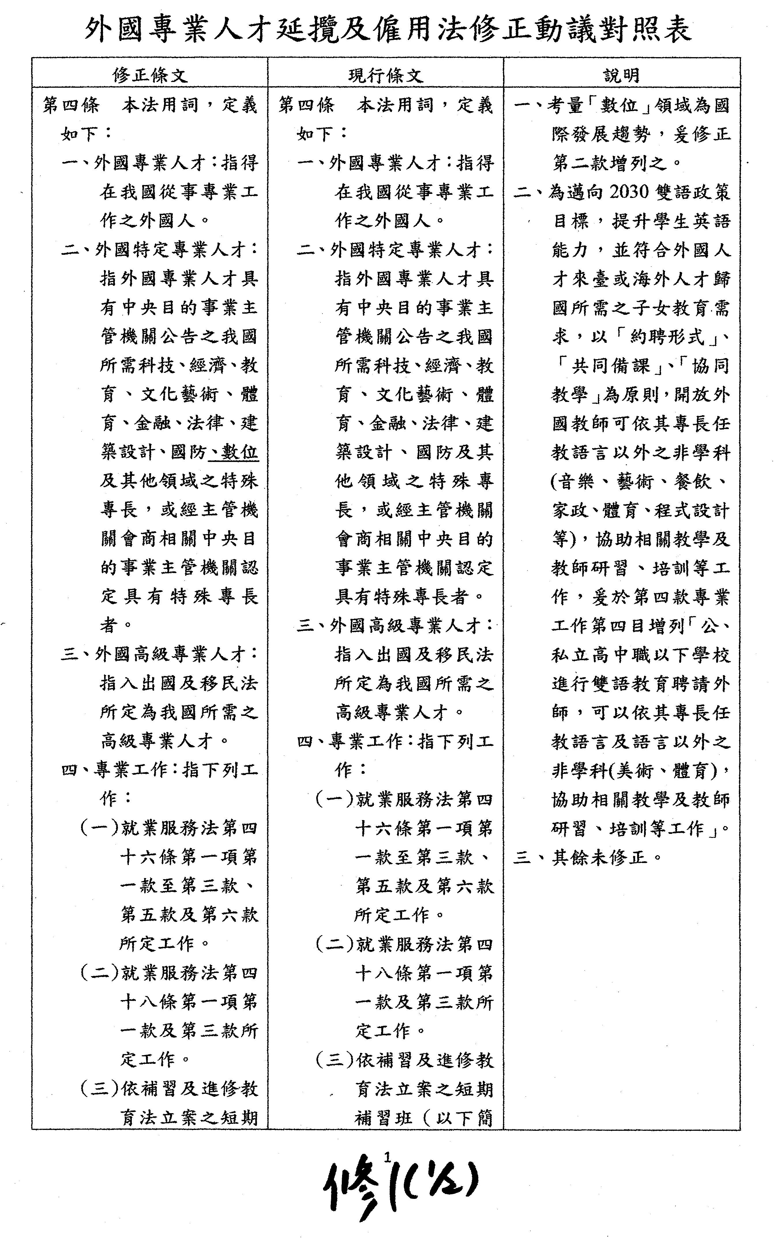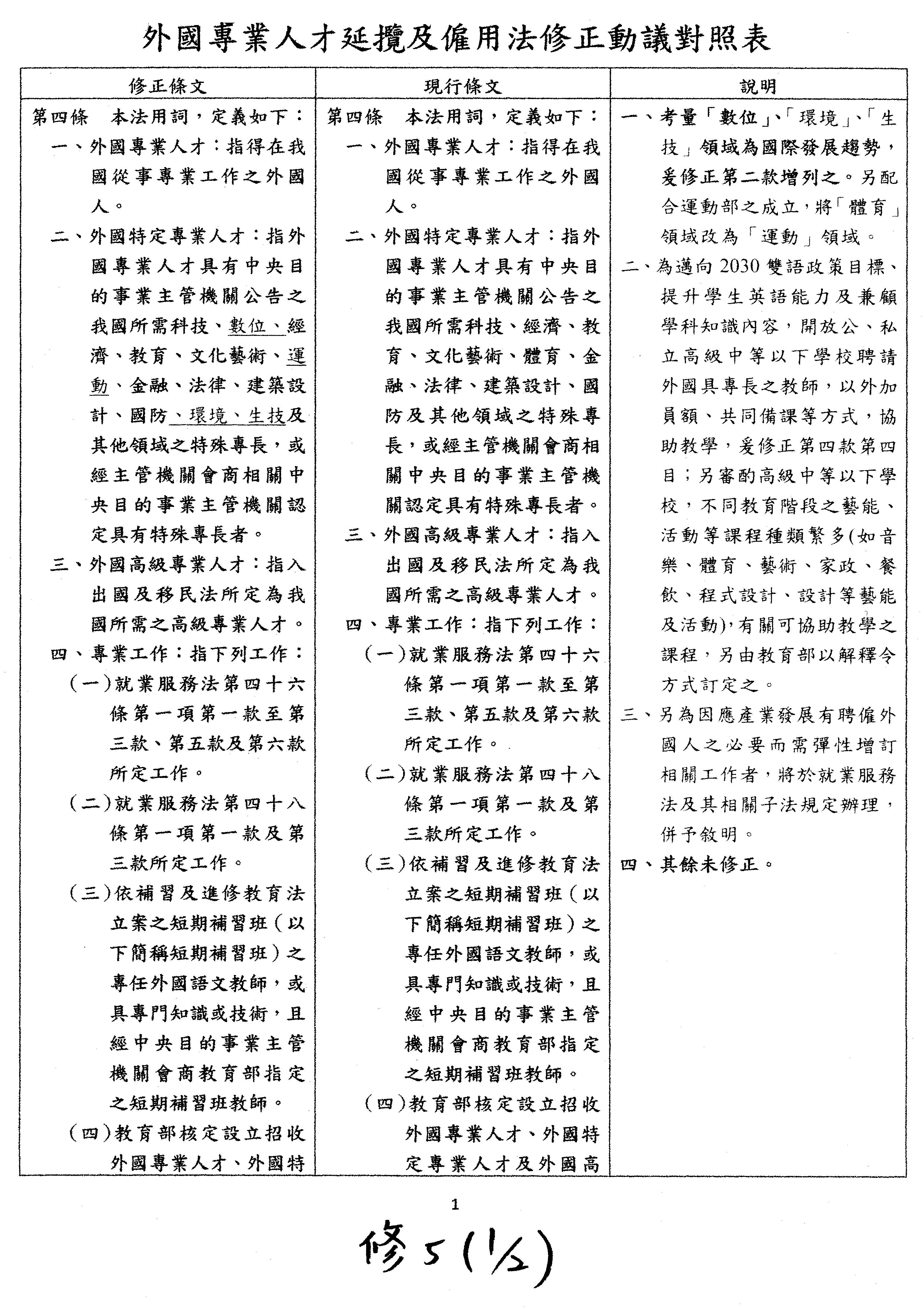 賴委員瑞隆:謝謝。第四條的部分主要是因為裡面當然有提到數位,我認為特別是外國特定人才裡面,其實數位是未來一個重要的趨勢,我建議這個部分可以往前放,來強化我們對於數位科技這一塊的重視。另外趁這個機會也提一下,我的整個修正裡面主要也是希望能夠做更多的放寬,特別是在於前一千大,我希望能夠至少放寬到一千五,其他的部分,也希望包括國發會、包括經濟部、勞動部整體來思考,再做更多的放寬,以吸引國際優秀人才來到臺灣,以上說明。