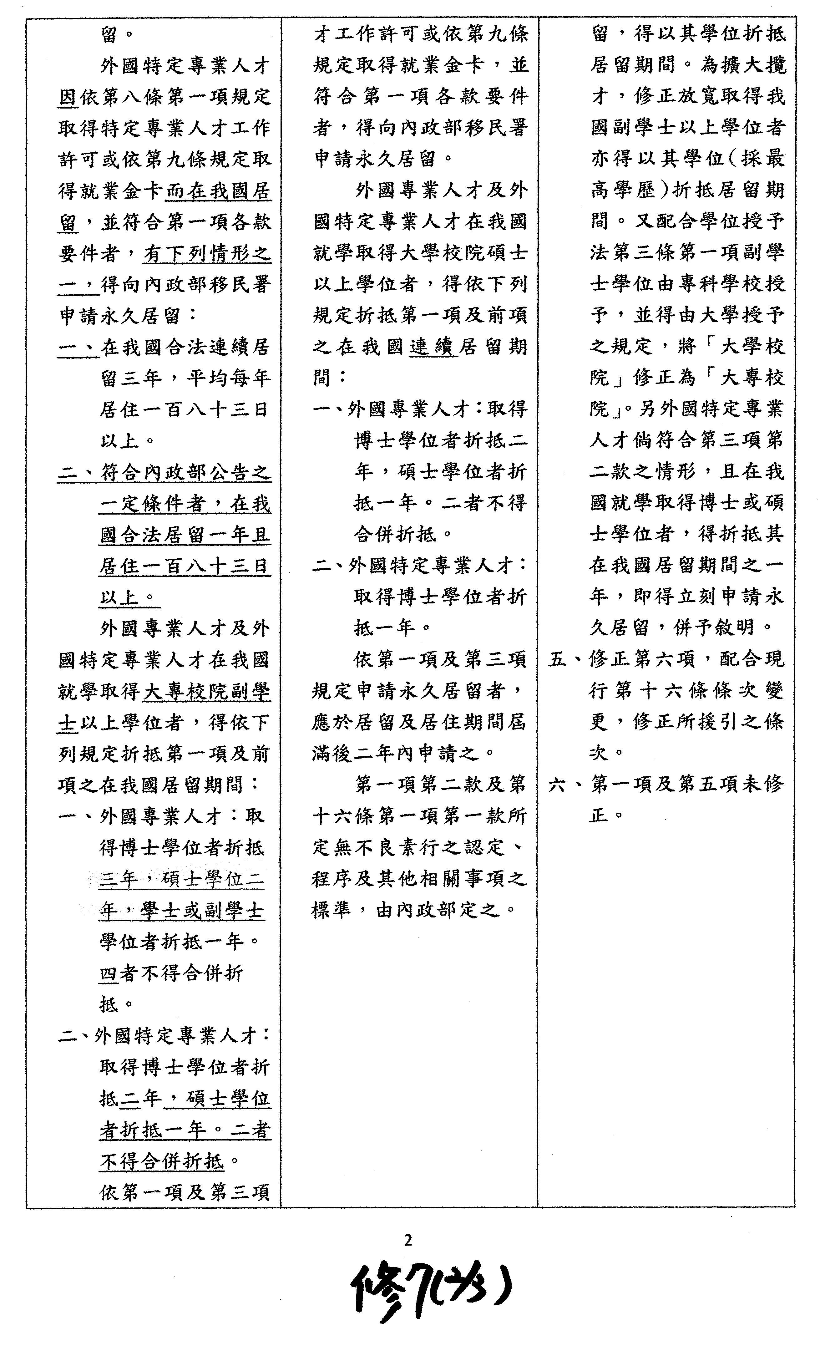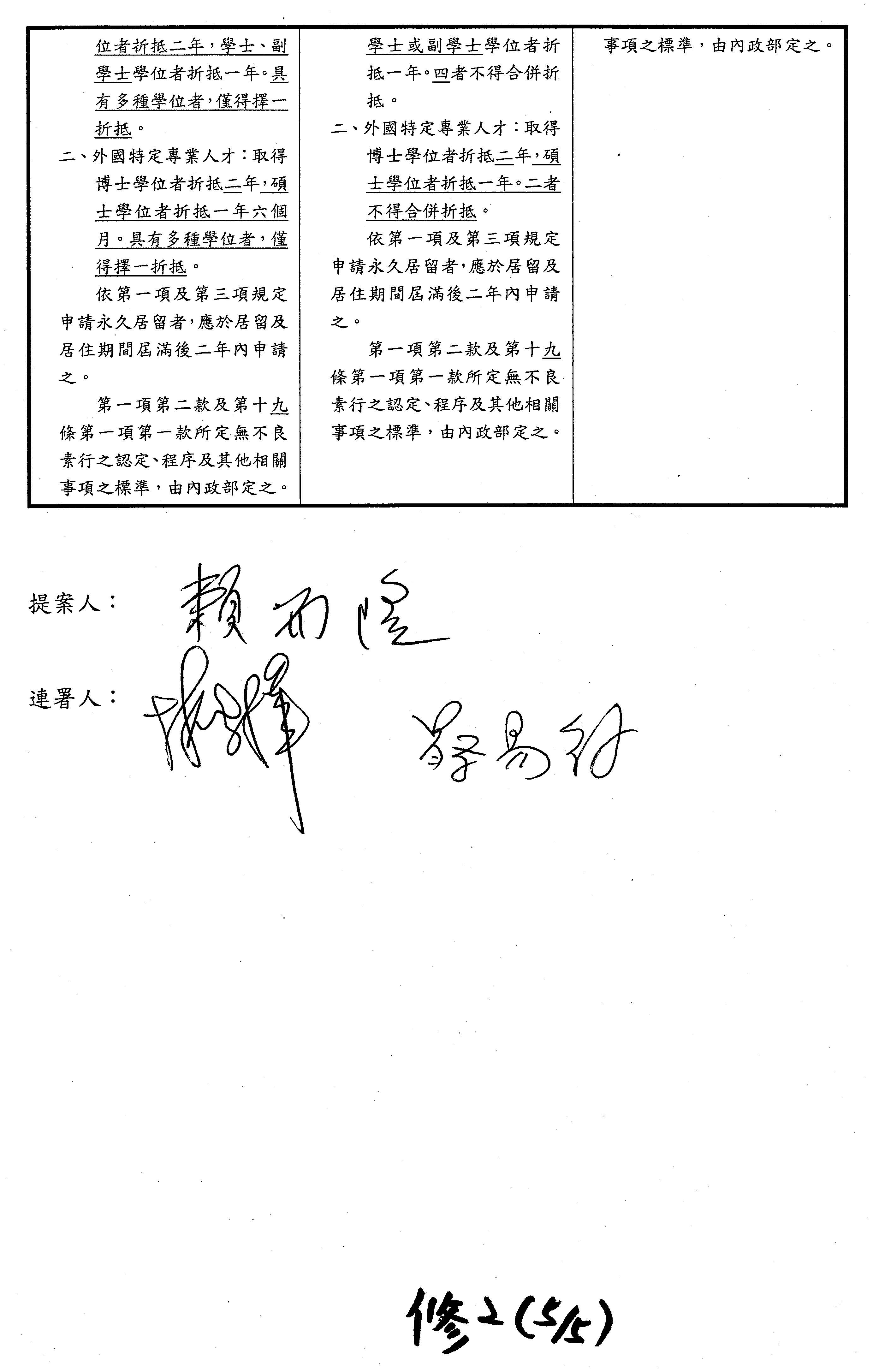 詹副主任委員方冠:不好意思,我們文字上可不可以再做個建議?這樣會更周延。就是在第四項第一款「外國專業人才:取得博士學位者折抵三年」,這個都OK,然後「碩士學位」後面我們建議增加「者折抵」等3字,修正為「碩士學位者折抵二年」。