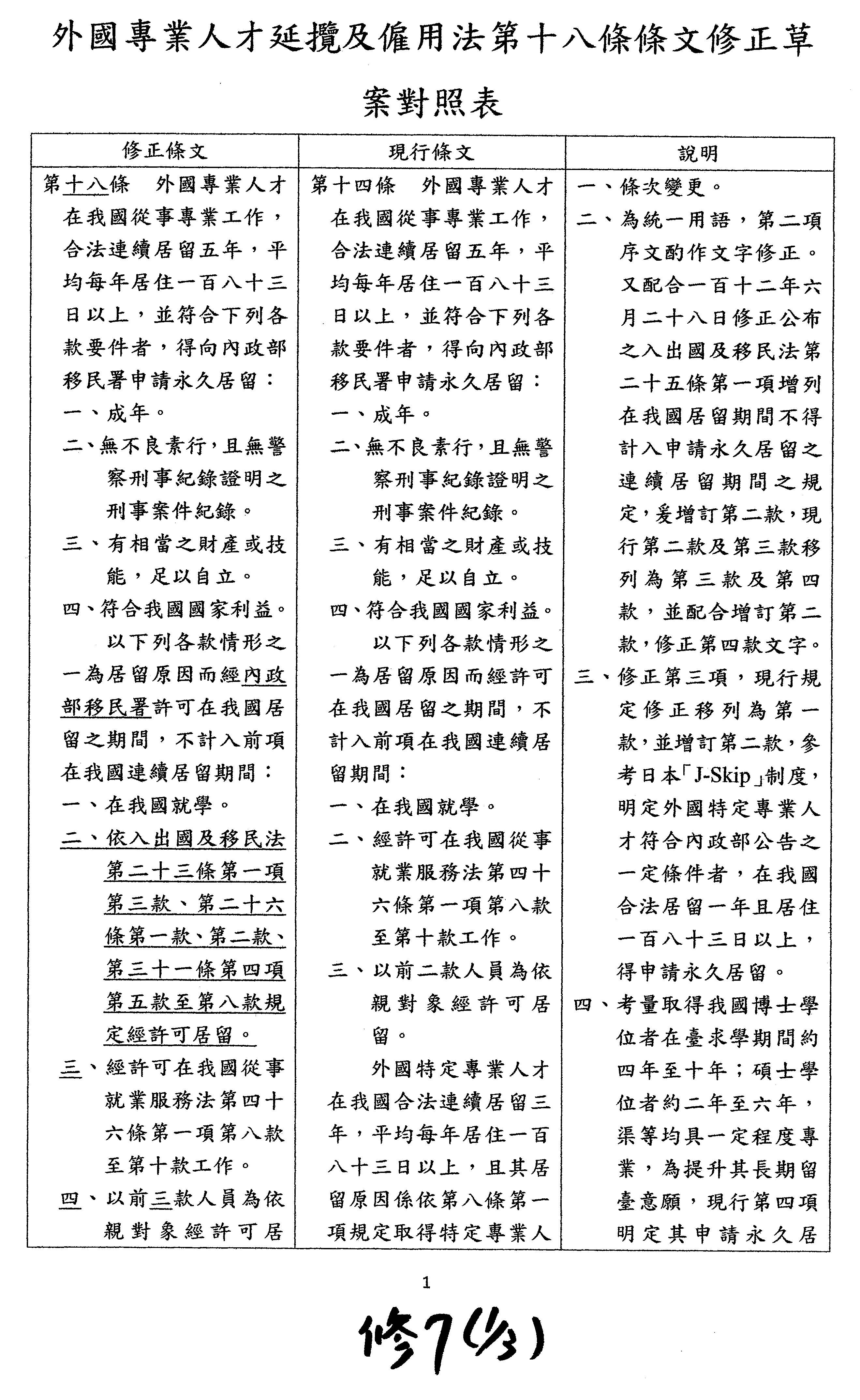 (二)本院委員何欣純等19人擬具「外國專業人才延攬及僱用法第十二條及第十四條條文修正草案」案。